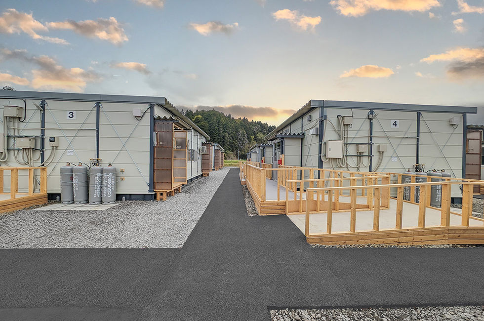 当社は、震災や大雨などの災害時における緊急仮設住宅の供給にも取り組んでおります。令和6年能登半島地震に際しては、被災地自治体の要請を受け、石川県内の複数地域で応急仮設住宅の施工を担当しました。住戸には断熱性能に優れたOLライトシリーズ外壁パネルを採用し、仮設ながらも快適に過ごせる居住空間を実現しています。被災された皆様が一日も早く安心して生活を再建できるよう、当社はこれからも復旧・復興への支援に全力で取り組んでまいります。