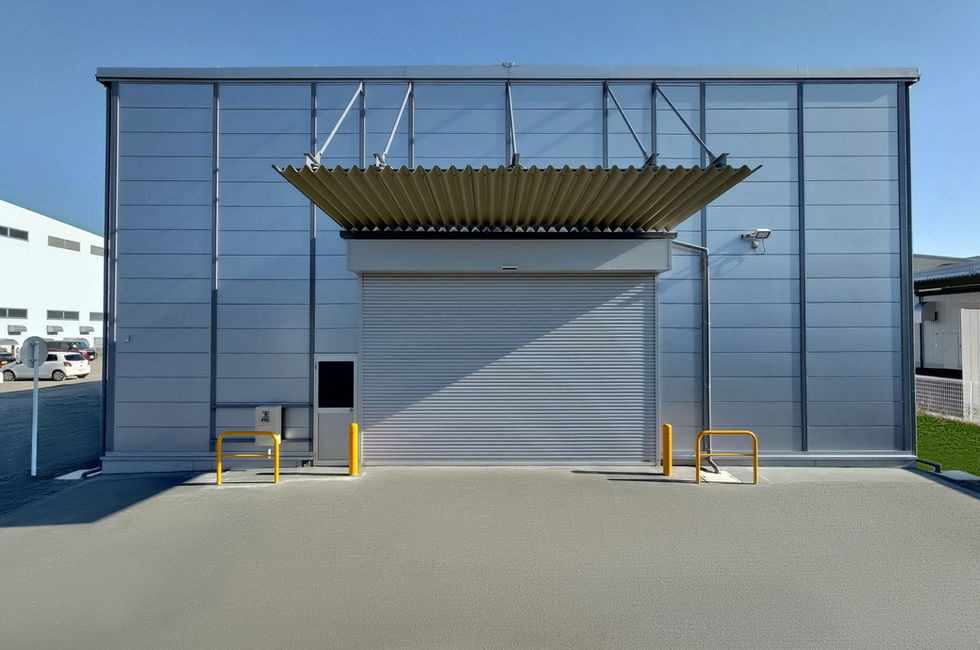OLライトシリーズにて設計・施工した印刷工場です。印刷物などの荷物をパレットごと格納・保管するためのラックを積み重ねる事を考慮し、梁下までの高さを6.7m確保。又、作業効率を確保するため、中柱2本の位置を調整し、フォークリフトでの搬入・搬出が容易に行えるように設計しました。メインの入口には高さ3.5m・幅5.3mの大型の電動シャッターを設置し、加えて内側にはシートシャッターを取り付けることにより、作業性を高めながらも塵や埃などの侵入を防ぎ、倉庫内の環境を清潔に保つ事が出来ます。更に繁忙期の搬出入にも対応する為、建物中央にもう一つ電動シャッター(幅3.5m・高さ3.5m)を設置しています。照明は高さがあっても十分な明るさを確保出来るLEDライトを採用。換気は大空間でも空気が問題なく循環するよう、大風量の有圧換気扇を4台(給気2個、排気2個)設置。メインの入口には柱を必要としない出幅3mの吊り庇を採用することで、トラック横付け時の妨げにならず、雨天時にも配慮しています。また大型のトラックの積み込みも考慮し、入口前のスペースは75㎡(幅15m・奥行き5m)と、大きく確保しています。外観はサンドイッチパネルのシルバーカラーにより、周囲の既存の建物とうまく溶け込みながら、工場らしいスタイリッシュな仕上がりになっています。