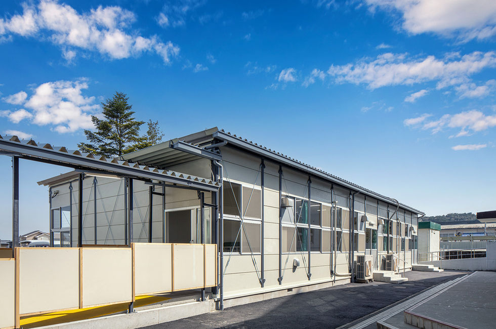 OLシリーズで施工した小学校の校舎です。生徒数の増加に対応するため、普通教室2室とトイレ、昇降口を備えた校舎を建築しました。改修工事に伴う一時的な代替施設ではなく、長期使用を想定した校舎であるため、学校用途として十分な安全性を確保して計画・施工しています。外壁には、断熱性とコストのバランスに優れたOHPパネルを採用しました。内部は移動動線やレイアウトに配慮し、教室・廊下・トイレを配置しています。昇降口前には、既設の渡り廊下と接続できるよう新たに渡り廊下を設置しました。また、県独自のユニバーサルデザイン条例に基づき、渡り廊下のスロープ部分は床の色分けや、引き戸の段差を解消する工夫を施すなど、誰にとっても使いやすい計画としています。