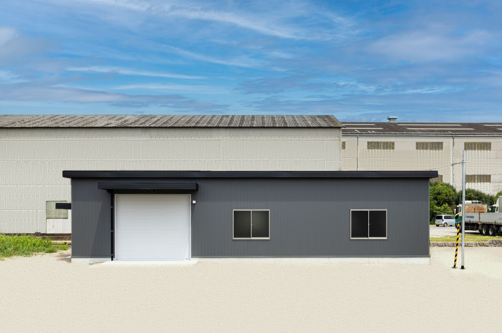 TDシリーズにて設計施工した、工業機械製作会社の倉庫になります。平屋のシンプルな倉庫ですが、外壁には意匠性の高い金属壁材のKスパン(スパンドレル)を採用。細かい溝の縦ラインが美しい重厚感のある陰影をつくり、取付用のビスも隠れる為、防水性にも優れています。出入口には幅3.4m・高さ3.0mの大型軽量電動シャッターを採用し、大型の資材・機械の搬入にも対応。さらに外部庇は奥行きを1.3m確保し、雨の日でも快適な出入りを実現。中柱の無い約150㎡の広々とした倉庫内は、天井高も3.5mを確保し、非常に自由度の高い配置や動線が可能になっています。柱や梁は外壁と同じブラックの鉄骨表しの仕上げとし、内外の統一感を演出。土間もライトグレーの防塵塗装とし、全体的にモノトーンで引き締まった印象になりました。