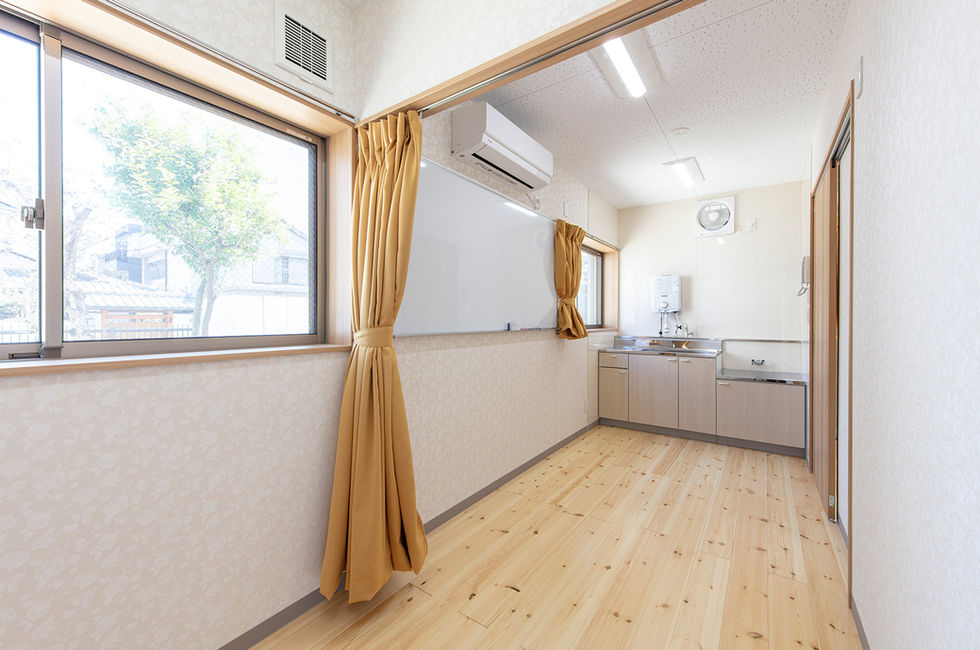 TDシリーズにて設計施工した1階建て学童保育所です。子どもの為に使い勝手を考慮し、動線や扉、棚の位置等を配置しています。室内の壁と床は国産材の杉板張りとなっており、その風合いを生かす為にドアなど建具なども同系色で統一。棚も既存品では無く、現地にて特注で造作することにより、全体の印象が柔らかい雰囲気になっています。感染症対策として、手洗いシンクも児童が使いやすいように大きめの特注寸法のものを、室内・室外に設置。メインの出入り口には、幅7.3m x 奥行き1.8mの庇を取り付け、雨の日でも室外で作業や手洗いができるようになっています。