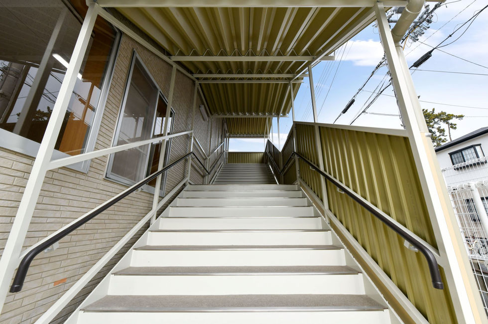 WDシリーズにて設計施工した放課後児童クラブ。隣接するプールにトイレが無いため、男女トイレと倉庫を追加しています。外階段を屋根付きの本階段と、非常用階段の2ヶ所設け、緊急時に多人数でも速やかに避難できるよう計画。1F玄関はバリアフリーデザインを取り入れた手すり付きスロープ+片引戸とし、アルミ庇(出幅1.5m)も柱のないタイプを採用。障害物の無いすっきりとした空間ができました。内装は部屋を広く使用できるよう、造り付け家具を配置。ランドセル、水筒、教材、備品などを効率よく収納できるようになっています。床仕上材は振動、衝撃を緩衝させるためクッション付きのフローリングを敷き、他室へ響きにくい環境にしました。