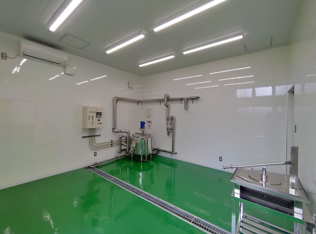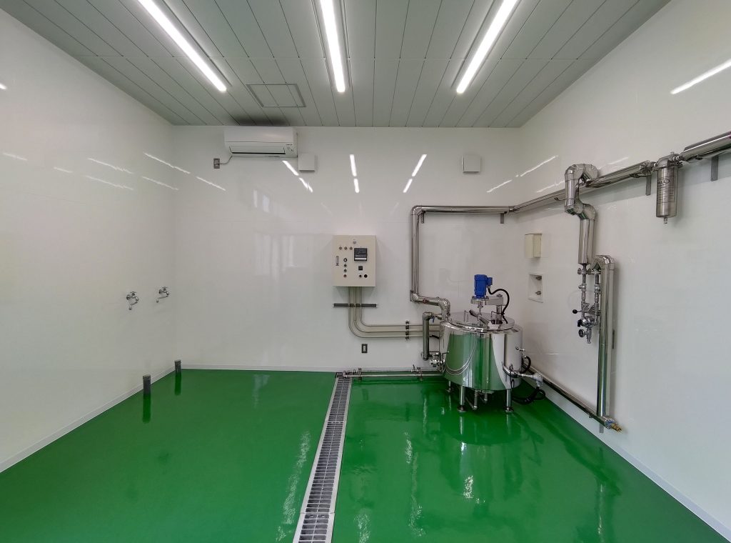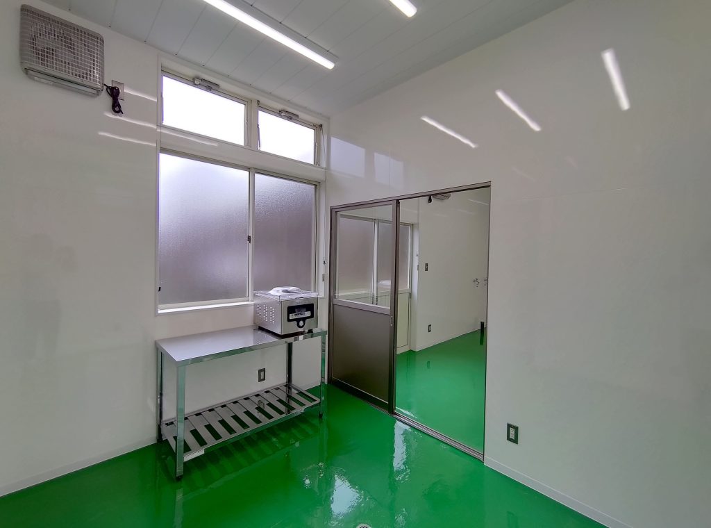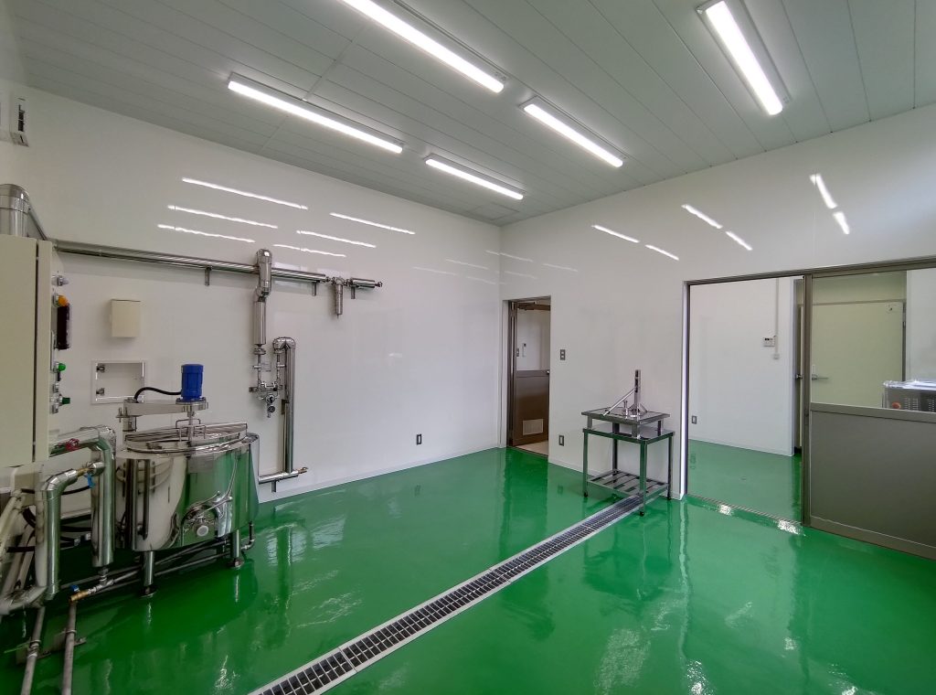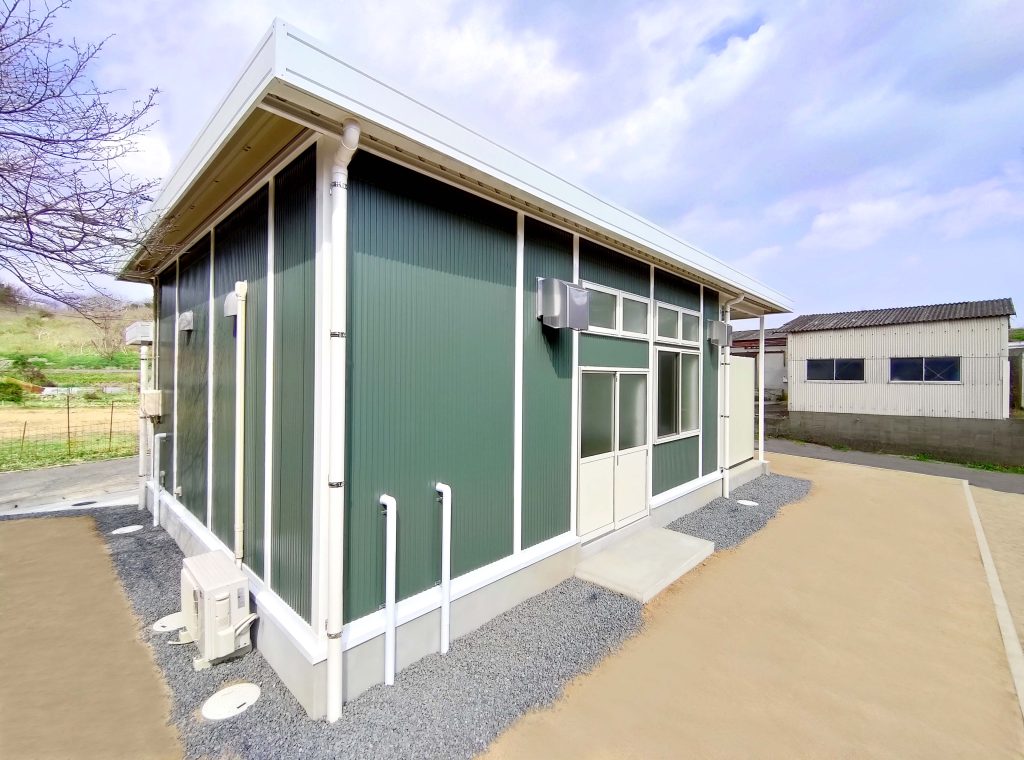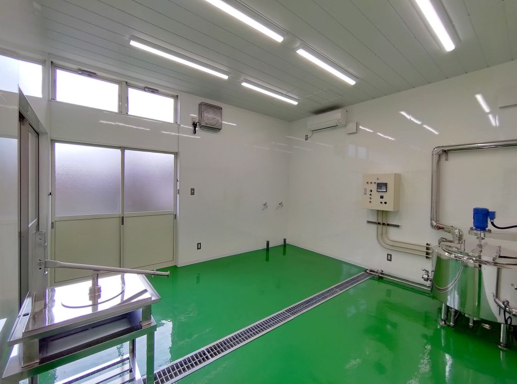 牧場に併設された、可愛いらしいチーズ工房。厨房スペースがメインを占める間取りになっており、さらに熟成用の大型冷蔵庫が外部に設置され、ドアを介して厨房スペースとつながっています。床は汚れにくく、ホコリを抑える防塵機能のある専用塗装仕上げ。厨房内の天井は高湿度の環境に適した不燃アルミパネル。壁は汚れがつきにくくメンテナンス性に優れた、抗菌・不燃仕様のキッチンパネル仕上げ(メラミン不燃化粧板)。外壁は牧場らしく、グリーンの金属製サイディングを採用。柱・樋・サッシ等は全てホワイトで統一することにより、統一感のある外観に仕上がりました。 施主様: 倉敷チーズ工房ハルパル