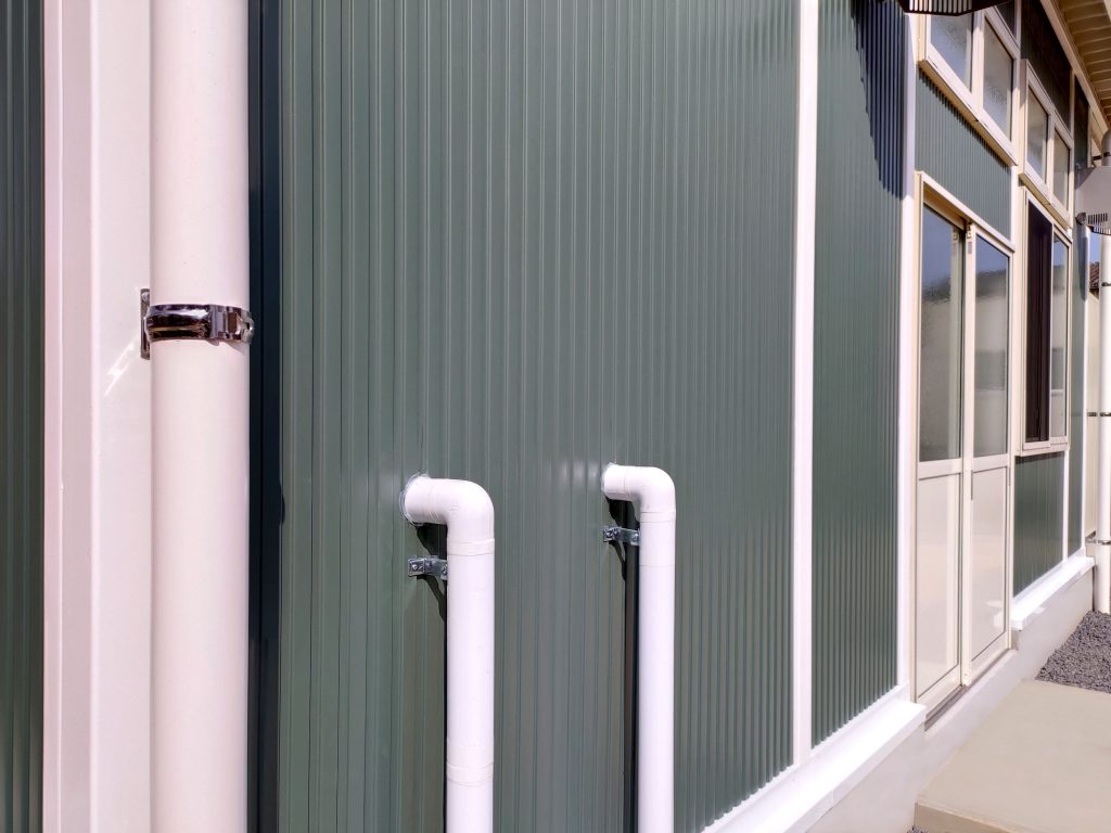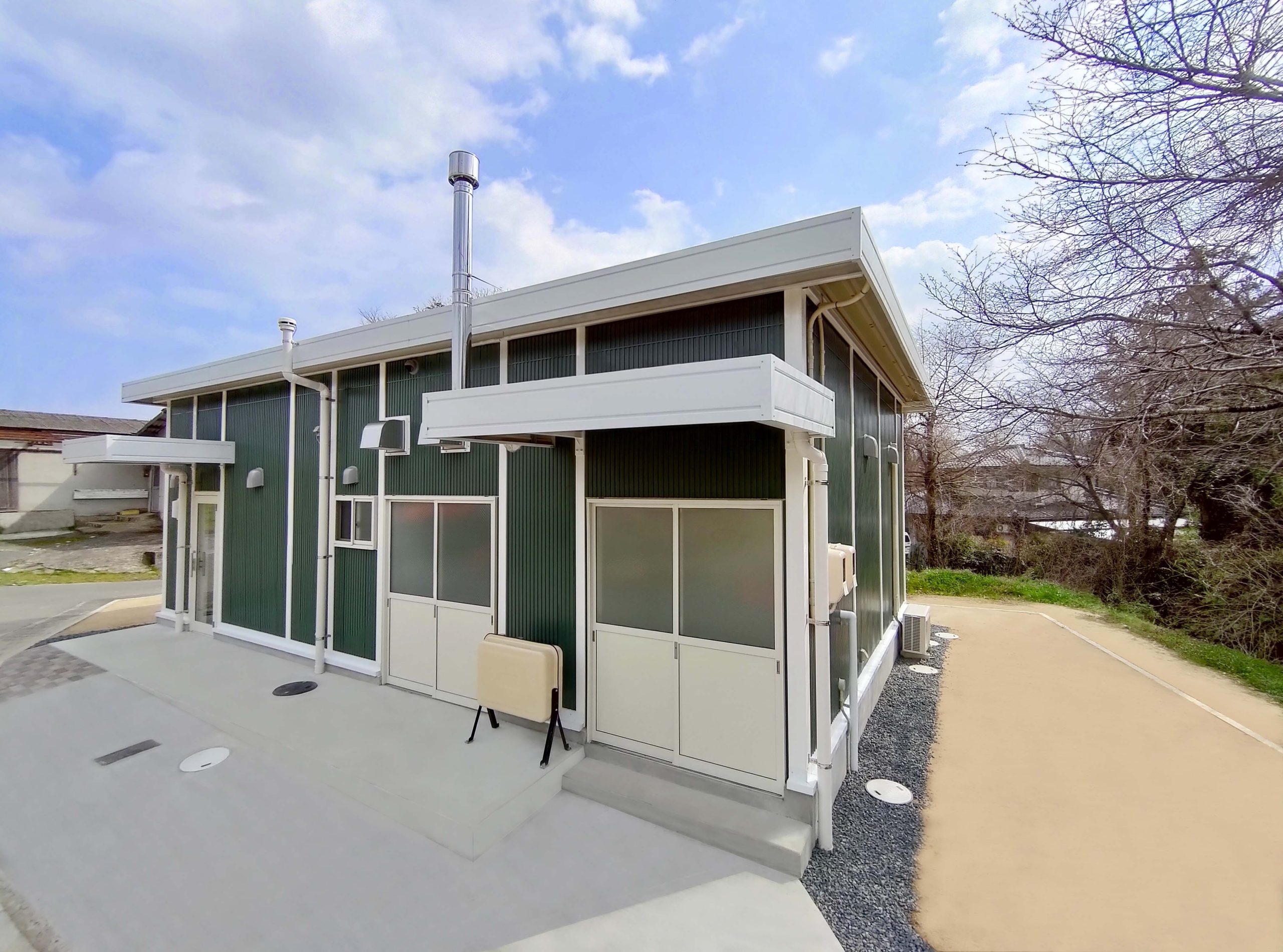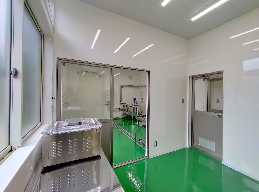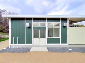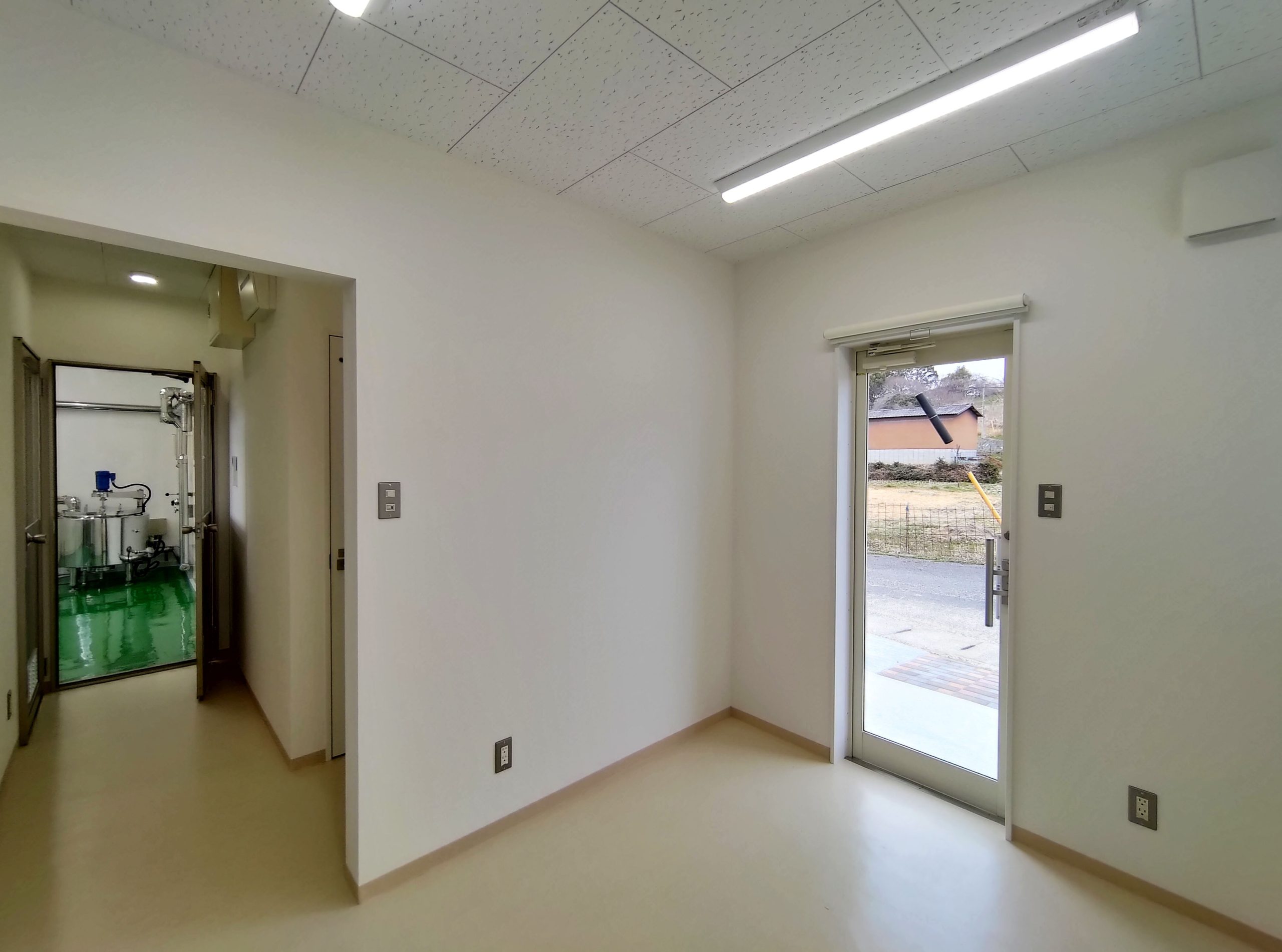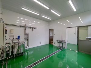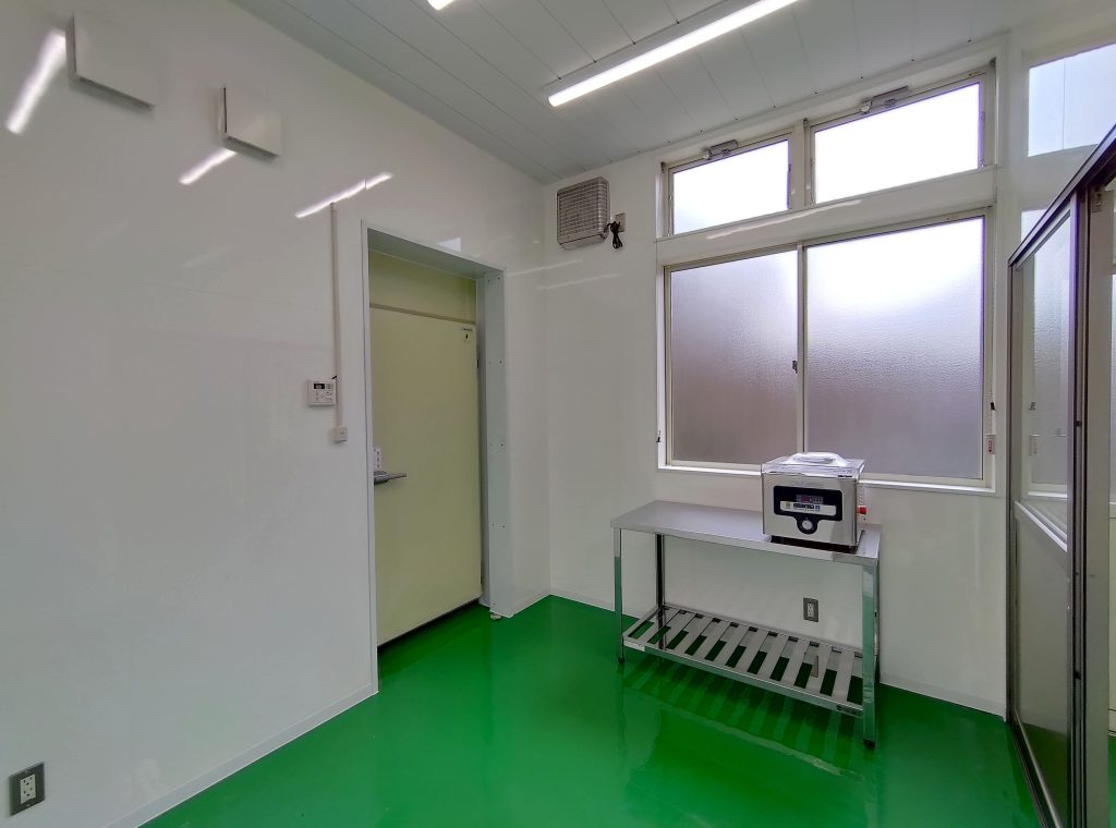 牧場に併設された、可愛いらしいチーズ工房。厨房スペースがメインを占める間取りになっており、さらに熟成用の大型冷蔵庫が外部に設置され、ドアを介して厨房スペースとつながっています。床は汚れにくく、ホコリを抑える防塵機能のある専用塗装仕上げ。厨房内の天井は高湿度の環境に適した不燃アルミパネル。壁は汚れがつきにくくメンテナンス性に優れた、抗菌・不燃仕様のキッチンパネル仕上げ(メラミン不燃化粧板)。外壁は牧場らしく、グリーンの金属製サイディングを採用。柱・樋・サッシ等は全てホワイトで統一することにより、統一感のある外観に仕上がりました。 施主様: 倉敷チーズ工房ハルパル