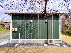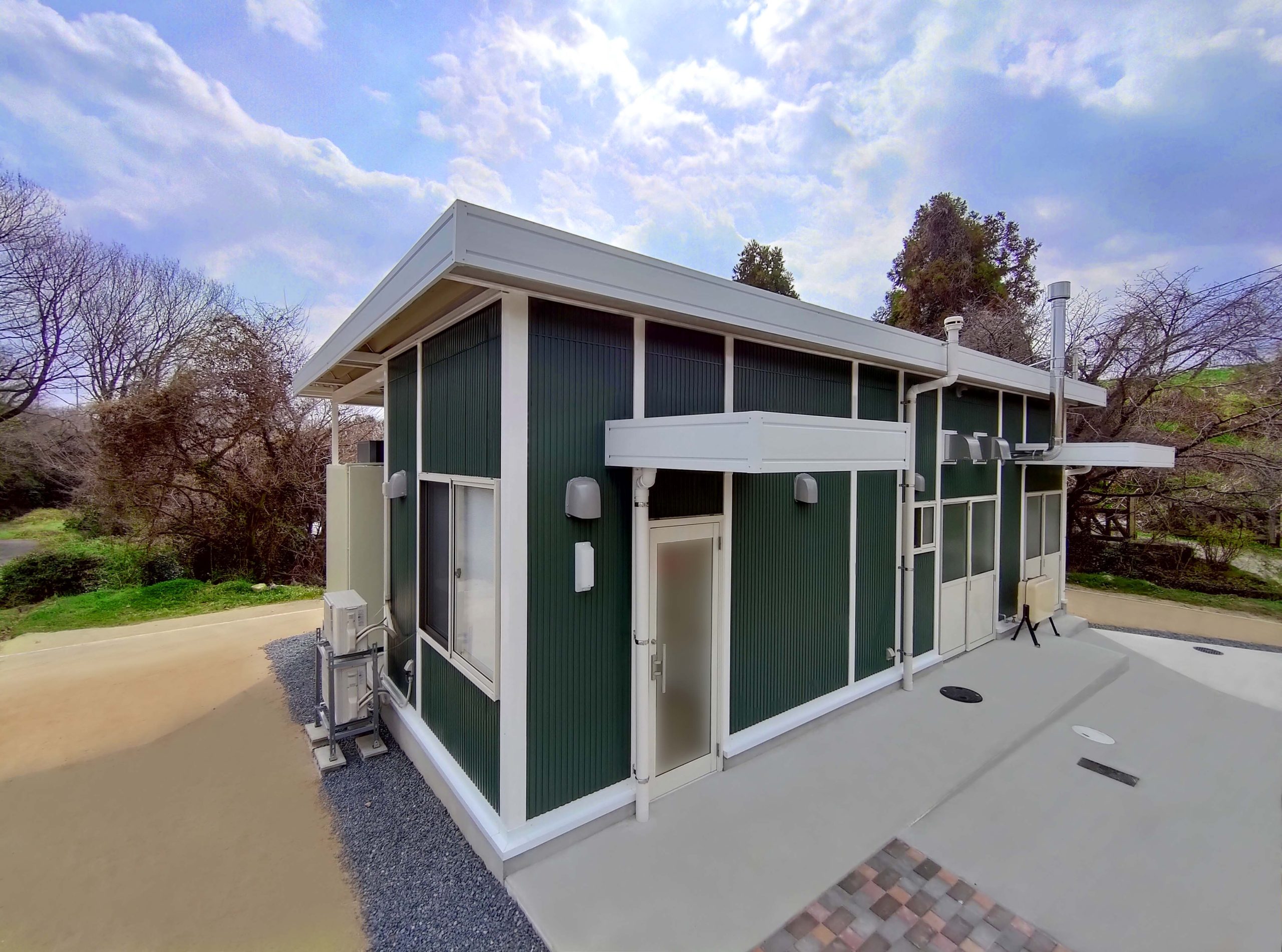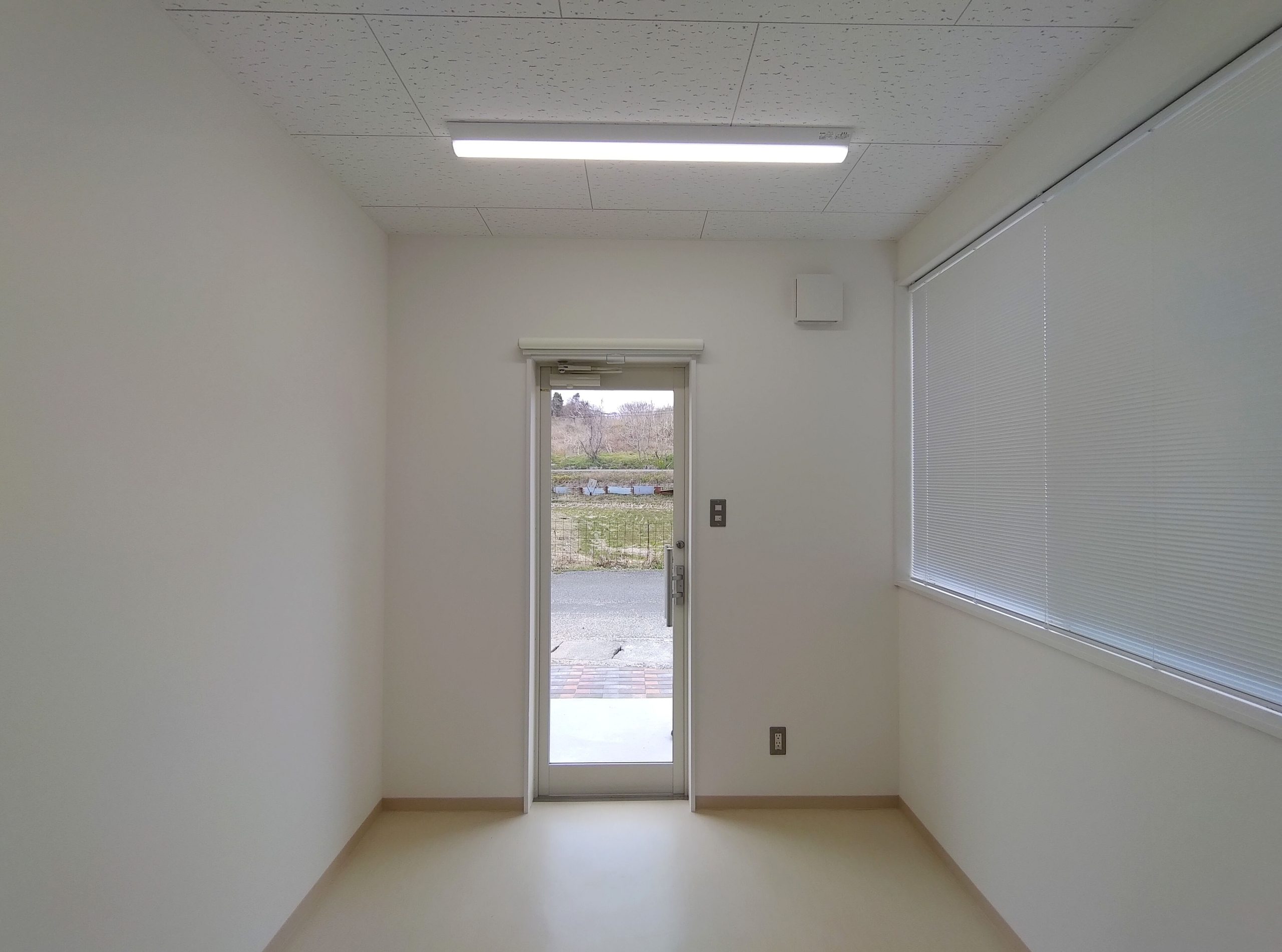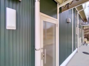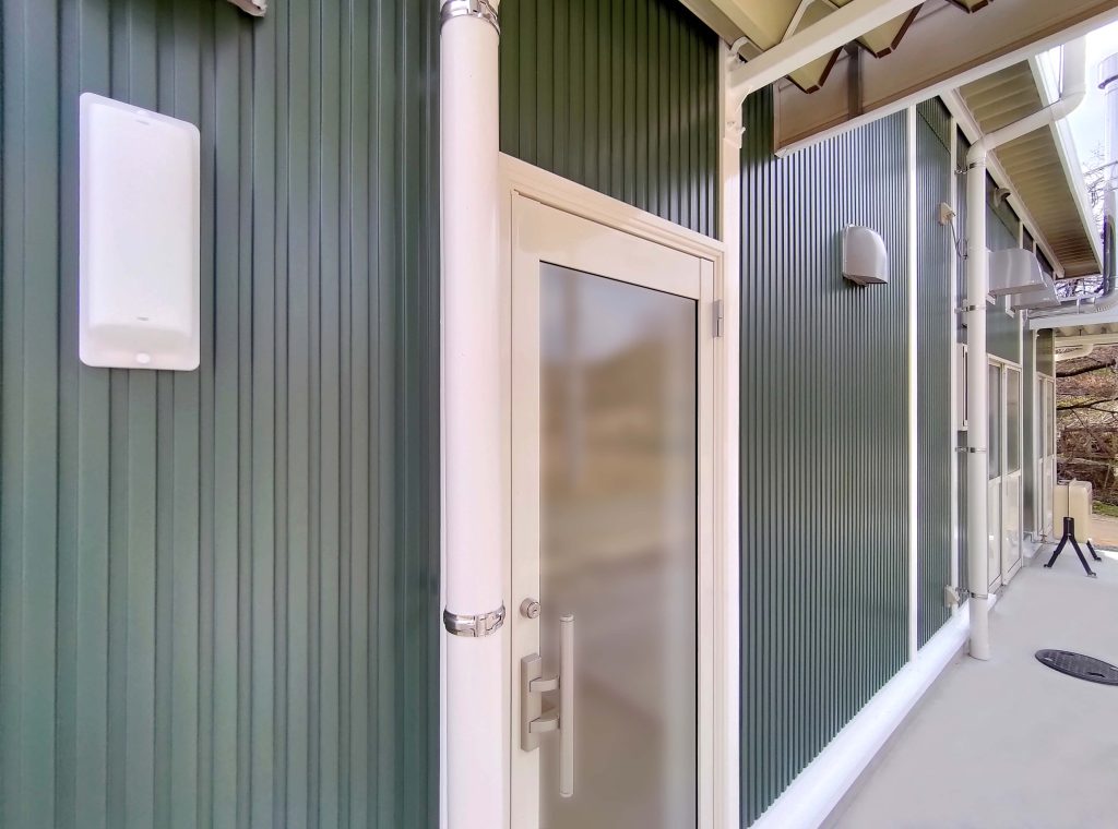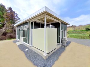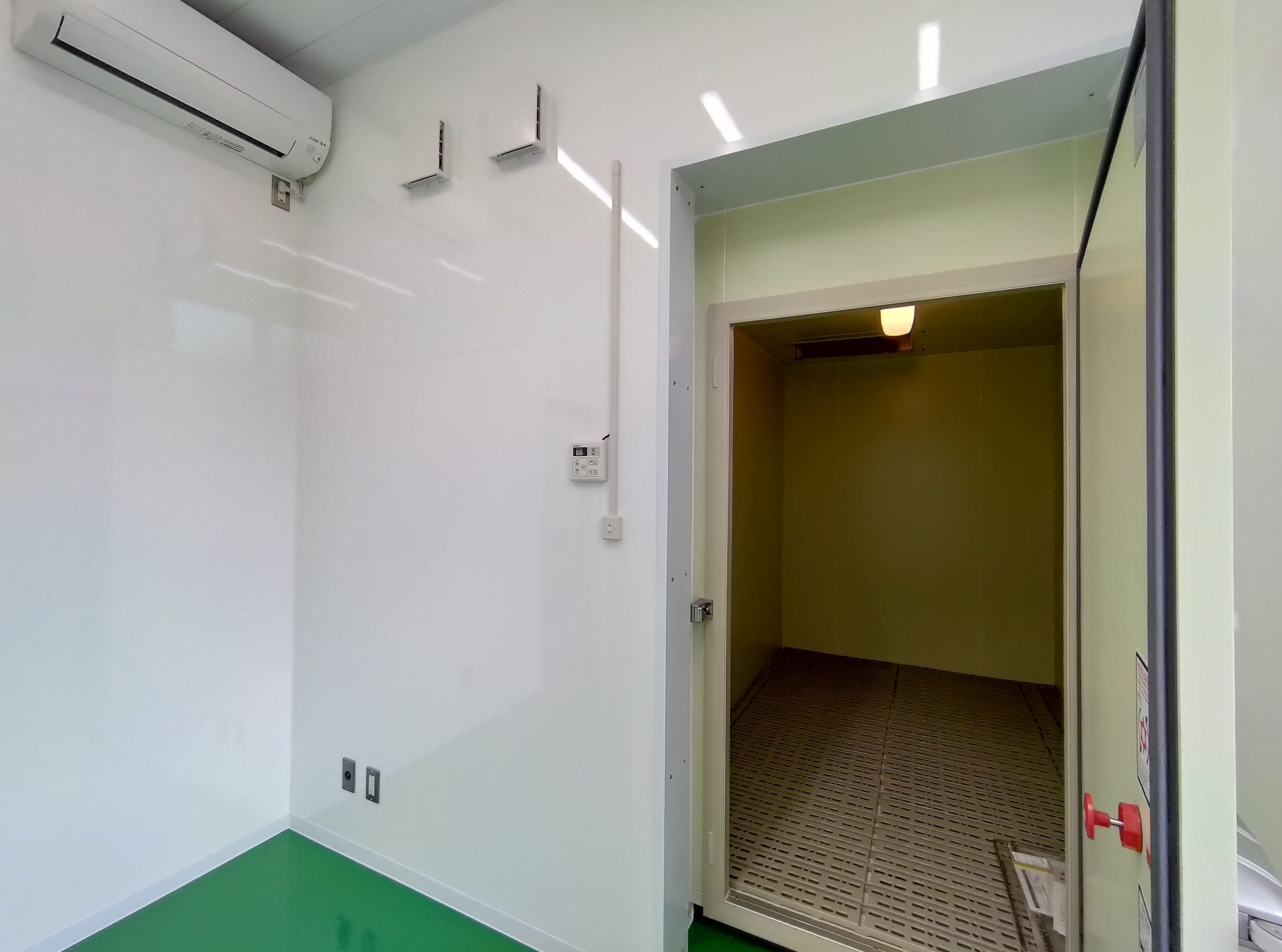 牧場に併設された、可愛いらしいチーズ工房。厨房スペースがメインを占める間取りになっており、さらに熟成用の大型冷蔵庫が外部に設置され、ドアを介して厨房スペースとつながっています。床は汚れにくく、ホコリを抑える防塵機能のある専用塗装仕上げ。厨房内の天井は高湿度の環境に適した不燃アルミパネル。壁は汚れがつきにくくメンテナンス性に優れた、抗菌・不燃仕様のキッチンパネル仕上げ(メラミン不燃化粧板)。外壁は牧場らしく、グリーンの金属製サイディングを採用。柱・樋・サッシ等は全てホワイトで統一することにより、統一感のある外観に仕上がりました。 施主様: 倉敷チーズ工房ハルパル