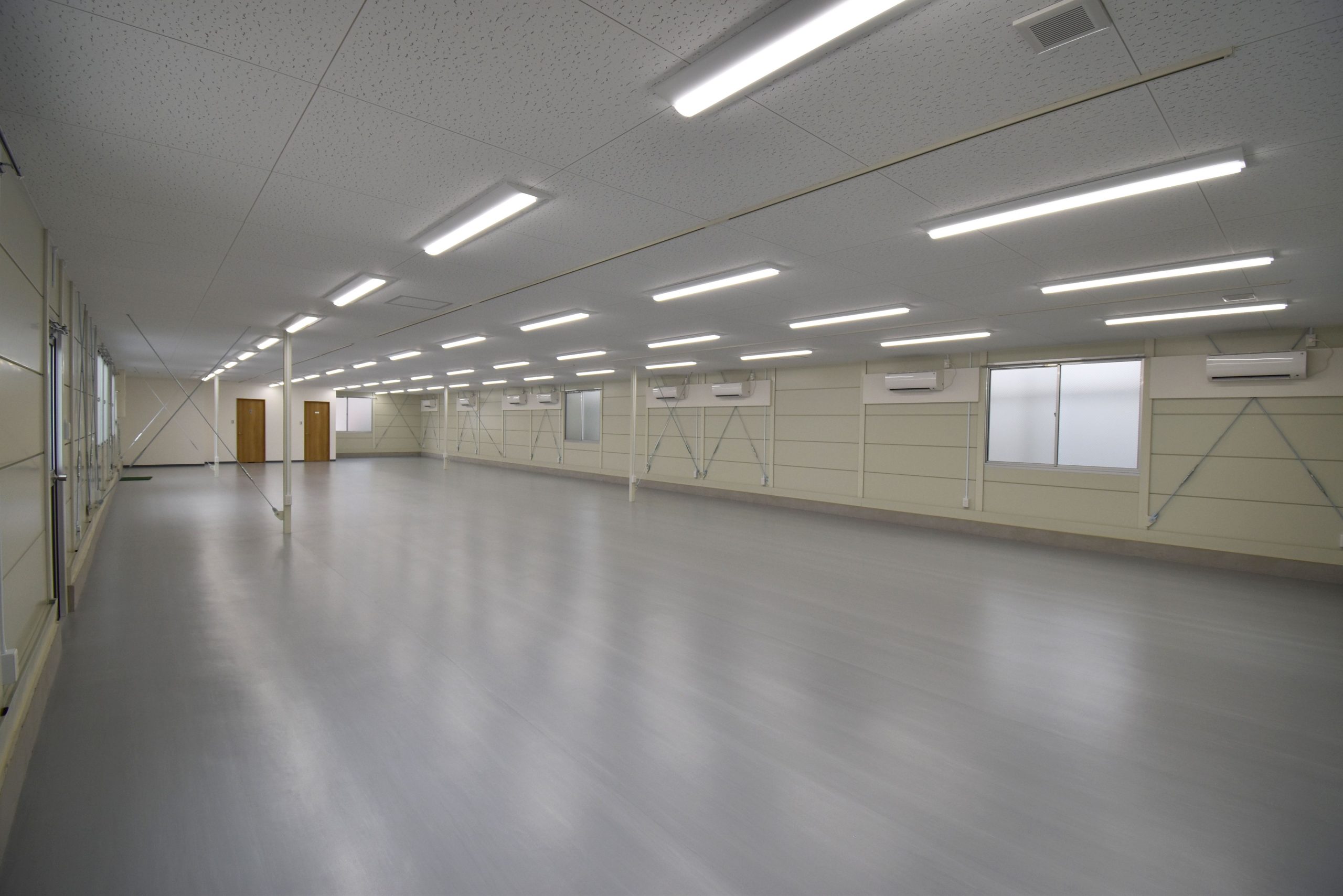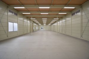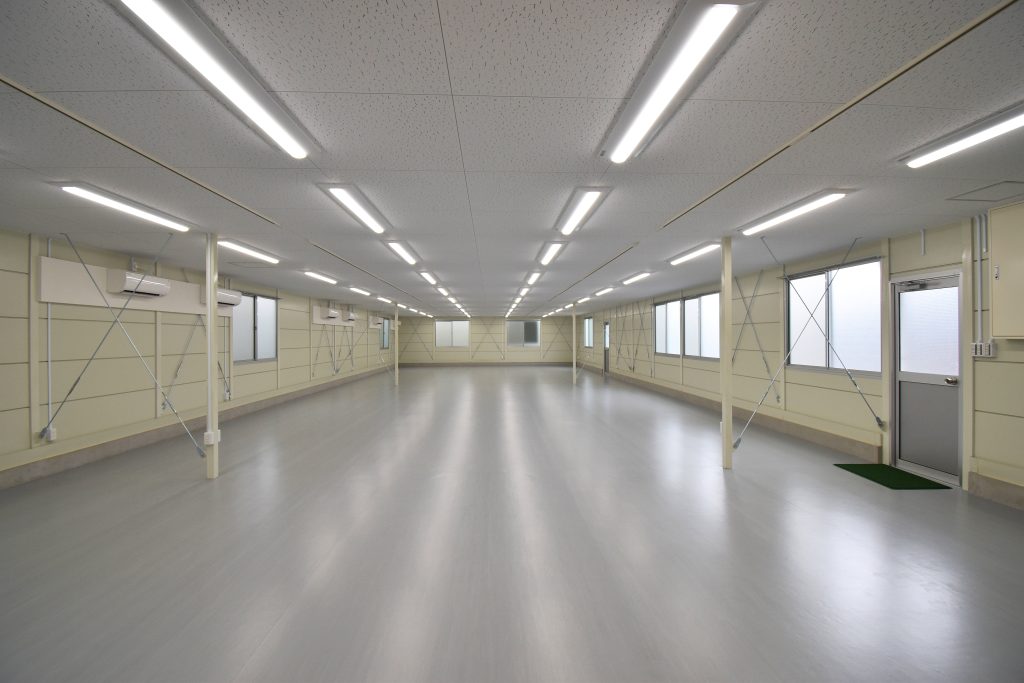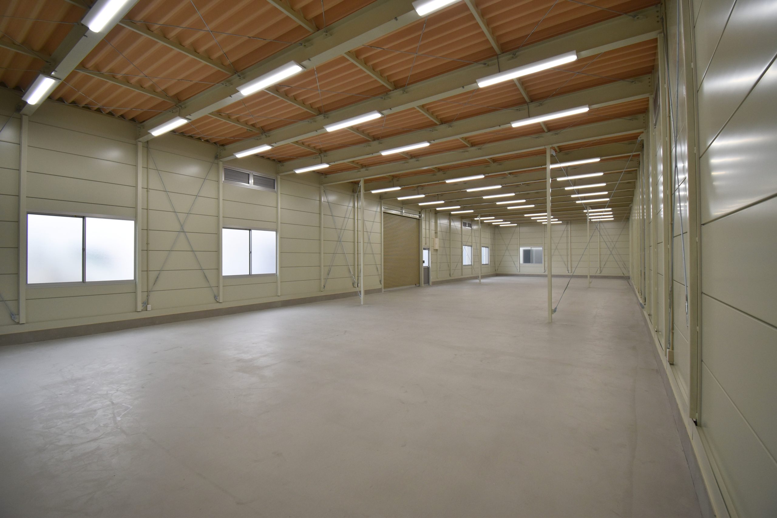 壁面ブレースを室内側に設け、すっきりとした仕上がりの外観と、柱の数を最小限に抑えた広々とした空間の室内を実現。特に倉庫棟は 梁下 「梁下」 梁(はり)の下端から床仕上げ面までの高さを示す寸法。意匠的な天井仕上げの高さ(天井高)とは異なり、構造体としての制限寸法を表す。 梁下:梁の下端まで 天井高:内装仕上げ後の天井面ま...more までの高さを4mとり、荷物保管のスペースを最大限に確保しました。立地が海岸沿いであることから、サビに強いタイプの塗料を使用するなど、物件に即した仕様を取り込みつつも、規格建築の強みを活かし、コストを抑えながら短工期で完成しました。