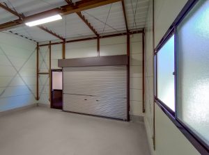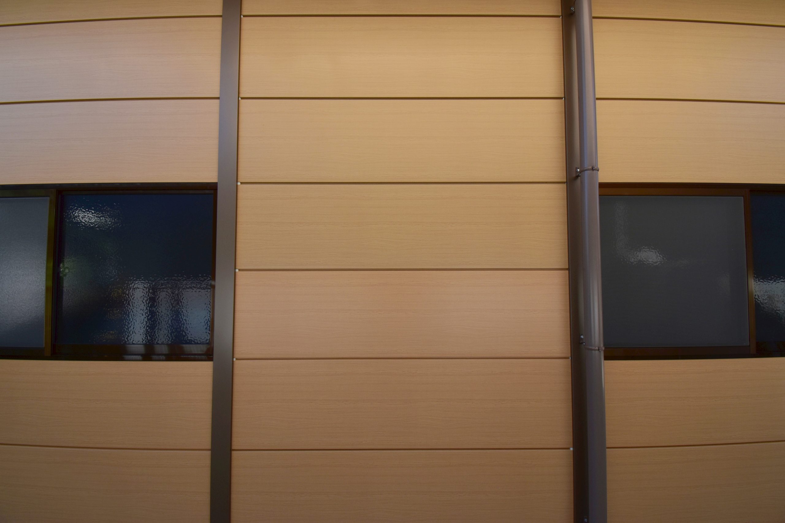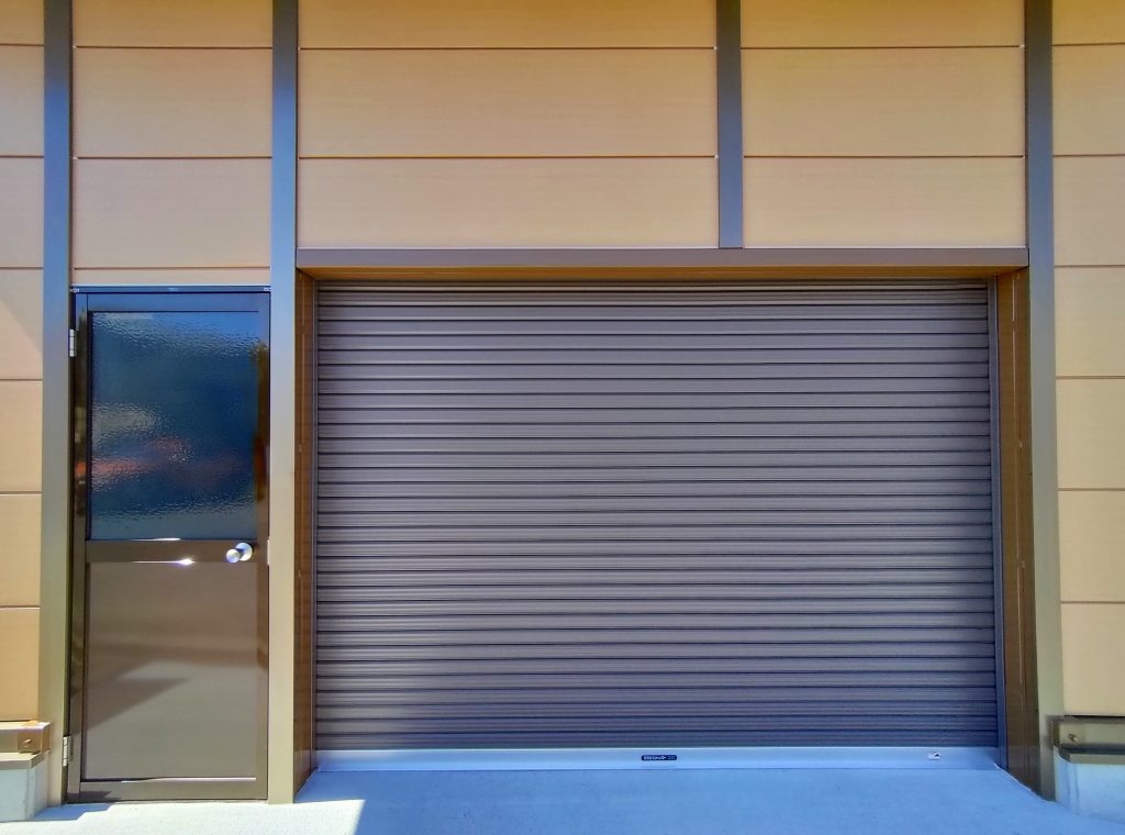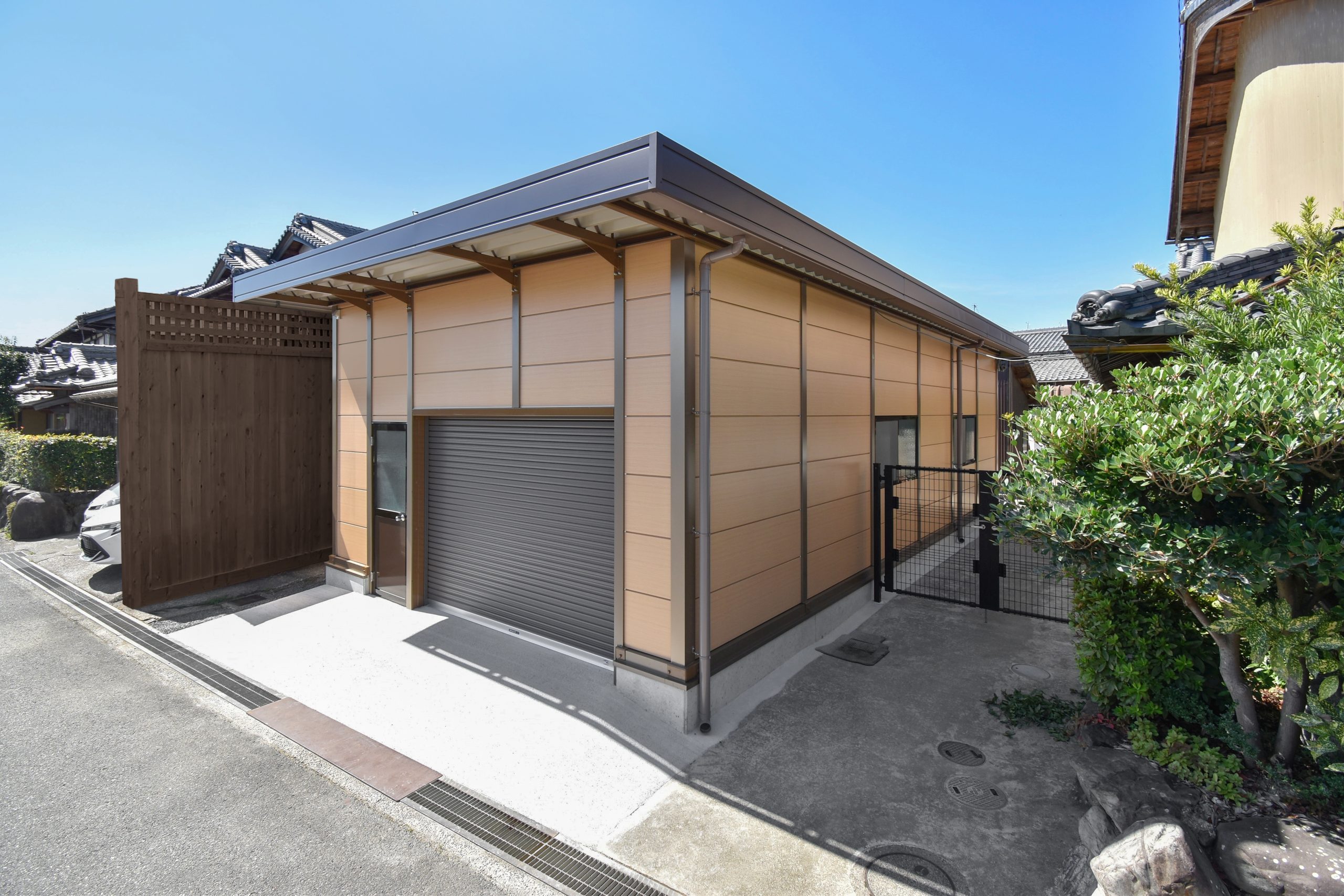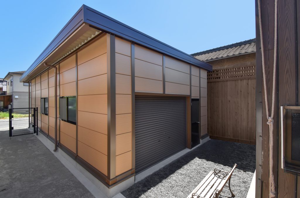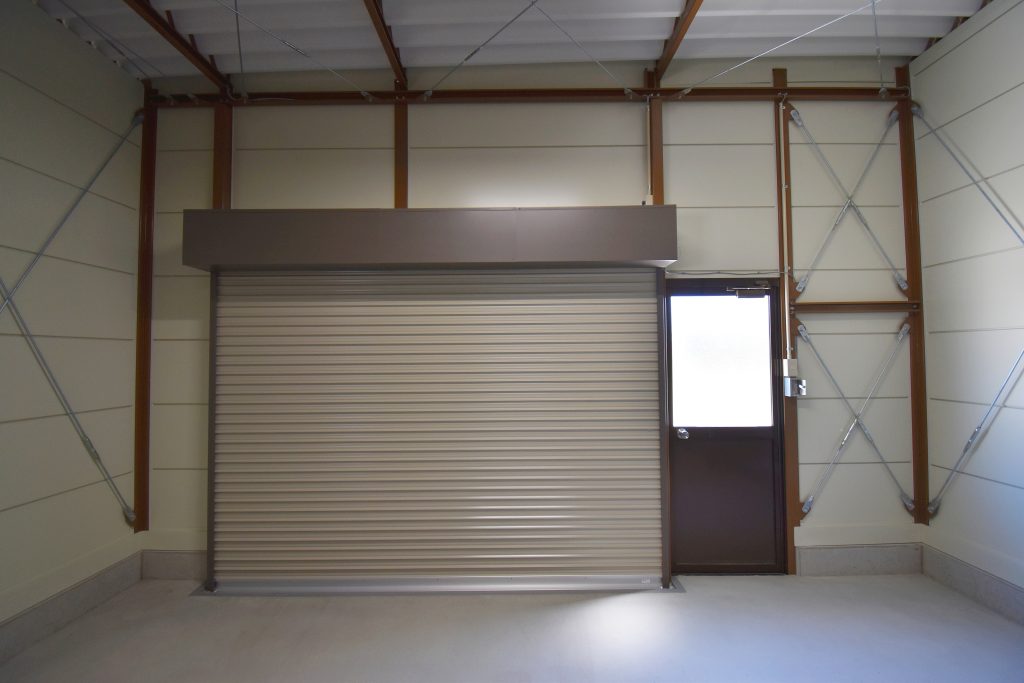 倉庫の建て替えにあたり、コストを抑えつつ隣接する日本家屋と合う茶色を基調したものにして欲しい、というお客様のご要望がありましたので、別注の木目調壁パネルと、同質感の柱カバーを取付けた、特別仕様のライトシリーズをご提案。さらに、倉庫の裏に広がる敷地への動線及び風通し・採光を考慮し、倉庫前面・後面、両方に開口3m高さ2mのシャッターを取り付けております。
