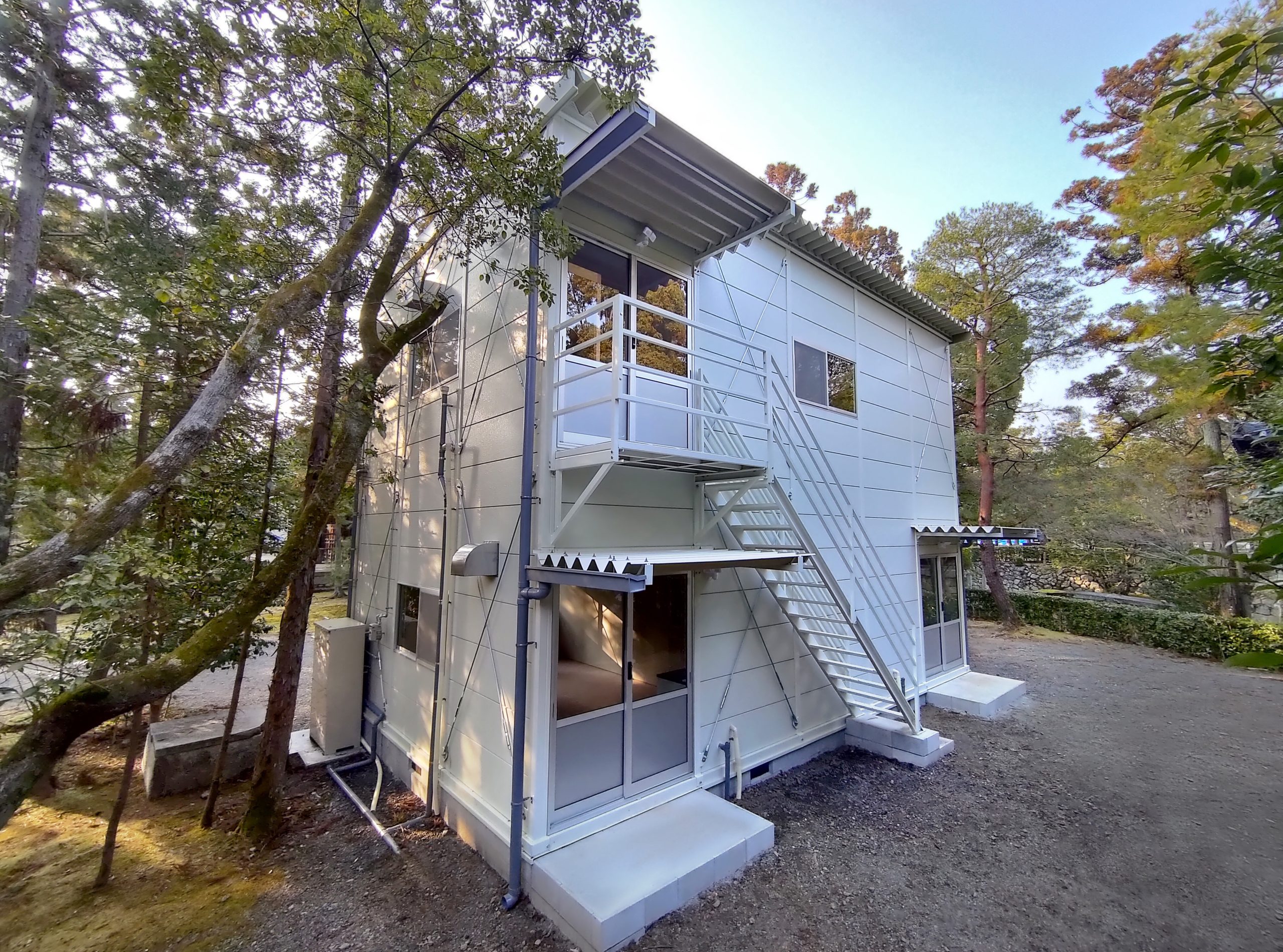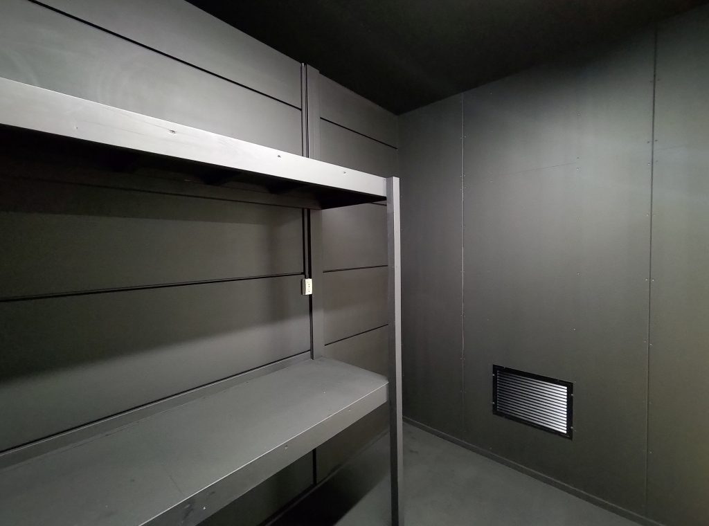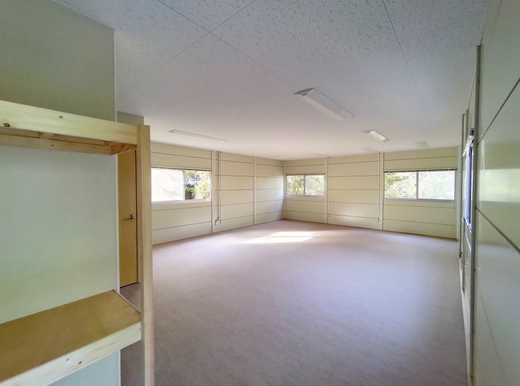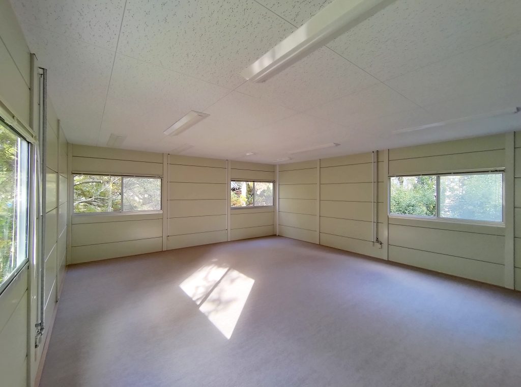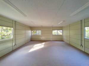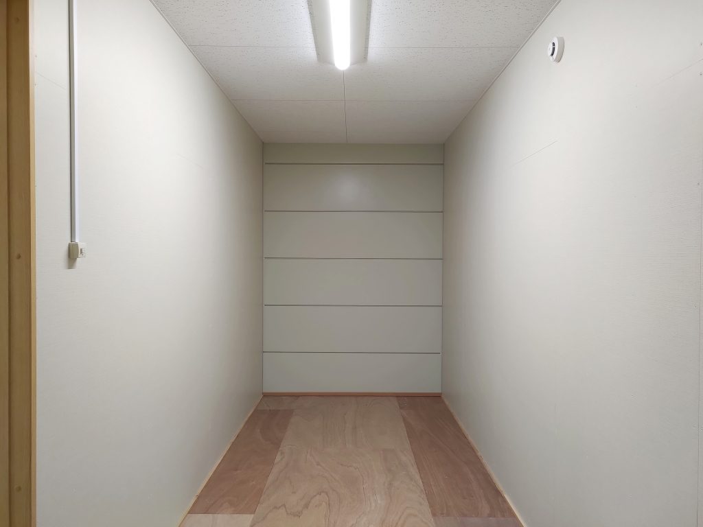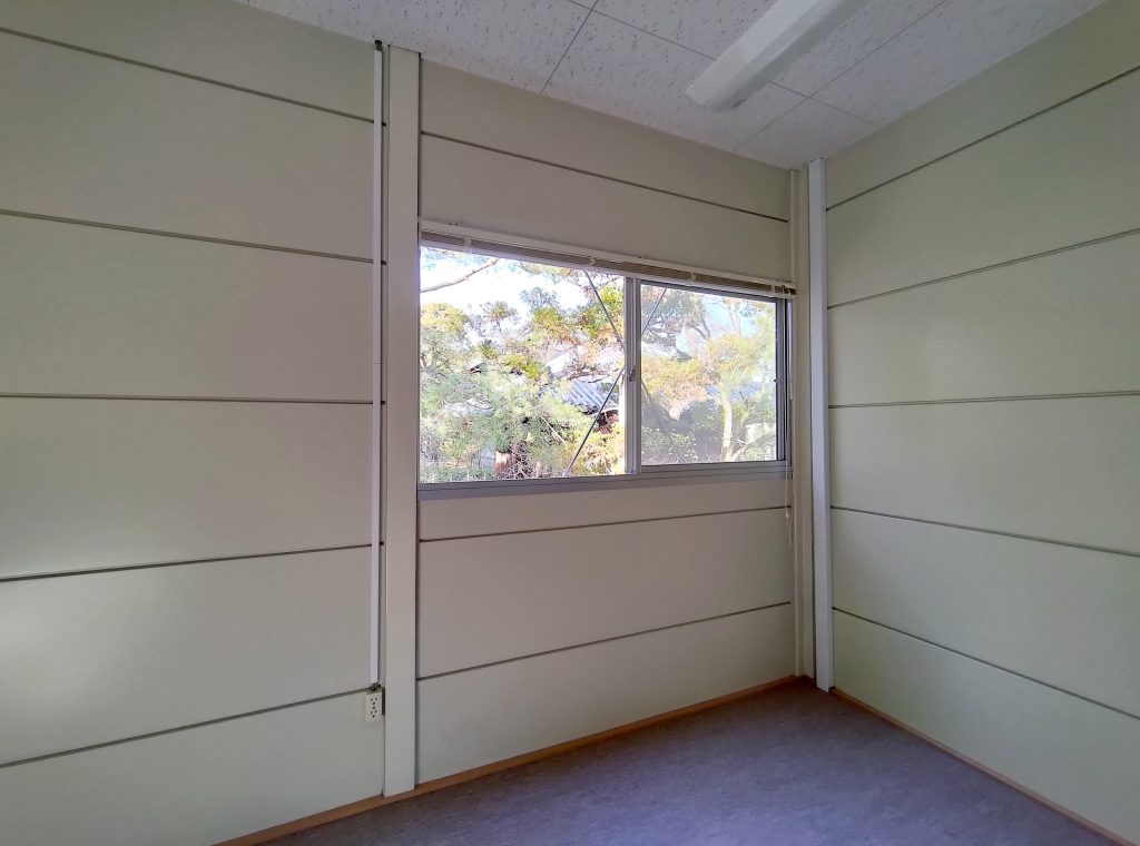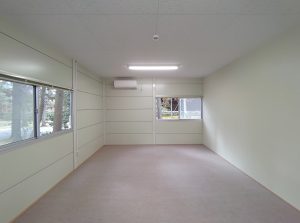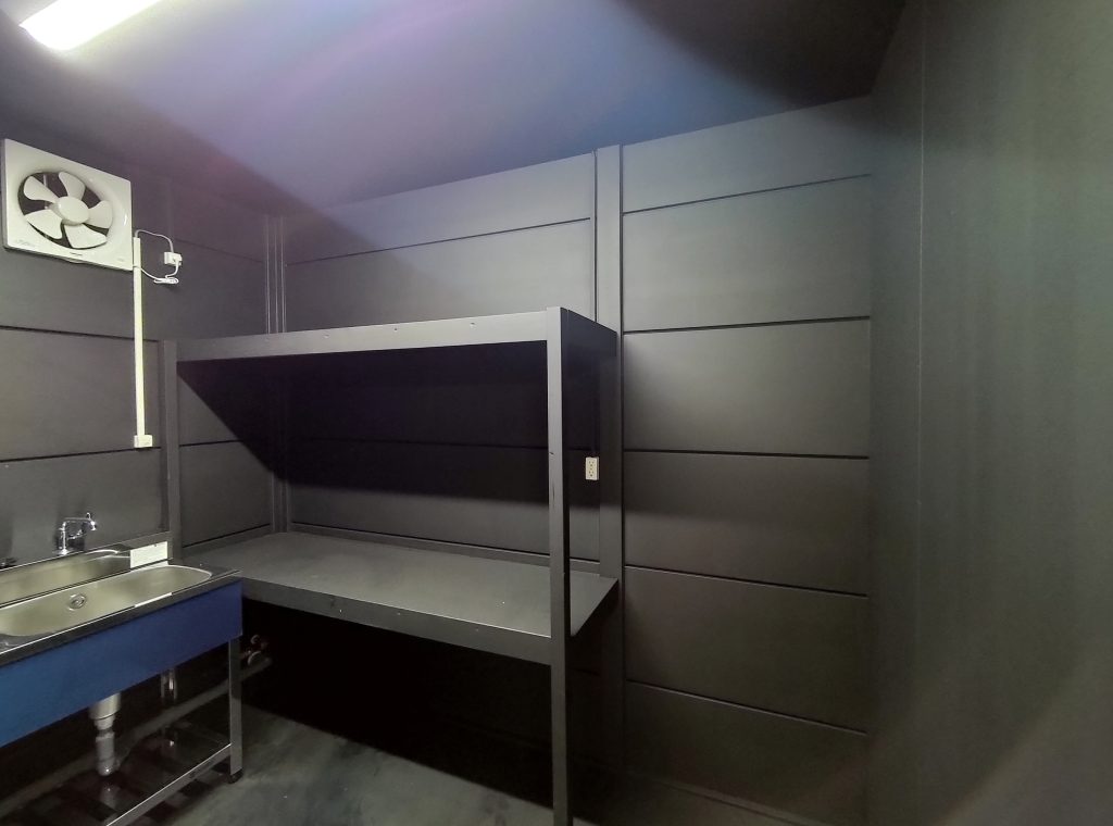 寺社敷地内の現場事務所・作業員休憩所。昔ながらのネガフィルムで保管されている文化財写真の保存・管理の為に暗室が必要とのことでした。暗室内は、天井・壁・鋼板面・床、それぞれの材質に適した黒色のペイントで仕上げております。長期間にわたるリース期間を考慮し、事務所スペースの天井面を化粧石膏ボード、床面をパンチカーペットとするなど、快適に過ごしていただけるような設計になっています。