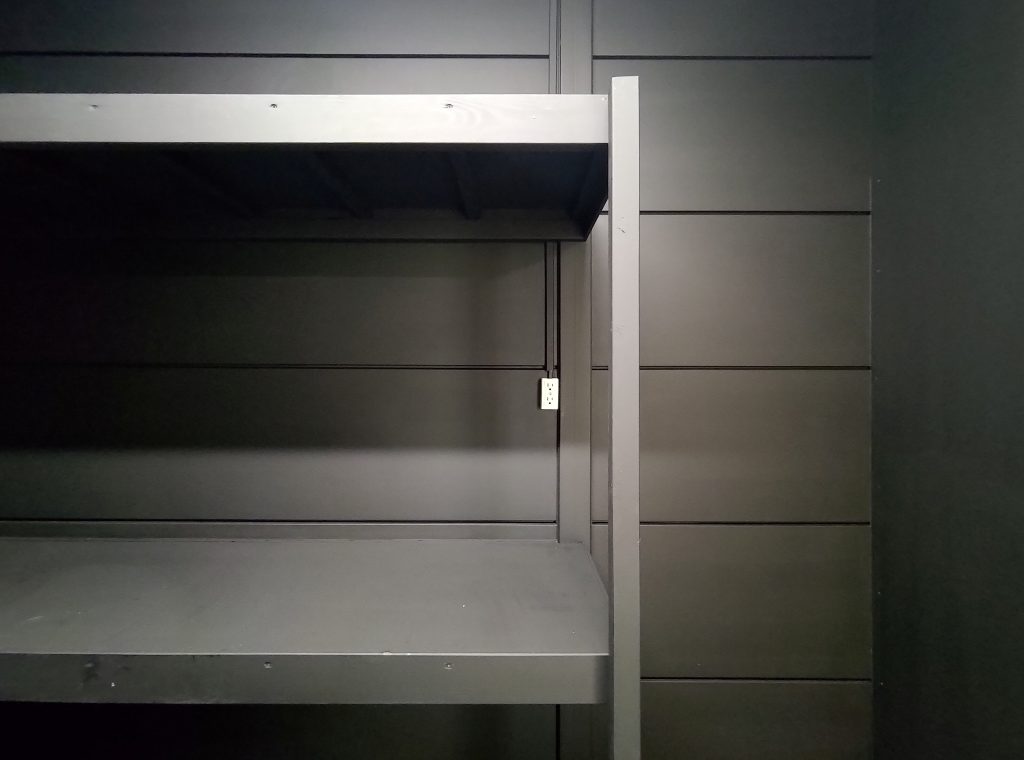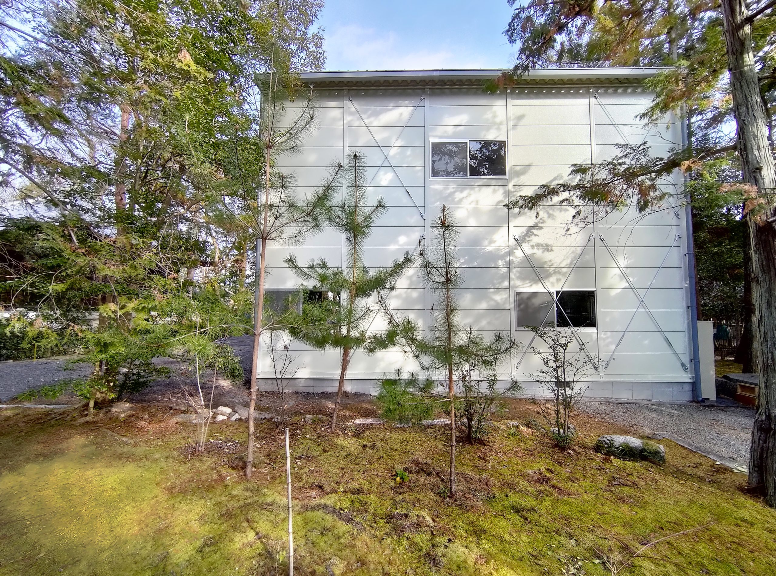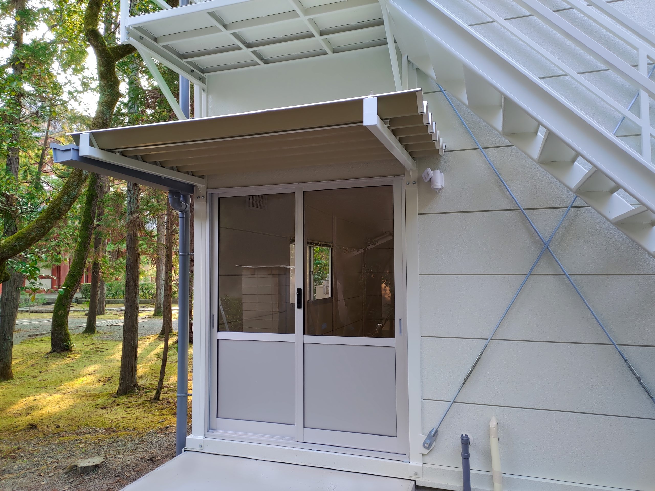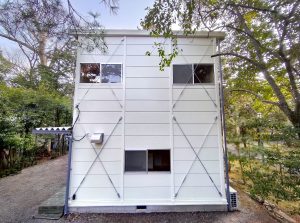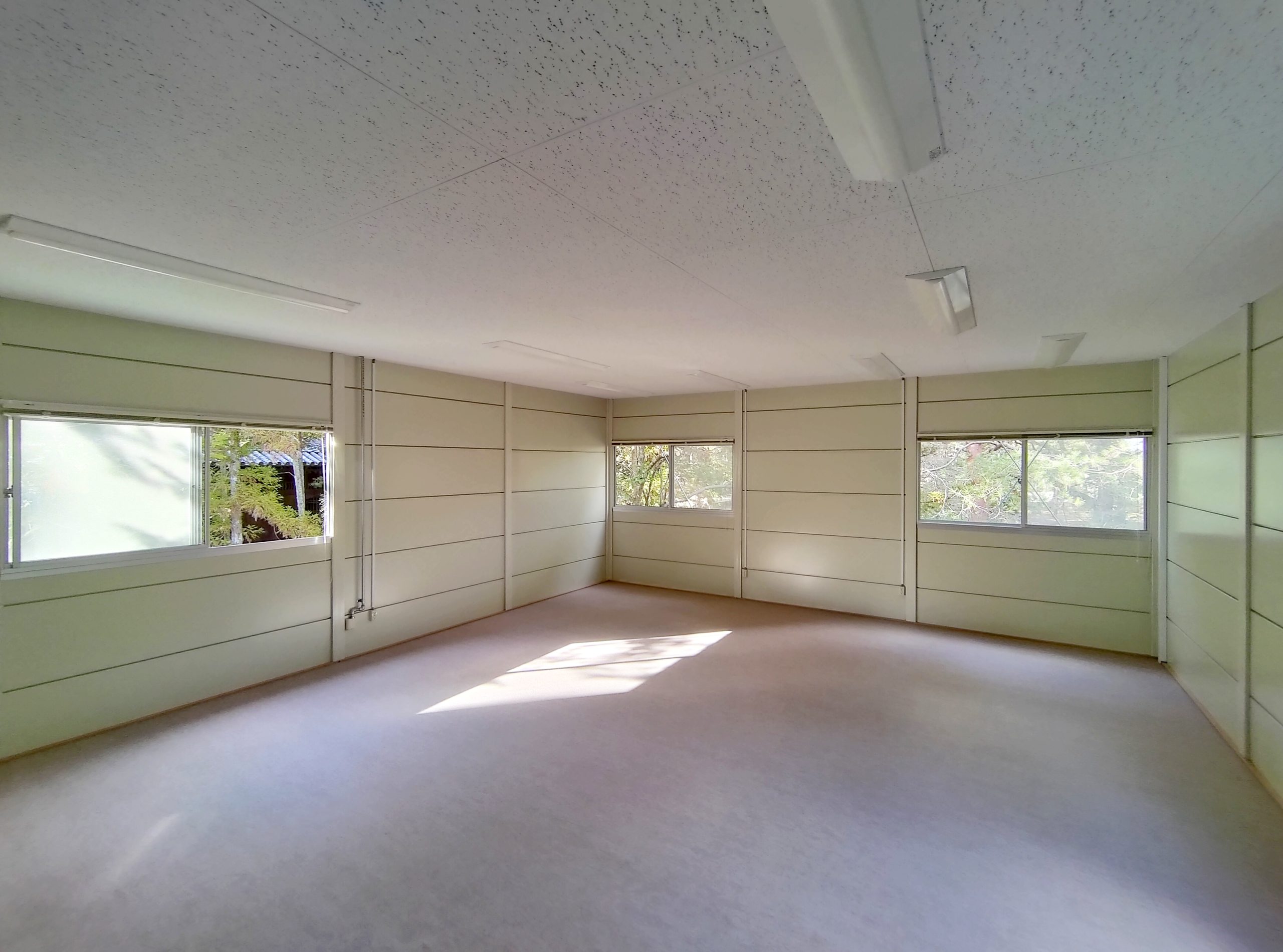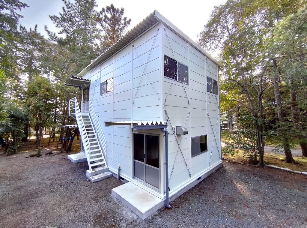 寺社敷地内の現場事務所・作業員休憩所。昔ながらのネガフィルムで保管されている文化財写真の保存・管理の為に暗室が必要とのことでした。暗室内は、天井・壁・鋼板面・床、それぞれの材質に適した黒色のペイントで仕上げております。長期間にわたるリース期間を考慮し、事務所スペースの天井面を化粧石膏ボード、床面をパンチカーペットとするなど、快適に過ごしていただけるような設計になっています。