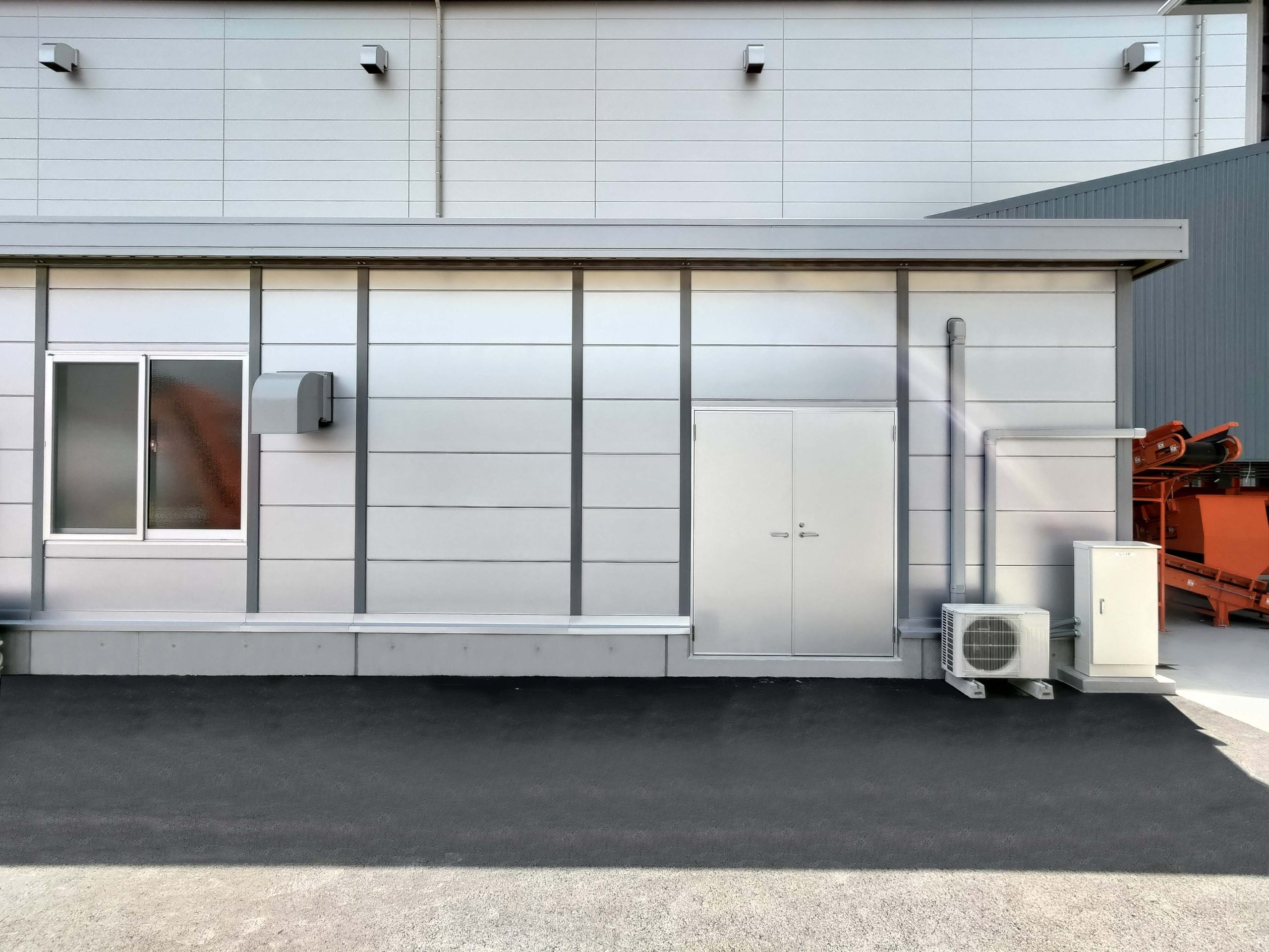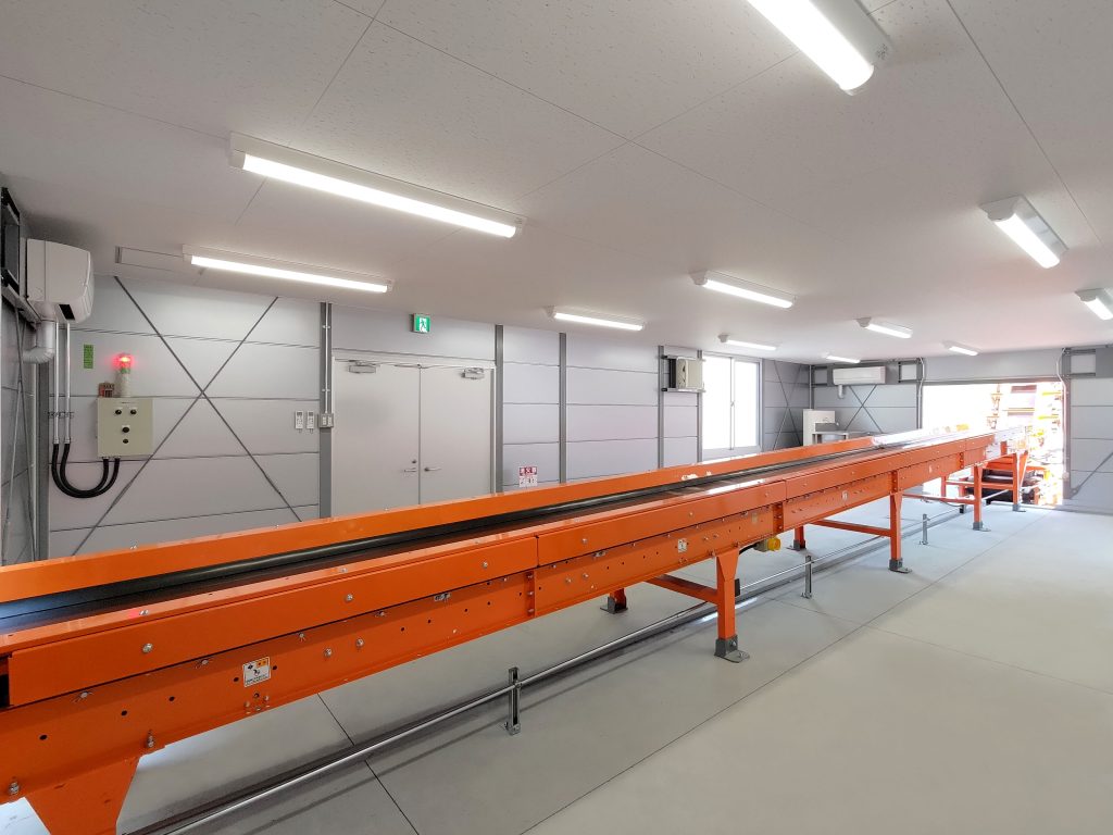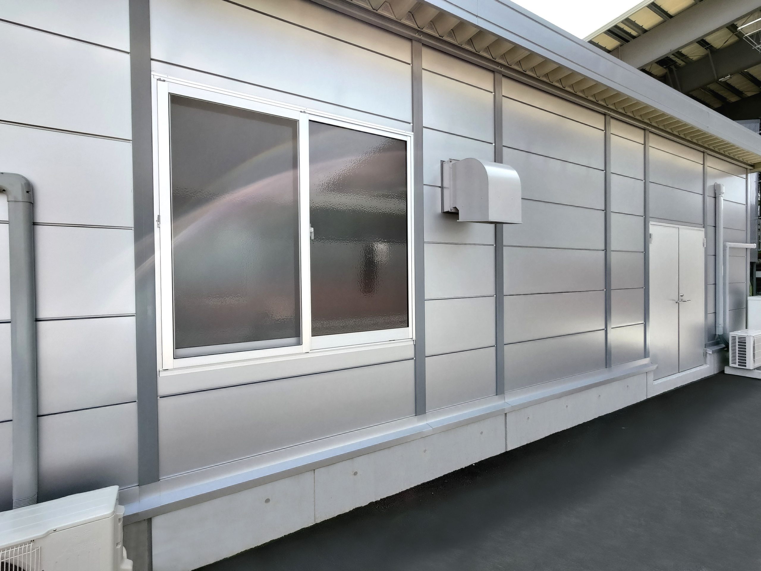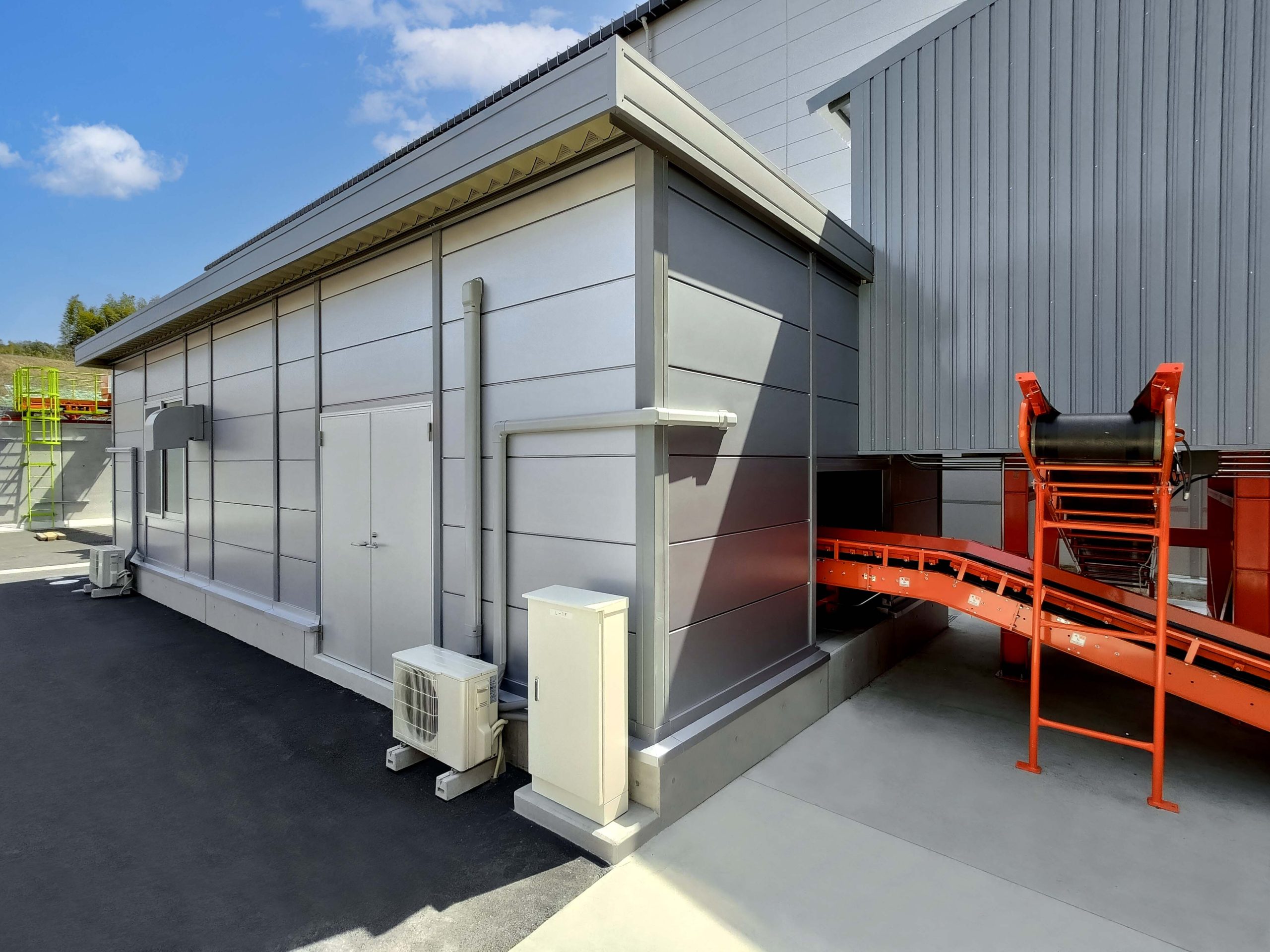 4棟が連なったリサイクル工場内の作業所。当社独自のシルバー色サンドイッチパネルを採用し、柱も同色系にて塗装。また、外装に使われている建具、屋根、樋に関しましてもグレー系を採用しているため、立ち並ぶ景色はリサイクル工場としての一体感があります。このようなベルトコンベアーを貫通させるための開口仕様なども、当社にて設計・プレハブ製作・組み立て・施工までを行えるため、お客様のニーズに合わせ柔軟に対応させていただきました。
