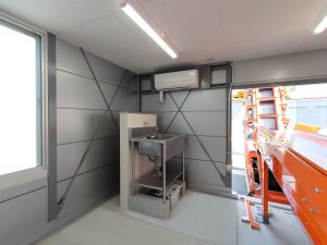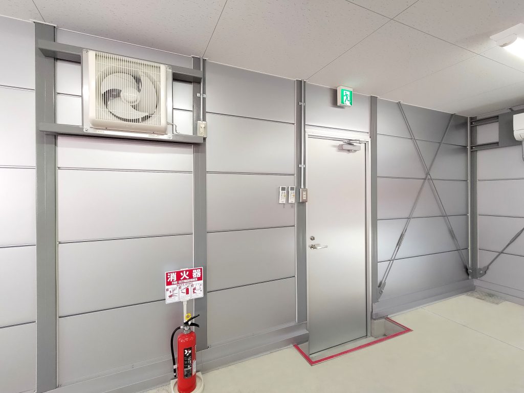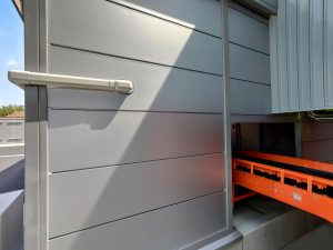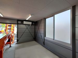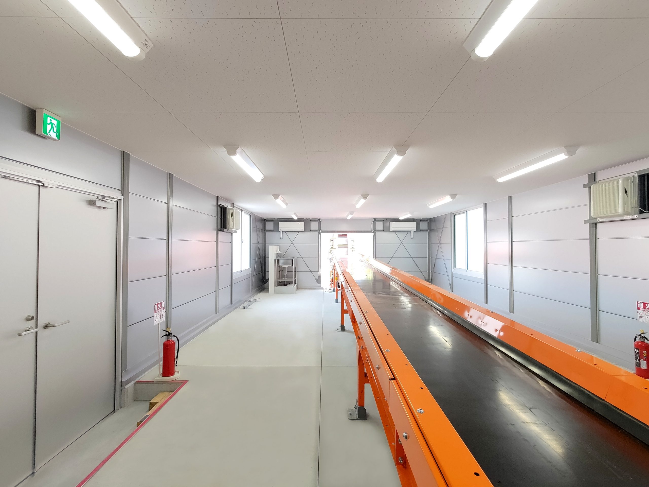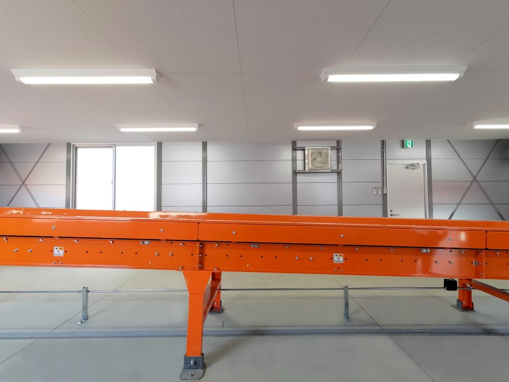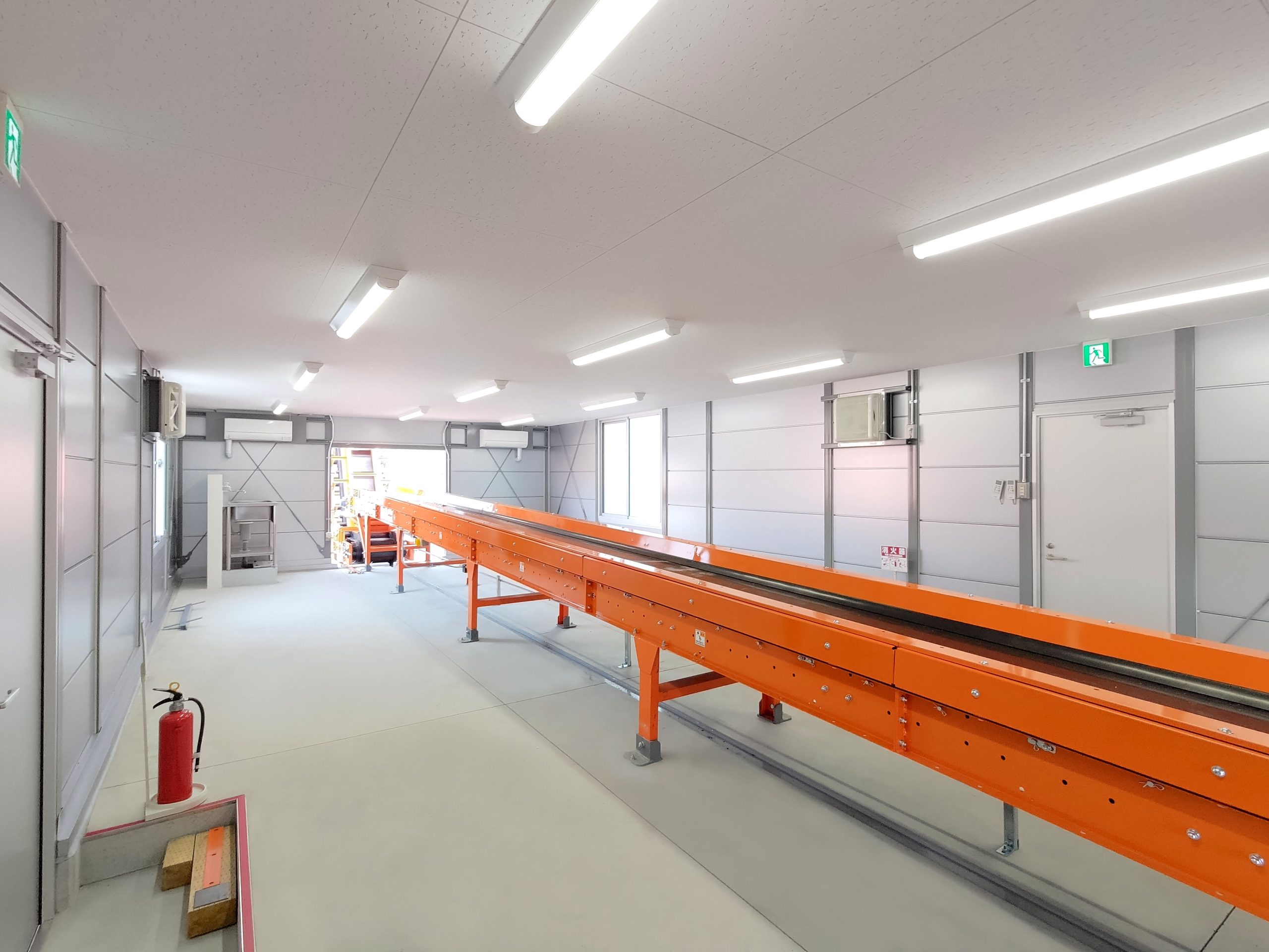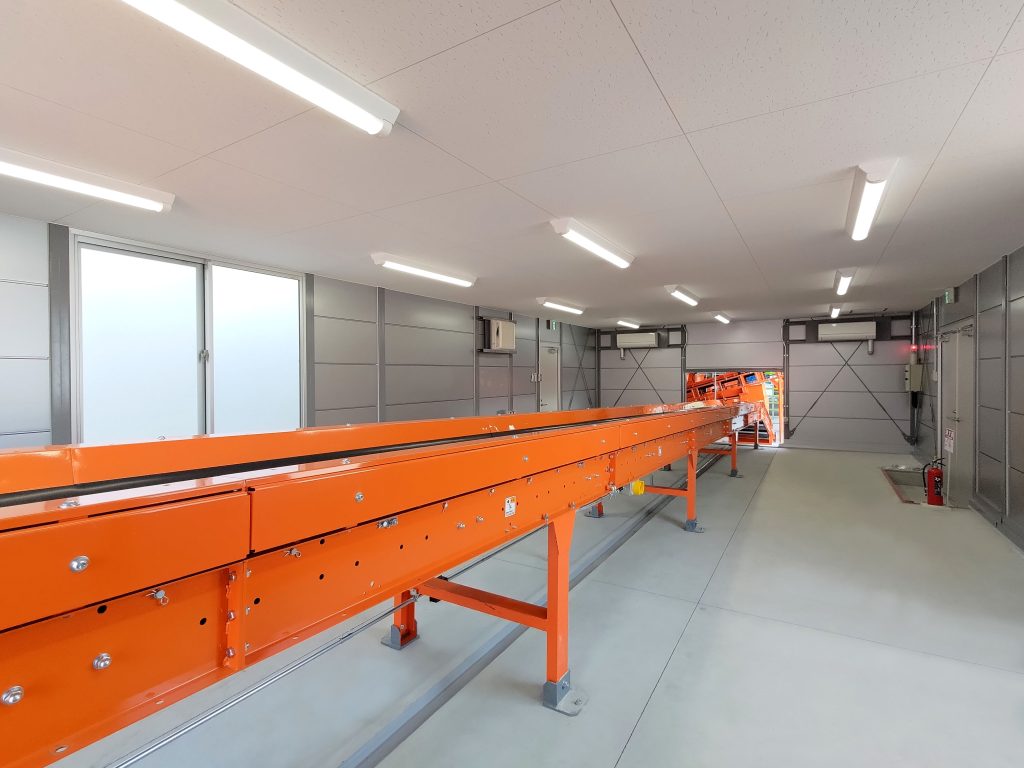 4棟が連なったリサイクル工場内の作業所。当社独自のシルバー色サンドイッチパネルを採用し、柱も同色系にて塗装。また、外装に使われている建具、屋根、樋に関しましてもグレー系を採用しているため、立ち並ぶ景色はリサイクル工場としての一体感があります。このようなベルトコンベアーを貫通させるための開口仕様なども、当社にて設計・プレハブ製作・組み立て・施工までを行えるため、お客様のニーズに合わせ柔軟に対応させていただきました。