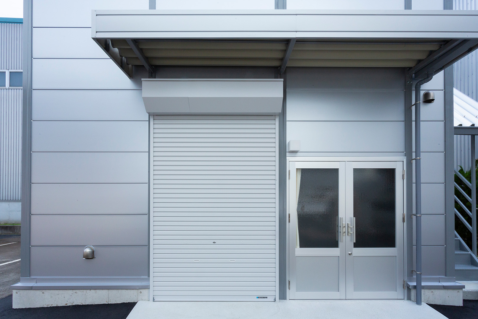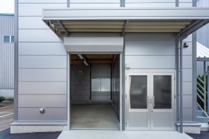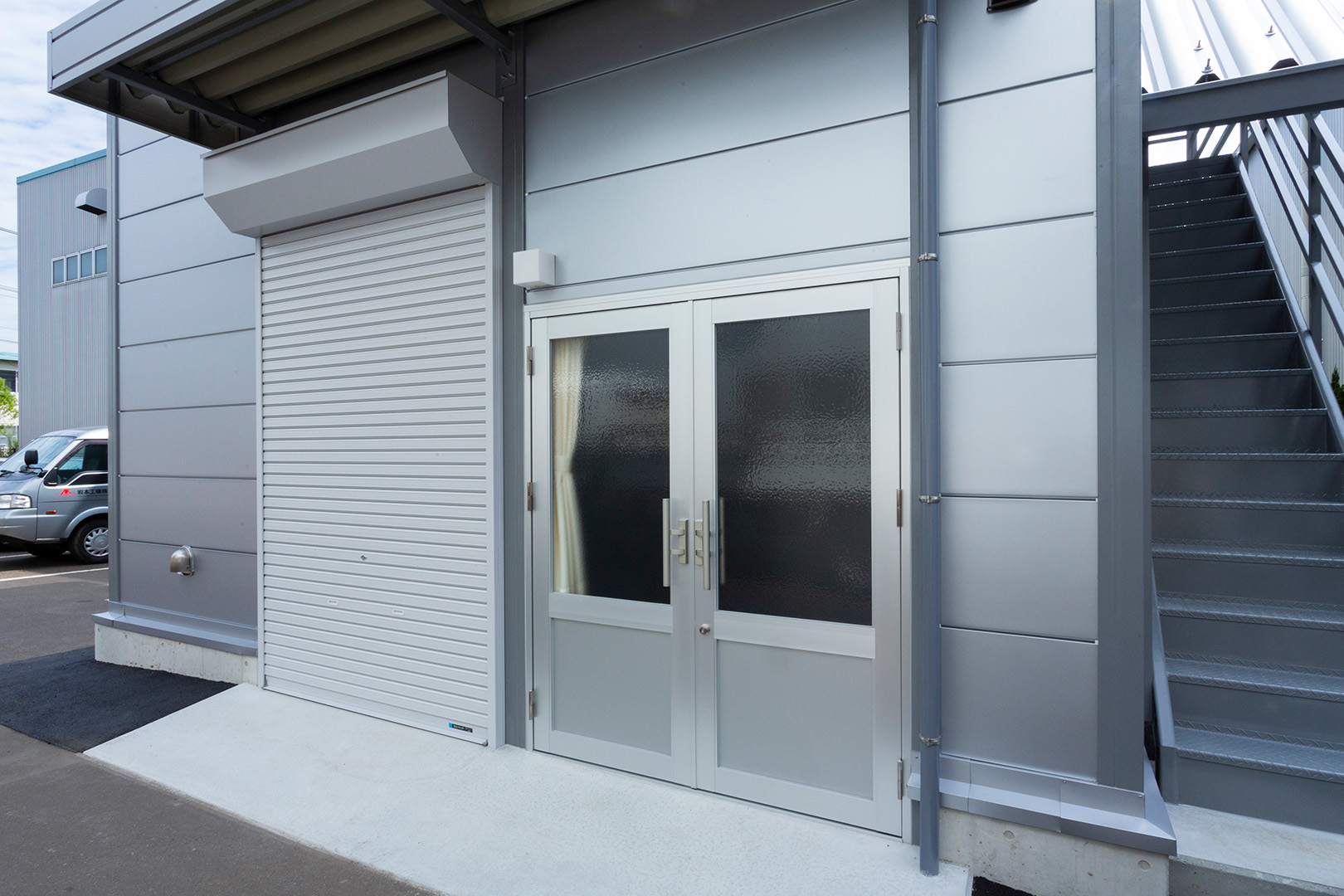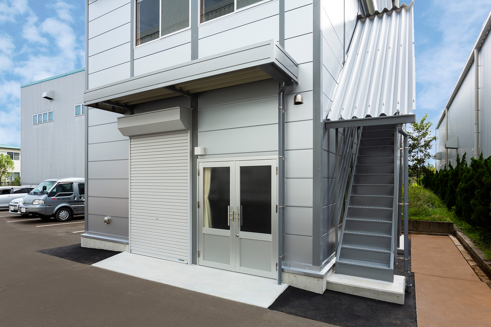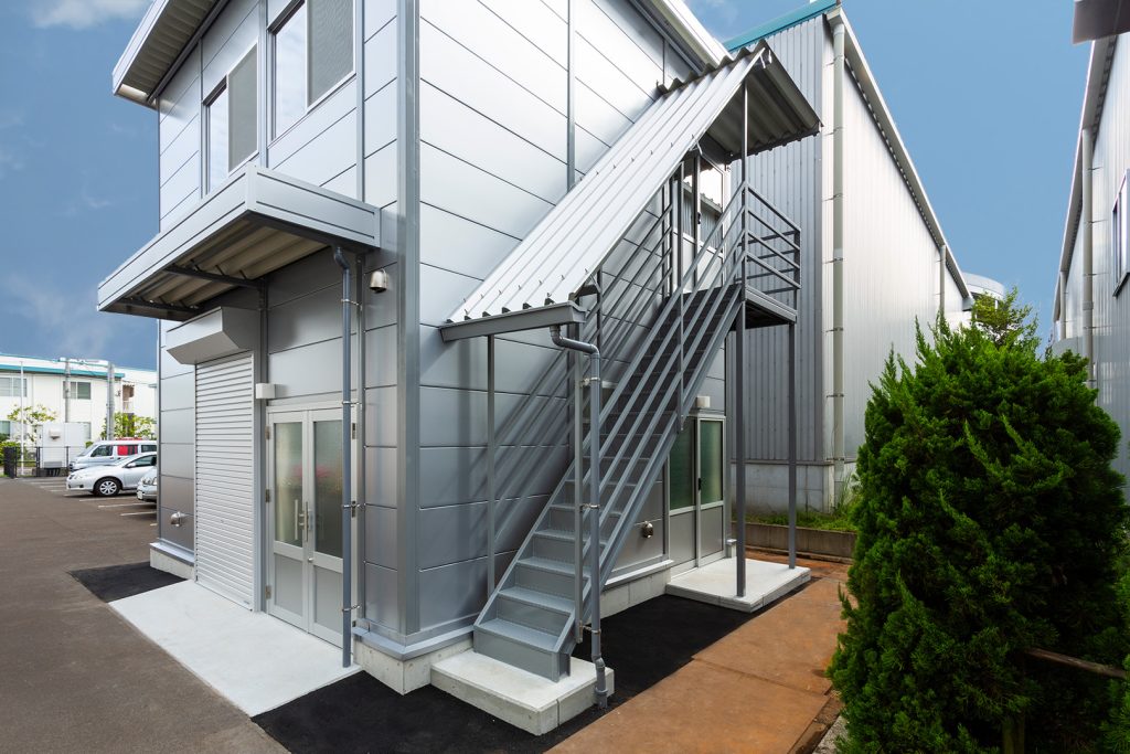OLライトシリーズ 「OLライトシリーズ」 オリエントハウスプレハブシリーズの短工期&低コストの汎用モデル。外装・内装を兼ねることが出来る高断熱の壁パネルを使用しています。シリーズ詳細はこちら>more にて設計施工した、倉庫・休憩室になります。既存の駐車場スペースを減らさないように、とのご希望があり、玄関側の建物幅の寸法を別注とし、外部階段が収まるように設計しています。1階倉庫と更衣室を区切る間仕切り壁は、外壁にも使用されている断熱サンドイッチパネルを使用し、すっきりとした内観に仕上げました。2階は従業員用の休憩室で、天井・壁共に石膏ボードを使用して仕上げており、断熱にも配慮。休憩時の快適性にも配慮しています。