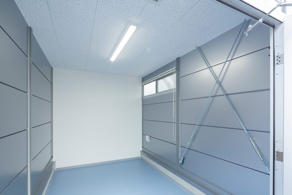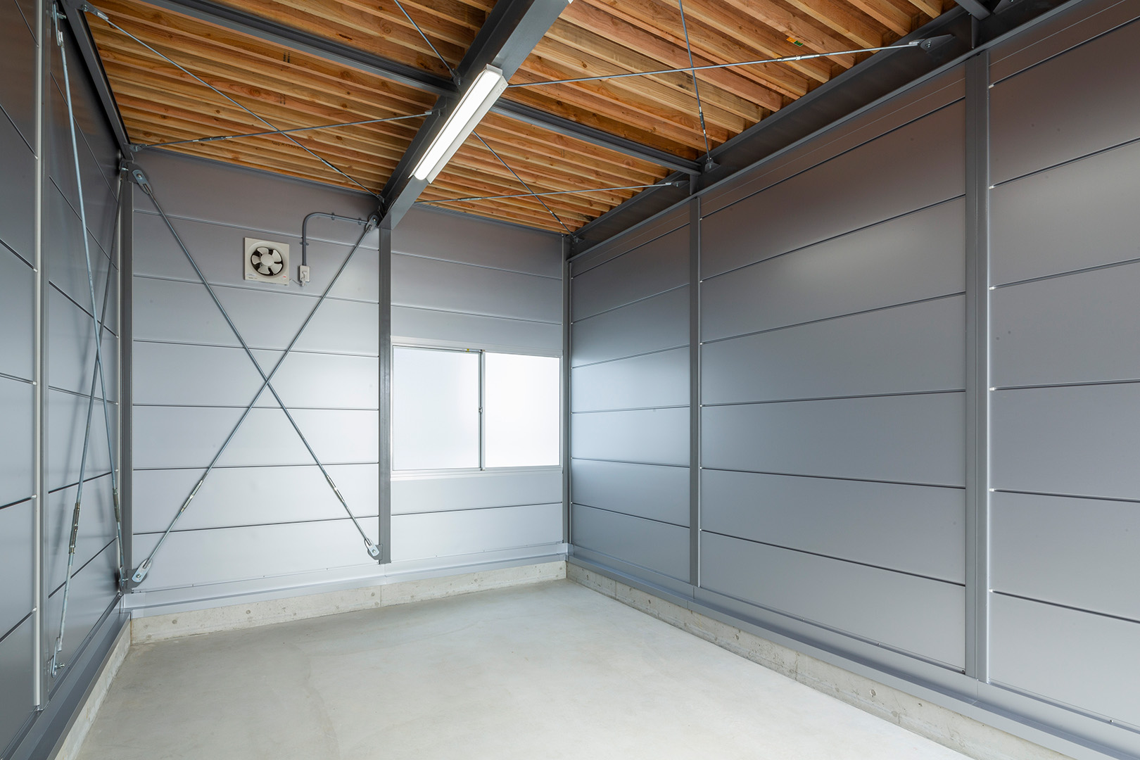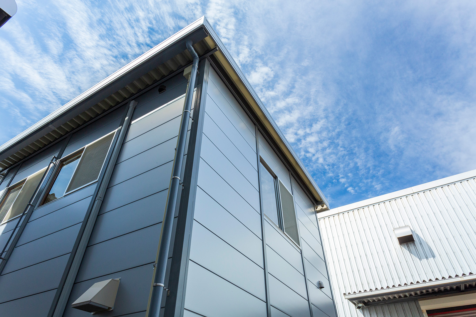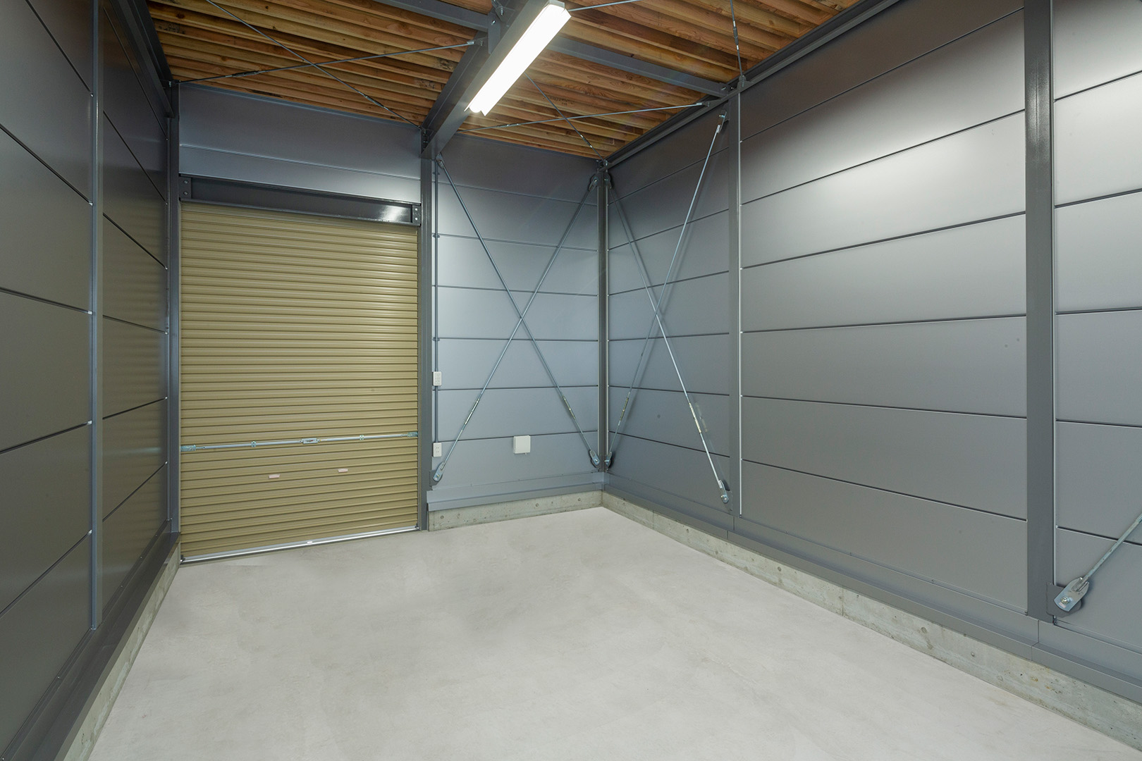 OLライトシリーズ 「OLライトシリーズ」 オリエントハウスプレハブシリーズの短工期&低コストの汎用モデル。外装・内装を兼ねることが出来る高断熱の壁パネルを使用しています。シリーズ詳細はこちら>more にて設計施工した、倉庫・休憩室になります。既存の駐車場スペースを減らさないように、とのご希望があり、玄関側の建物幅の寸法を別注とし、外部階段が収まるように設計しています。1階倉庫と更衣室を区切る間仕切り壁は、外壁にも使用されている断熱サンドイッチパネルを使用し、すっきりとした内観に仕上げました。2階は従業員用の休憩室で、天井・壁共に石膏ボードを使用して仕上げており、断熱にも配慮。休憩時の快適性にも配慮しています。