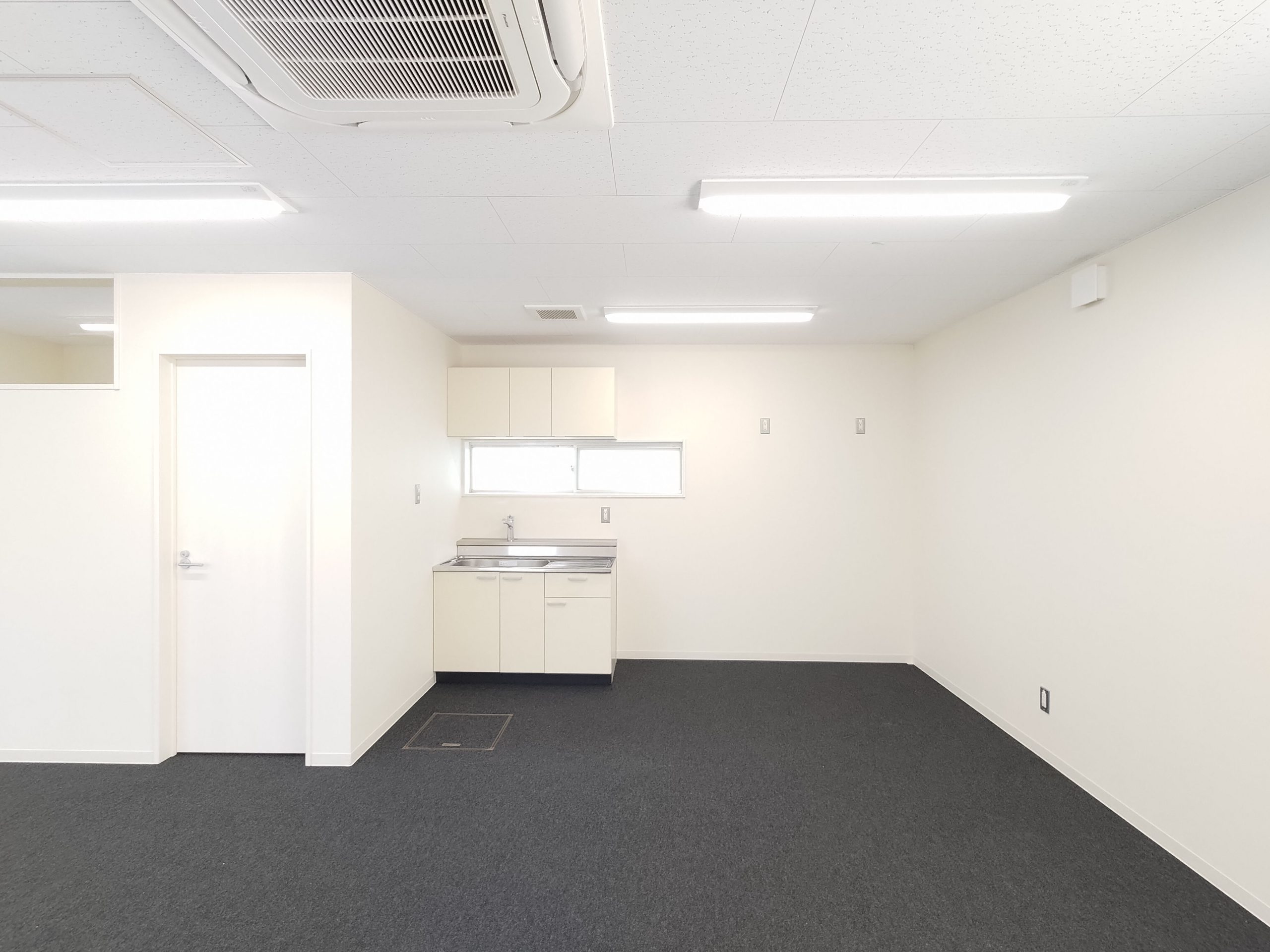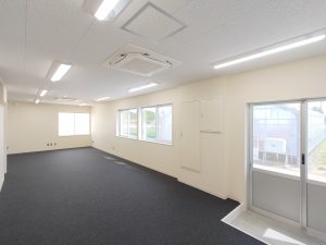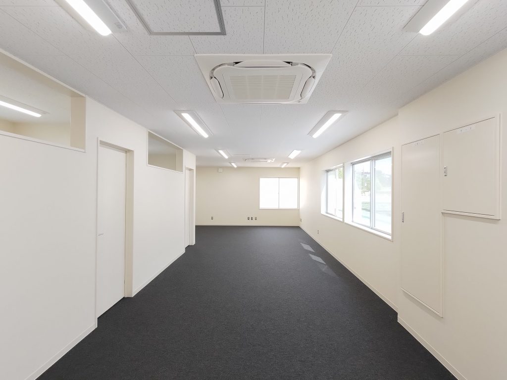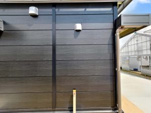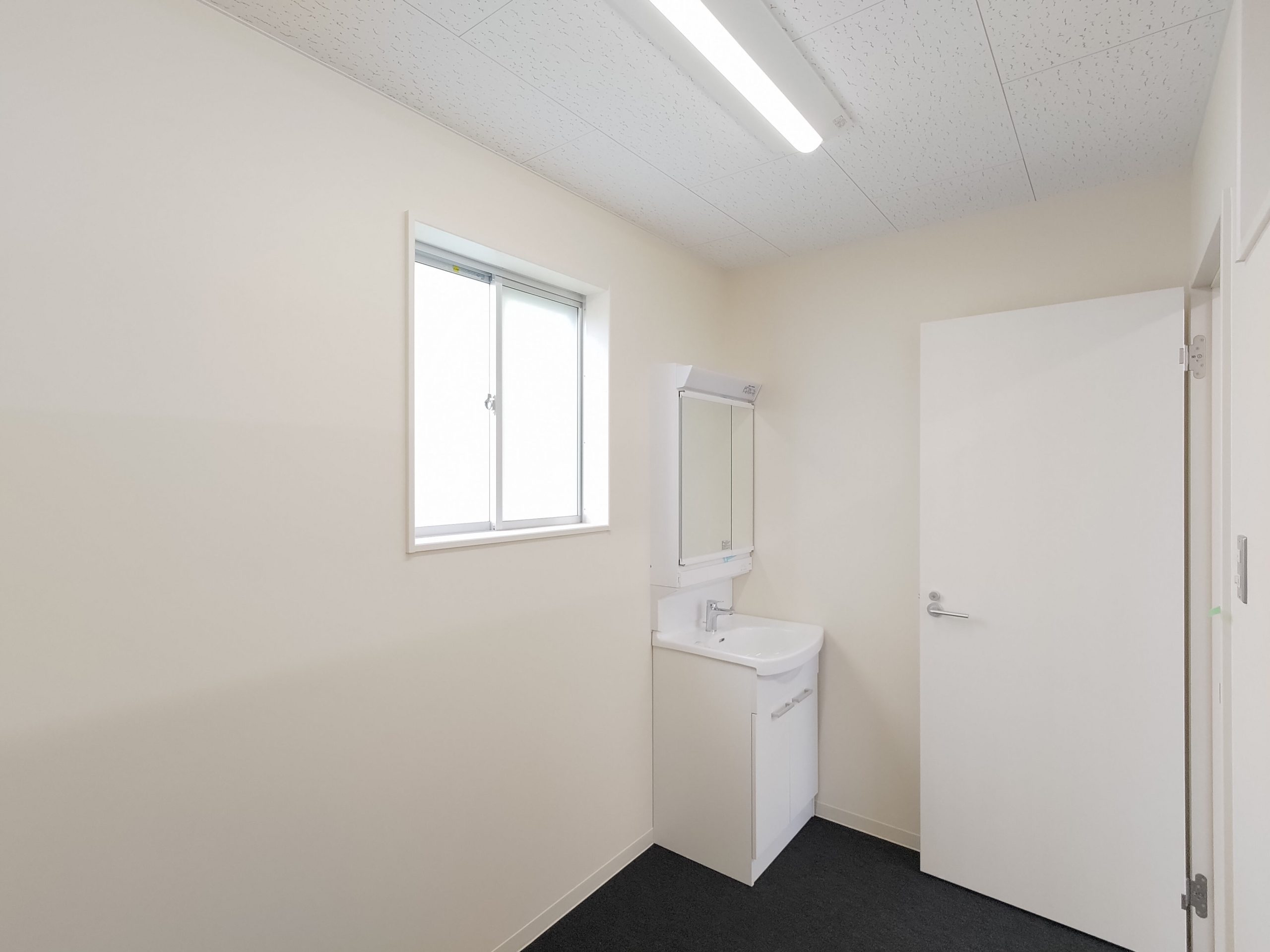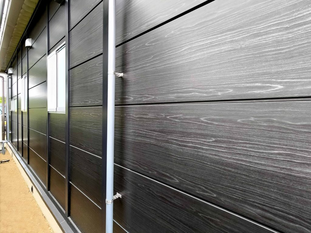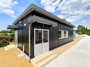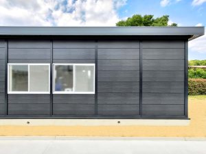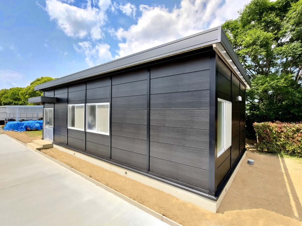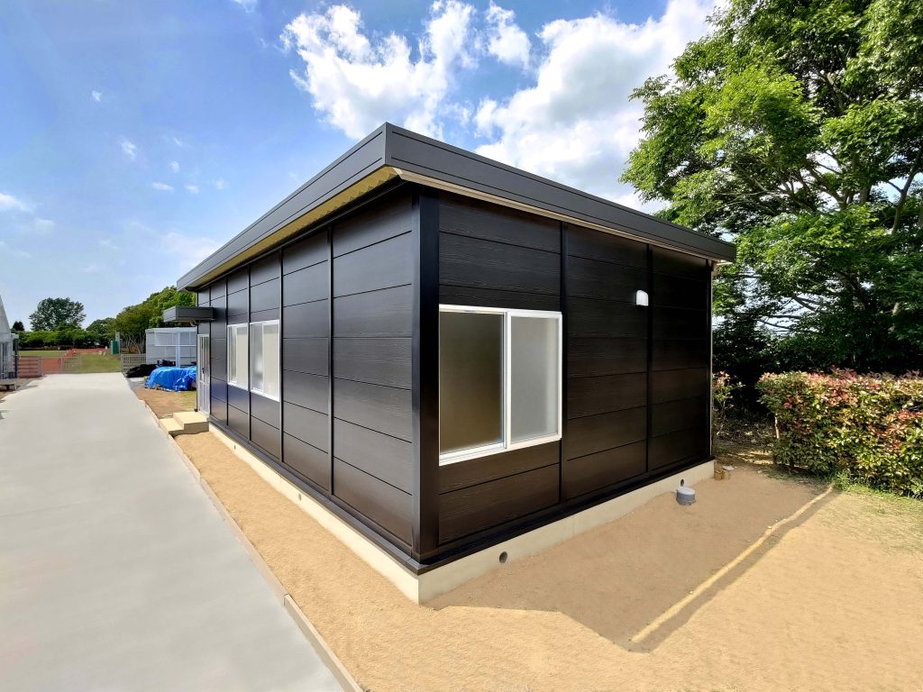 公園内の敷地に建てられた、幅10.8m奥行き5.4mの事務所兼休憩所です。公園内ということもあり、周囲の環境との調和を考慮し、外壁にはブラックの木目調ライトパネルを採用。柱もマットブラックの柱カバーを組み合わせ、シックでスタイリッシュな外観になっています。更衣室には空調がついていませんが、事務所スペースとの間仕切り上部が開放されているので、換気と空調管理がしやすくなっています。また公園内の園芸作業中で、靴に泥がついたままでも直接入れるよう、出入り口を分けてトイレを設置しています。