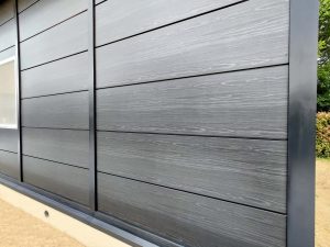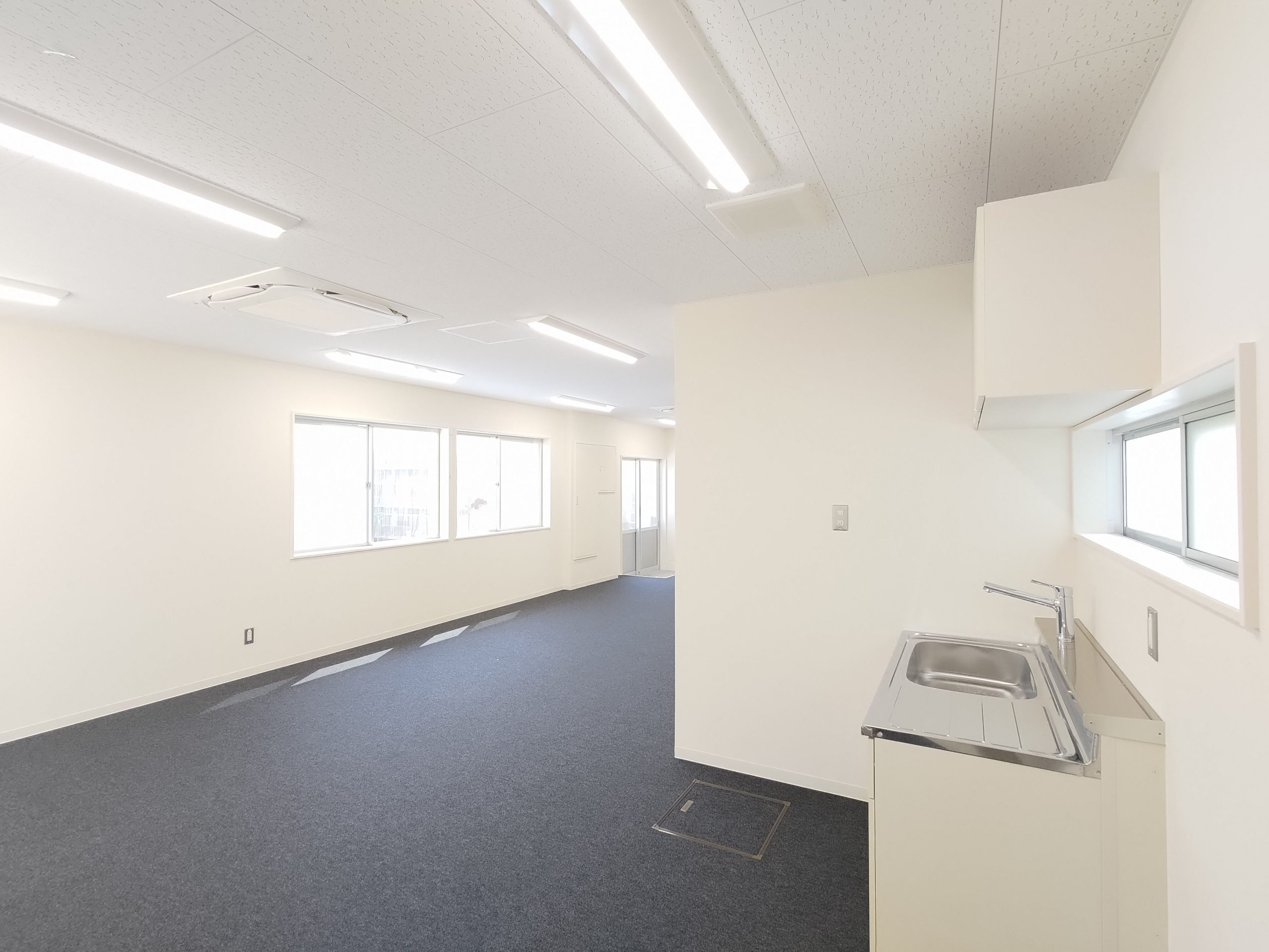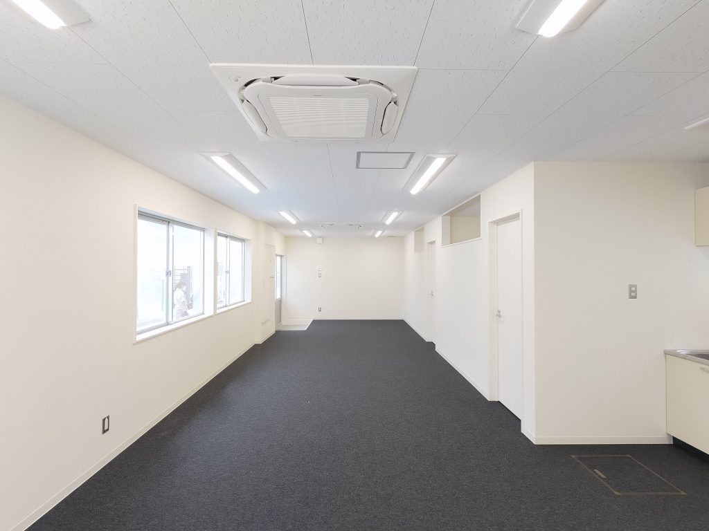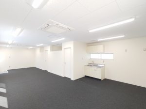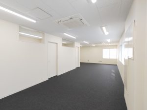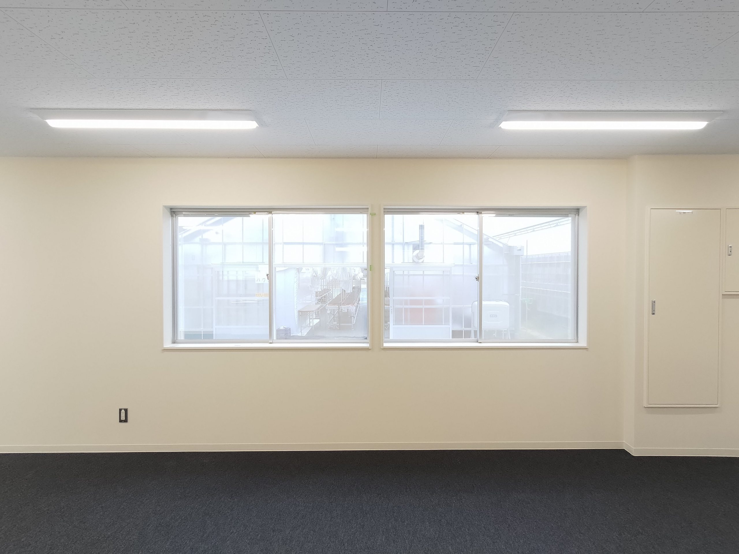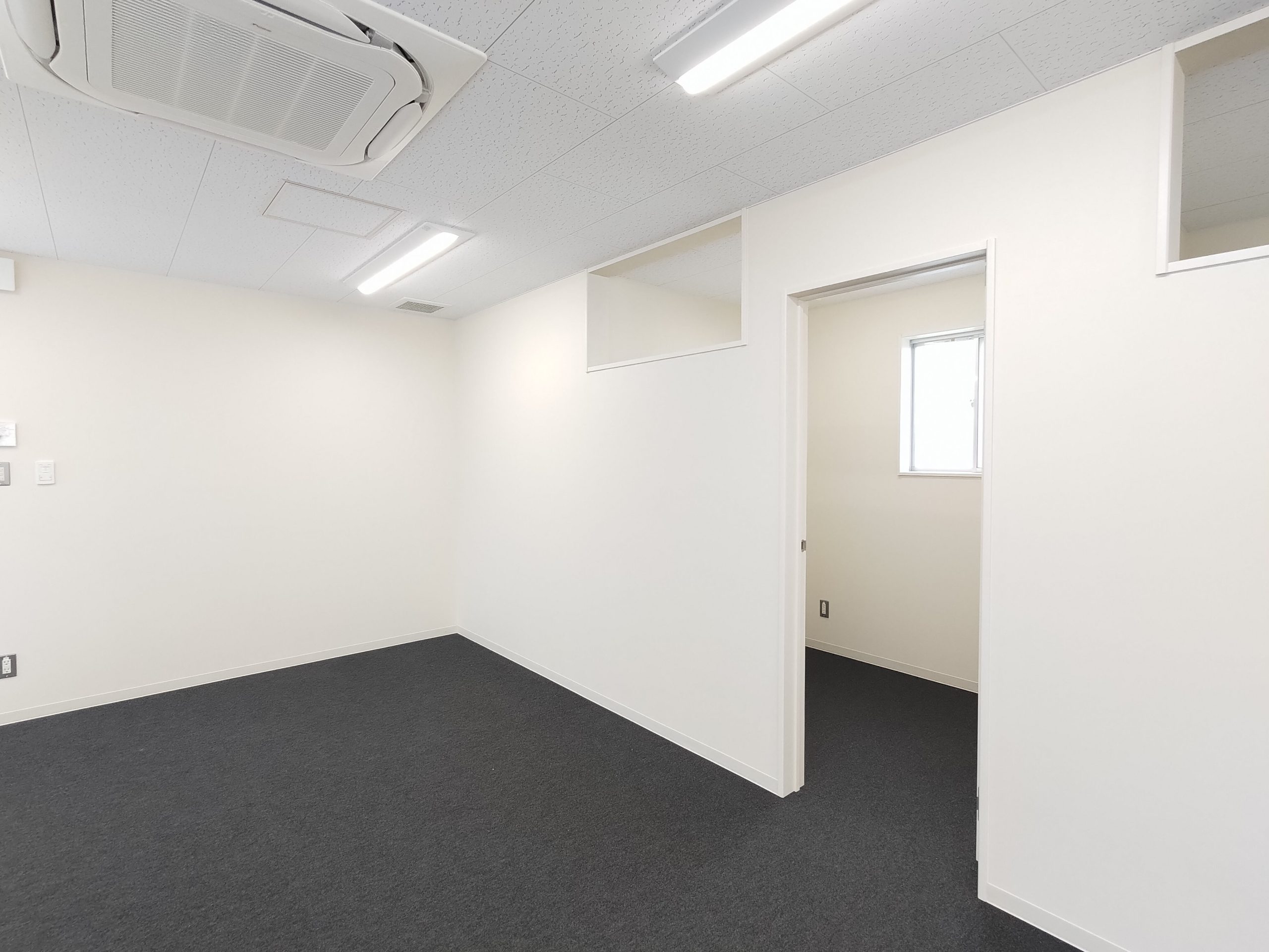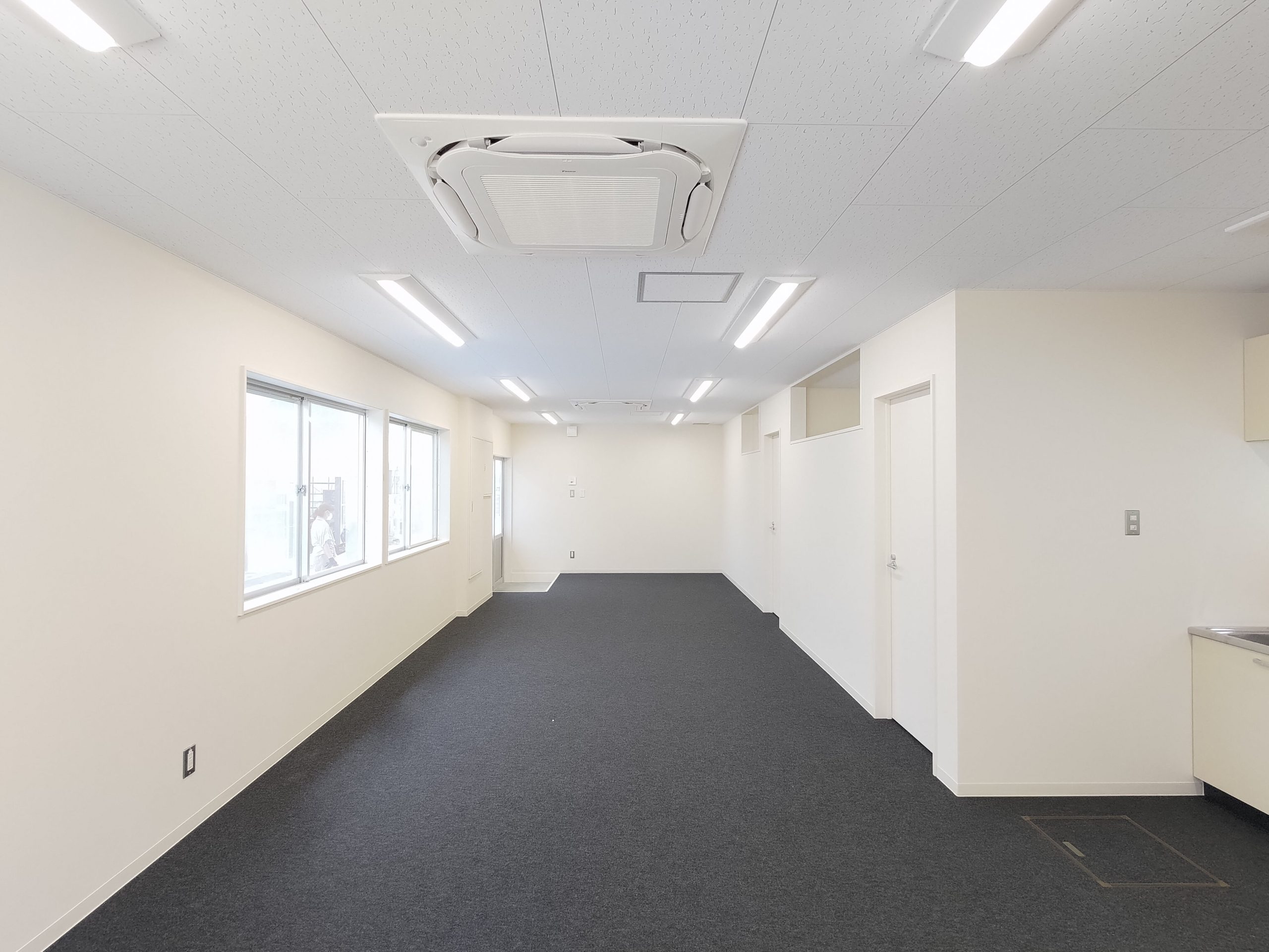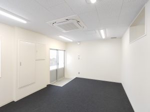 公園内の敷地に建てられた、幅10.8m奥行き5.4mの事務所兼休憩所です。公園内ということもあり、周囲の環境との調和を考慮し、外壁にはブラックの木目調ライトパネルを採用。柱もマットブラックの柱カバーを組み合わせ、シックでスタイリッシュな外観になっています。更衣室には空調がついていませんが、事務所スペースとの間仕切り上部が開放されているので、換気と空調管理がしやすくなっています。また公園内の園芸作業中で、靴に泥がついたままでも直接入れるよう、出入り口を分けてトイレを設置しています。