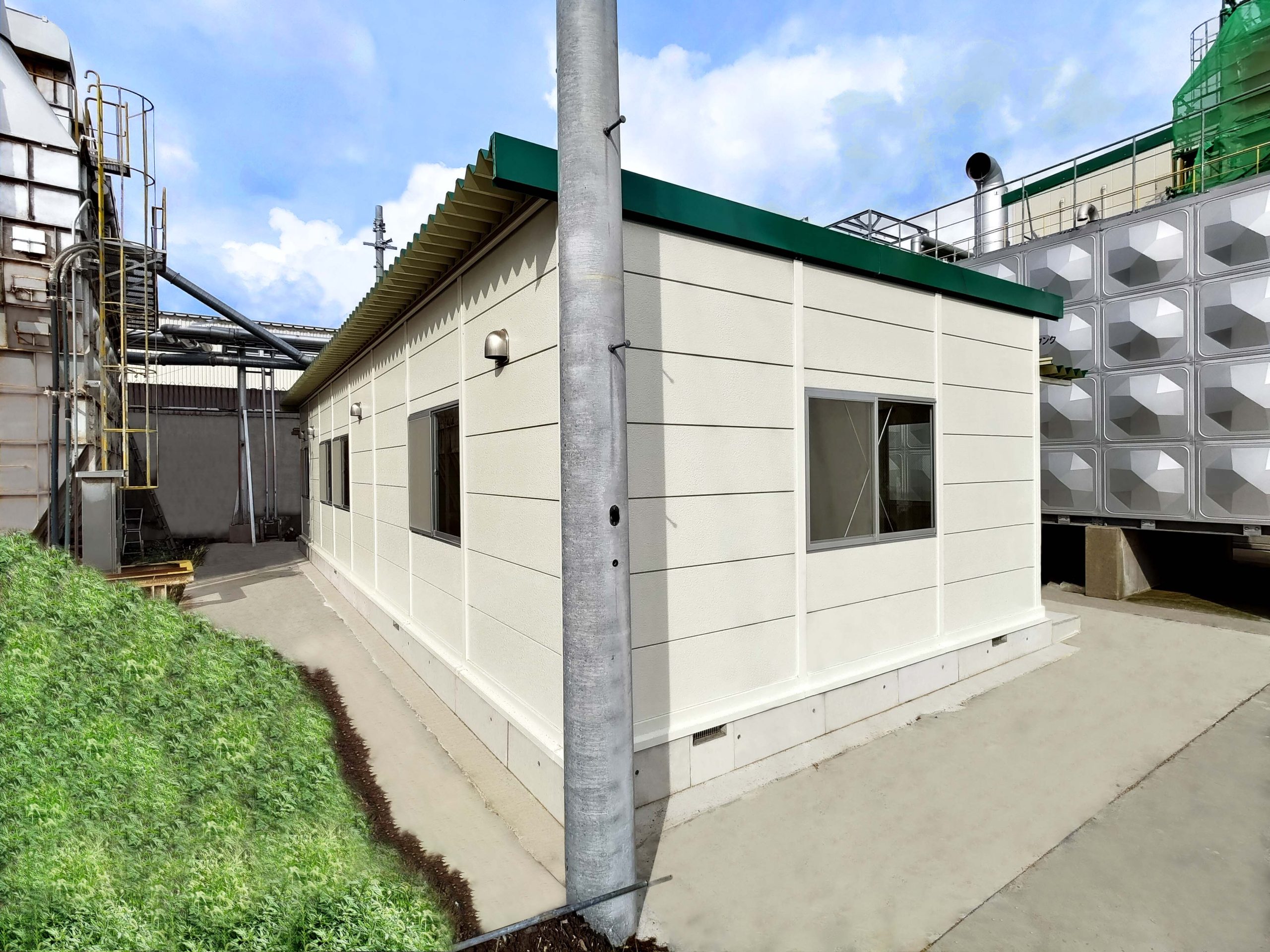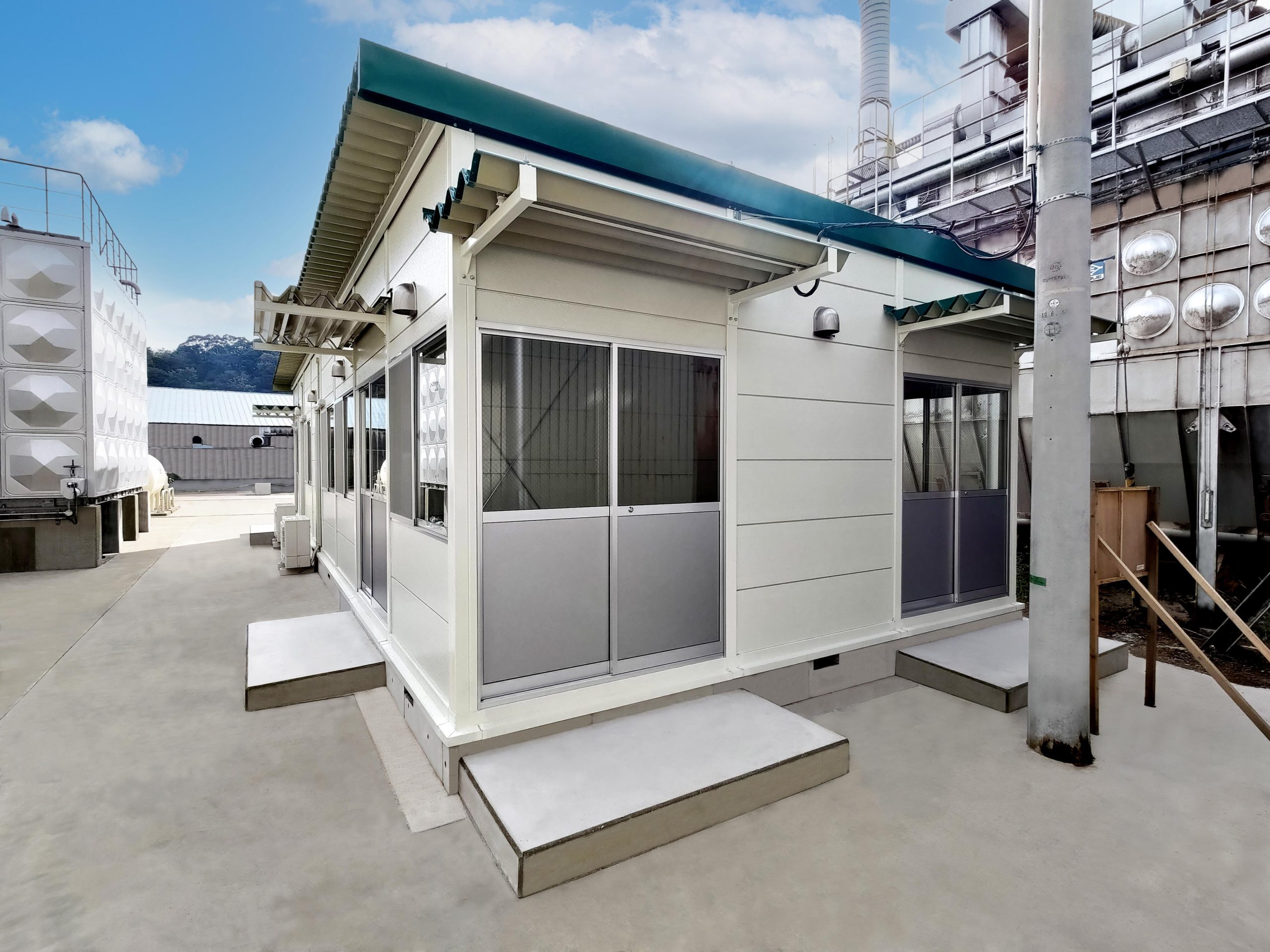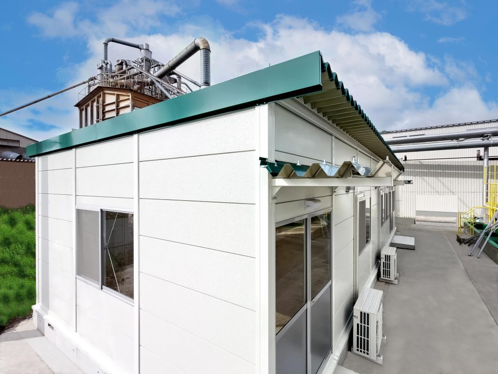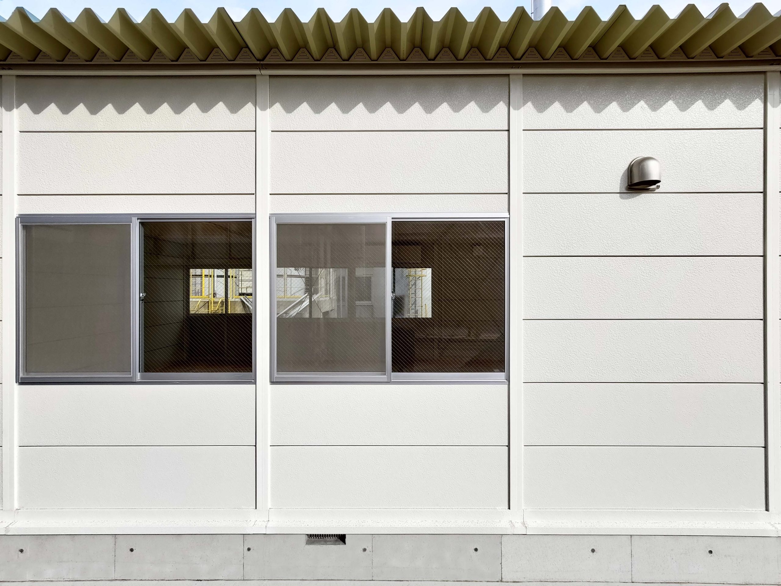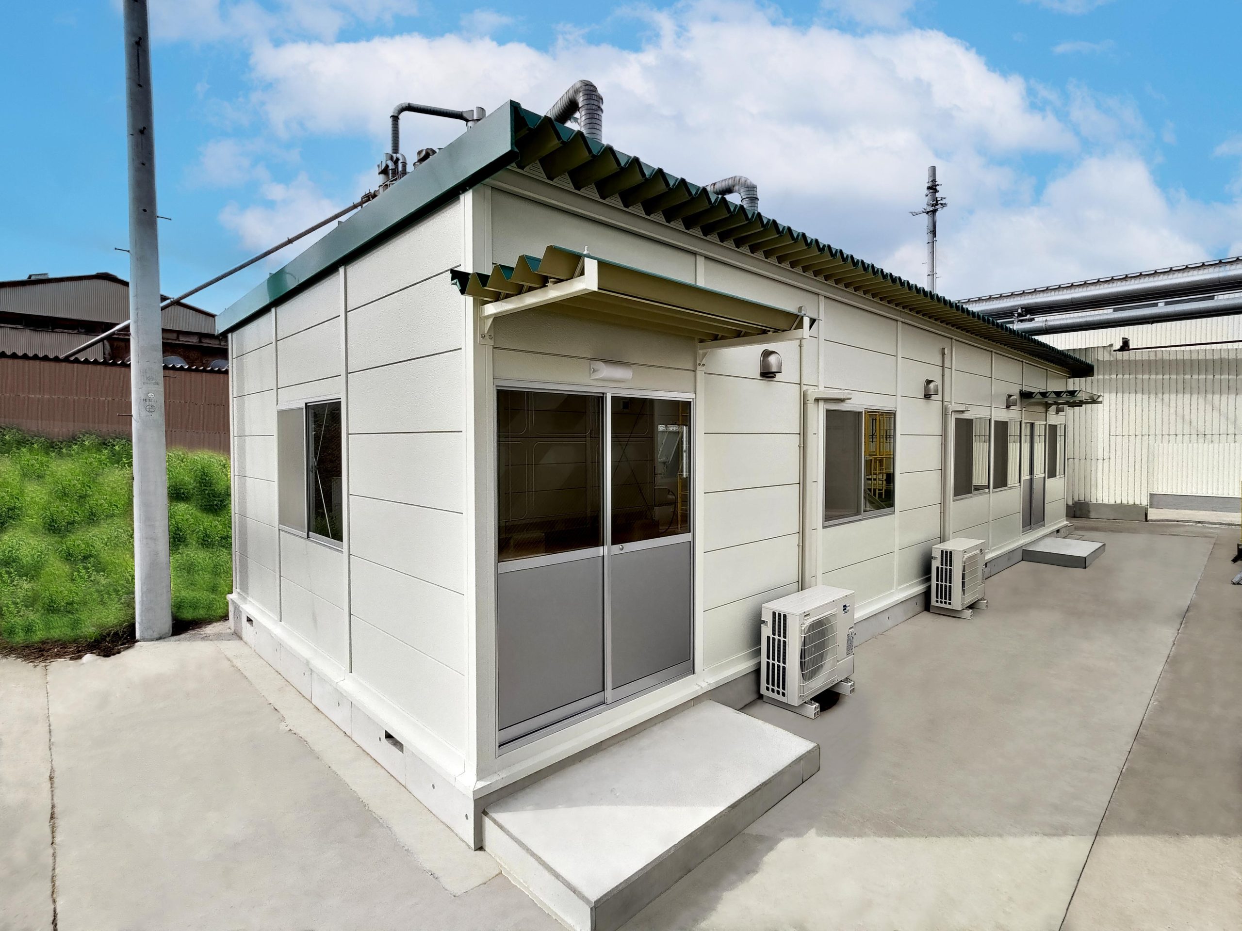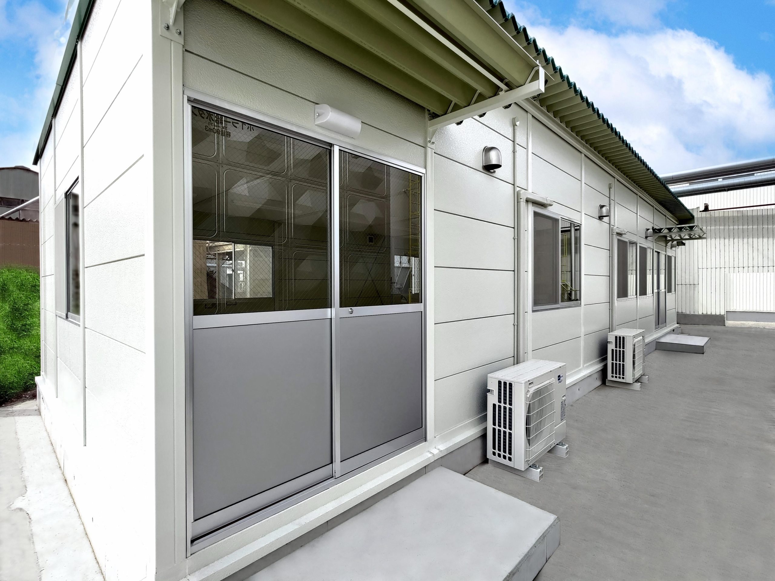 OLライトシリーズ 「OLライトシリーズ」 オリエントハウスプレハブシリーズの短工期&低コストの汎用モデル。外装・内装を兼ねることが出来る高断熱の壁パネルを使用しています。シリーズ詳細はこちら>more の喫煙室併設の事務所になります。お客様よりコスト重視と喫煙室のご希望がありましたので、 OLライトシリーズ 「OLライトシリーズ」 オリエントハウスプレハブシリーズの短工期&低コストの汎用モデル。外装・内装を兼ねることが出来る高断熱の壁パネルを使用しています。シリーズ詳細はこちら>more を提案致しました。80㎡程の延床面積のうち、10㎡ほどを喫煙室に振り分けています。各部の仕様は当社のスタンダードなものになり、天井はカラーベニヤを使用したはめ込むタイプの天井パネル。喫煙室との間仕切りには、外壁としても使用されている断熱サンドイッチパネルを使用することで、コストを抑えています。屋根や庇にはグリーンを採用し、お客様の敷地内の既存建物との調和を考慮。換気や利便性を考え、合計4箇所ある出入り口にはすべて幅2.0m奥行き0.8mの庇を設置。雨の日に配慮しています。