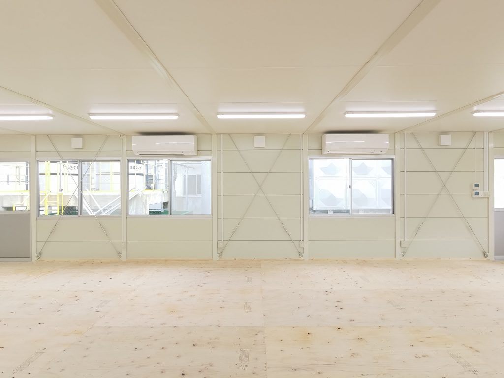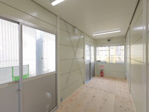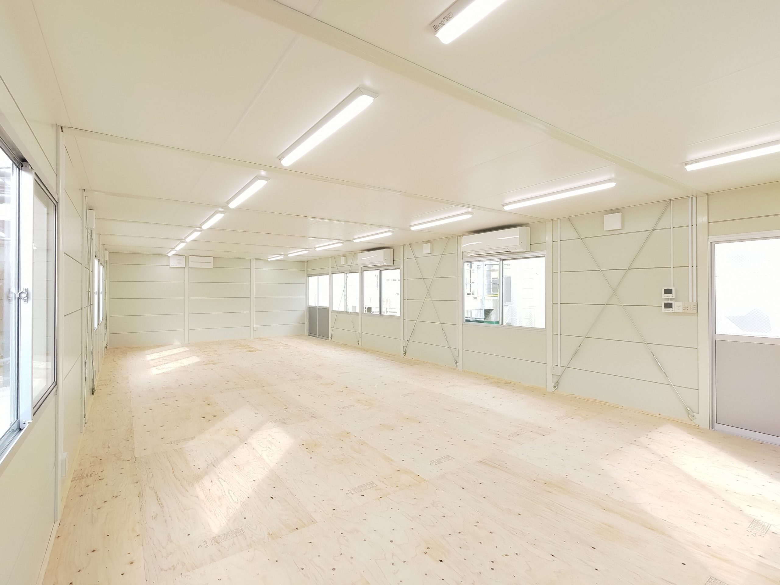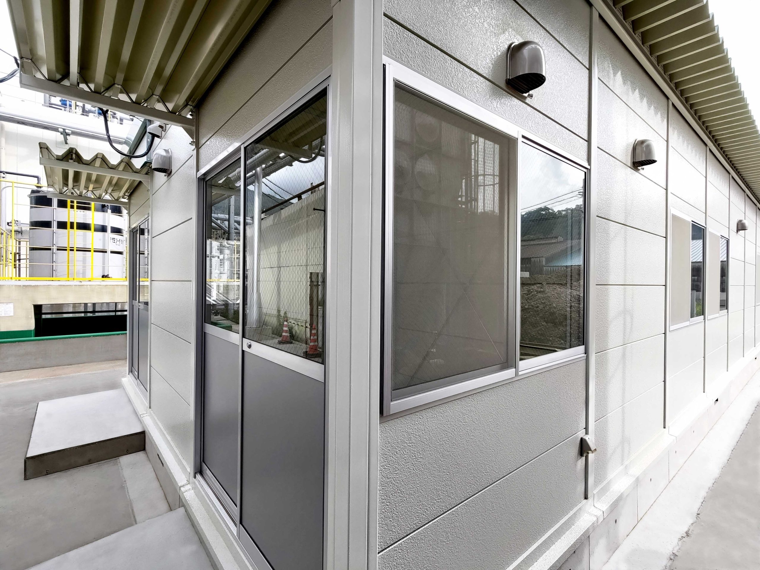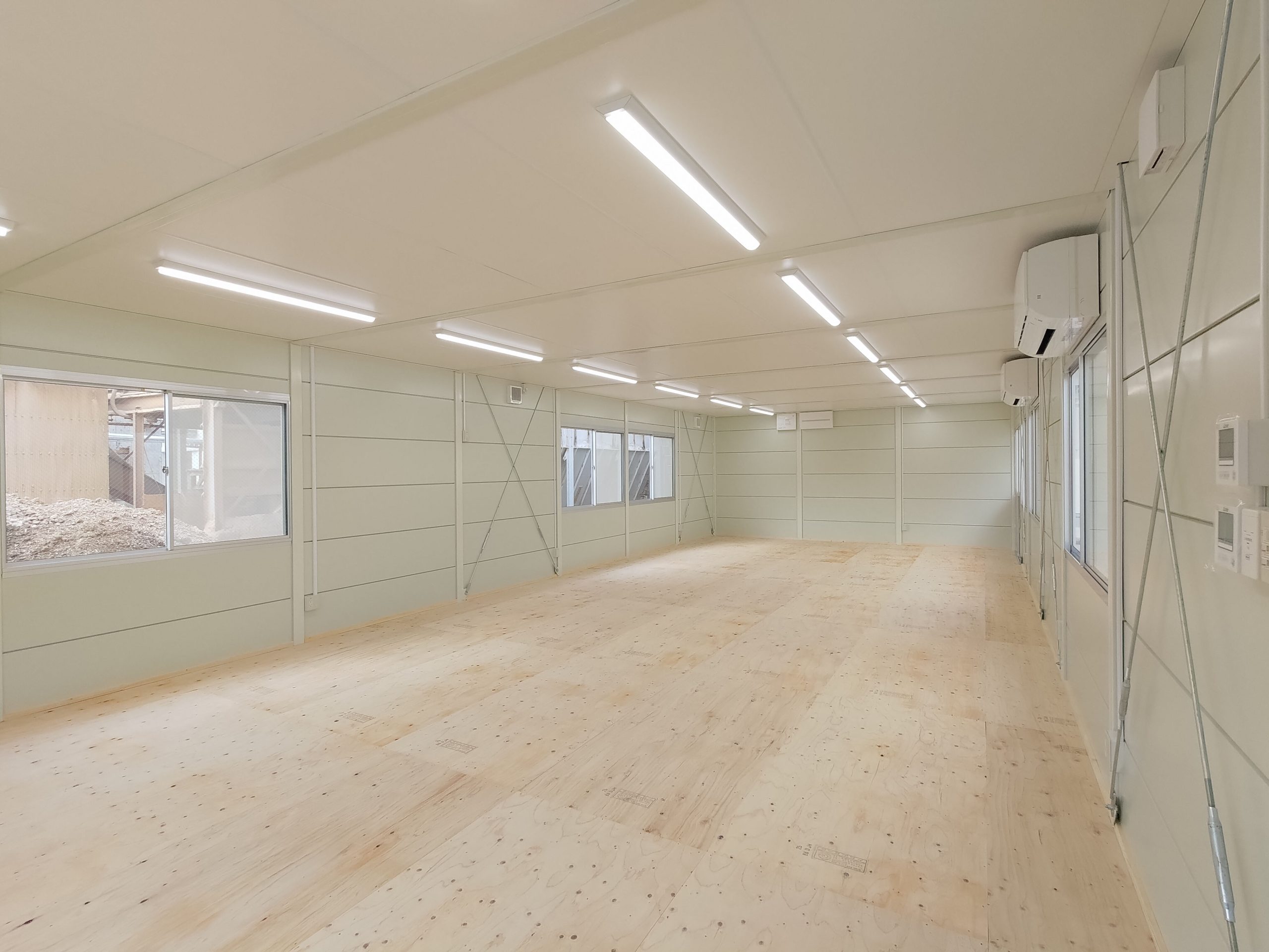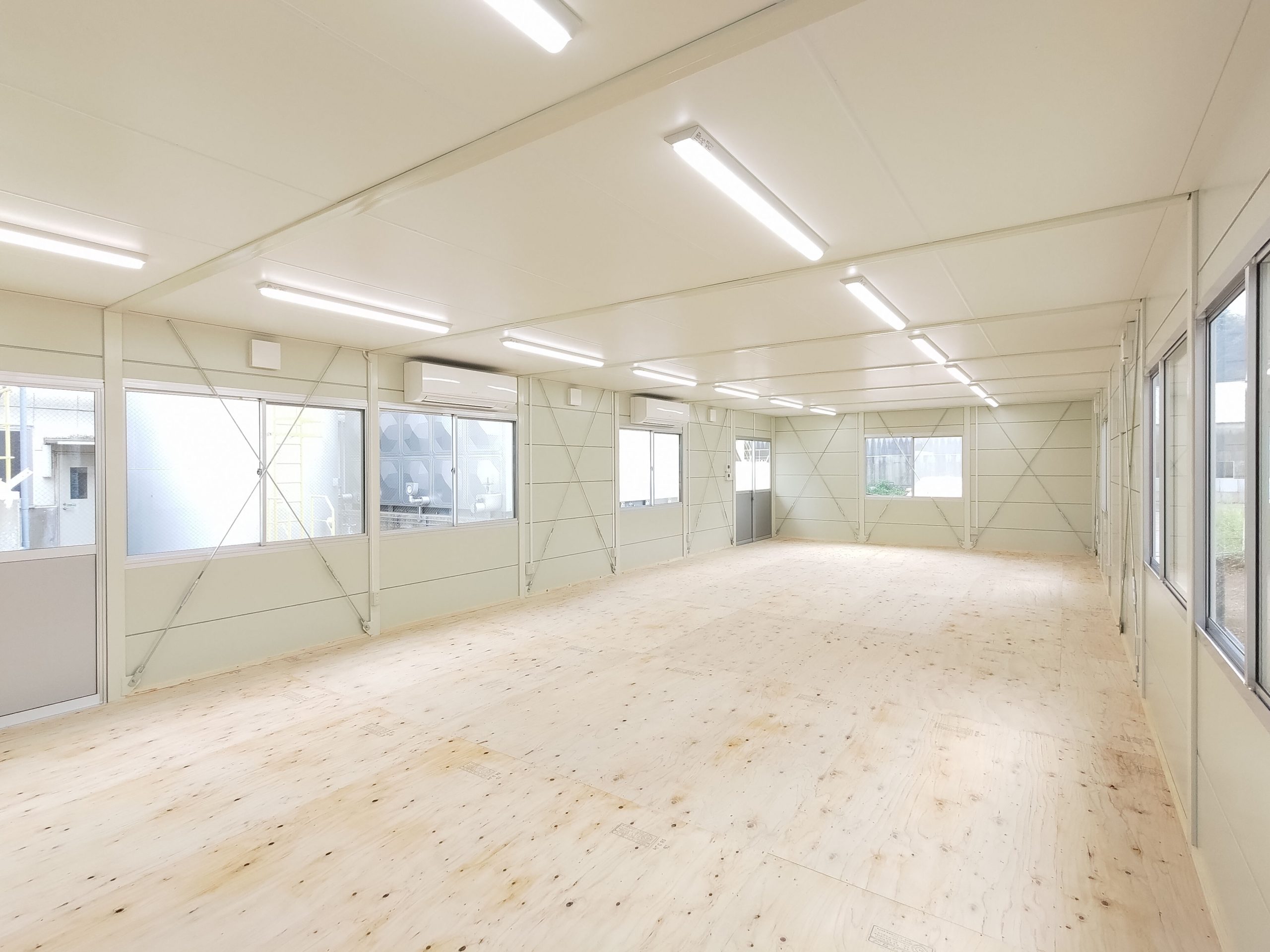 OLライトシリーズ 「OLライトシリーズ」 オリエントハウスプレハブシリーズの短工期&低コストの汎用モデル。外装・内装を兼ねることが出来る高断熱の壁パネルを使用しています。シリーズ詳細はこちら>more の喫煙室併設の事務所になります。お客様よりコスト重視と喫煙室のご希望がありましたので、 OLライトシリーズ 「OLライトシリーズ」 オリエントハウスプレハブシリーズの短工期&低コストの汎用モデル。外装・内装を兼ねることが出来る高断熱の壁パネルを使用しています。シリーズ詳細はこちら>more を提案致しました。80㎡程の延床面積のうち、10㎡ほどを喫煙室に振り分けています。各部の仕様は当社のスタンダードなものになり、天井はカラーベニヤを使用したはめ込むタイプの天井パネル。喫煙室との間仕切りには、外壁としても使用されている断熱サンドイッチパネルを使用することで、コストを抑えています。屋根や庇にはグリーンを採用し、お客様の敷地内の既存建物との調和を考慮。換気や利便性を考え、合計4箇所ある出入り口にはすべて幅2.0m奥行き0.8mの庇を設置。雨の日に配慮しています。