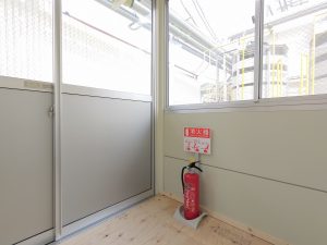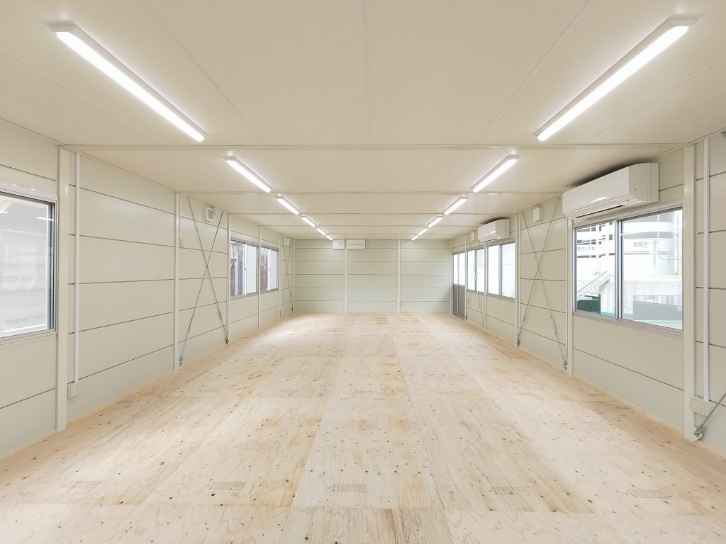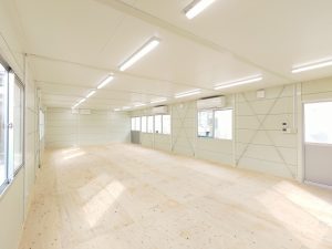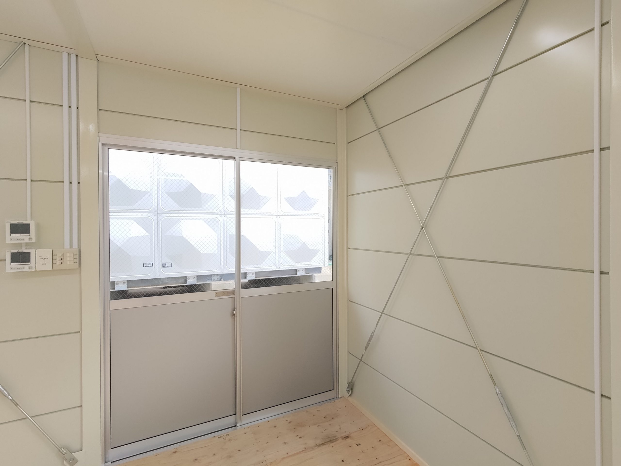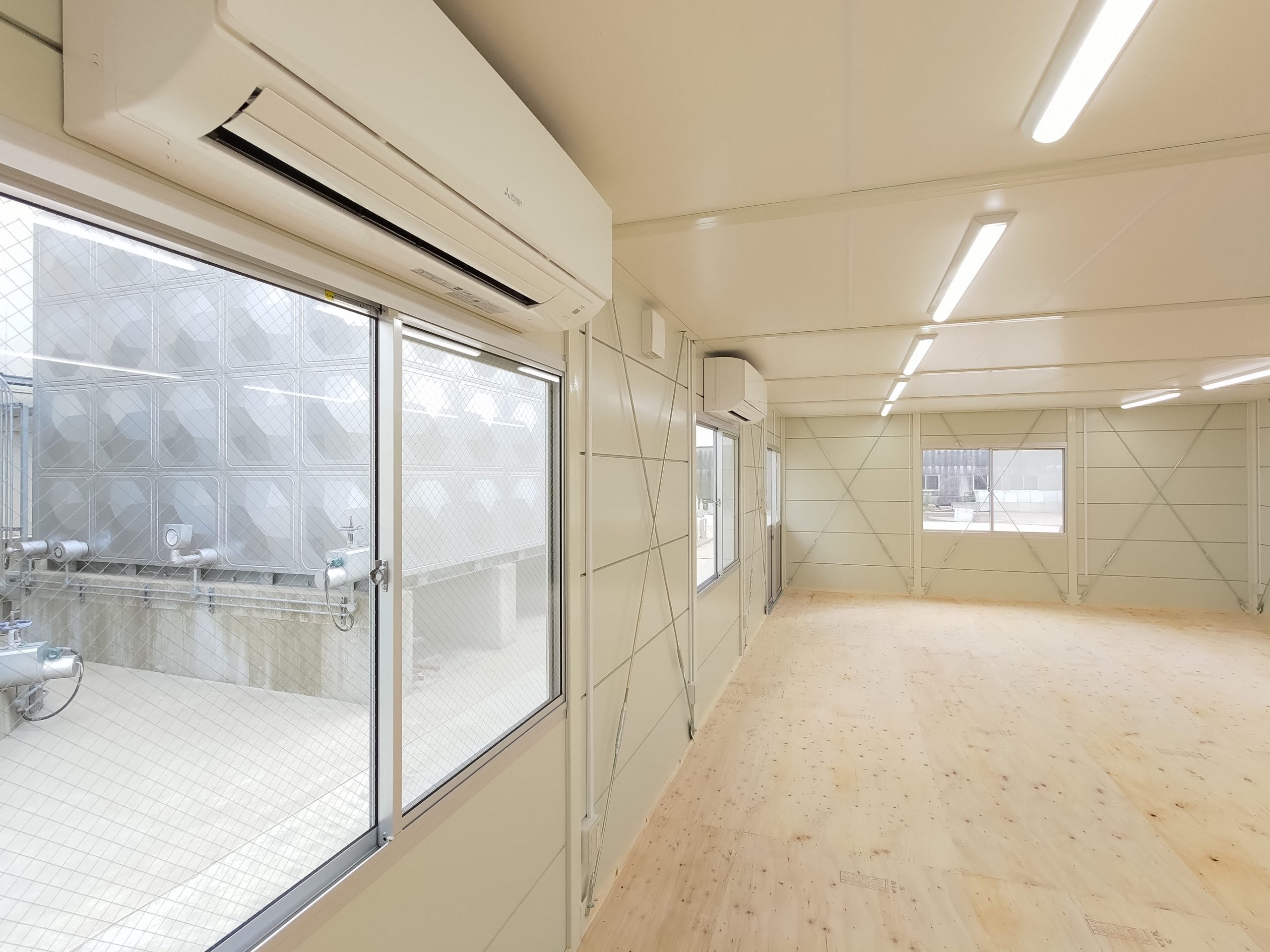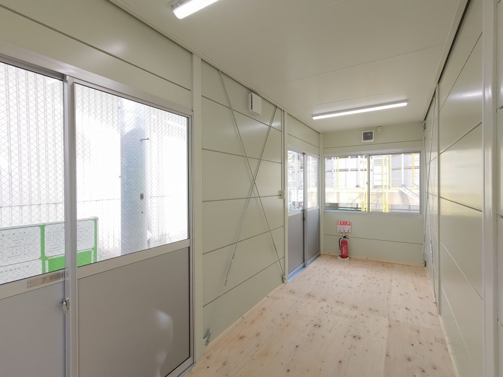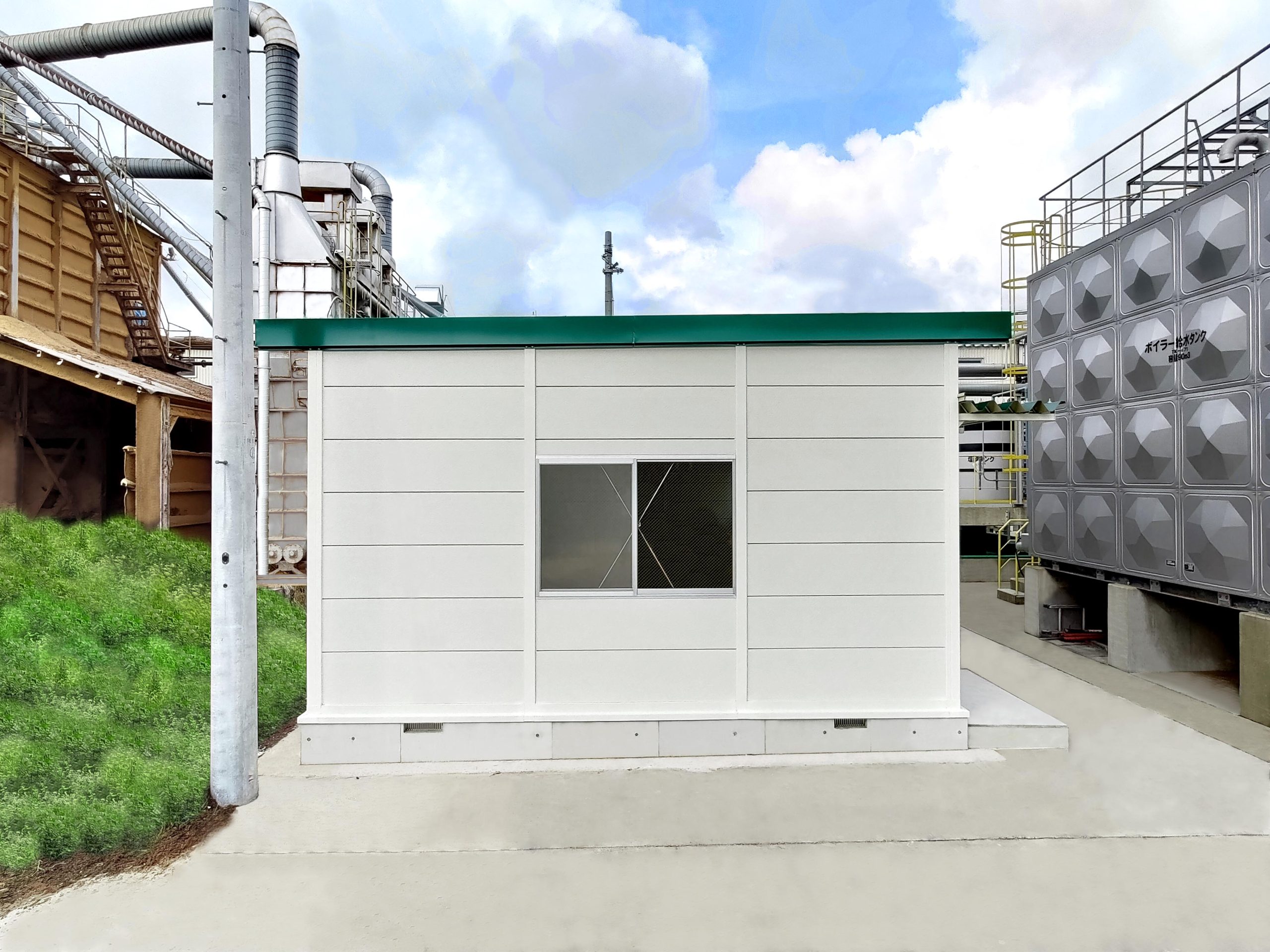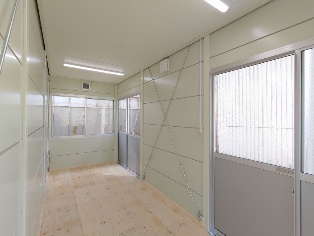 OLライトシリーズ 「OLライトシリーズ」 オリエントハウスプレハブシリーズの短工期&低コストの汎用モデル。外装・内装を兼ねることが出来る高断熱の壁パネルを使用しています。シリーズ詳細はこちら>more の喫煙室併設の事務所になります。お客様よりコスト重視と喫煙室のご希望がありましたので、 OLライトシリーズ 「OLライトシリーズ」 オリエントハウスプレハブシリーズの短工期&低コストの汎用モデル。外装・内装を兼ねることが出来る高断熱の壁パネルを使用しています。シリーズ詳細はこちら>more を提案致しました。80㎡程の延床面積のうち、10㎡ほどを喫煙室に振り分けています。各部の仕様は当社のスタンダードなものになり、天井はカラーベニヤを使用したはめ込むタイプの天井パネル。喫煙室との間仕切りには、外壁としても使用されている断熱サンドイッチパネルを使用することで、コストを抑えています。屋根や庇にはグリーンを採用し、お客様の敷地内の既存建物との調和を考慮。換気や利便性を考え、合計4箇所ある出入り口にはすべて幅2.0m奥行き0.8mの庇を設置。雨の日に配慮しています。
