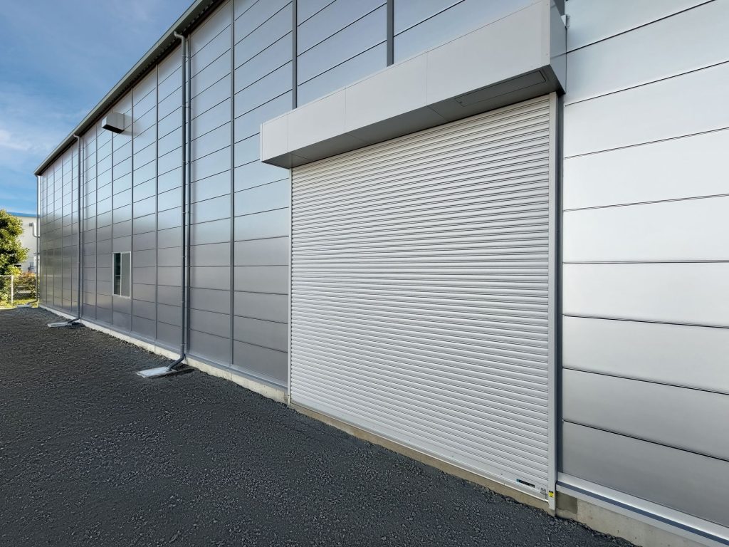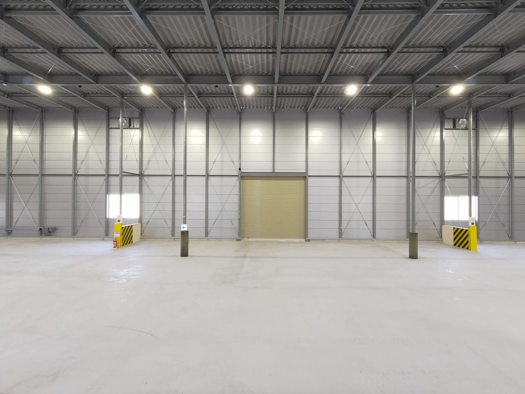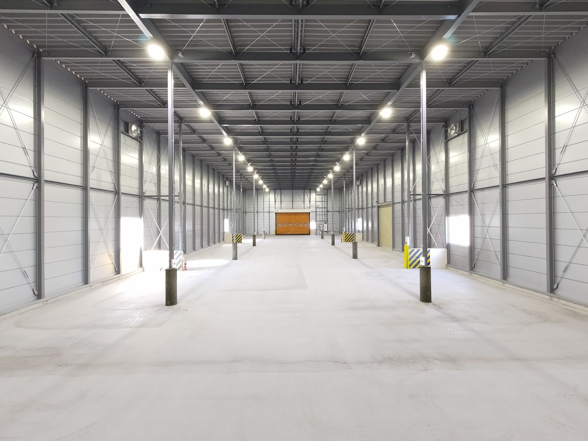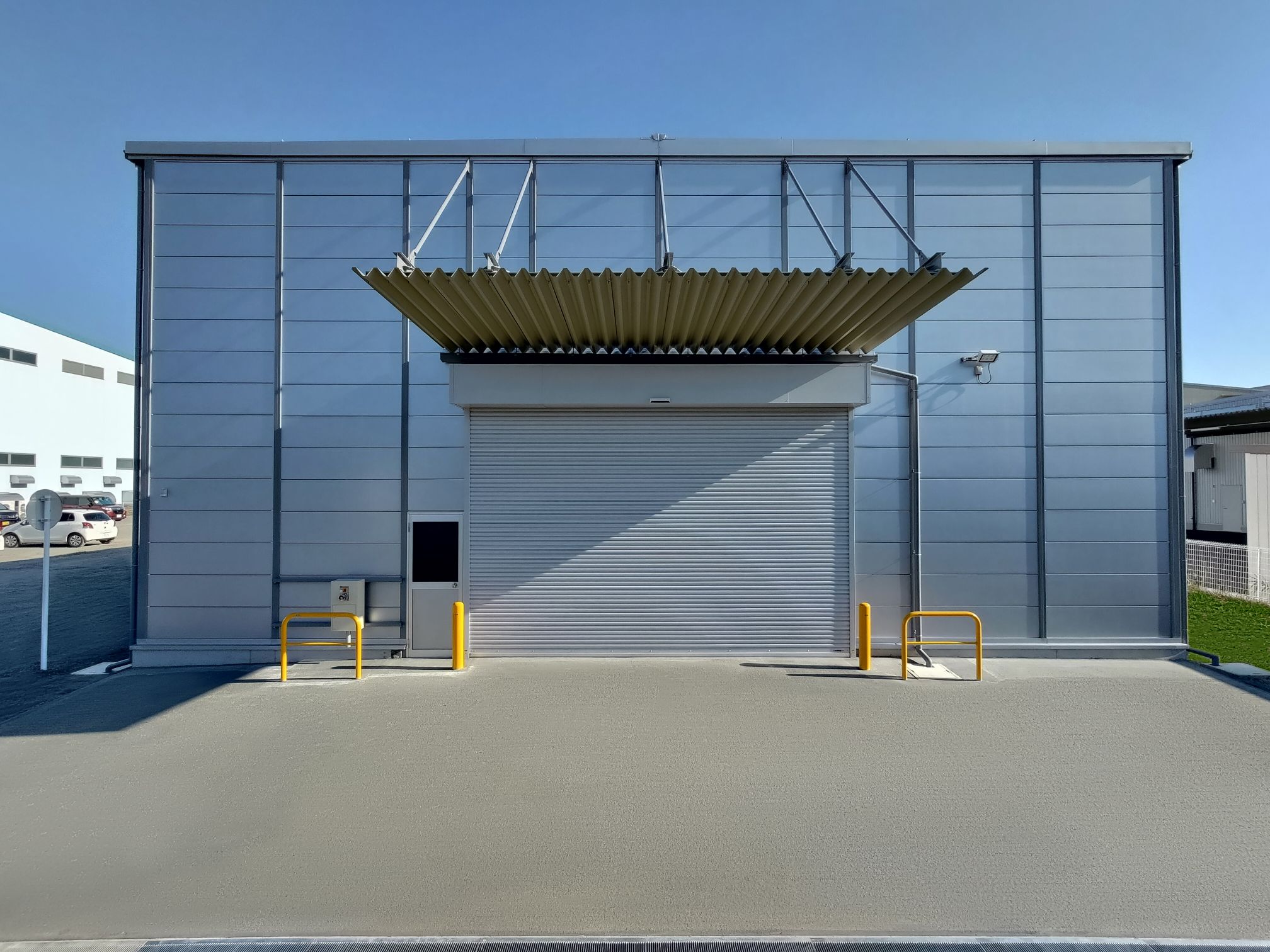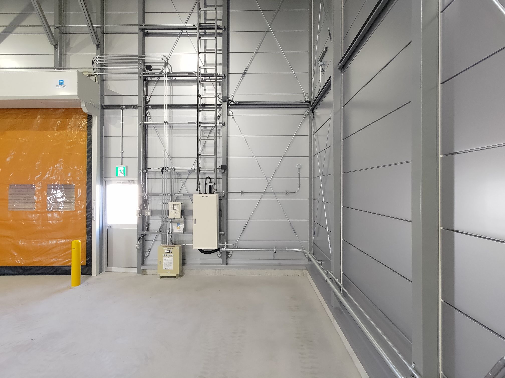 OLライトシリーズにて設計・施工した印刷工場です。印刷物などの荷物をパレットごと格納・保管するためのラックを積み重ねる事を考慮し、 梁下 「梁下」 梁(はり)の下端から床仕上げ面までの高さを示す寸法。意匠的な天井仕上げの高さ(天井高)とは異なり、構造体としての制限寸法を表す。 梁下:梁の下端まで 天井高:内装仕上げ後の天井面ま...more までの高さを6.7m確保。又、作業効率を確保するため、中柱2本の位置を調整し、フォークリフトでの搬入・搬出が容易に行えるように設計しました。メインの入口には高さ3.5m・幅5.3mの大型の電動シャッターを設置し、加えて内側にはシートシャッターを取り付けることにより、作業性を高めながらも塵や埃などの侵入を防ぎ、倉庫内の環境を清潔に保つ事が出来ます。更に繁忙期の搬出入にも対応する為、建物中央にもう一つ電動シャッター(幅3.5m・高さ3.5m)を設置しています。照明は高さがあっても十分な明るさを確保出来るLEDライトを採用。換気は大空間でも空気が問題なく循環するよう、大風量の有圧換気扇を4台(給気2個、排気2個)設置。メインの入口には柱を必要としない出幅3mの吊り庇を採用することで、トラック横付け時の妨げにならず、雨天時にも配慮しています。また大型のトラックの積み込みも考慮し、入口前のスペースは75㎡(幅15m・奥行き5m)と、大きく確保しています。外観はサンドイッチパネルのシルバーカラーにより、周囲の既存の建物とうまく溶け込みながら、工場らしいスタイリッシュな仕上がりになっています。