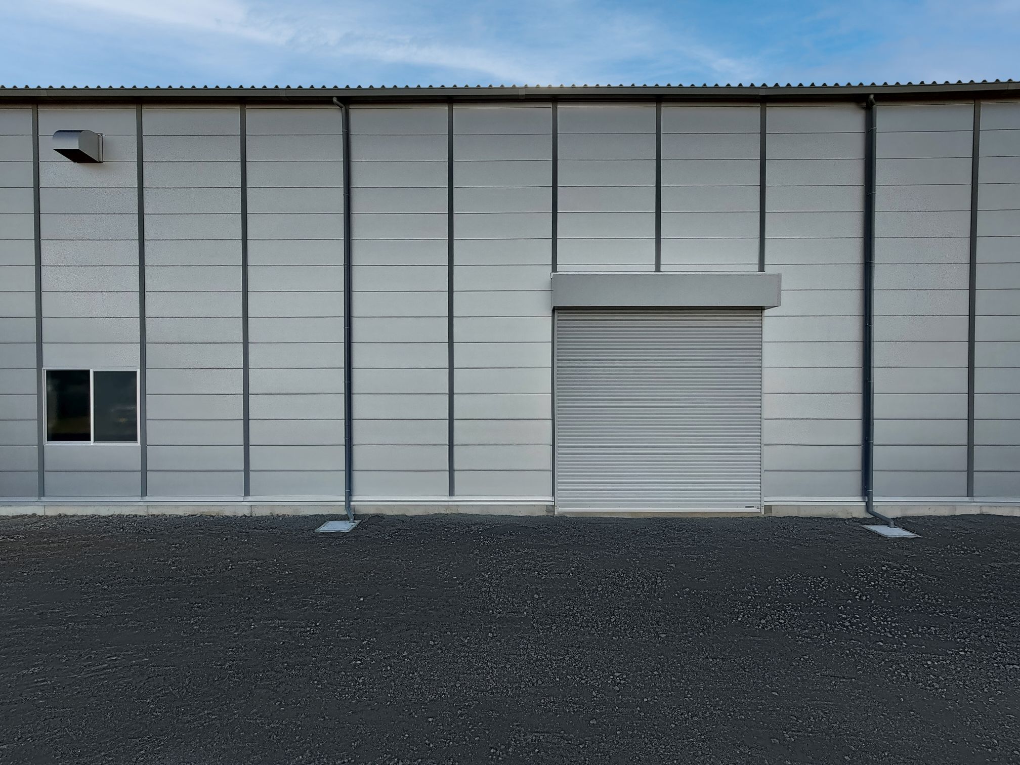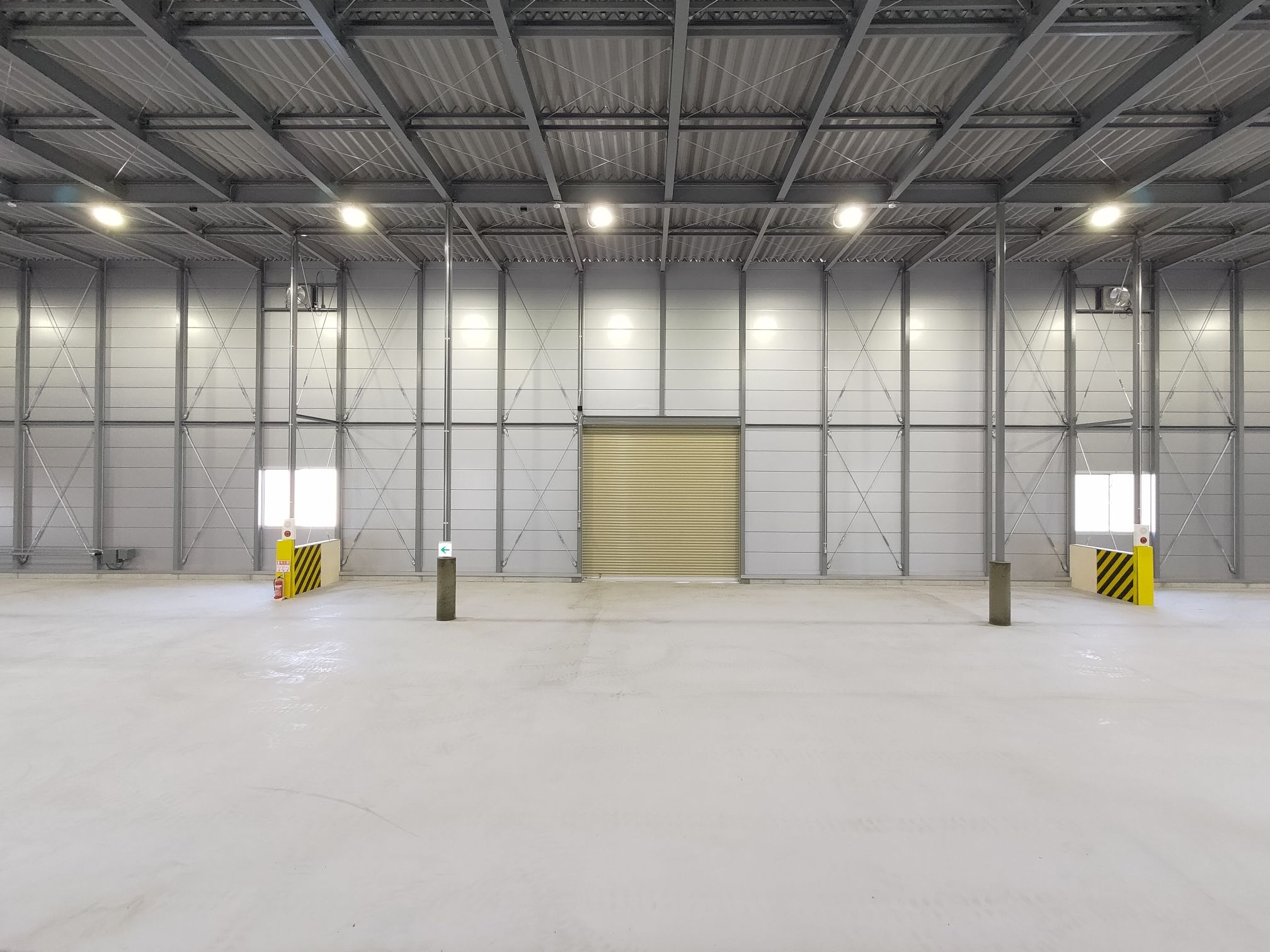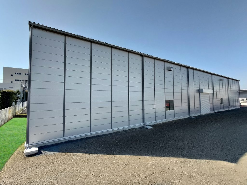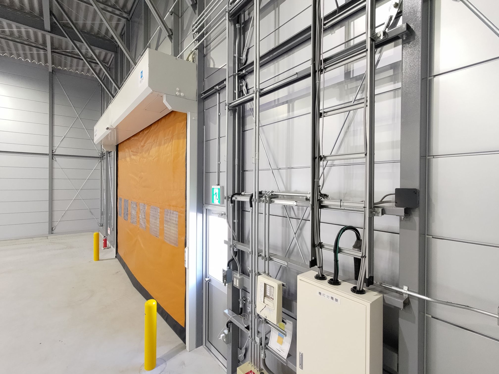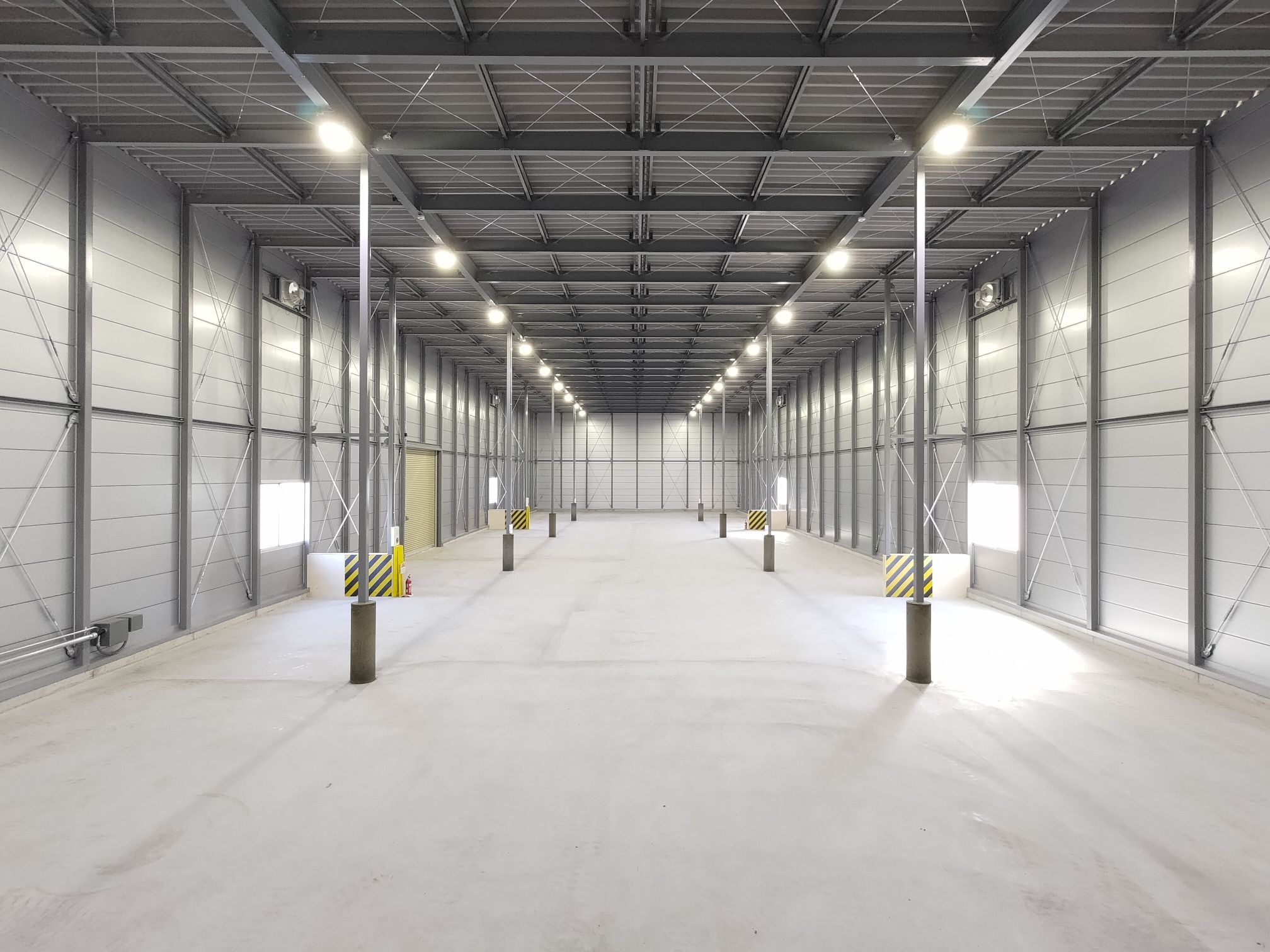OLライトシリーズにて設計・施工した印刷工場です。印刷物などの荷物をパレットごと格納・保管するためのラックを積み重ねる事を考慮し、 梁下 「梁下」 梁(はり)の下端から床仕上げ面までの高さを示す寸法。意匠的な天井仕上げの高さ(天井高)とは異なり、構造体としての制限寸法を表す。 梁下:梁の下端まで 天井高:内装仕上げ後の天井面ま...more までの高さを6.7m確保。又、作業効率を確保するため、中柱2本の位置を調整し、フォークリフトでの搬入・搬出が容易に行えるように設計しました。メインの入口には高さ3.5m・幅5.3mの大型の電動シャッターを設置し、加えて内側にはシートシャッターを取り付けることにより、作業性を高めながらも塵や埃などの侵入を防ぎ、倉庫内の環境を清潔に保つ事が出来ます。更に繁忙期の搬出入にも対応する為、建物中央にもう一つ電動シャッター(幅3.5m・高さ3.5m)を設置しています。照明は高さがあっても十分な明るさを確保出来るLEDライトを採用。換気は大空間でも空気が問題なく循環するよう、大風量の有圧換気扇を4台(給気2個、排気2個)設置。メインの入口には柱を必要としない出幅3mの吊り庇を採用することで、トラック横付け時の妨げにならず、雨天時にも配慮しています。また大型のトラックの積み込みも考慮し、入口前のスペースは75㎡(幅15m・奥行き5m)と、大きく確保しています。外観はサンドイッチパネルのシルバーカラーにより、周囲の既存の建物とうまく溶け込みながら、工場らしいスタイリッシュな仕上がりになっています。