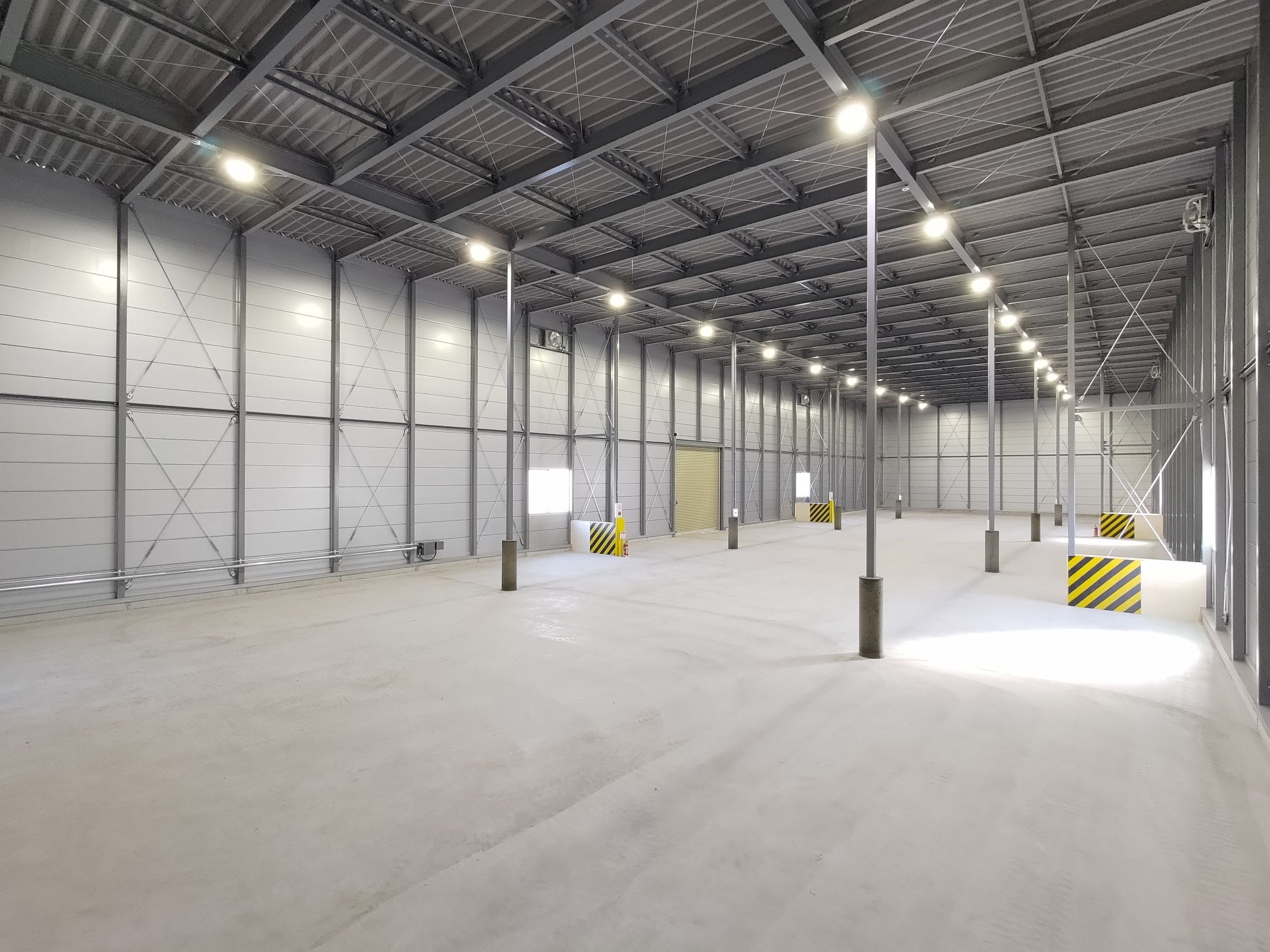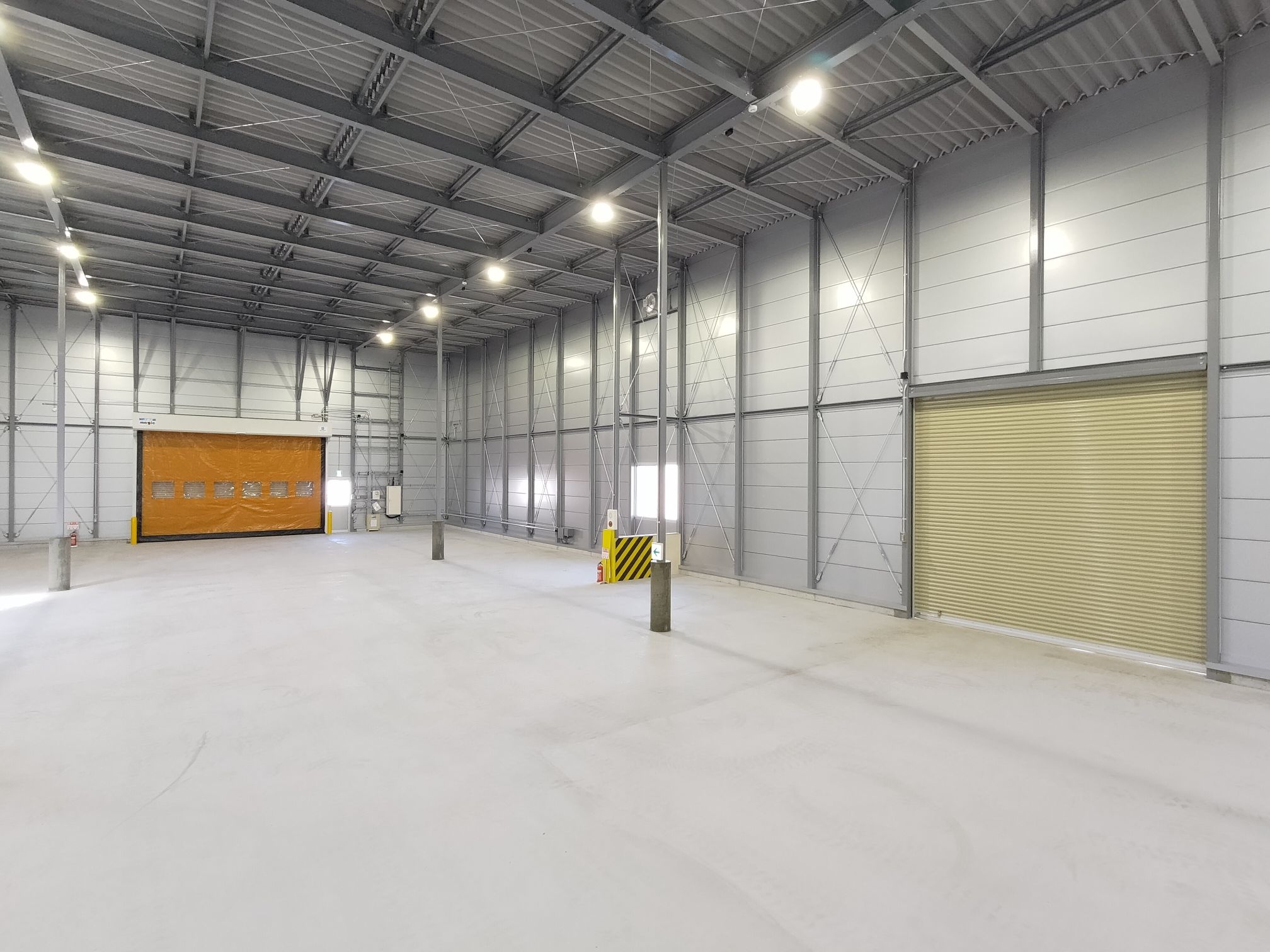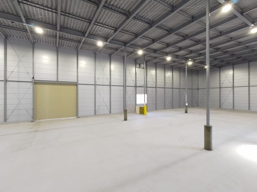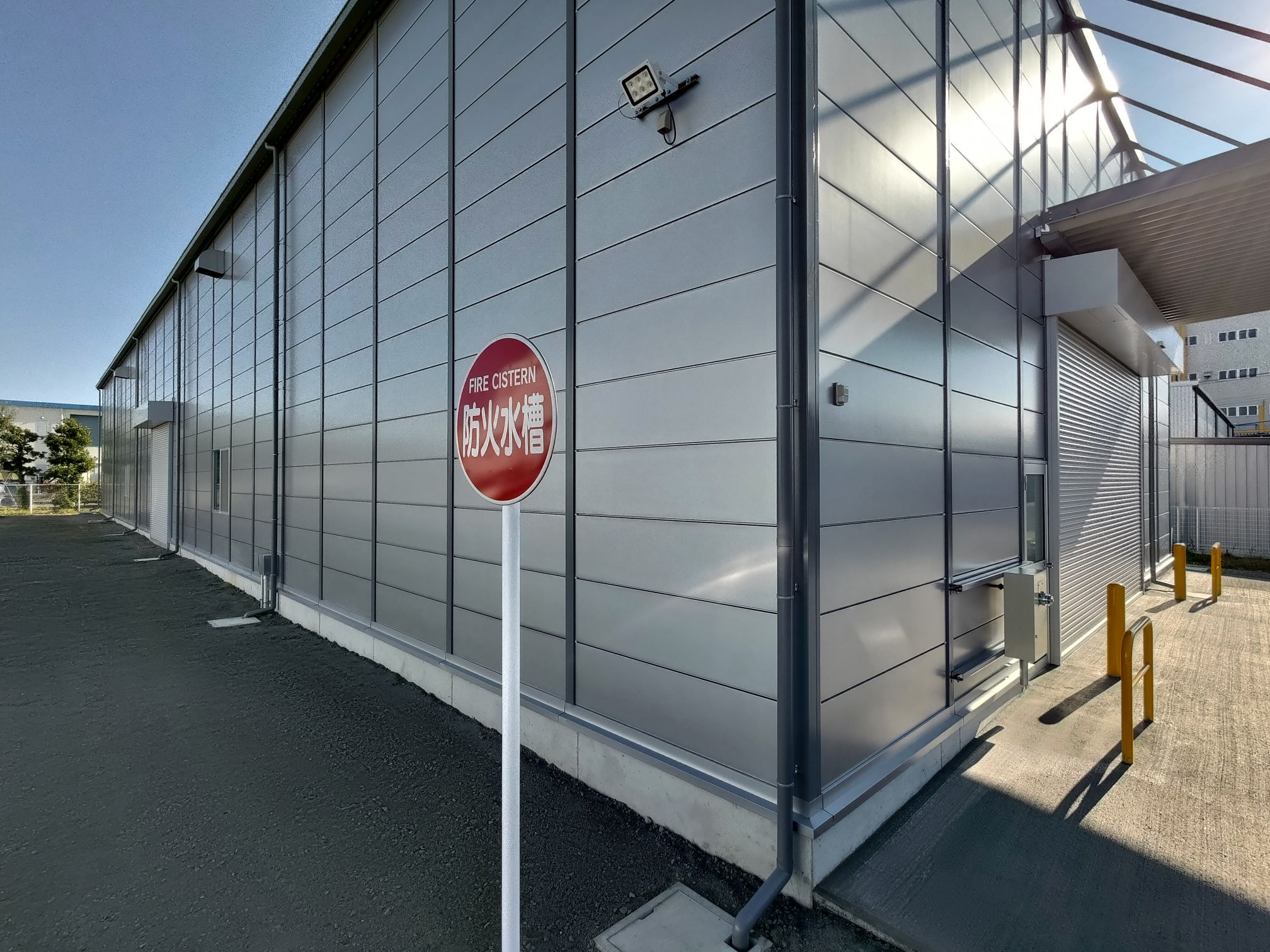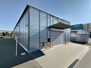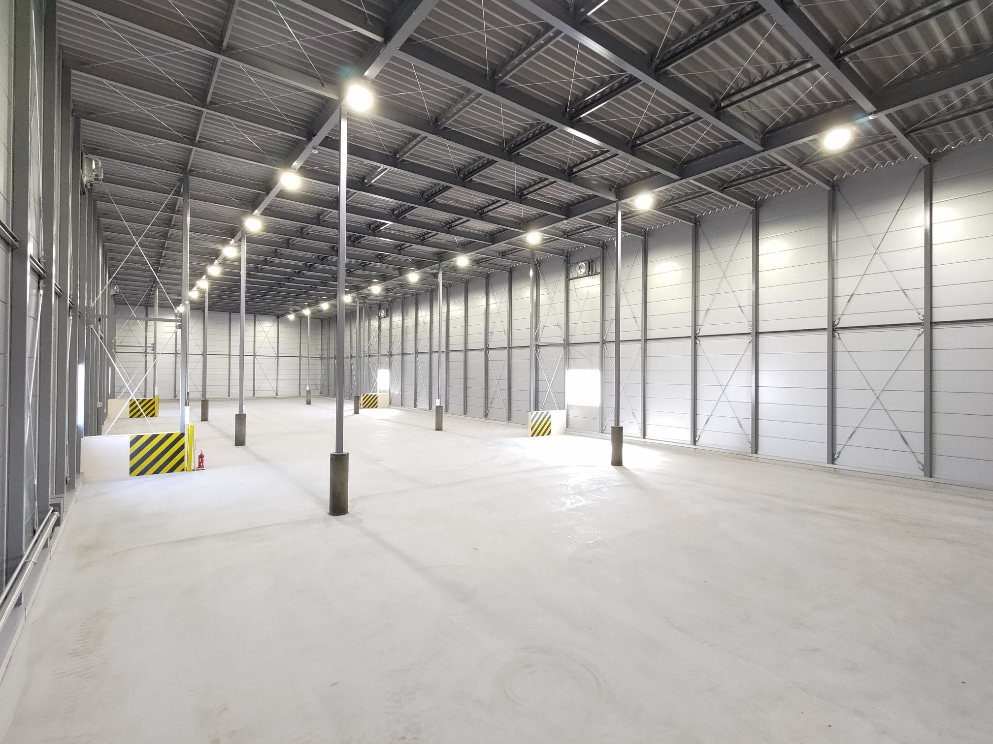 OLライトシリーズにて設計・施工した印刷工場です。印刷物などの荷物をパレットごと格納・保管するためのラックを積み重ねる事を考慮し、 梁下 「梁下」 梁(はり)の下端から床仕上げ面までの高さを示す寸法。意匠的な天井仕上げの高さ(天井高)とは異なり、構造体としての制限寸法を表す。 梁下:梁の下端まで 天井高:内装仕上げ後の天井面ま...more までの高さを6.7m確保。又、作業効率を確保するため、中柱2本の位置を調整し、フォークリフトでの搬入・搬出が容易に行えるように設計しました。メインの入口には高さ3.5m・幅5.3mの大型の電動シャッターを設置し、加えて内側にはシートシャッターを取り付けることにより、作業性を高めながらも塵や埃などの侵入を防ぎ、倉庫内の環境を清潔に保つ事が出来ます。更に繁忙期の搬出入にも対応する為、建物中央にもう一つ電動シャッター(幅3.5m・高さ3.5m)を設置しています。照明は高さがあっても十分な明るさを確保出来るLEDライトを採用。換気は大空間でも空気が問題なく循環するよう、大風量の有圧換気扇を4台(給気2個、排気2個)設置。メインの入口には柱を必要としない出幅3mの吊り庇を採用することで、トラック横付け時の妨げにならず、雨天時にも配慮しています。また大型のトラックの積み込みも考慮し、入口前のスペースは75㎡(幅15m・奥行き5m)と、大きく確保しています。外観はサンドイッチパネルのシルバーカラーにより、周囲の既存の建物とうまく溶け込みながら、工場らしいスタイリッシュな仕上がりになっています。
