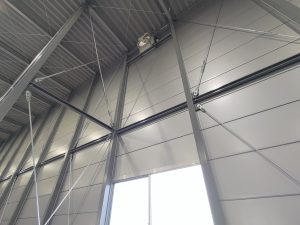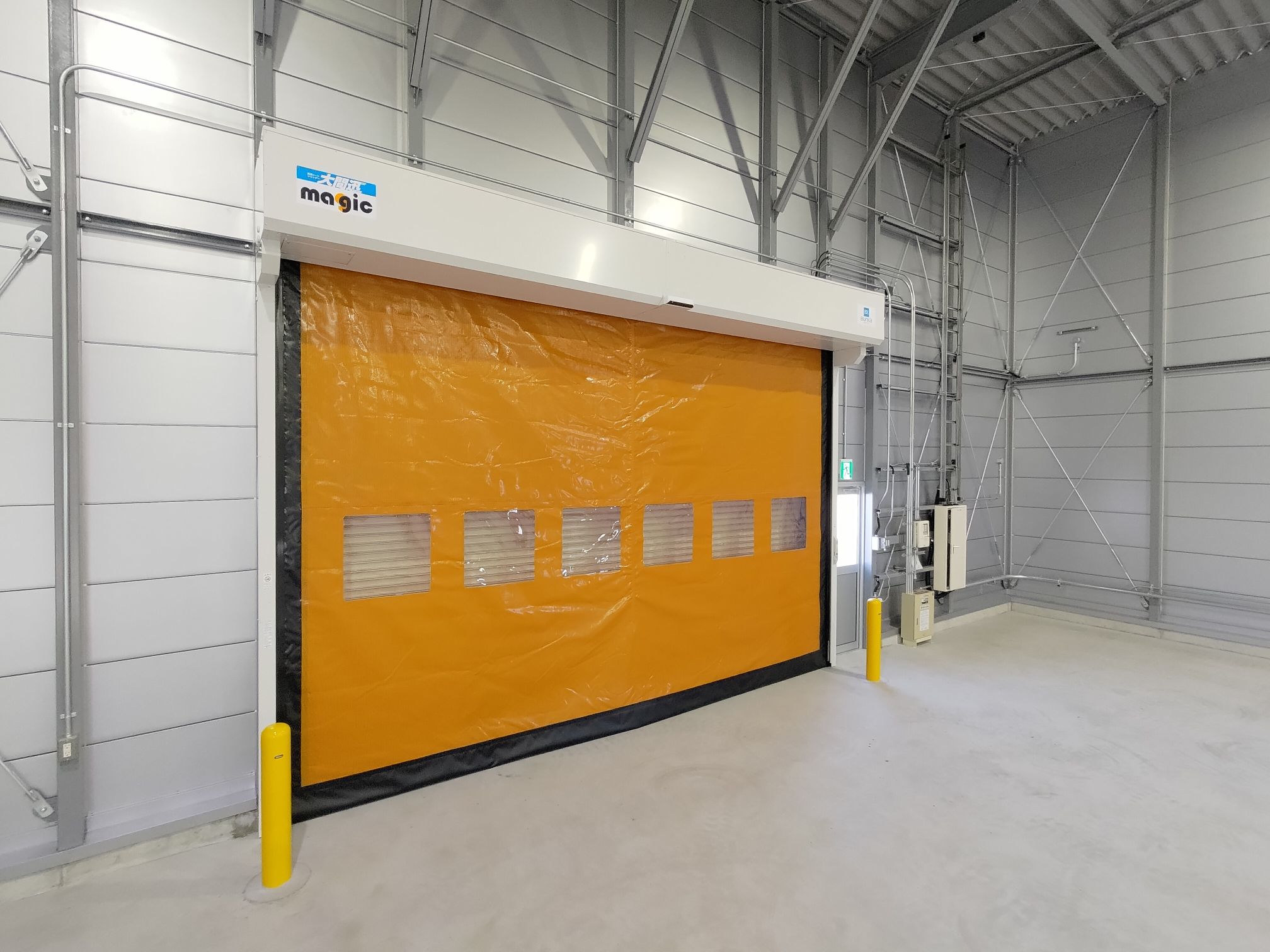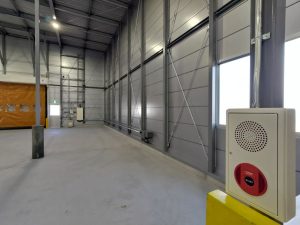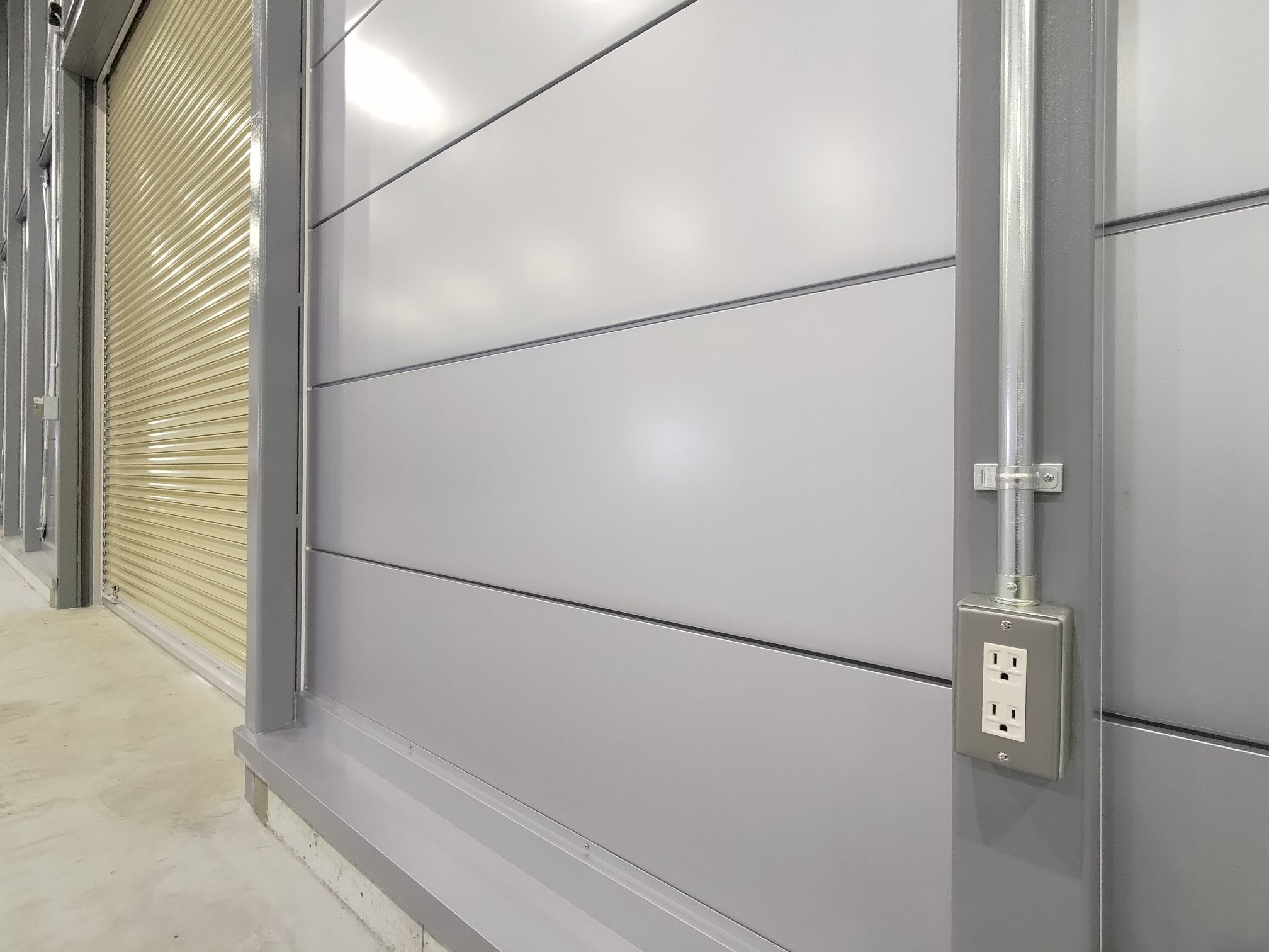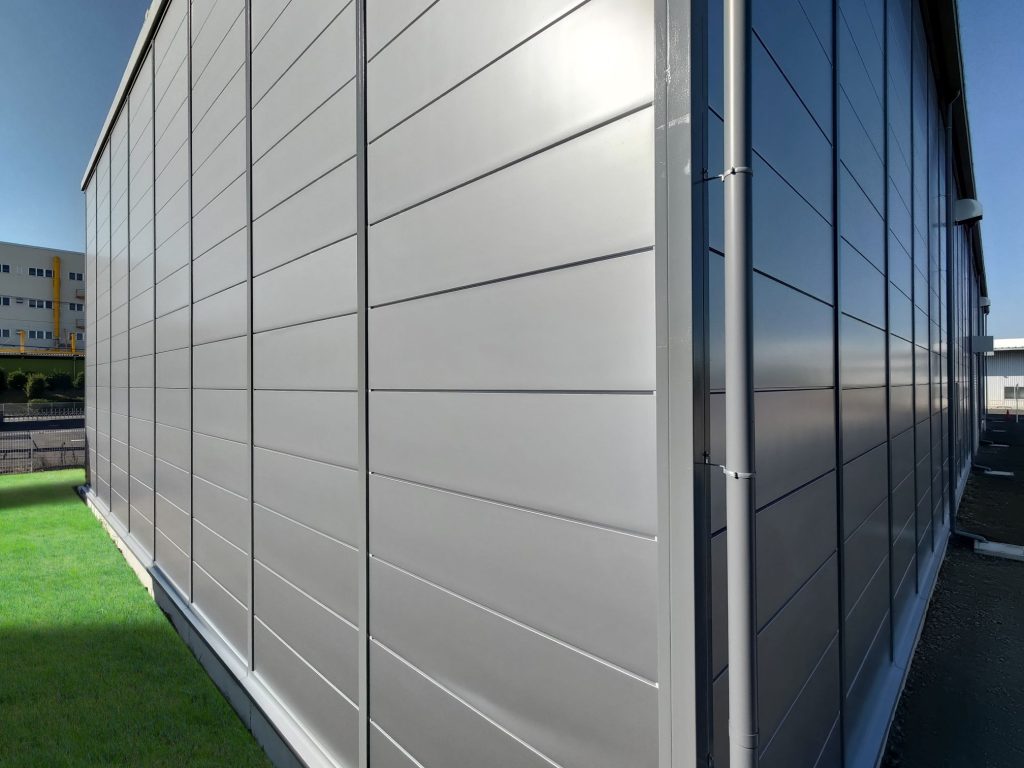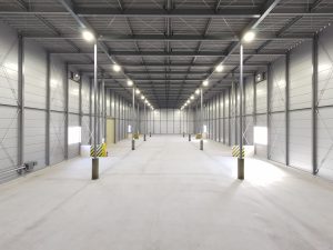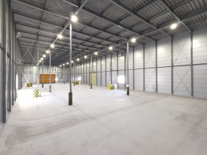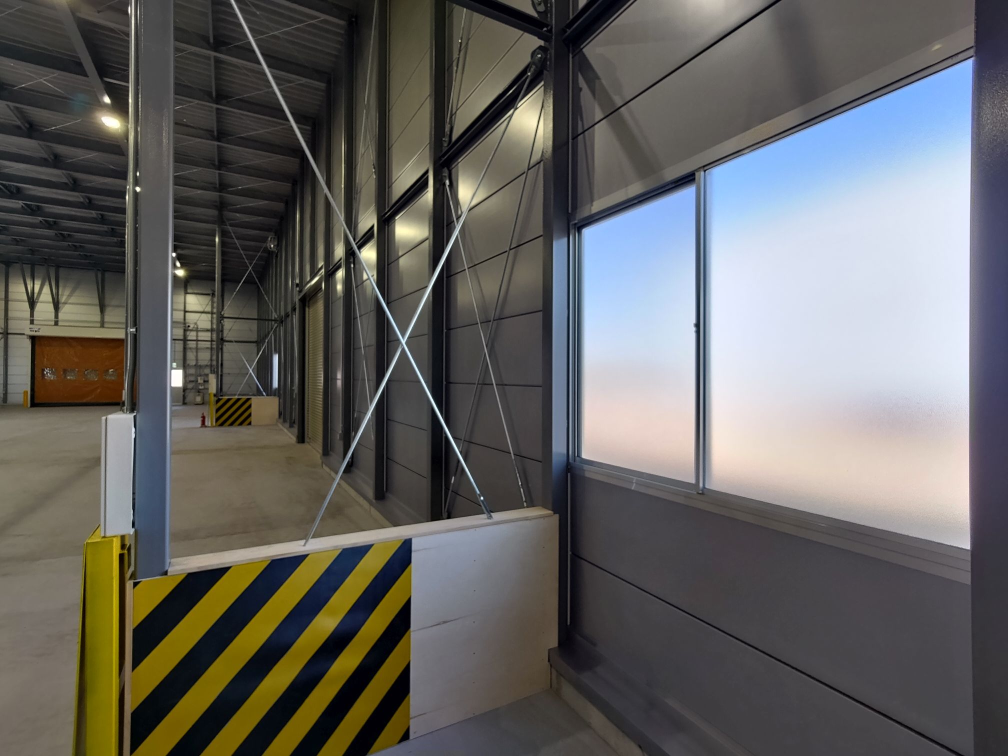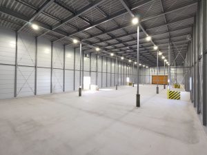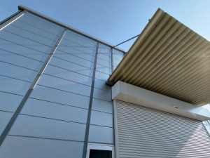 OLライトシリーズにて設計・施工した印刷工場です。印刷物などの荷物をパレットごと格納・保管するためのラックを積み重ねる事を考慮し、 梁下 「梁下」 梁(はり)の下端から床仕上げ面までの高さを示す寸法。意匠的な天井仕上げの高さ(天井高)とは異なり、構造体としての制限寸法を表す。 梁下:梁の下端まで 天井高:内装仕上げ後の天井面ま...more までの高さを6.7m確保。又、作業効率を確保するため、中柱2本の位置を調整し、フォークリフトでの搬入・搬出が容易に行えるように設計しました。メインの入口には高さ3.5m・幅5.3mの大型の電動シャッターを設置し、加えて内側にはシートシャッターを取り付けることにより、作業性を高めながらも塵や埃などの侵入を防ぎ、倉庫内の環境を清潔に保つ事が出来ます。更に繁忙期の搬出入にも対応する為、建物中央にもう一つ電動シャッター(幅3.5m・高さ3.5m)を設置しています。照明は高さがあっても十分な明るさを確保出来るLEDライトを採用。換気は大空間でも空気が問題なく循環するよう、大風量の有圧換気扇を4台(給気2個、排気2個)設置。メインの入口には柱を必要としない出幅3mの吊り庇を採用することで、トラック横付け時の妨げにならず、雨天時にも配慮しています。また大型のトラックの積み込みも考慮し、入口前のスペースは75㎡(幅15m・奥行き5m)と、大きく確保しています。外観はサンドイッチパネルのシルバーカラーにより、周囲の既存の建物とうまく溶け込みながら、工場らしいスタイリッシュな仕上がりになっています。