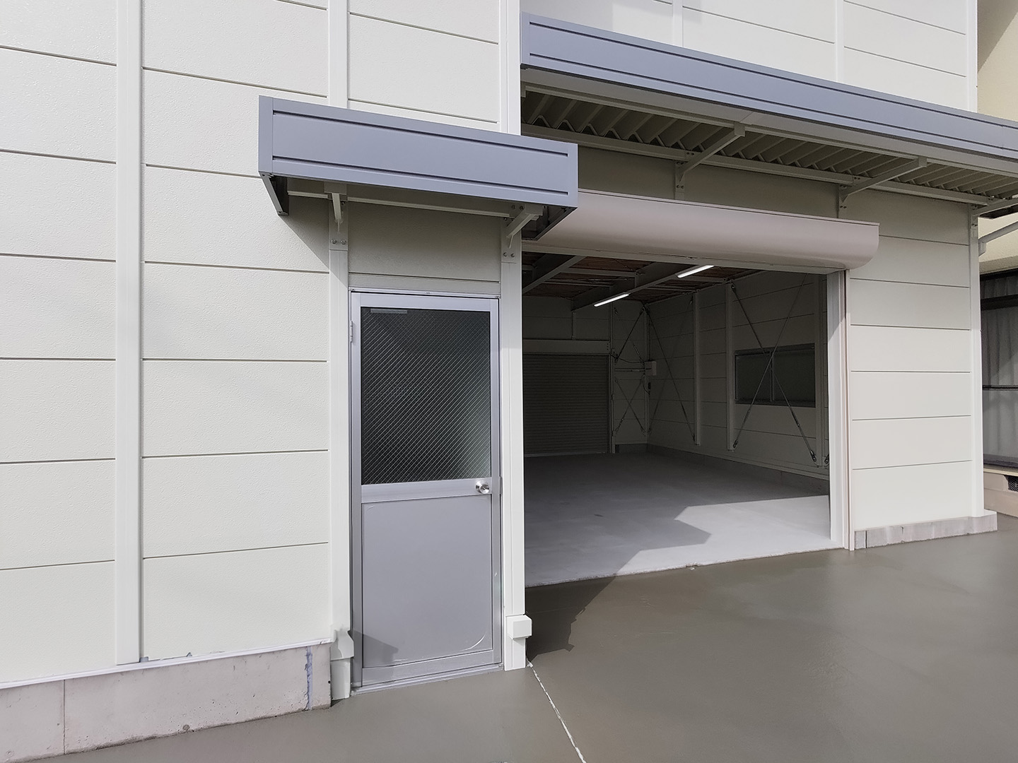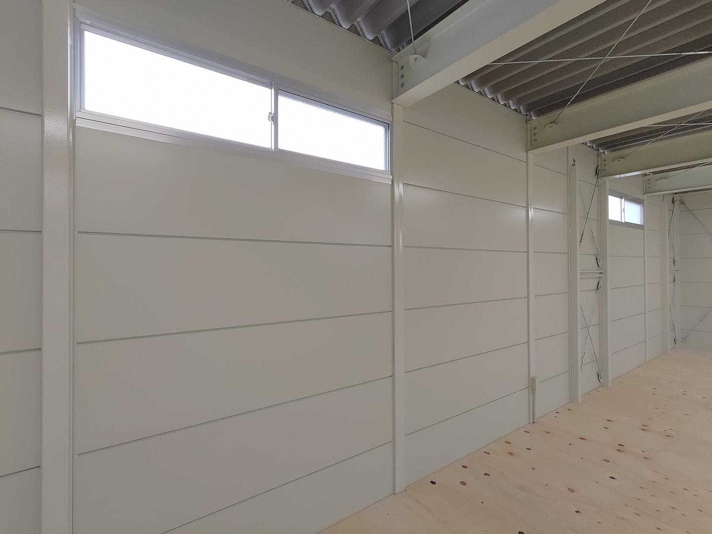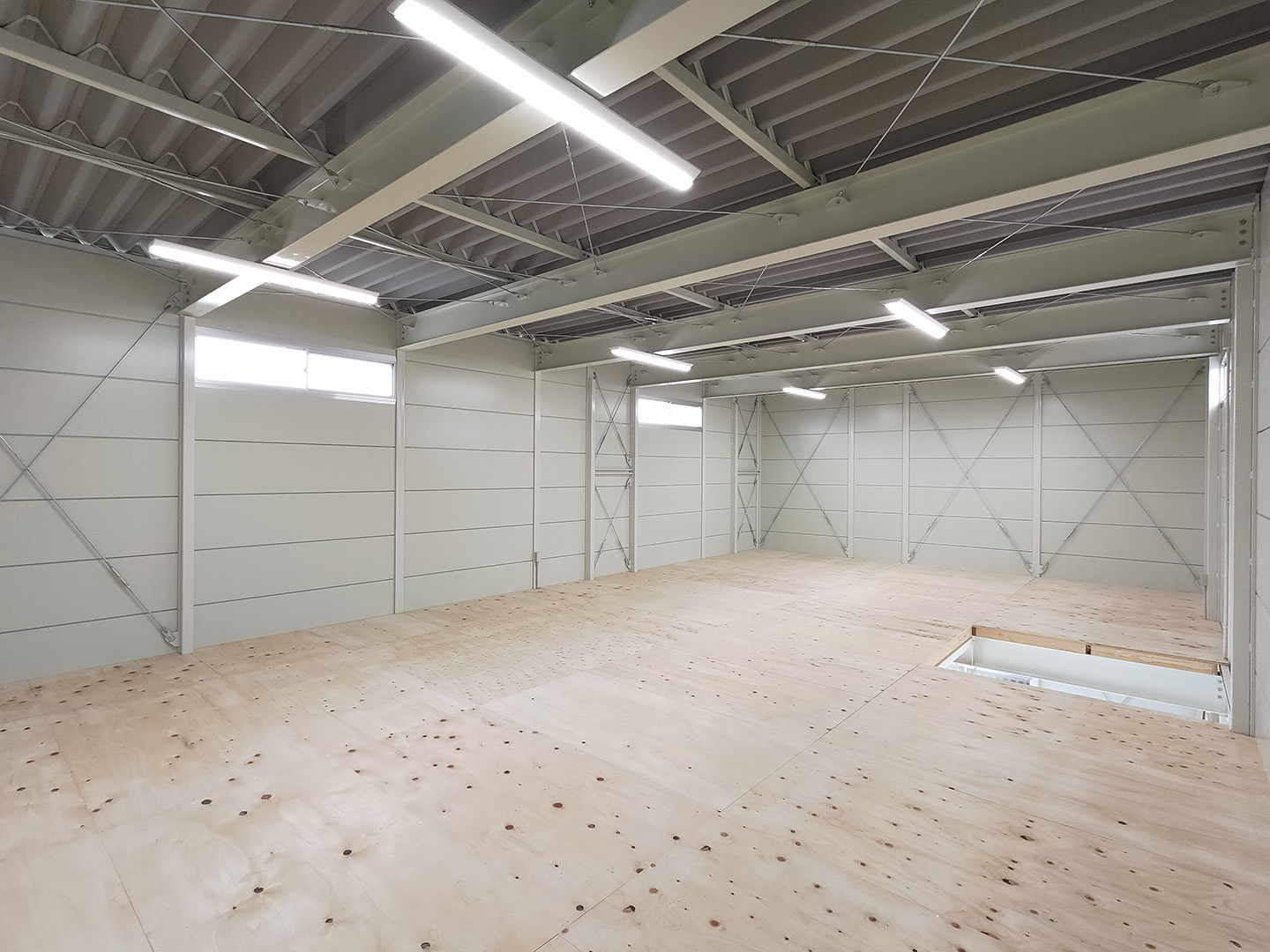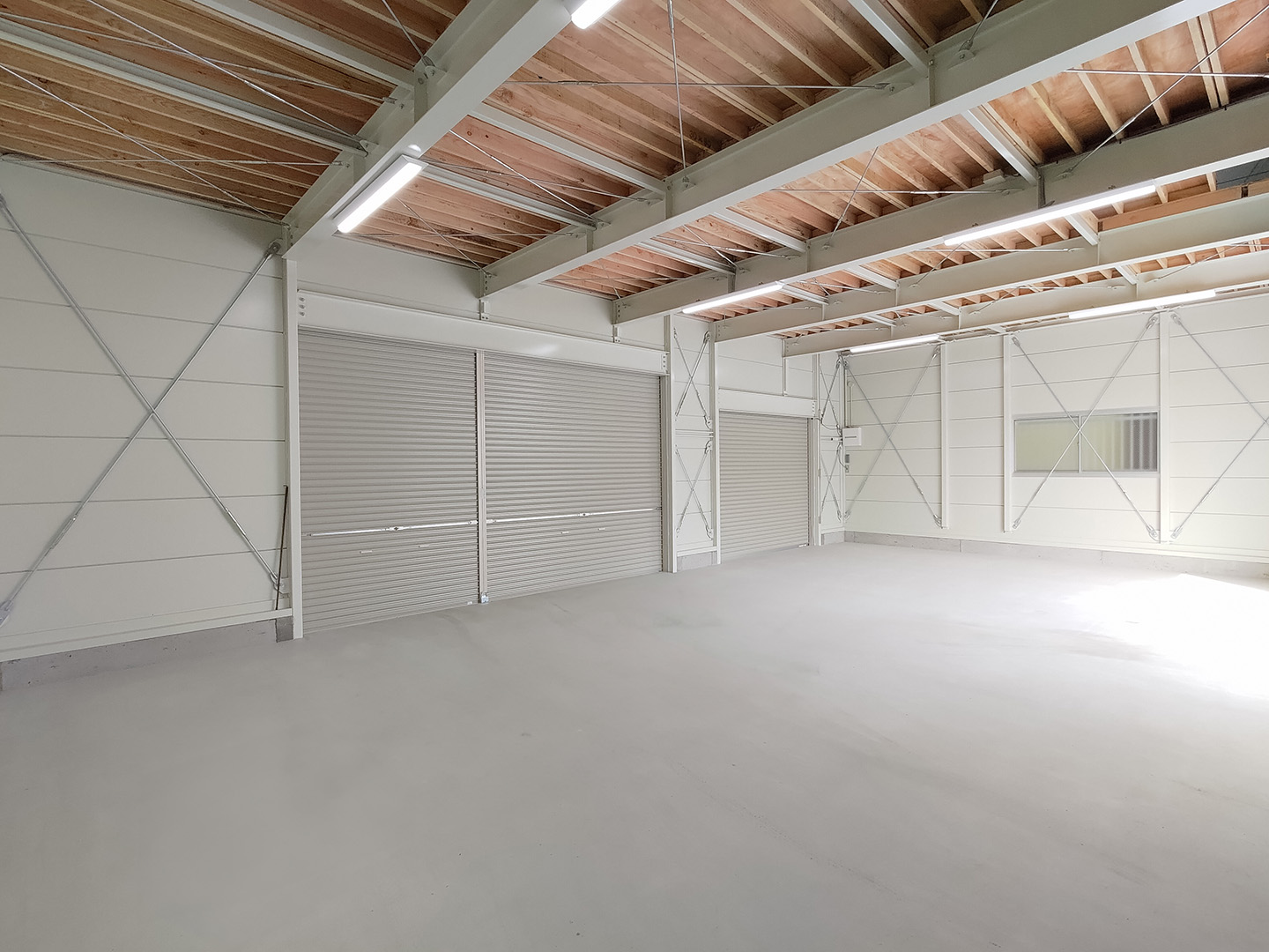 OLライトシリーズ 「OLライトシリーズ」 オリエントハウスプレハブシリーズの短工期&低コストの汎用モデル。外装・内装を兼ねることが出来る高断熱の壁パネルを使用しています。シリーズ詳細はこちら>more で設計施工した2階建ての農業用倉庫です。1階の倉庫スペースは動線と利便性を考慮し、建物の両サイドに合計3つのシャッターを設置。頻繁に使用する箇所は、幅2.7m x 高さ 2.2mの電動シャッター、後の2つは各、幅4.5m x 高さ 2.6m、幅3.6m x 高さ 2.2mの大きめの手動式シャッターを採用。2階の倉庫スペースは、荷物の揚げ降ろしがしやすいよう床の一部が取り外し可能になっています。プレハブハウスは、規格化された部材を使用しつつも設計の自由度が高く、この倉庫のように隣接する建物との間隔が狭い土地でも設計施工することができます。