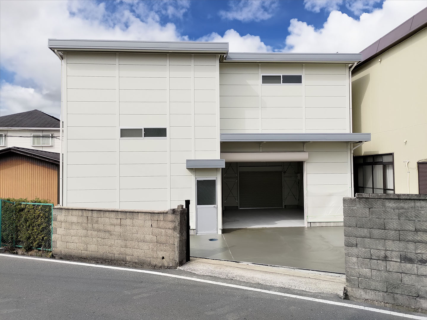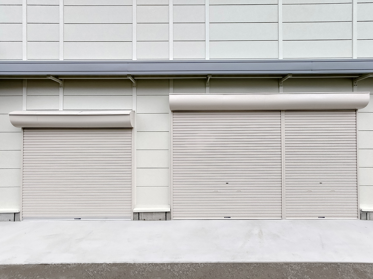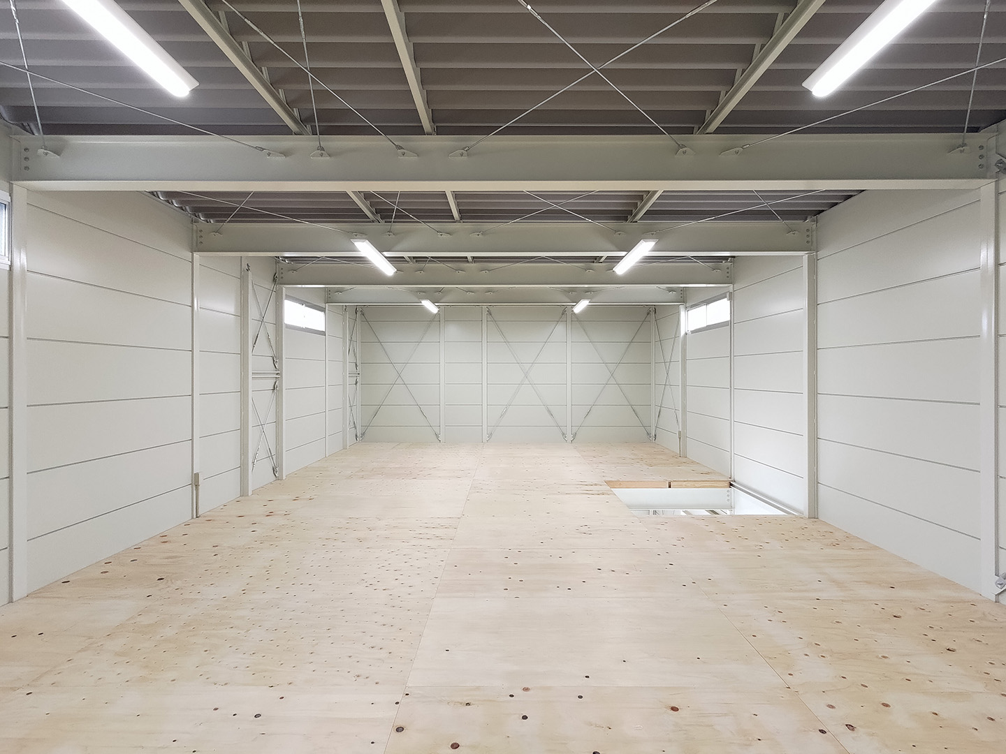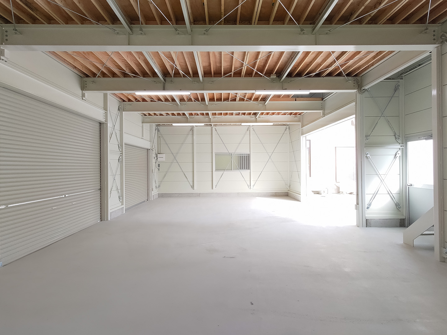 OLライトシリーズ 「OLライトシリーズ」 オリエントハウスプレハブシリーズの短工期&低コストの汎用モデル。外装・内装を兼ねることが出来る高断熱の壁パネルを使用しています。シリーズ詳細はこちら>more で設計施工した2階建ての農業用倉庫です。1階の倉庫スペースは動線と利便性を考慮し、建物の両サイドに合計3つのシャッターを設置。頻繁に使用する箇所は、幅2.7m x 高さ 2.2mの電動シャッター、後の2つは各、幅4.5m x 高さ 2.6m、幅3.6m x 高さ 2.2mの大きめの手動式シャッターを採用。2階の倉庫スペースは、荷物の揚げ降ろしがしやすいよう床の一部が取り外し可能になっています。プレハブハウスは、規格化された部材を使用しつつも設計の自由度が高く、この倉庫のように隣接する建物との間隔が狭い土地でも設計施工することができます。