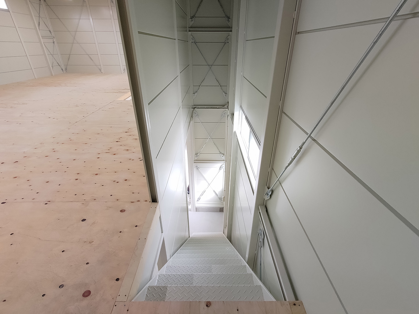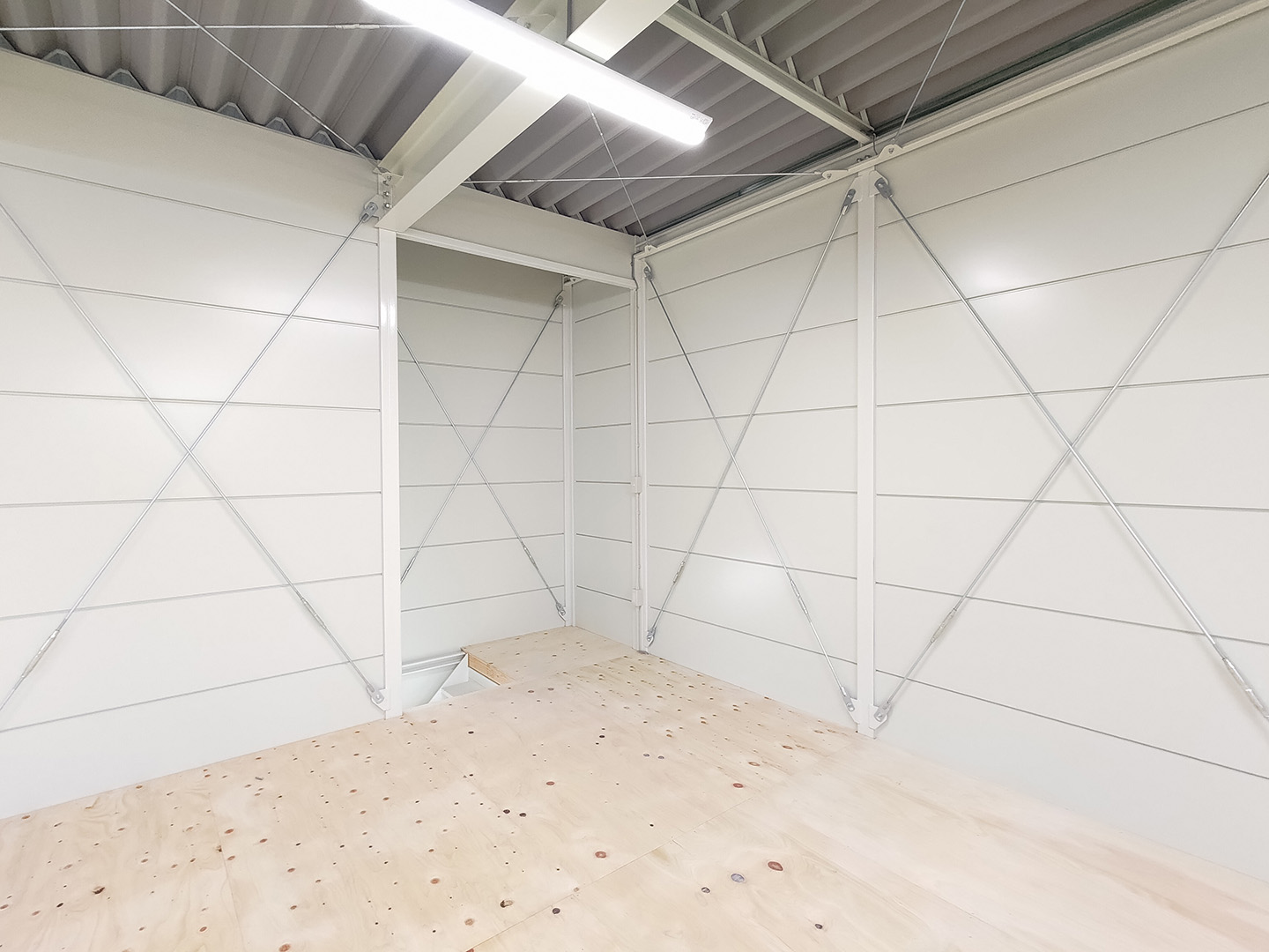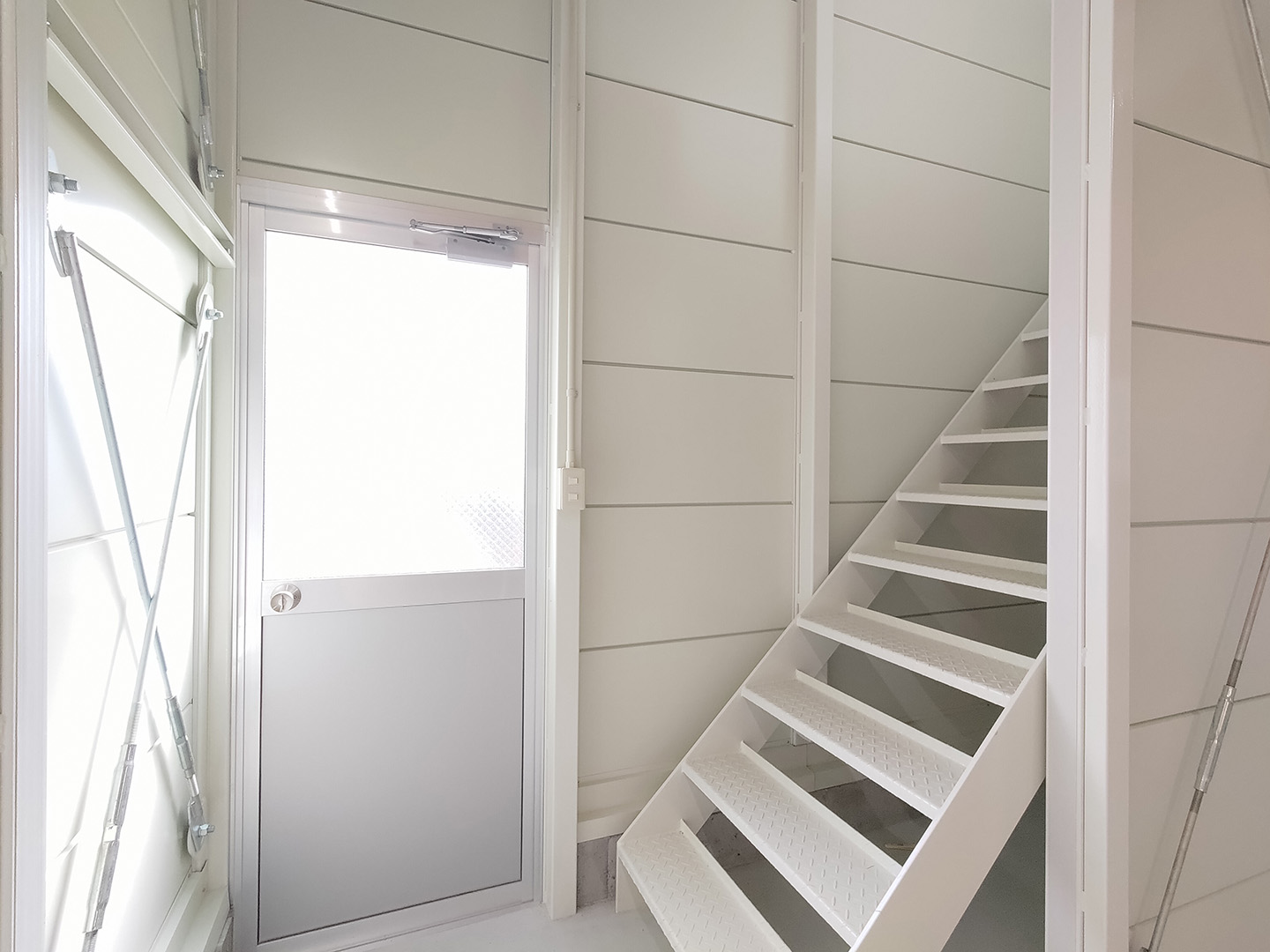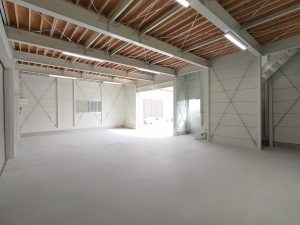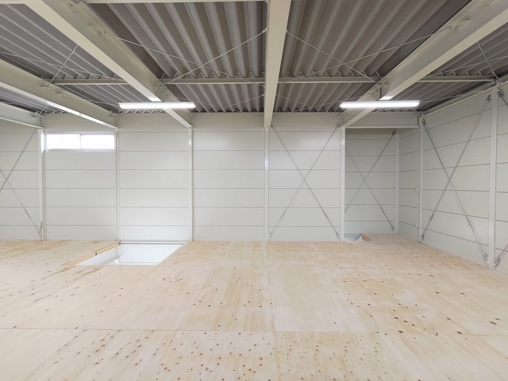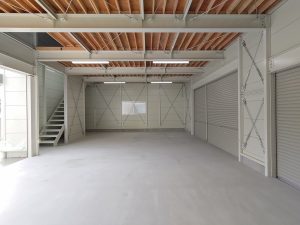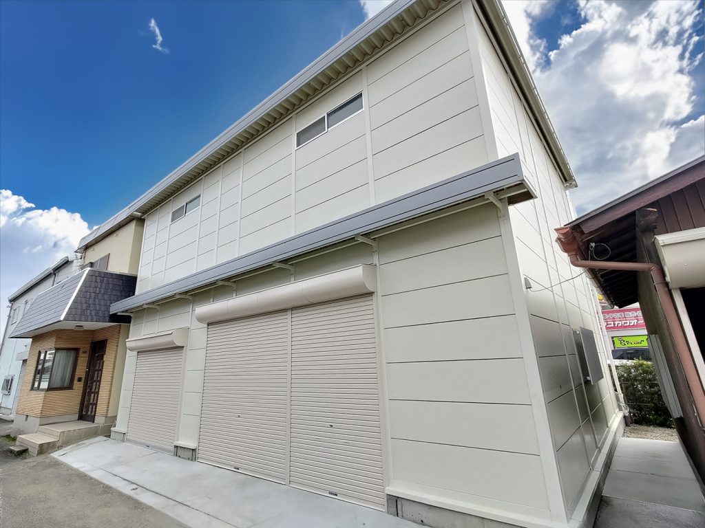 OLライトシリーズ 「OLライトシリーズ」 オリエントハウスプレハブシリーズの短工期&低コストの汎用モデル。外装・内装を兼ねることが出来る高断熱の壁パネルを使用しています。シリーズ詳細はこちら>more で設計施工した2階建ての農業用倉庫です。1階の倉庫スペースは動線と利便性を考慮し、建物の両サイドに合計3つのシャッターを設置。頻繁に使用する箇所は、幅2.7m x 高さ 2.2mの電動シャッター、後の2つは各、幅4.5m x 高さ 2.6m、幅3.6m x 高さ 2.2mの大きめの手動式シャッターを採用。2階の倉庫スペースは、荷物の揚げ降ろしがしやすいよう床の一部が取り外し可能になっています。プレハブハウスは、規格化された部材を使用しつつも設計の自由度が高く、この倉庫のように隣接する建物との間隔が狭い土地でも設計施工することができます。