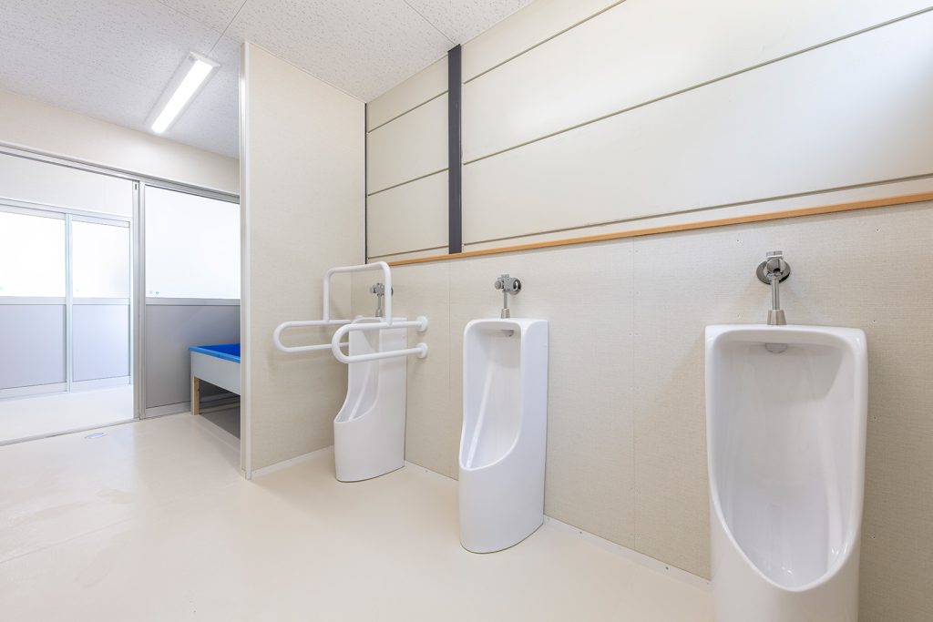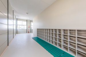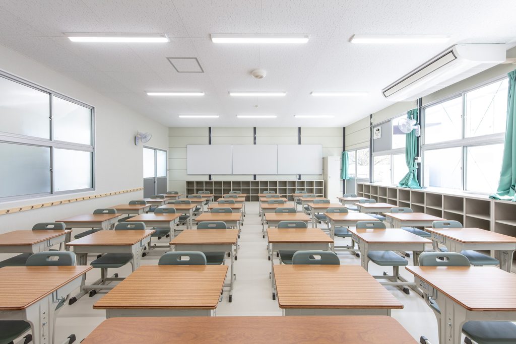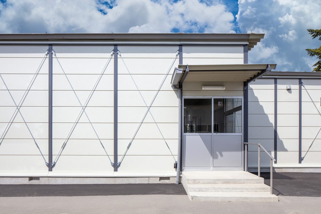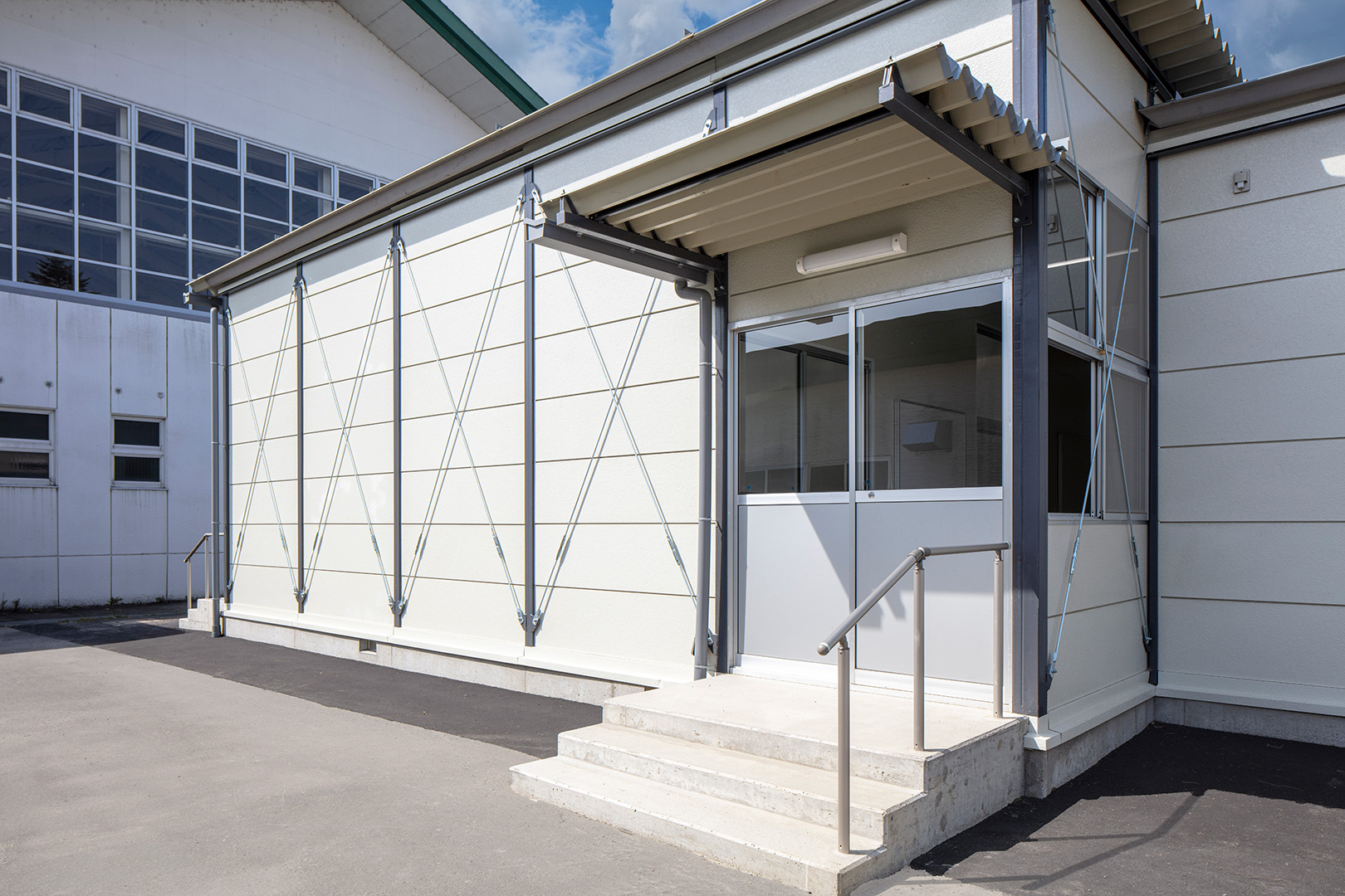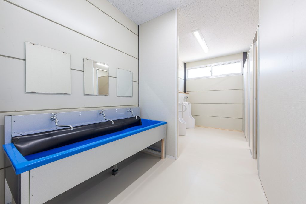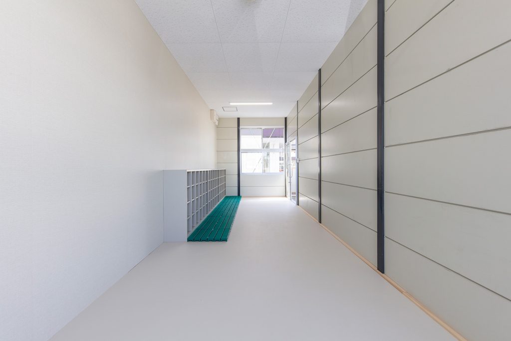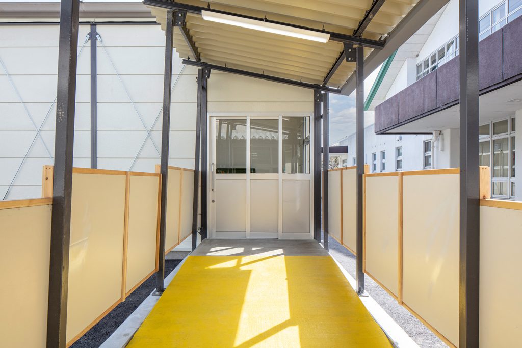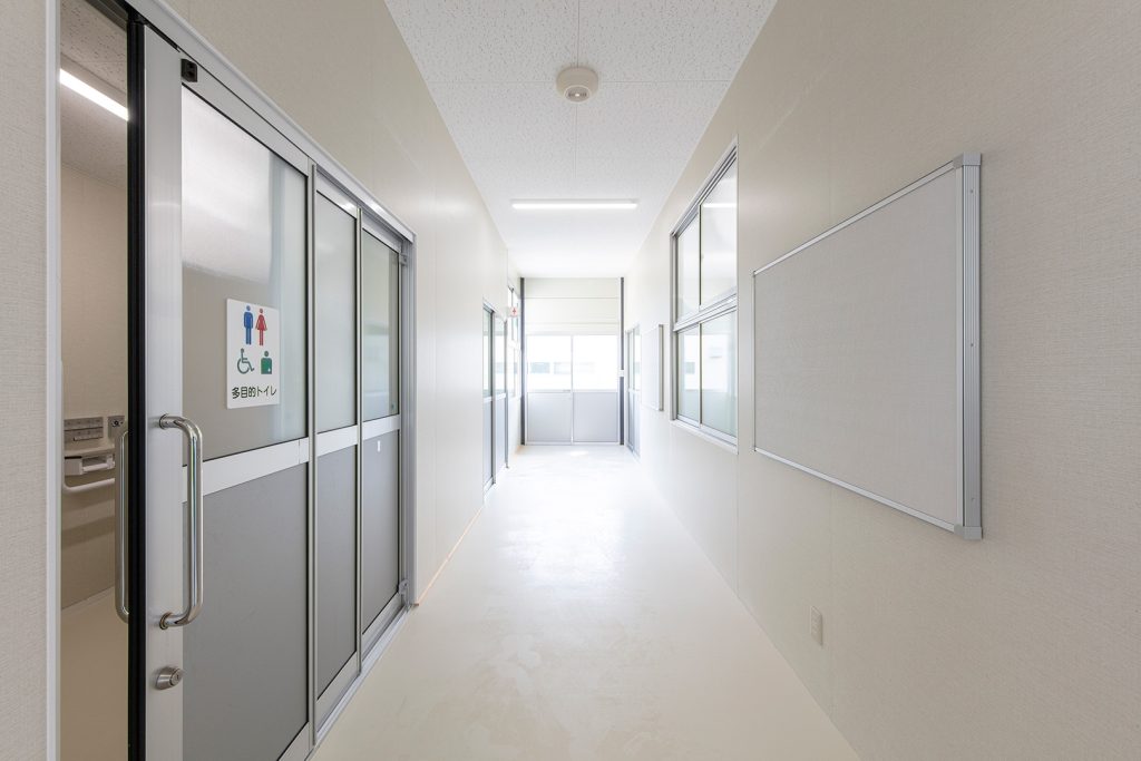 OLシリーズで施工した小学校の校舎です。生徒数の増加に対応するため、普通教室2室とトイレ、昇降口を備えた校舎を建築しました。改修工事に伴う一時的な代替施設ではなく、長期使用を想定した校舎であるため、学校用途として十分な安全性を確保して計画・施工しています。外壁には、断熱性とコストのバランスに優れたOHPパネルを採用しました。内部は移動動線やレイアウトに配慮し、教室・廊下・トイレを配置しています。昇降口前には、既設の渡り廊下と接続できるよう新たに渡り廊下を設置しました。また、県独自のユニバーサルデザイン条例に基づき、渡り廊下のスロープ部分は床の色分けや、引き戸の段差を解消する工夫を施すなど、誰にとっても使いやすい計画としています。