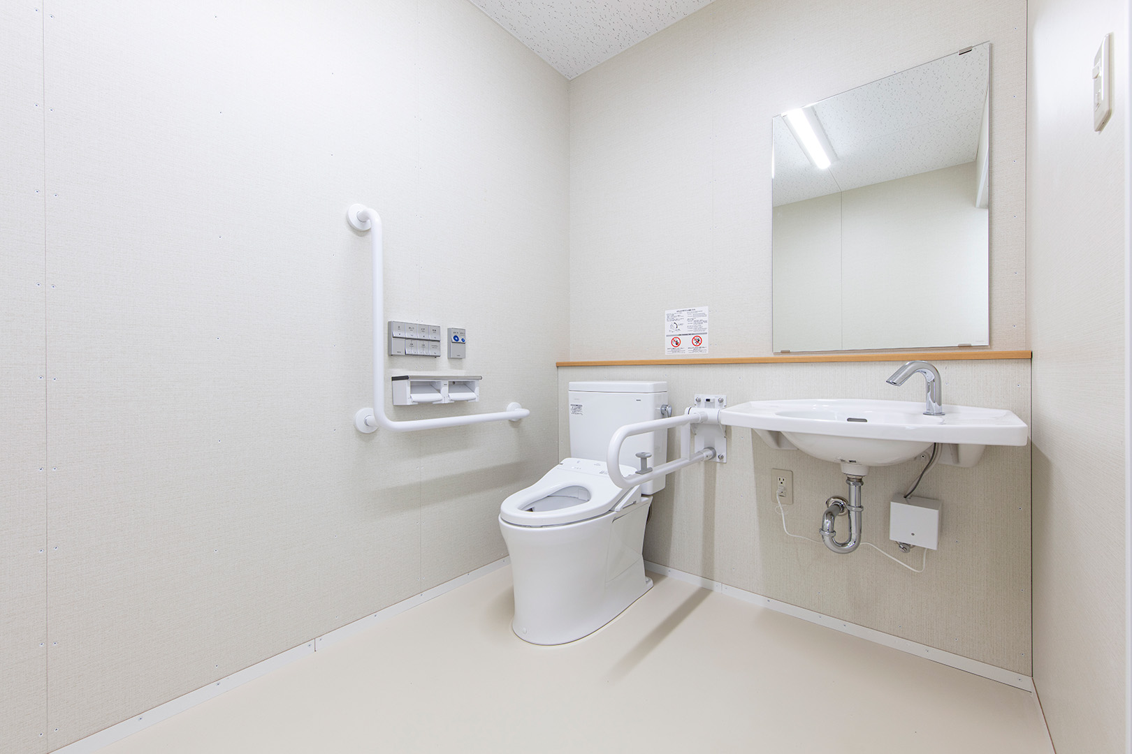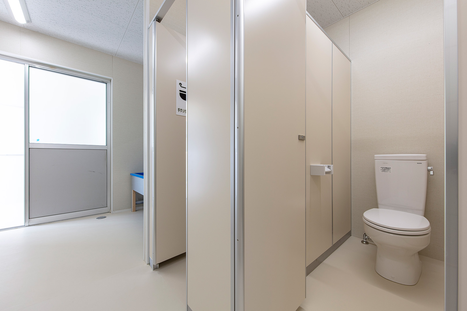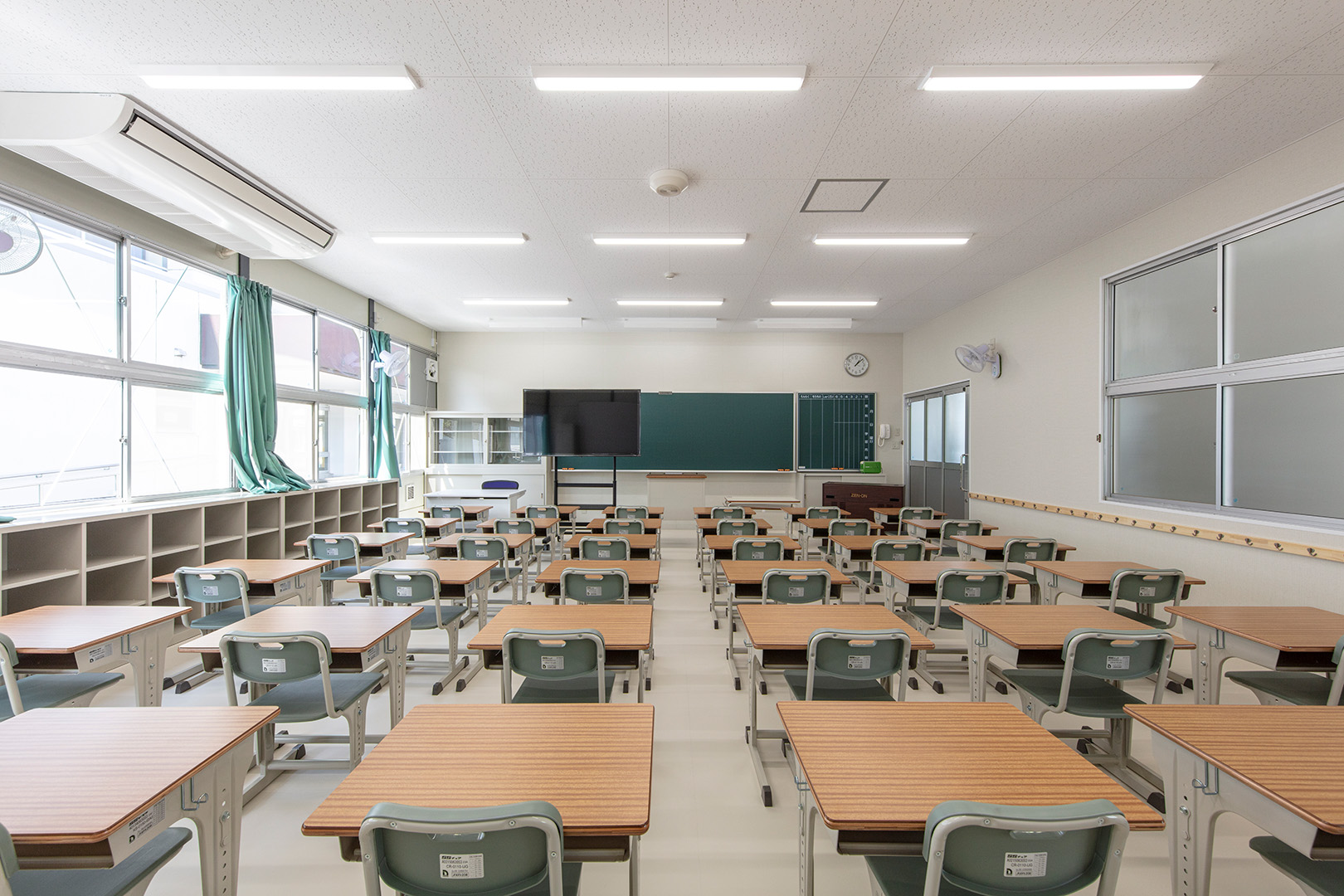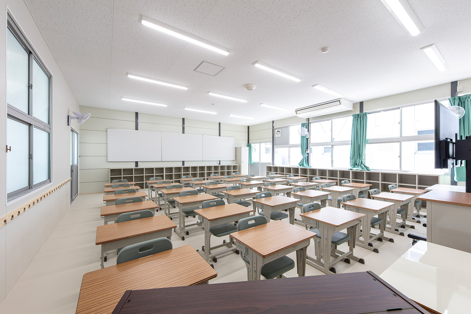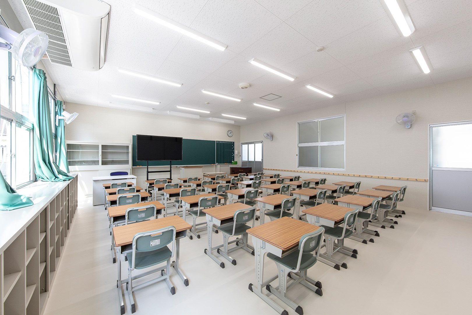 OLシリーズで施工した小学校の校舎です。生徒数の増加に対応するため、普通教室2室とトイレ、昇降口を備えた校舎を建築しました。改修工事に伴う一時的な代替施設ではなく、長期使用を想定した校舎であるため、学校用途として十分な安全性を確保して計画・施工しています。外壁には、断熱性とコストのバランスに優れたOHPパネルを採用しました。内部は移動動線やレイアウトに配慮し、教室・廊下・トイレを配置しています。昇降口前には、既設の渡り廊下と接続できるよう新たに渡り廊下を設置しました。また、県独自のユニバーサルデザイン条例に基づき、渡り廊下のスロープ部分は床の色分けや、引き戸の段差を解消する工夫を施すなど、誰にとっても使いやすい計画としています。