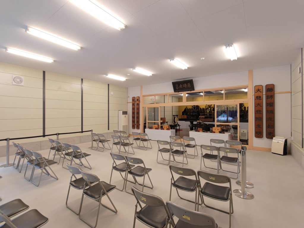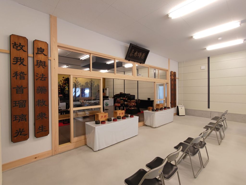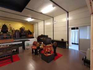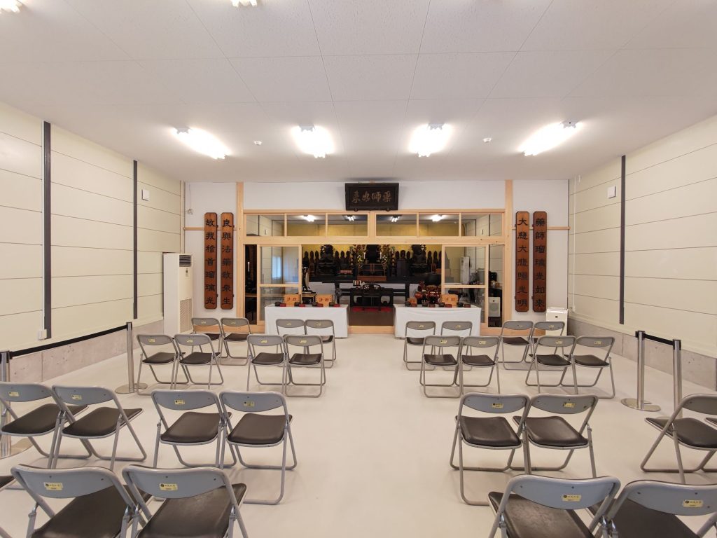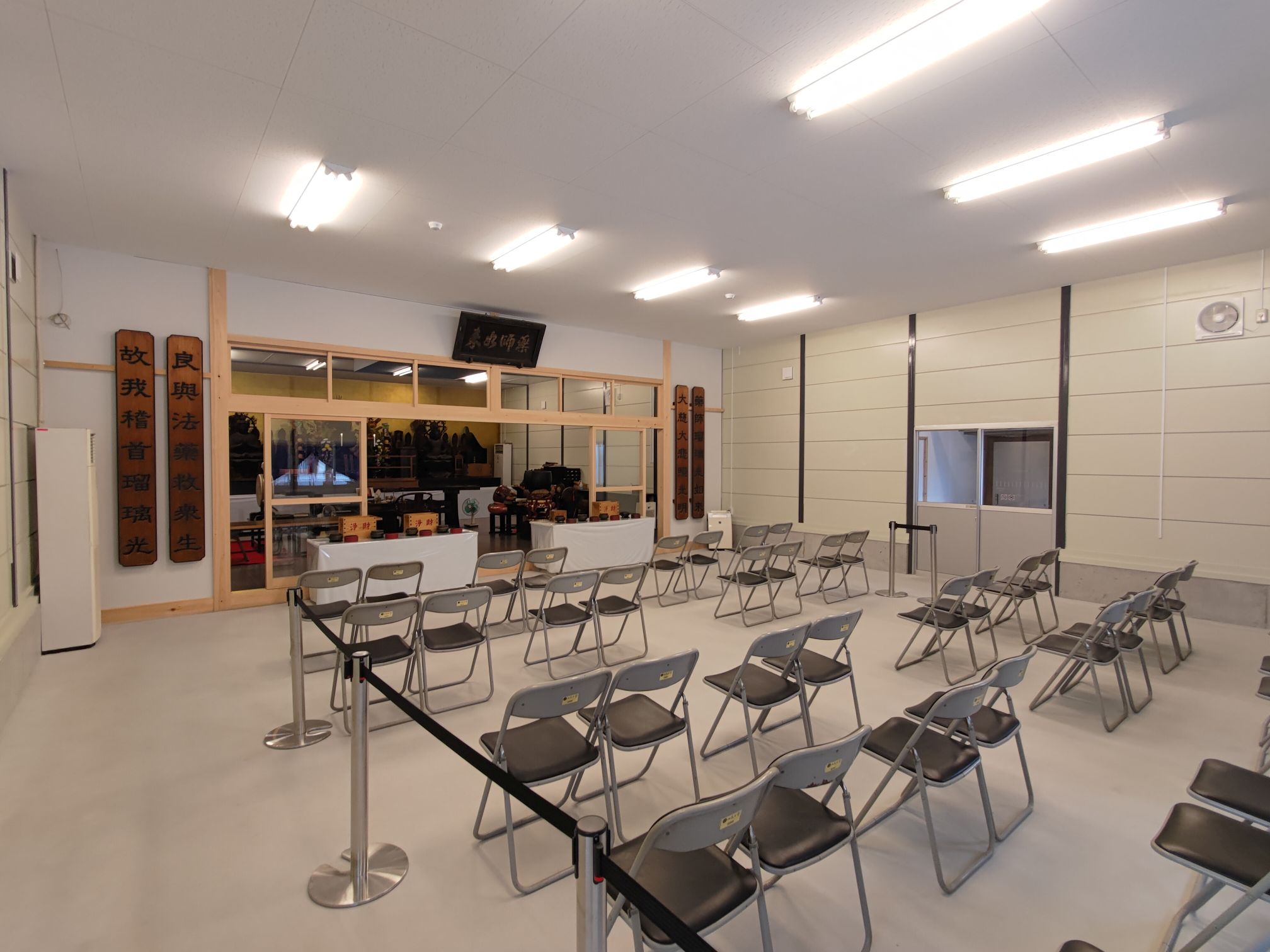 寺院内の本堂を改修期間中に設置しました、仮設の本堂になります。 OLライトシリーズ 「OLライトシリーズ」 オリエントハウスプレハブシリーズの短工期&低コストの汎用モデル。外装・内装を兼ねることが出来る高断熱の壁パネルを使用しています。シリーズ詳細はこちら>more を用いた仮設ハウスと、木造庇のコラボレーションにより、寺社仏閣の外観を再現。室内も本尊が配置されている事により、法要などが行われやすく、50人弱の方が参列出来るように、80㎡程のスペースを確保しております。また、室内の天井高は3.6m確保して圧迫感がないようにし、床は土足入場となるためコンクリート仕上げとしております。