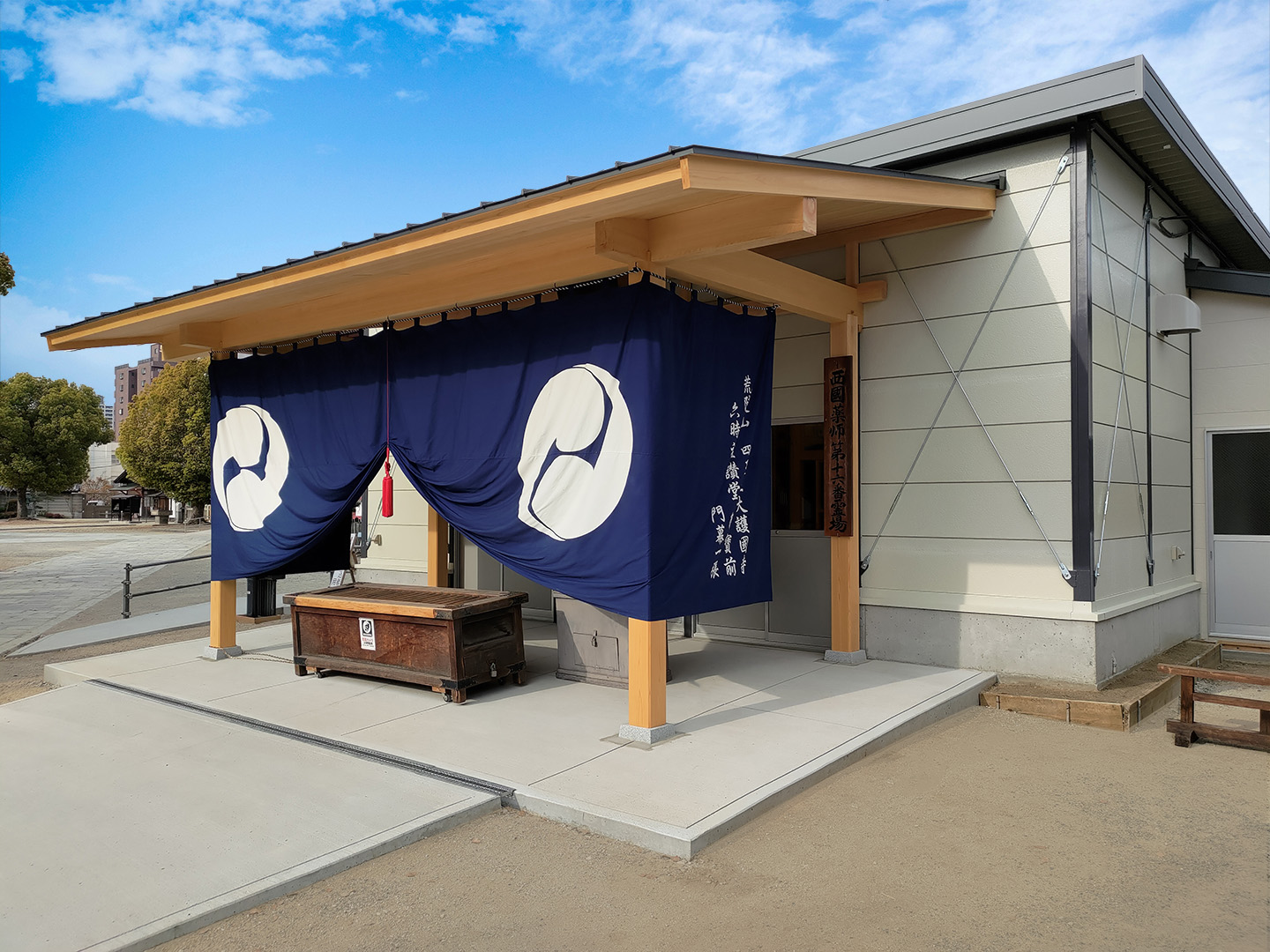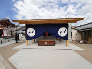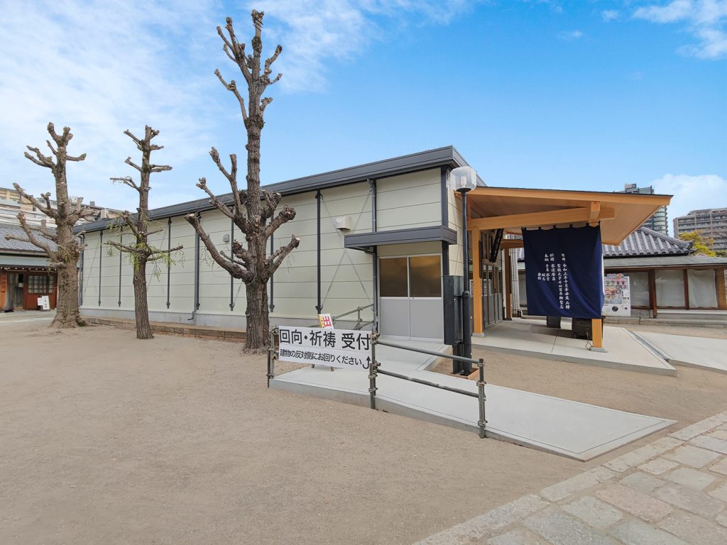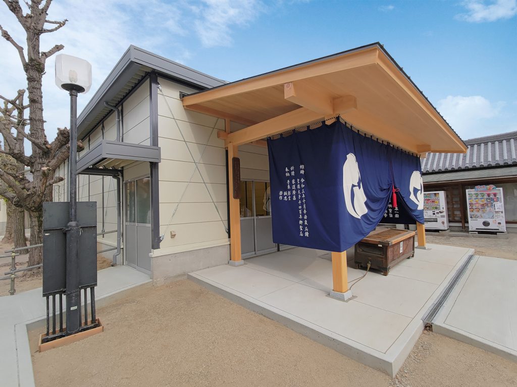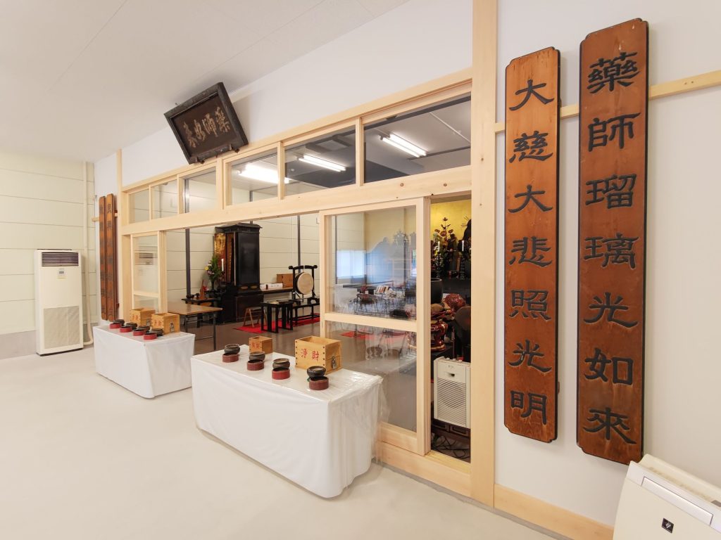 寺院内の本堂を改修期間中に設置しました、仮設の本堂になります。 OLライトシリーズ 「OLライトシリーズ」 オリエントハウスプレハブシリーズの短工期&低コストの汎用モデル。外装・内装を兼ねることが出来る高断熱の壁パネルを使用しています。シリーズ詳細はこちら>more を用いた仮設ハウスと、木造庇のコラボレーションにより、寺社仏閣の外観を再現。室内も本尊が配置されている事により、法要などが行われやすく、50人弱の方が参列出来るように、80㎡程のスペースを確保しております。また、室内の天井高は3.6m確保して圧迫感がないようにし、床は土足入場となるためコンクリート仕上げとしております。