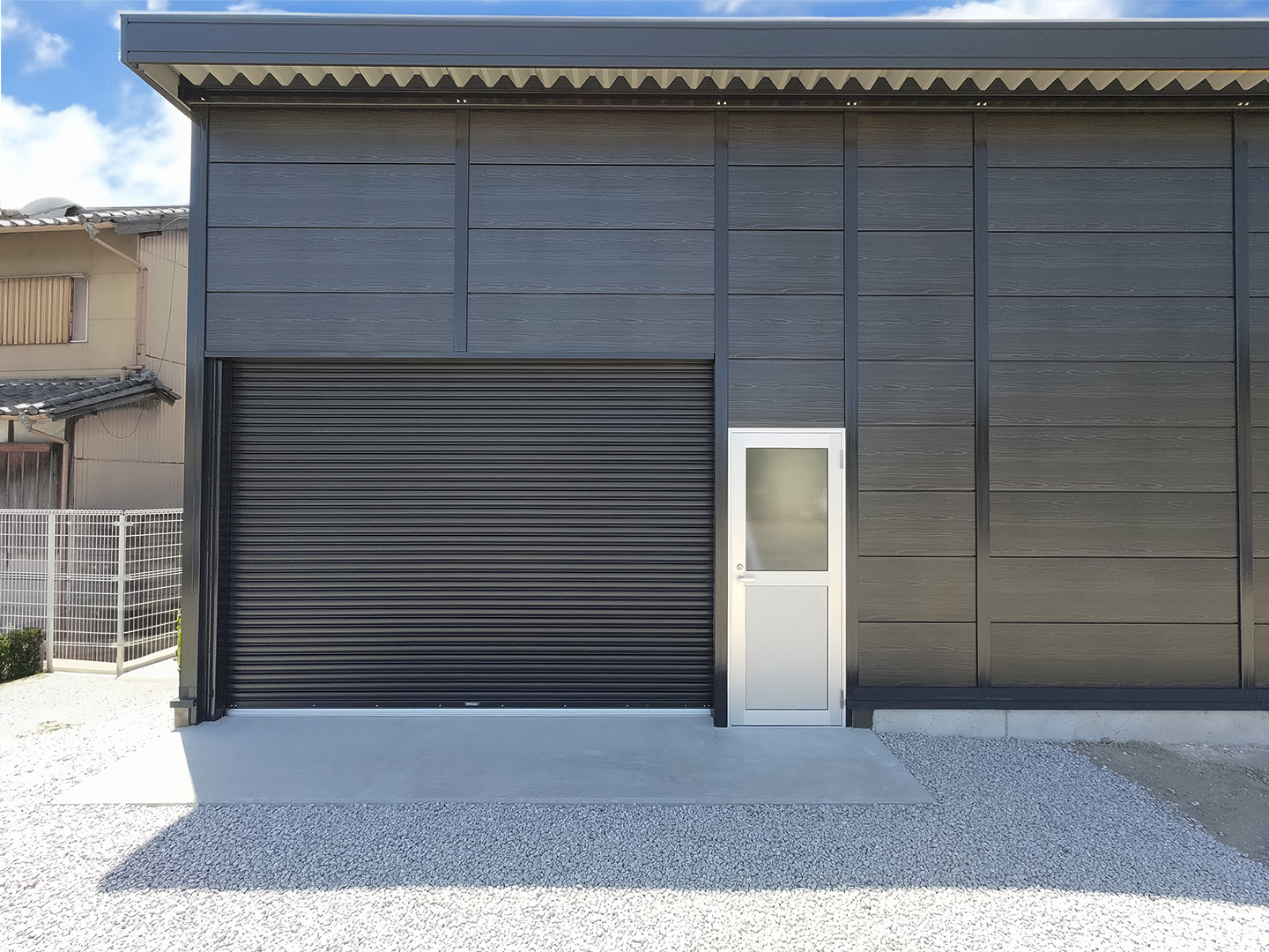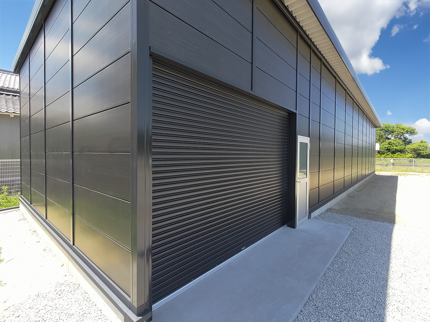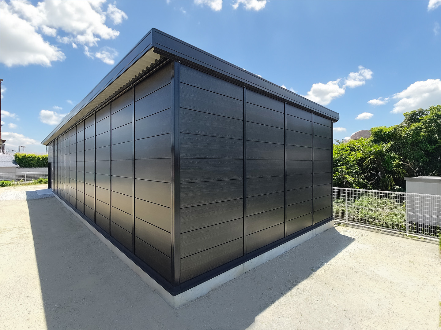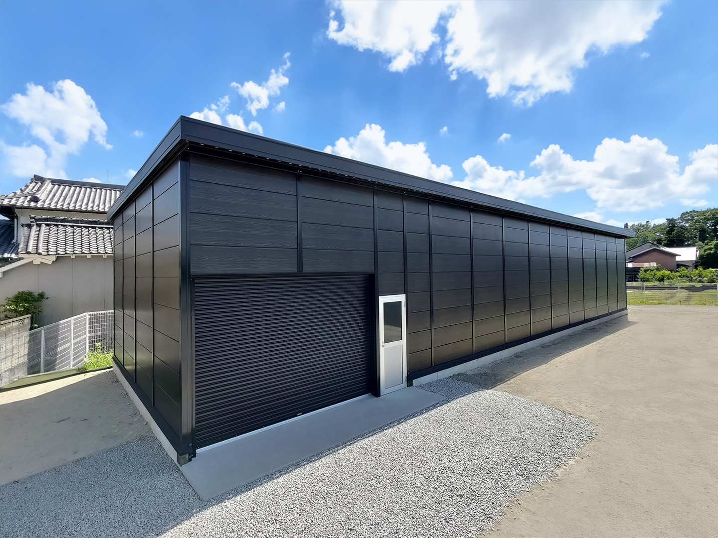 OLライトシリーズ 「OLライトシリーズ」 オリエントハウスプレハブシリーズの短工期&低コストの汎用モデル。外装・内装を兼ねることが出来る高断熱の壁パネルを使用しています。シリーズ詳細はこちら>more にて設計施工した、幅約23.5m奥行7.3mの倉庫になります。様々な物品の保管に対応できるように、との施主様のご希望に沿えるよう、柱を補強することで床から 梁下 「梁下」 梁(はり)の下端から床仕上げ面までの高さを示す寸法。意匠的な天井仕上げの高さ(天井高)とは異なり、構造体としての制限寸法を表す。 梁下:梁の下端まで 天井高:内装仕上げ後の天井面ま...more まで約4mの天井高を確保しました。出入り口には幅3.5m高さ2.5mの軽量電動シャッターを設置し、様々なサイズの物品の搬入にも対応。また、シックな外観をご希望でしたので、外壁には意匠性に優れたブラックの木目調ライトパネルを提案。鼻隠しや柱、雨樋等もブラックで統一し、シャッターも室内側にシャッターボックスを設けることで、全体の外観をよりスッキリさせています。