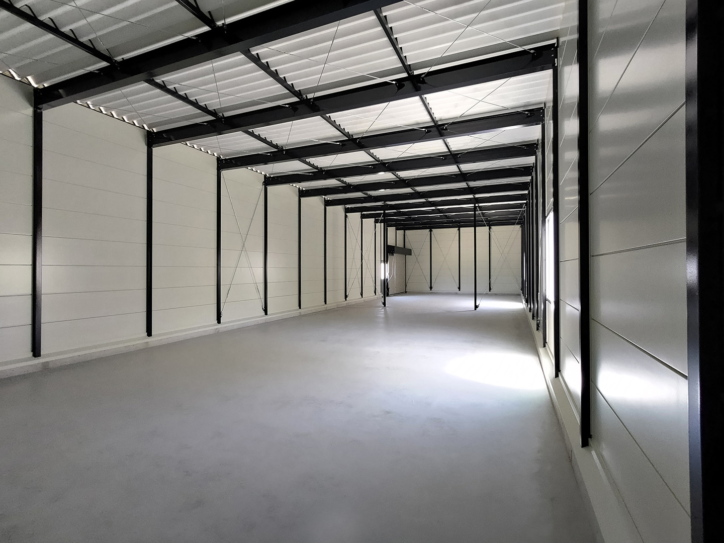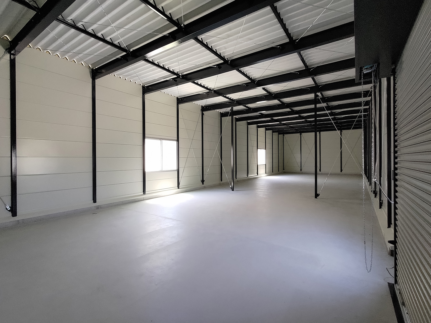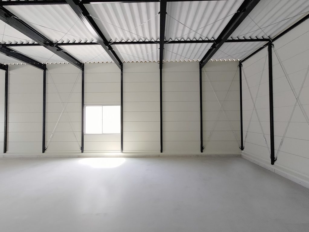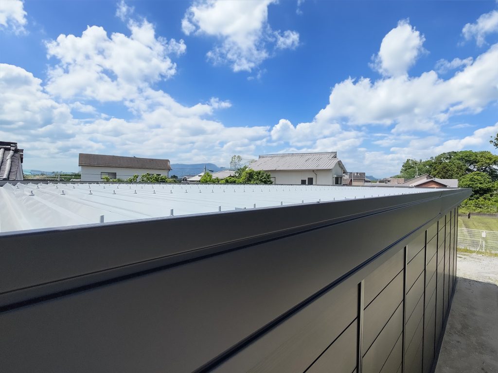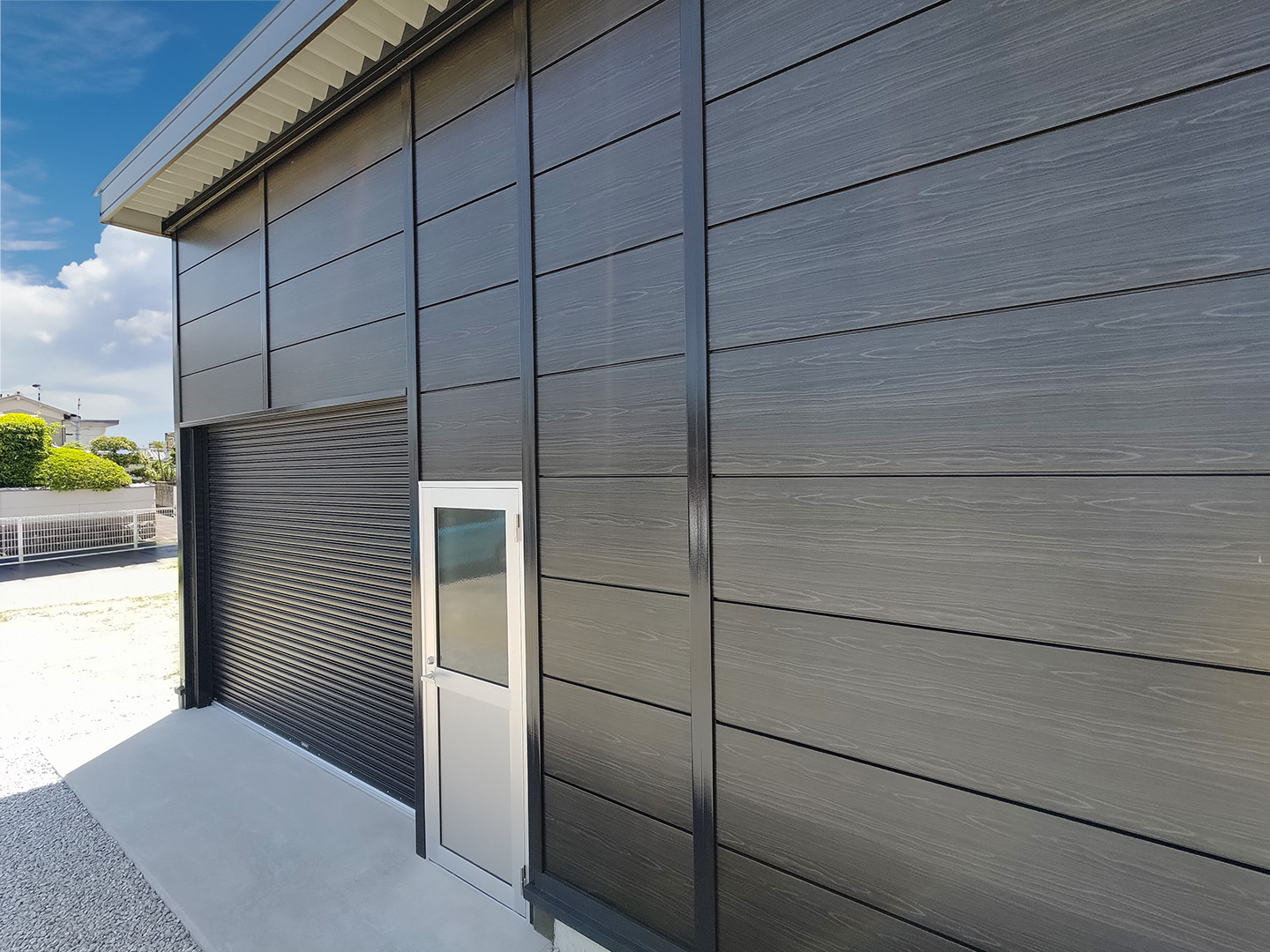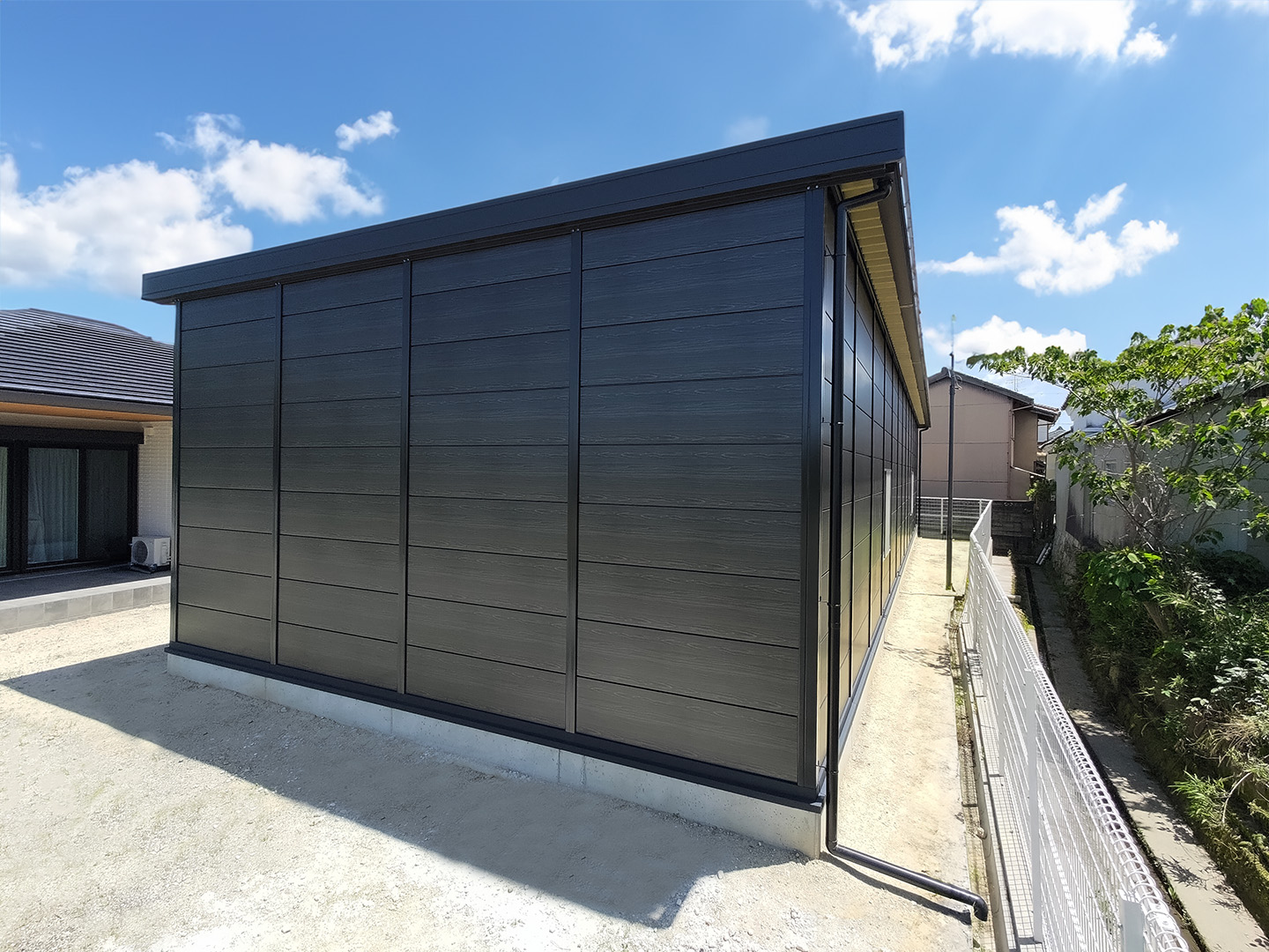 OLライトシリーズ 「OLライトシリーズ」 オリエントハウスプレハブシリーズの短工期&低コストの汎用モデル。外装・内装を兼ねることが出来る高断熱の壁パネルを使用しています。シリーズ詳細はこちら>more にて設計施工した、幅約23.5m奥行7.3mの倉庫になります。様々な物品の保管に対応できるように、との施主様のご希望に沿えるよう、柱を補強することで床から 梁下 「梁下」 梁(はり)の下端から床仕上げ面までの高さを示す寸法。意匠的な天井仕上げの高さ(天井高)とは異なり、構造体としての制限寸法を表す。 梁下:梁の下端まで 天井高:内装仕上げ後の天井面ま...more まで約4mの天井高を確保しました。出入り口には幅3.5m高さ2.5mの軽量電動シャッターを設置し、様々なサイズの物品の搬入にも対応。また、シックな外観をご希望でしたので、外壁には意匠性に優れたブラックの木目調ライトパネルを提案。鼻隠しや柱、雨樋等もブラックで統一し、シャッターも室内側にシャッターボックスを設けることで、全体の外観をよりスッキリさせています。