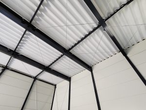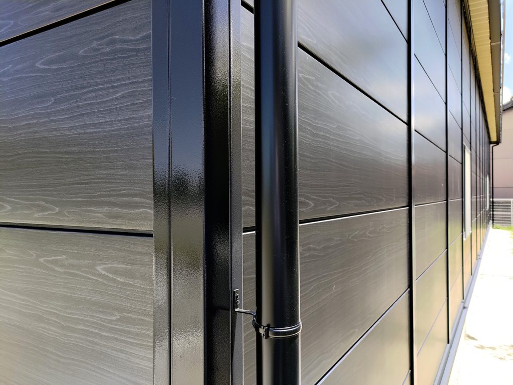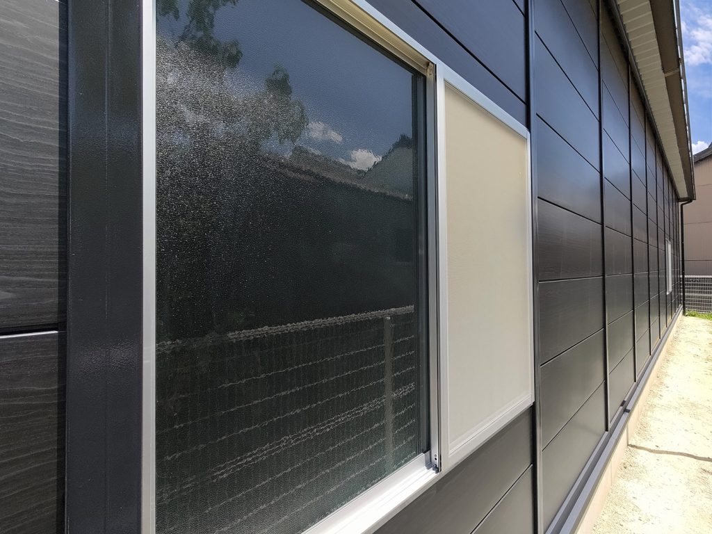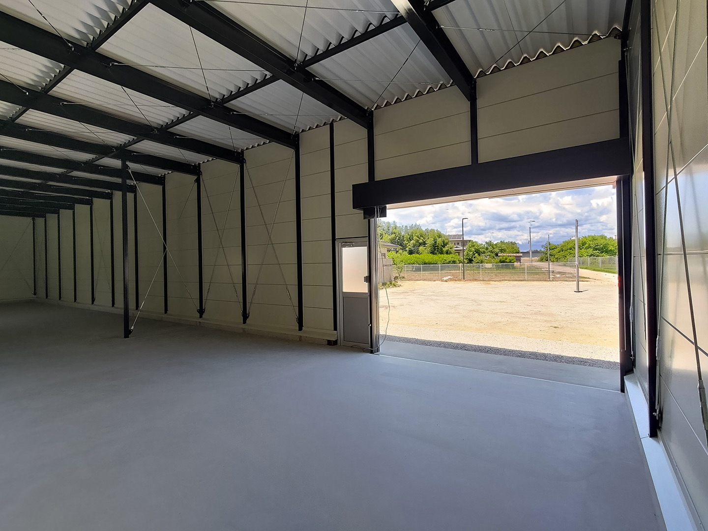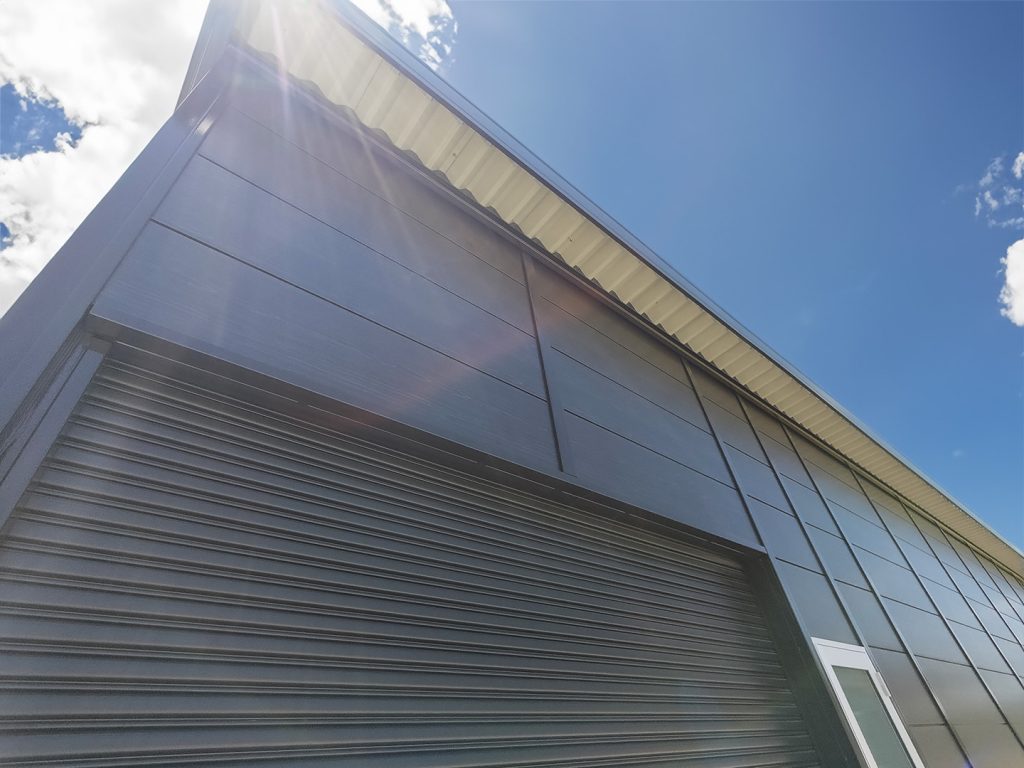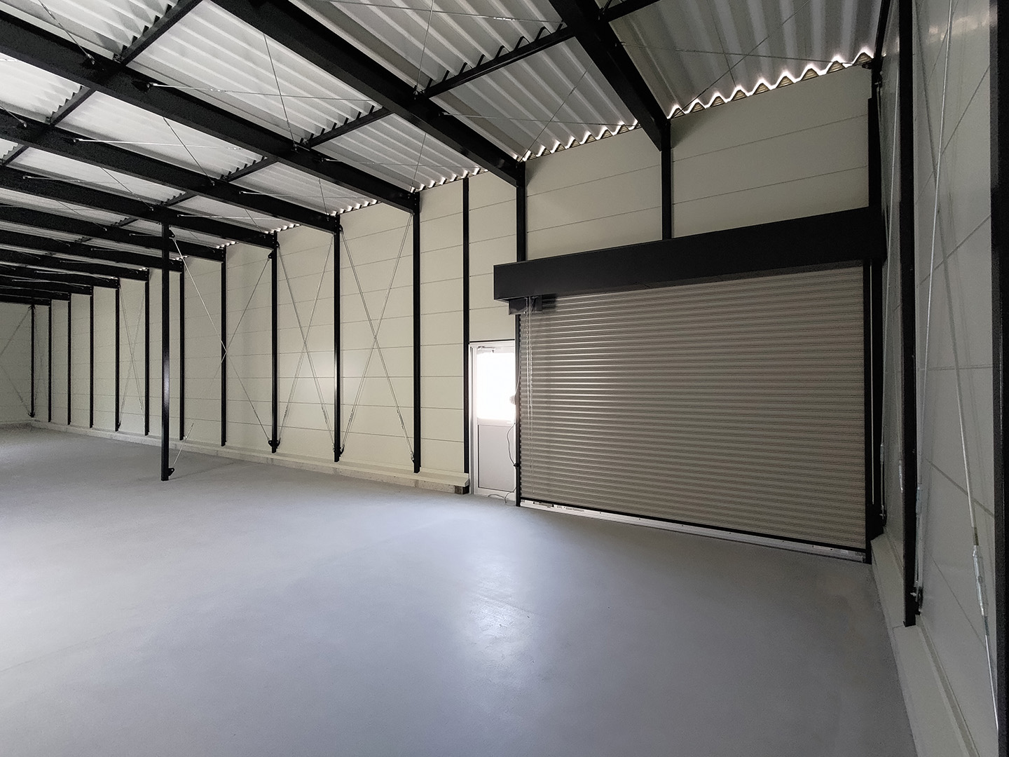 OLライトシリーズ 「OLライトシリーズ」 オリエントハウスプレハブシリーズの短工期&低コストの汎用モデル。外装・内装を兼ねることが出来る高断熱の壁パネルを使用しています。シリーズ詳細はこちら>more にて設計施工した、幅約23.5m奥行7.3mの倉庫になります。様々な物品の保管に対応できるように、との施主様のご希望に沿えるよう、柱を補強することで床から 梁下 「梁下」 梁(はり)の下端から床仕上げ面までの高さを示す寸法。意匠的な天井仕上げの高さ(天井高)とは異なり、構造体としての制限寸法を表す。 梁下:梁の下端まで 天井高:内装仕上げ後の天井面ま...more まで約4mの天井高を確保しました。出入り口には幅3.5m高さ2.5mの軽量電動シャッターを設置し、様々なサイズの物品の搬入にも対応。また、シックな外観をご希望でしたので、外壁には意匠性に優れたブラックの木目調ライトパネルを提案。鼻隠しや柱、雨樋等もブラックで統一し、シャッターも室内側にシャッターボックスを設けることで、全体の外観をよりスッキリさせています。