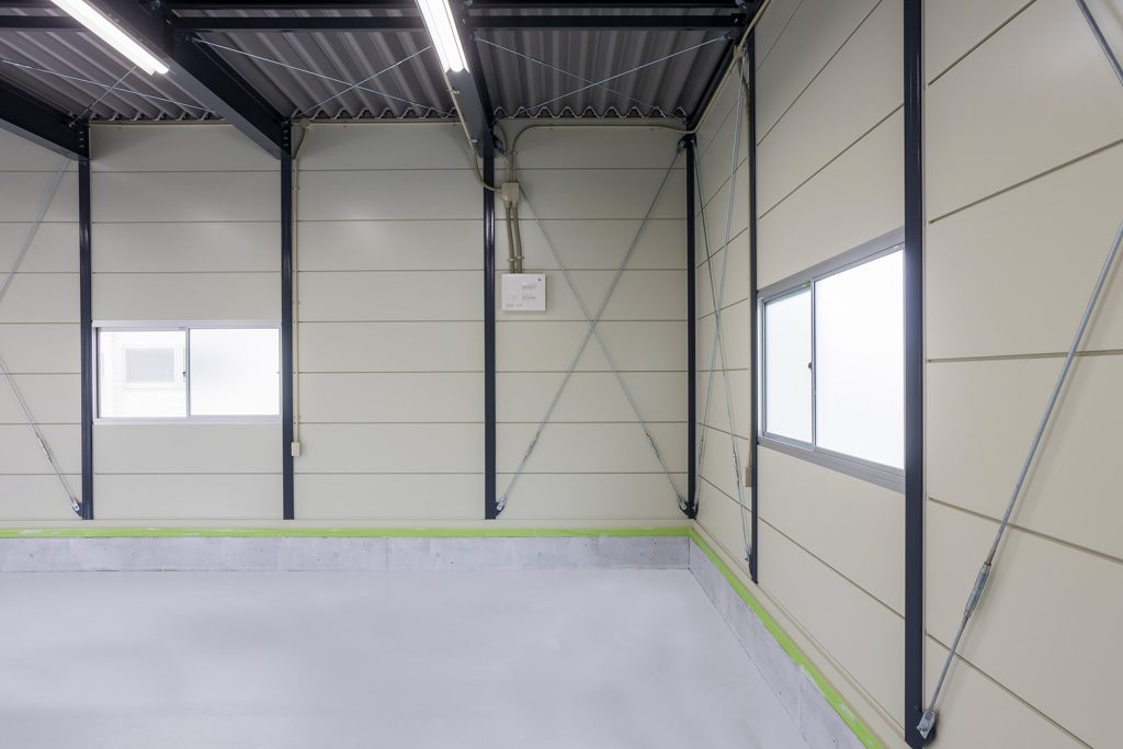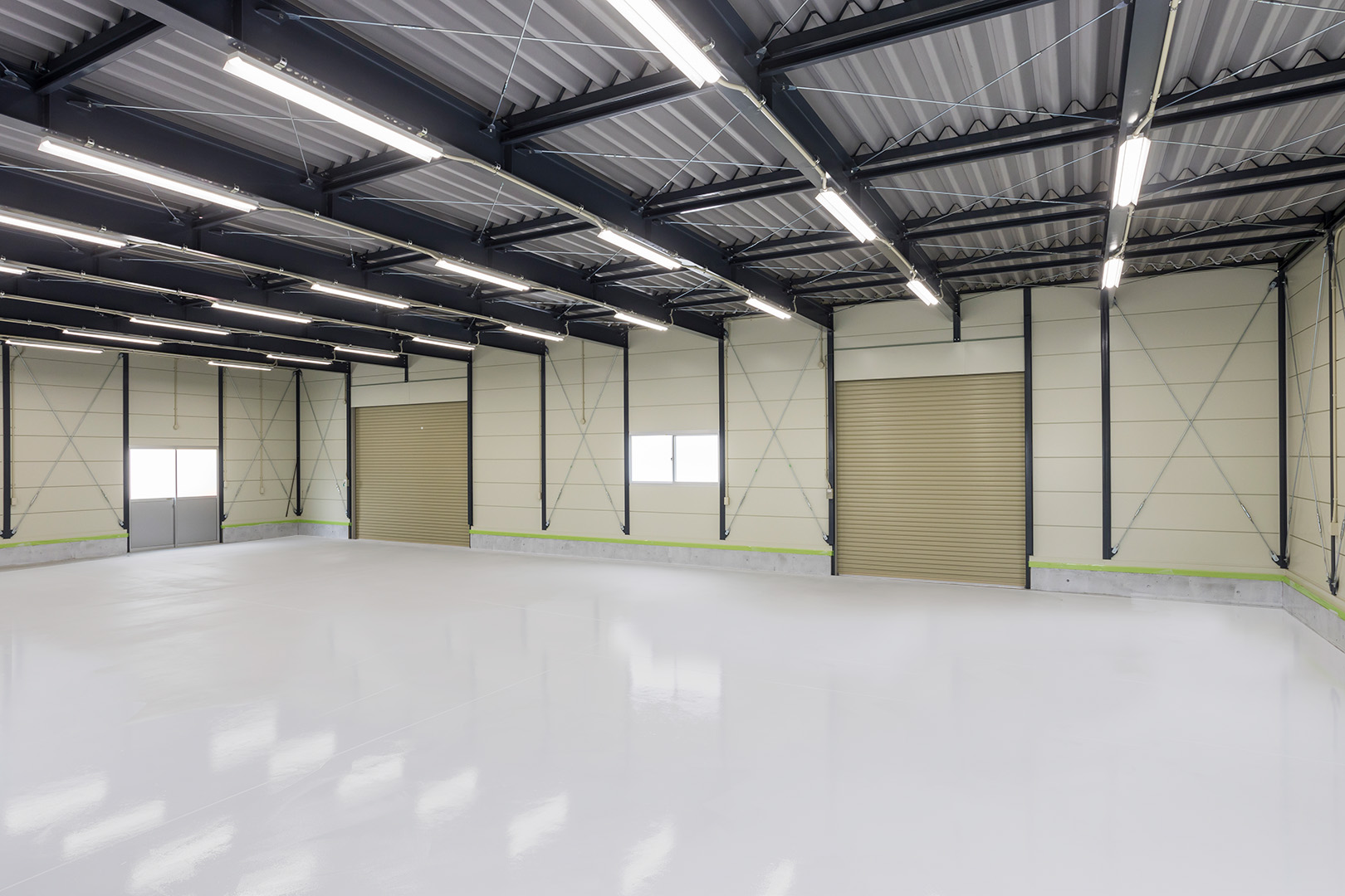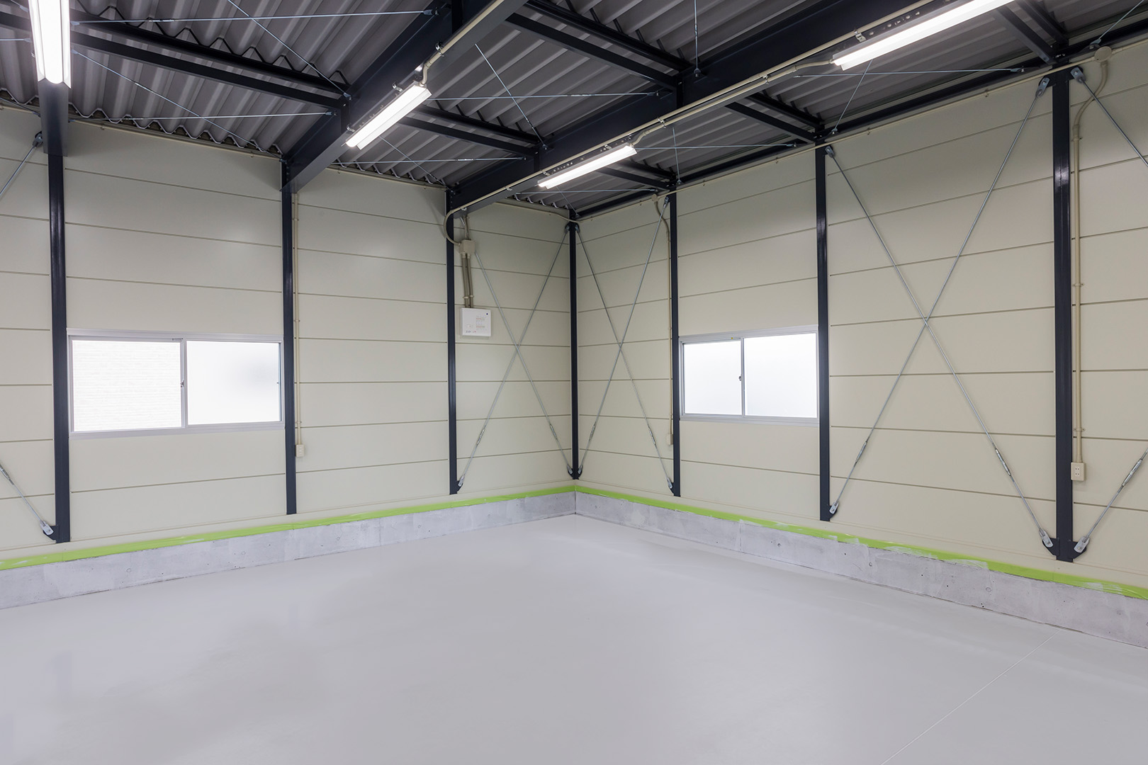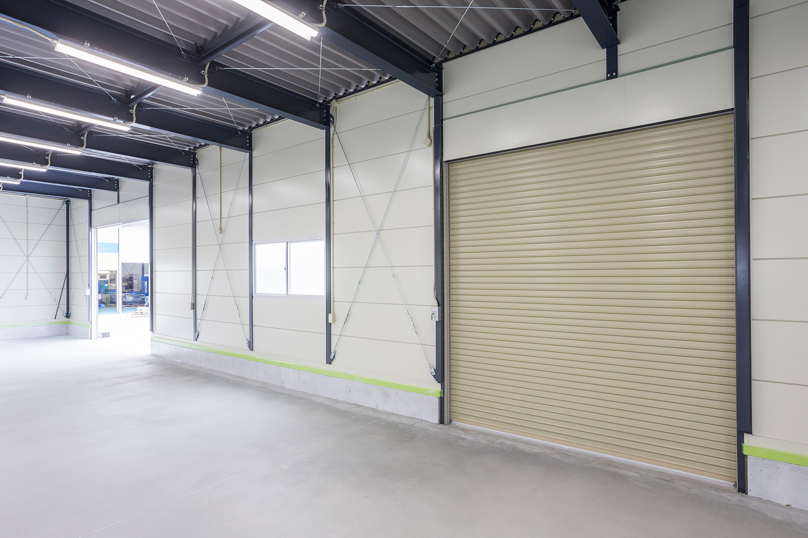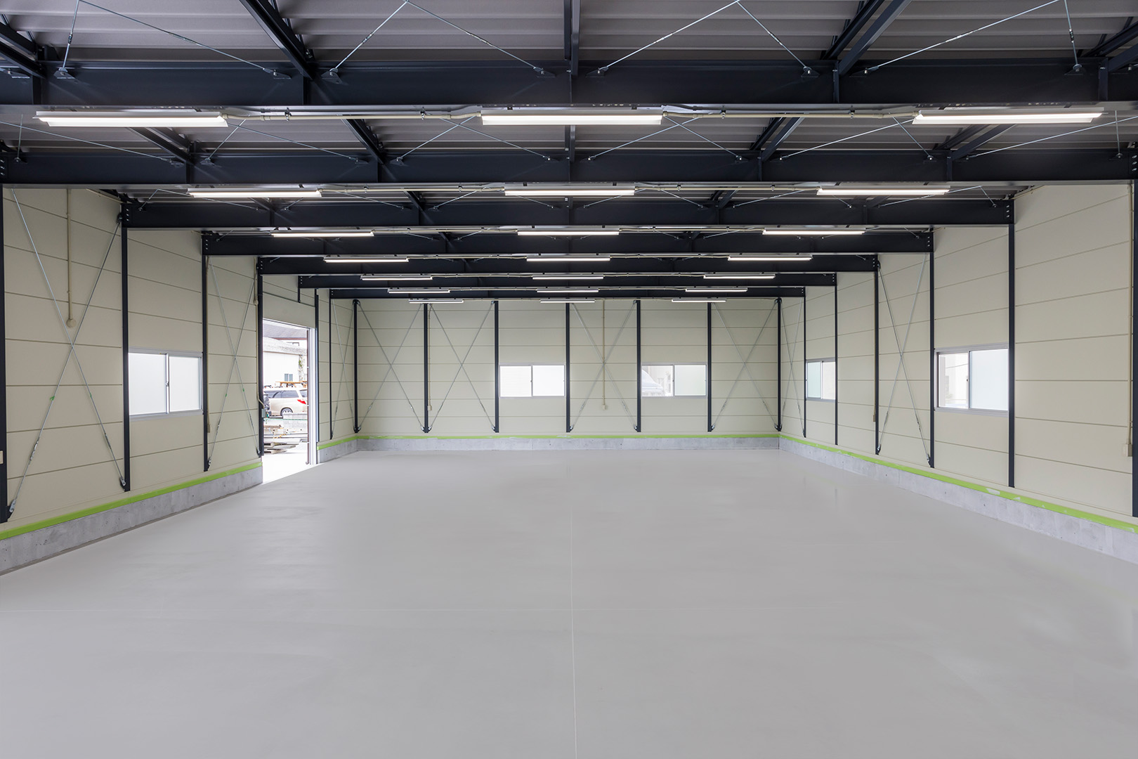 倉庫として作業性に重点を置いた OLライトシリーズ 「OLライトシリーズ」 オリエントハウスプレハブシリーズの短工期&低コストの汎用モデル。外装・内装を兼ねることが出来る高断熱の壁パネルを使用しています。シリーズ詳細はこちら>more の建物です。軒高を4.1m、室内を11m × 18m(198㎡)とし、 梁下 「梁下」 梁(はり)の下端から床仕上げ面までの高さを示す寸法。意匠的な天井仕上げの高さ(天井高)とは異なり、構造体としての制限寸法を表す。 梁下:梁の下端まで 天井高:内装仕上げ後の天井面ま...more 高は3.6mの広々とした室内。入り口には幅3.5m x 高さ2.9m、および幅2.6m x 高さ2.9mのシャッターを2ヶ所設置。共に利便性の高い軽量型電動シャッターにて、フォークリフトでの製品の搬入搬出、および作業性に配慮しています。室内の壁材は、1枚で外壁・内壁を兼ねかつ断熱性の高いサンドイッチパネルを採用。アイボリー色で、倉庫内作業に重要な照度の向上に寄与しています。