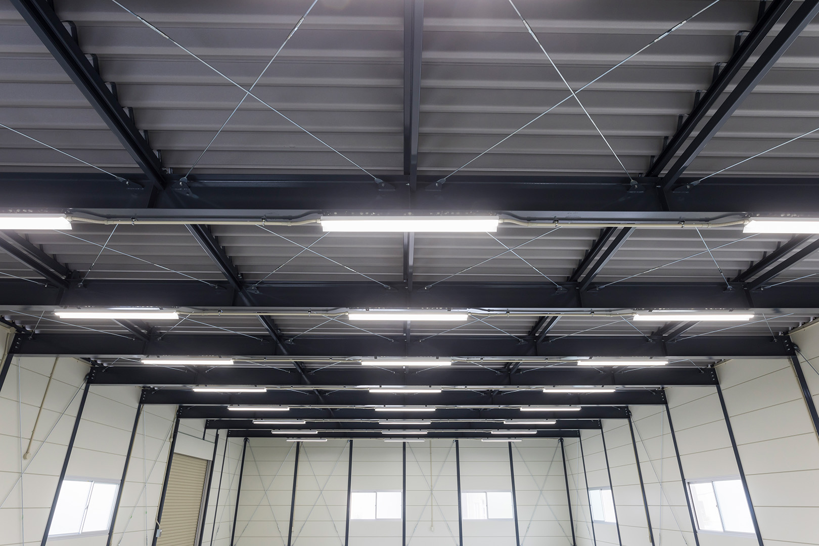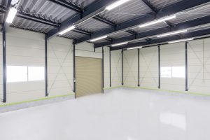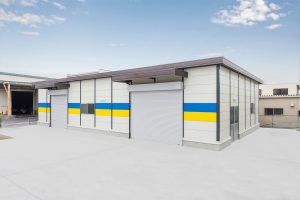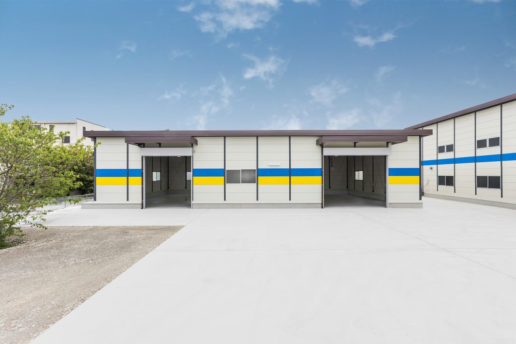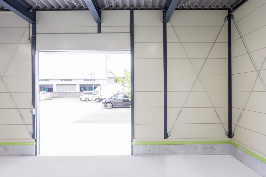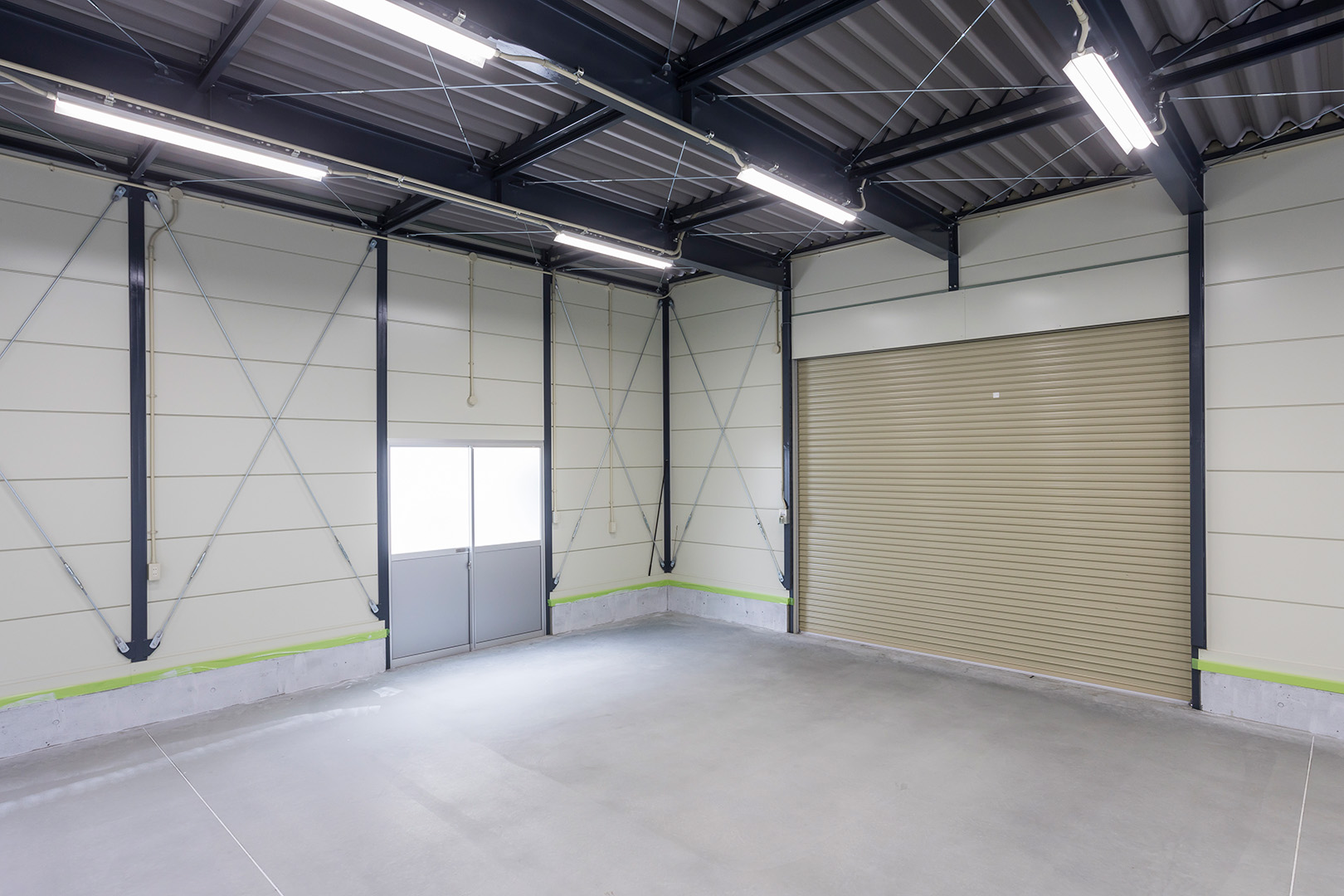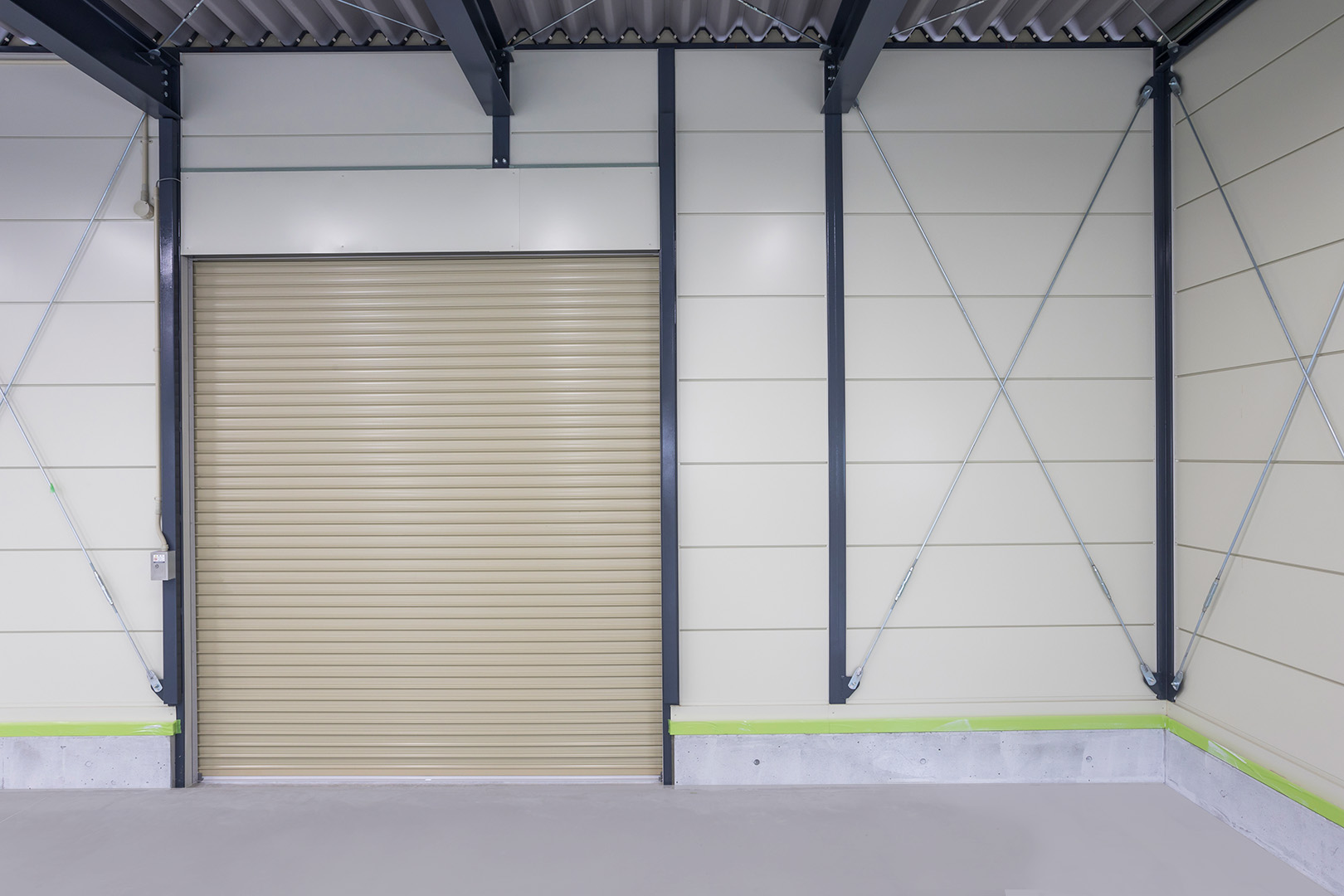 倉庫として作業性に重点を置いた OLライトシリーズ 「OLライトシリーズ」 オリエントハウスプレハブシリーズの短工期&低コストの汎用モデル。外装・内装を兼ねることが出来る高断熱の壁パネルを使用しています。シリーズ詳細はこちら>more の建物です。軒高を4.1m、室内を11m × 18m(198㎡)とし、 梁下 「梁下」 梁(はり)の下端から床仕上げ面までの高さを示す寸法。意匠的な天井仕上げの高さ(天井高)とは異なり、構造体としての制限寸法を表す。 梁下:梁の下端まで 天井高:内装仕上げ後の天井面ま...more 高は3.6mの広々とした室内。入り口には幅3.5m x 高さ2.9m、および幅2.6m x 高さ2.9mのシャッターを2ヶ所設置。共に利便性の高い軽量型電動シャッターにて、フォークリフトでの製品の搬入搬出、および作業性に配慮しています。室内の壁材は、1枚で外壁・内壁を兼ねかつ断熱性の高いサンドイッチパネルを採用。アイボリー色で、倉庫内作業に重要な照度の向上に寄与しています。