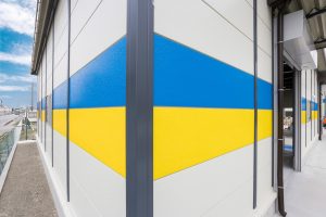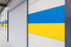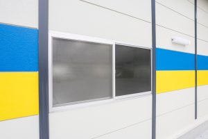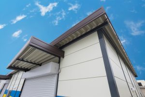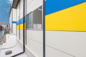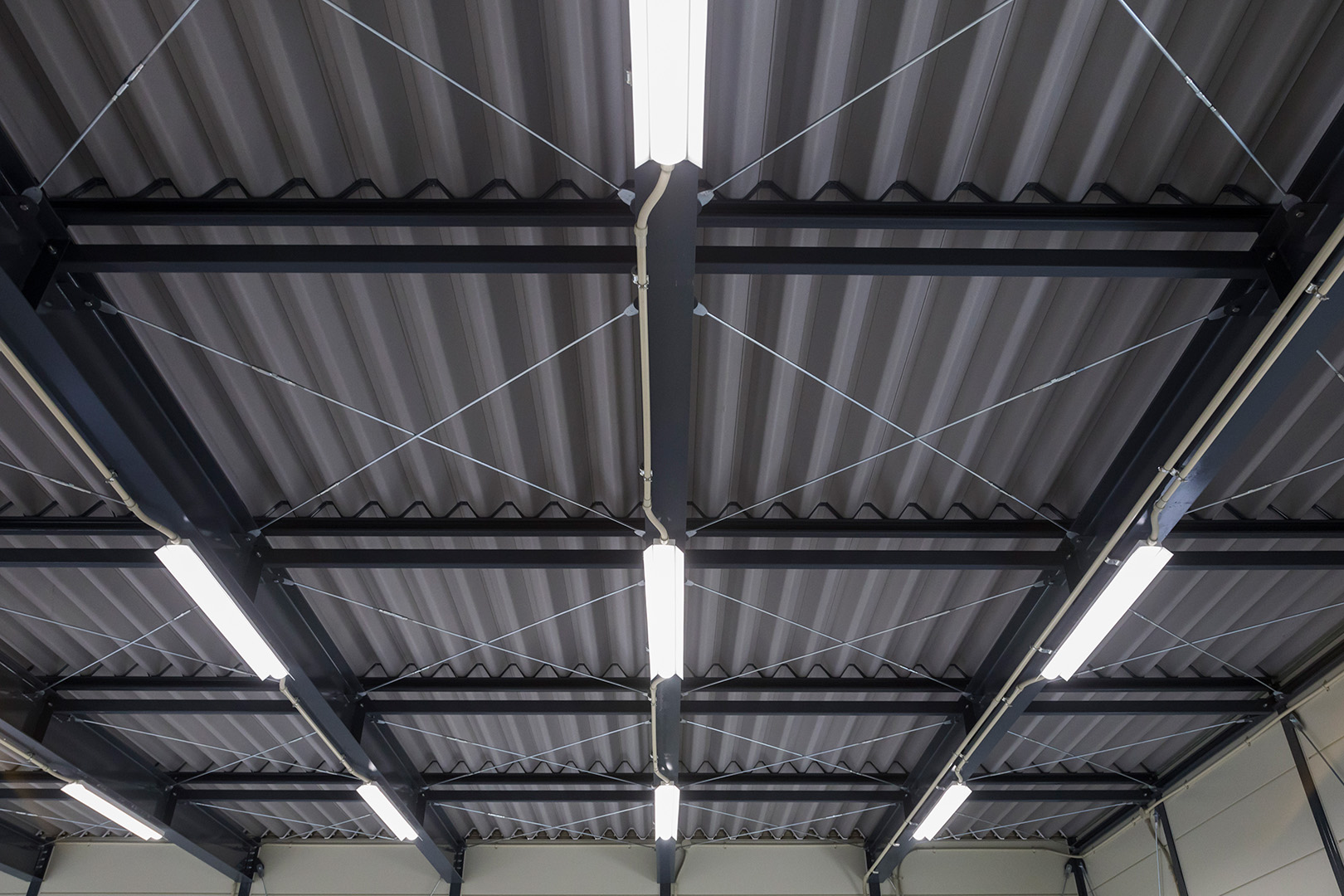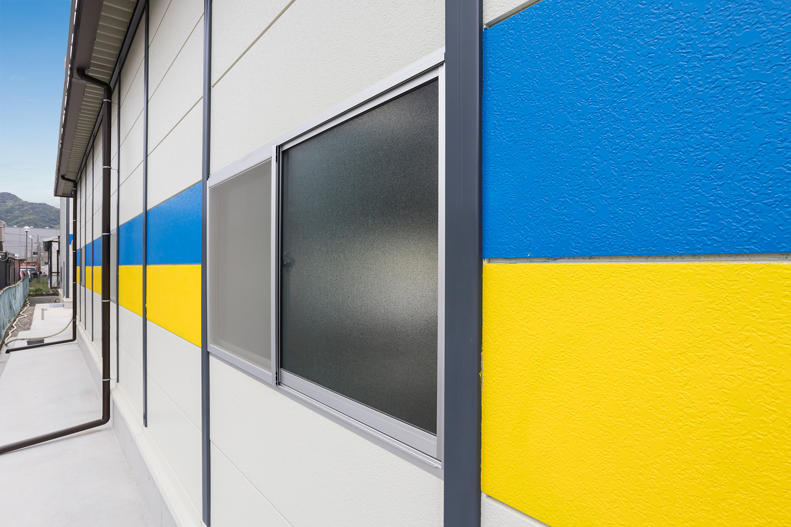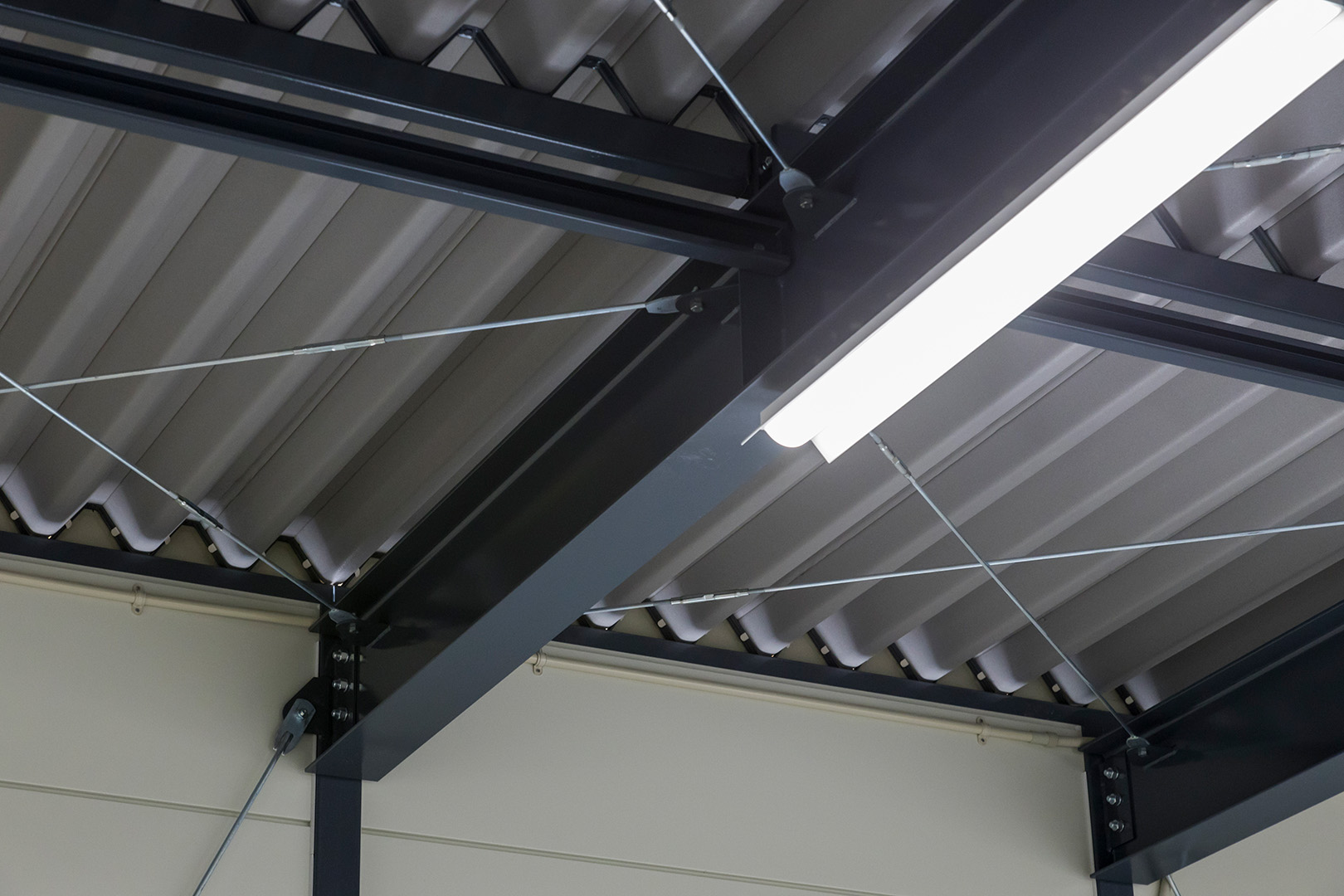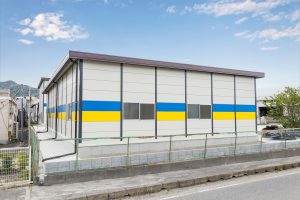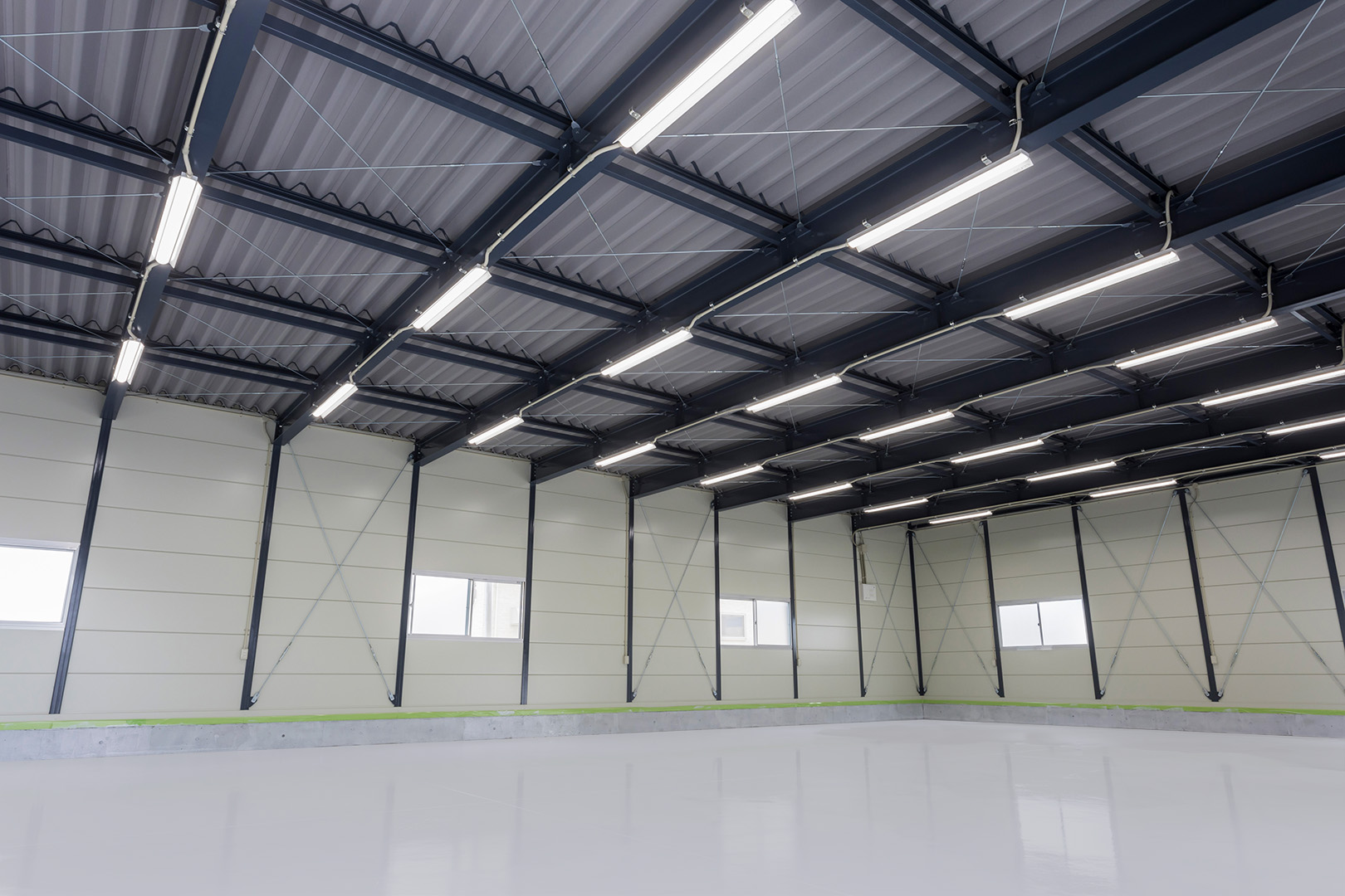 倉庫として作業性に重点を置いた OLライトシリーズ 「OLライトシリーズ」 オリエントハウスプレハブシリーズの短工期&低コストの汎用モデル。外装・内装を兼ねることが出来る高断熱の壁パネルを使用しています。シリーズ詳細はこちら>more の建物です。軒高を4.1m、室内を11m × 18m(198㎡)とし、 梁下 「梁下」 梁(はり)の下端から床仕上げ面までの高さを示す寸法。意匠的な天井仕上げの高さ(天井高)とは異なり、構造体としての制限寸法を表す。 梁下:梁の下端まで 天井高:内装仕上げ後の天井面ま...more 高は3.6mの広々とした室内。入り口には幅3.5m x 高さ2.9m、および幅2.6m x 高さ2.9mのシャッターを2ヶ所設置。共に利便性の高い軽量型電動シャッターにて、フォークリフトでの製品の搬入搬出、および作業性に配慮しています。室内の壁材は、1枚で外壁・内壁を兼ねかつ断熱性の高いサンドイッチパネルを採用。アイボリー色で、倉庫内作業に重要な照度の向上に寄与しています。