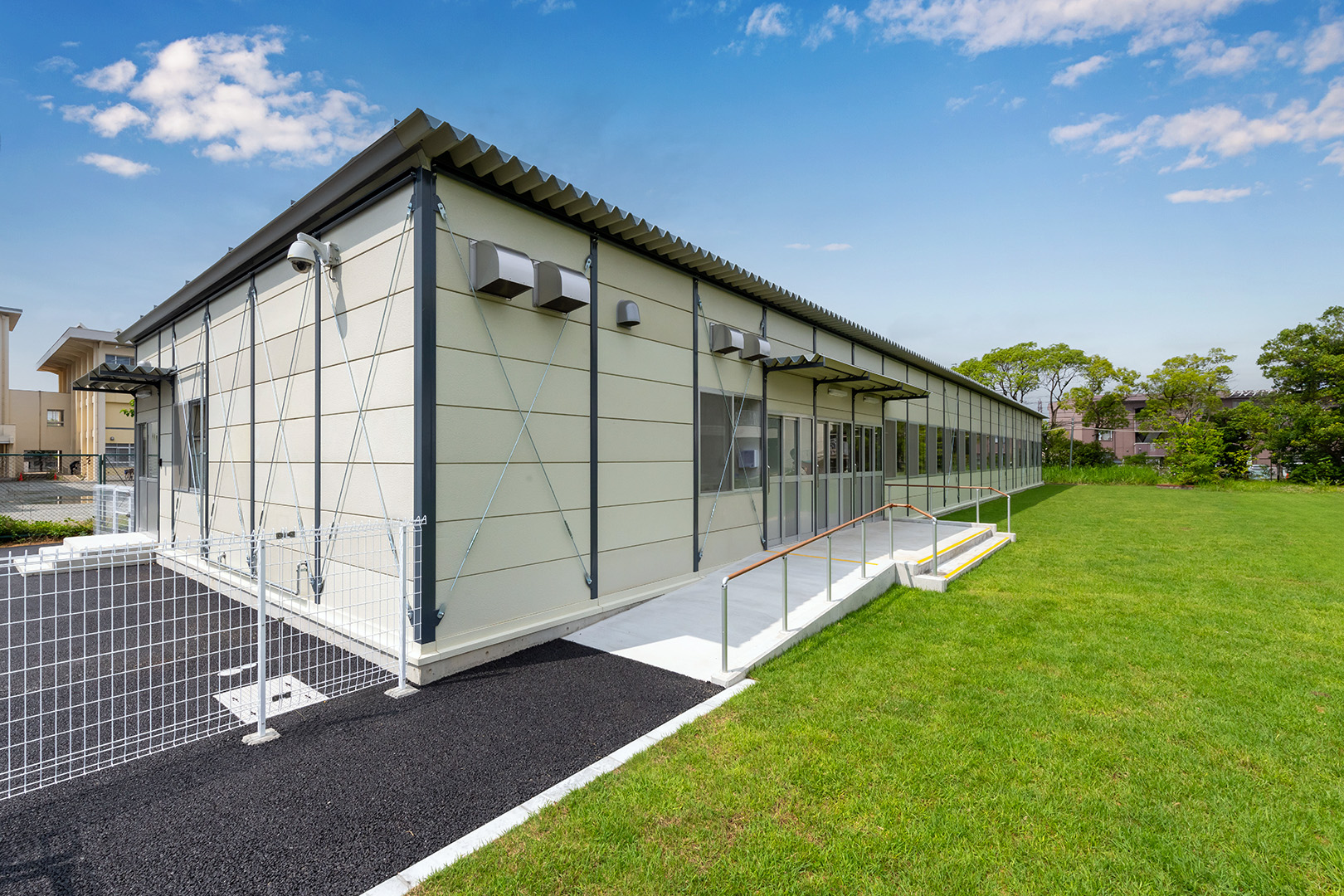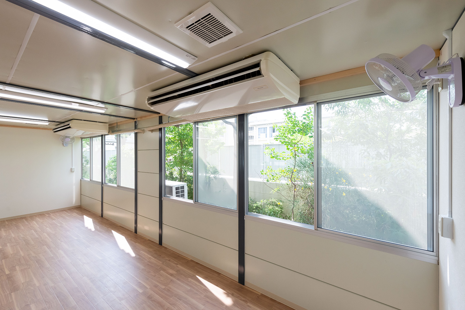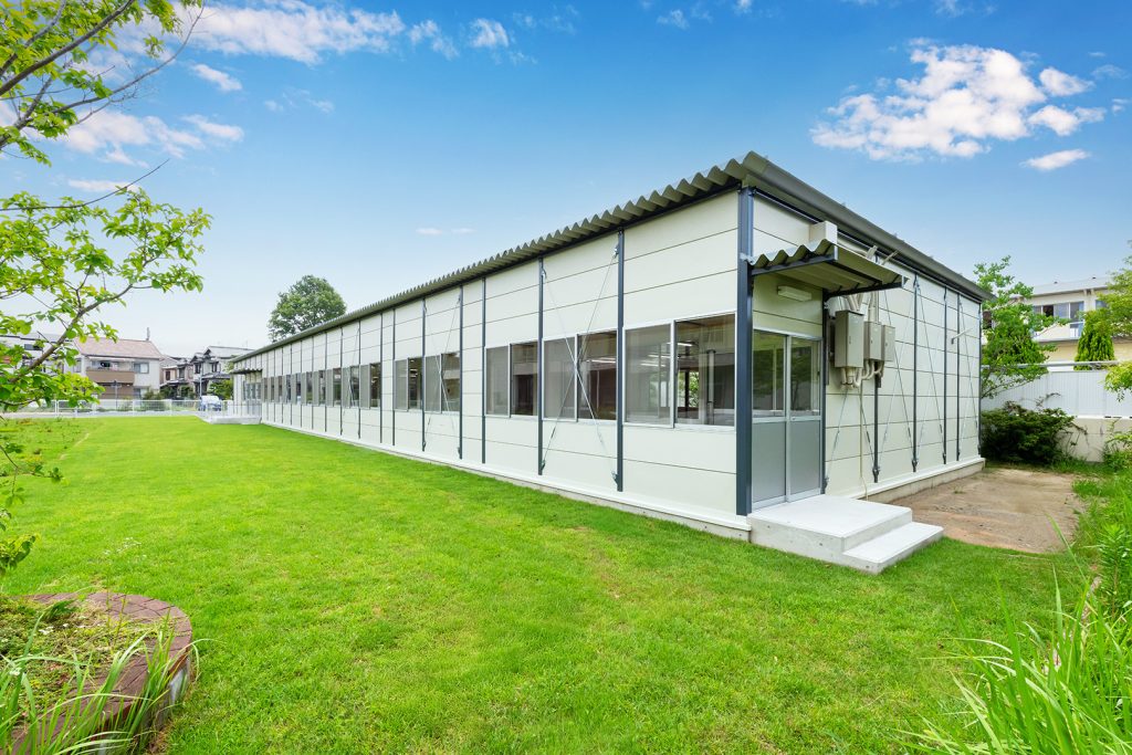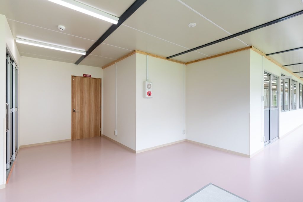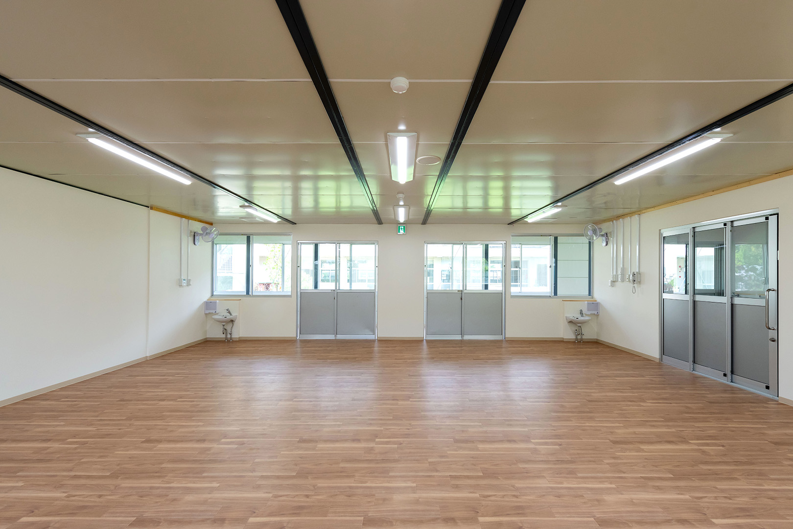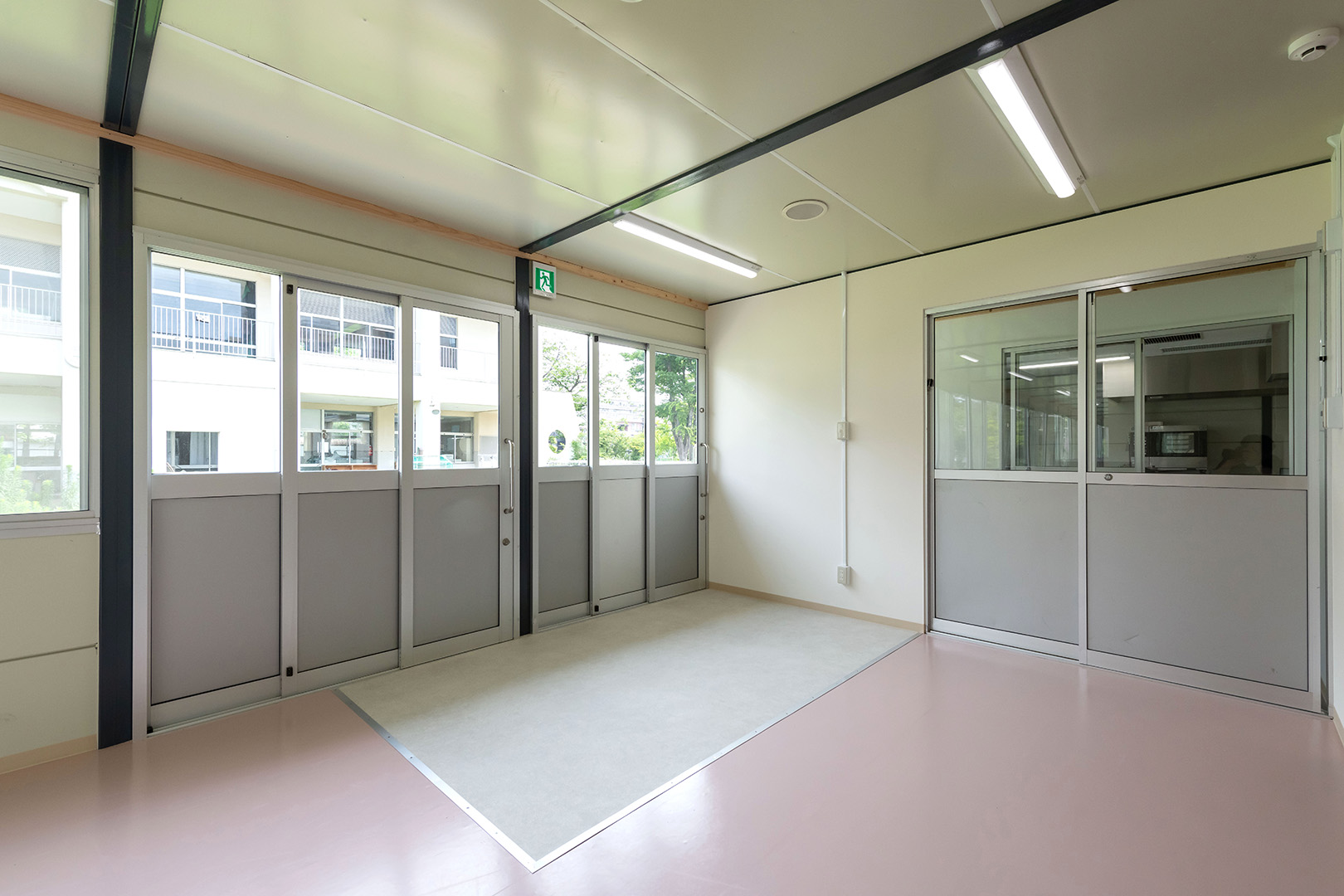 OLライトシリーズ 「OLライトシリーズ」 オリエントハウスプレハブシリーズの短工期&低コストの汎用モデル。外装・内装を兼ねることが出来る高断熱の壁パネルを使用しています。シリーズ詳細はこちら>more で施工した仮設の保育園舎です。設計事務所様のプランをベースに、保育室2室、調乳室、幼児用トイレ、調理室、食品庫、配膳台、更衣・休憩室を配置。利用対象が0〜2歳児であることから、壁・床・建具などの角を丸める処理を施し、子どもの手の届く範囲の安全性に細心の注意を払いました。各室の出入口には指詰め防止用の戸当たりを設置し、万が一幼児がサッシ枠に触れていても指を挟まないよう、安全性を重視した施工としています。床材には、転倒時の衝撃をやわらげるクッションフロアを採用しました。また、トイレには幼児用シャワーパンを設置し、着替えや洗浄が必要な場面に対応できるよう配慮しています。短期間のみ使用する仮設園舎ですが、園児や保育士の皆様が安心して過ごせるような環境を整えました。