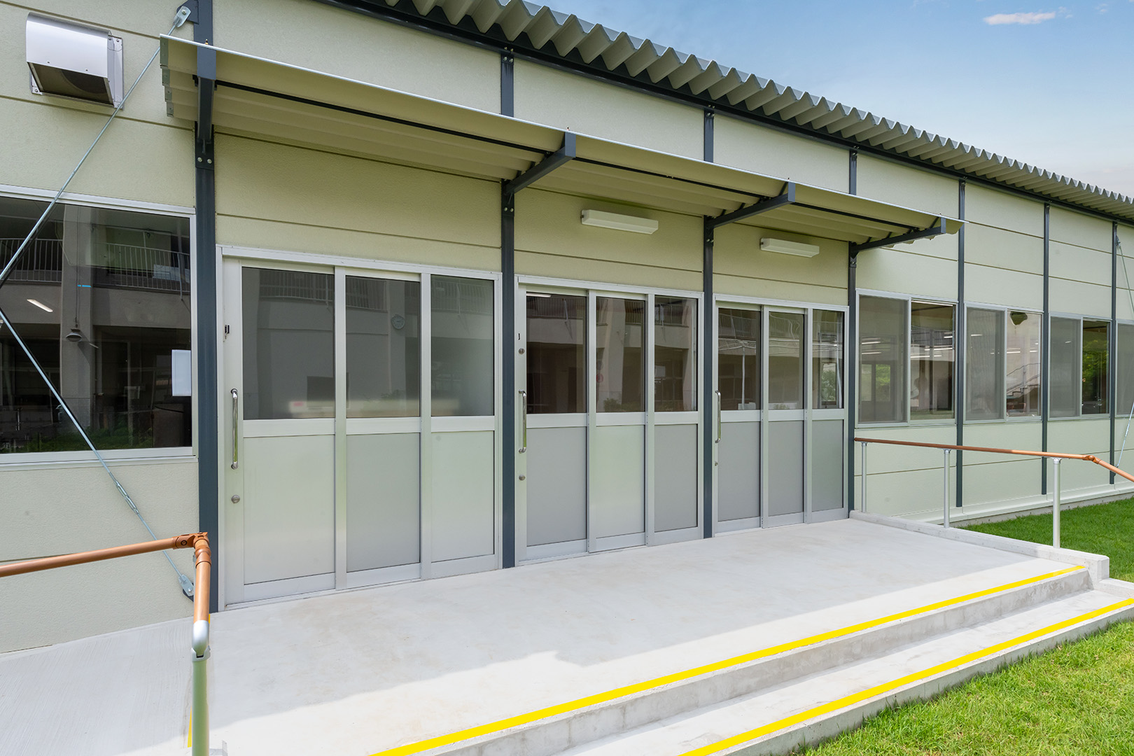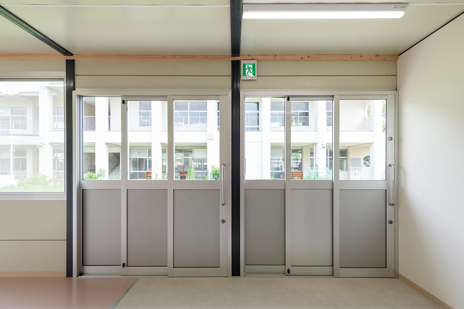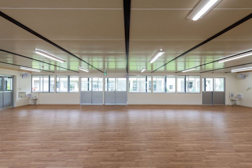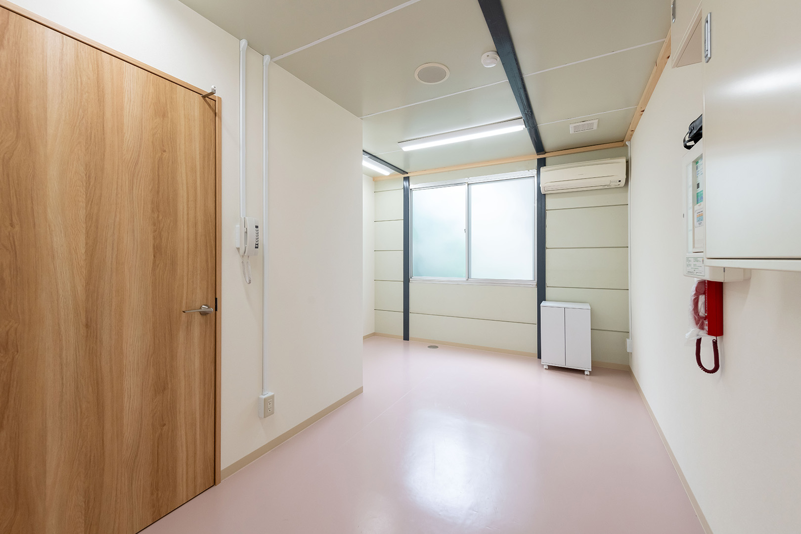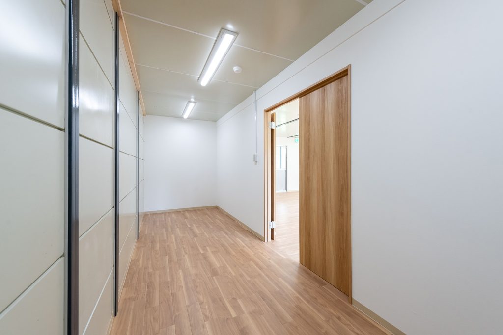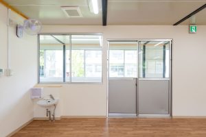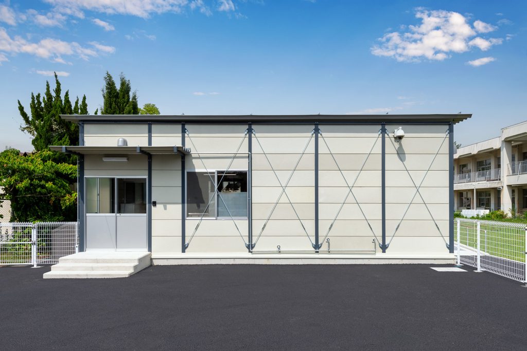 OLライトシリーズ 「OLライトシリーズ」 オリエントハウスプレハブシリーズの短工期&低コストの汎用モデル。外装・内装を兼ねることが出来る高断熱の壁パネルを使用しています。シリーズ詳細はこちら>more で施工した仮設の保育園舎です。設計事務所様のプランをベースに、保育室2室、調乳室、幼児用トイレ、調理室、食品庫、配膳台、更衣・休憩室を配置。利用対象が0〜2歳児であることから、壁・床・建具などの角を丸める処理を施し、子どもの手の届く範囲の安全性に細心の注意を払いました。各室の出入口には指詰め防止用の戸当たりを設置し、万が一幼児がサッシ枠に触れていても指を挟まないよう、安全性を重視した施工としています。床材には、転倒時の衝撃をやわらげるクッションフロアを採用しました。また、トイレには幼児用シャワーパンを設置し、着替えや洗浄が必要な場面に対応できるよう配慮しています。短期間のみ使用する仮設園舎ですが、園児や保育士の皆様が安心して過ごせるような環境を整えました。