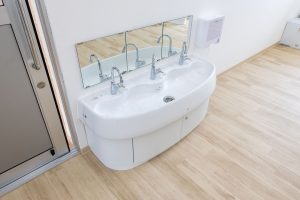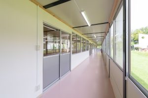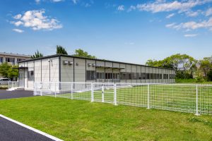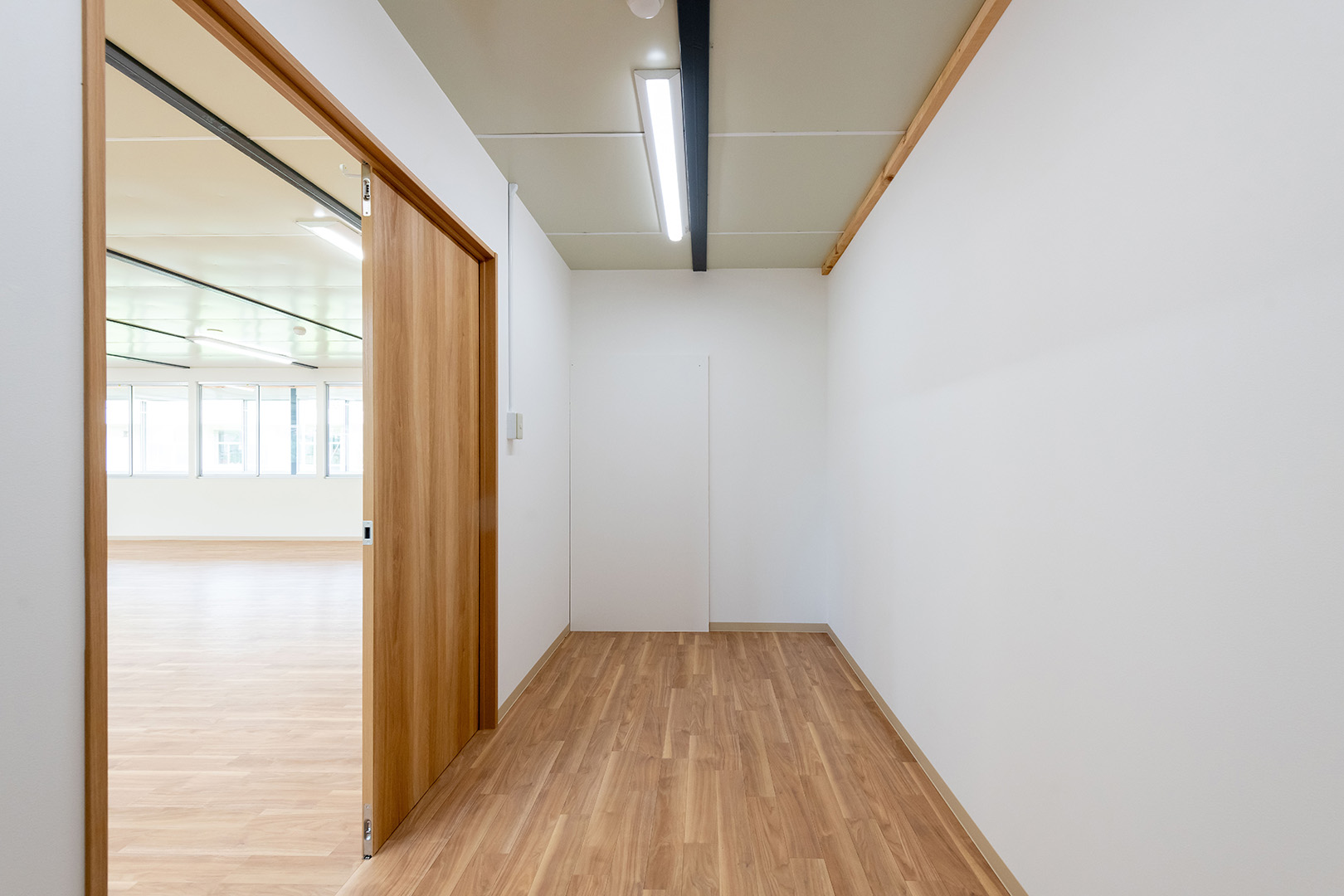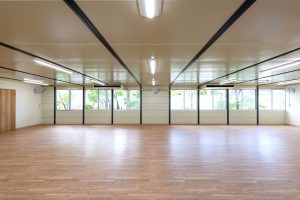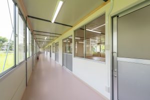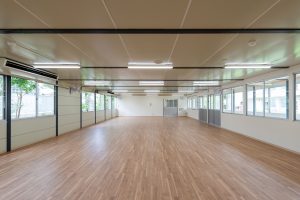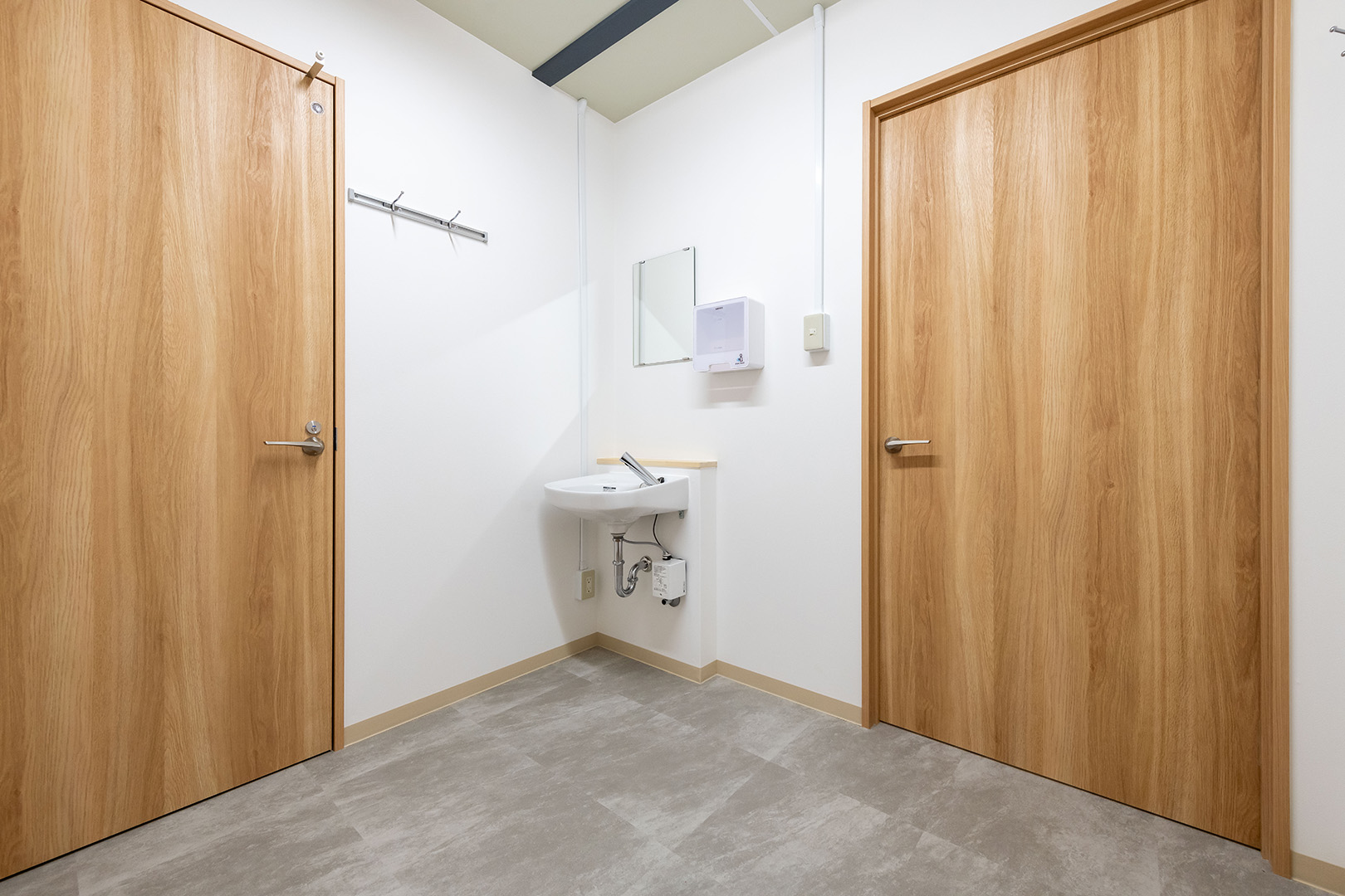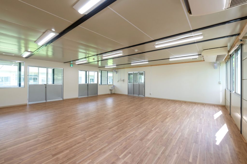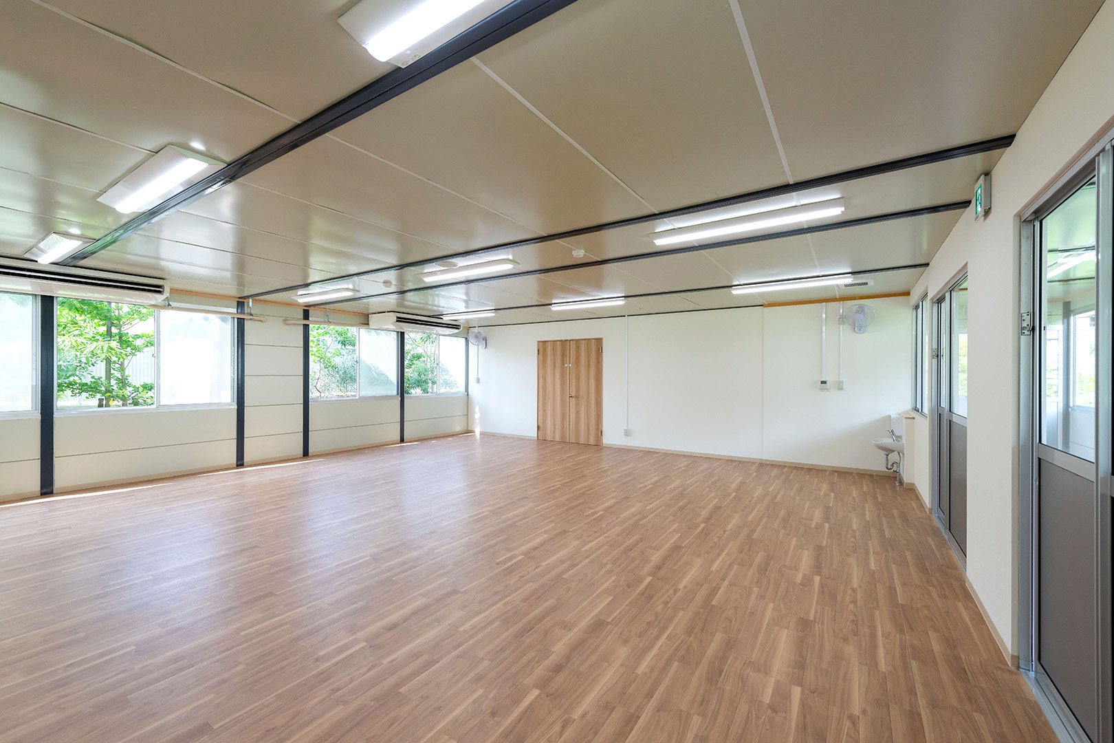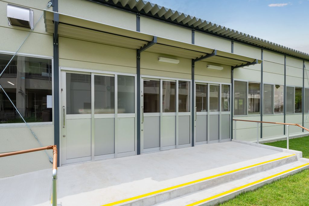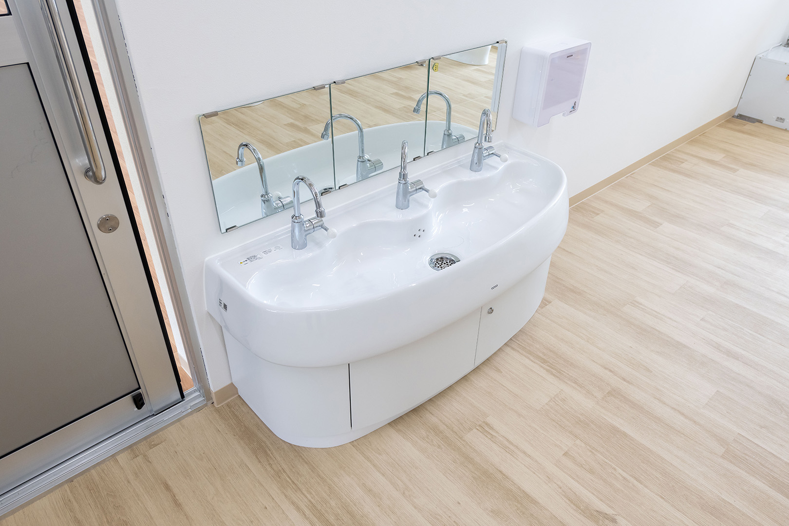 OLライトシリーズ 「OLライトシリーズ」 オリエントハウスプレハブシリーズの短工期&低コストの汎用モデル。外装・内装を兼ねることが出来る高断熱の壁パネルを使用しています。シリーズ詳細はこちら>more で施工した仮設の保育園舎です。設計事務所様のプランをベースに、保育室2室、調乳室、幼児用トイレ、調理室、食品庫、配膳台、更衣・休憩室を配置。利用対象が0〜2歳児であることから、壁・床・建具などの角を丸める処理を施し、子どもの手の届く範囲の安全性に細心の注意を払いました。各室の出入口には指詰め防止用の戸当たりを設置し、万が一幼児がサッシ枠に触れていても指を挟まないよう、安全性を重視した施工としています。床材には、転倒時の衝撃をやわらげるクッションフロアを採用しました。また、トイレには幼児用シャワーパンを設置し、着替えや洗浄が必要な場面に対応できるよう配慮しています。短期間のみ使用する仮設園舎ですが、園児や保育士の皆様が安心して過ごせるような環境を整えました。