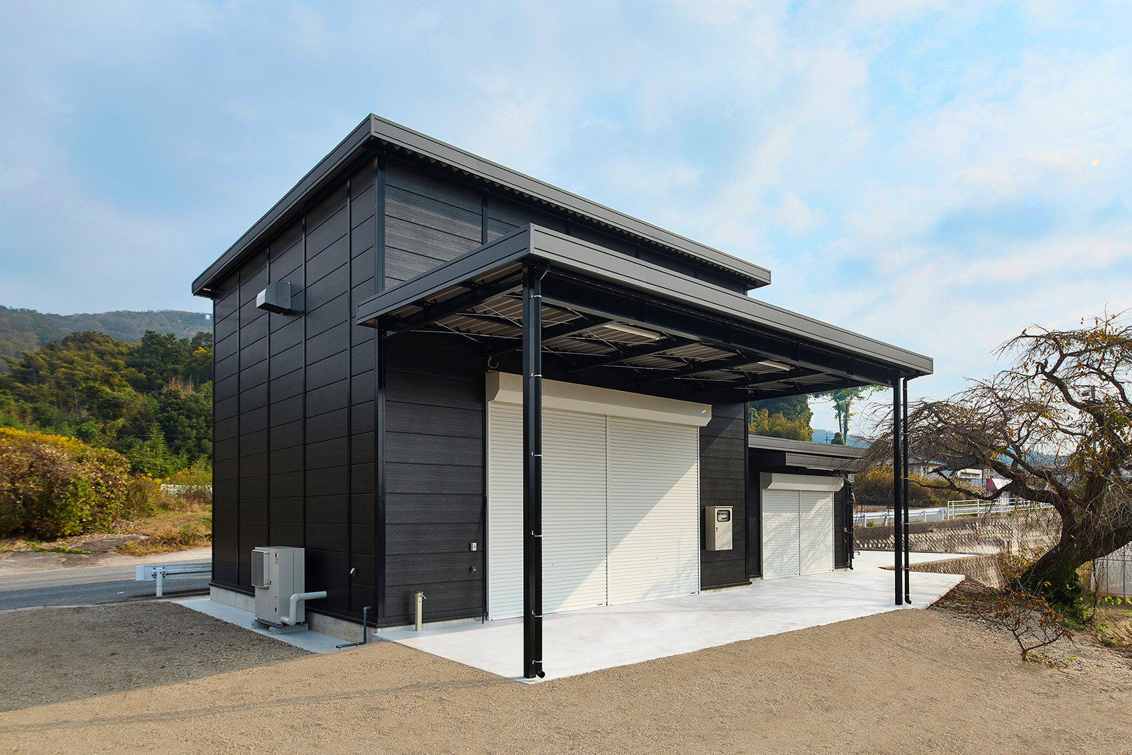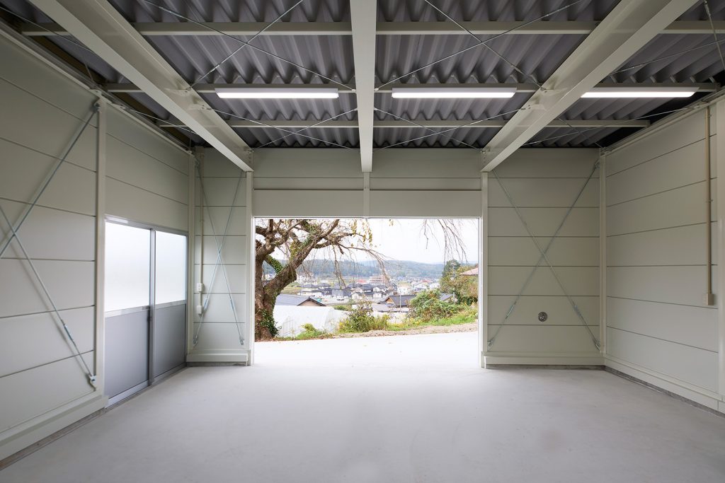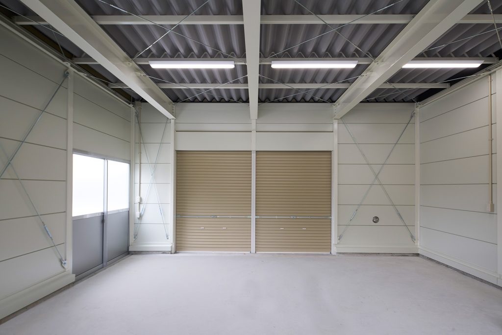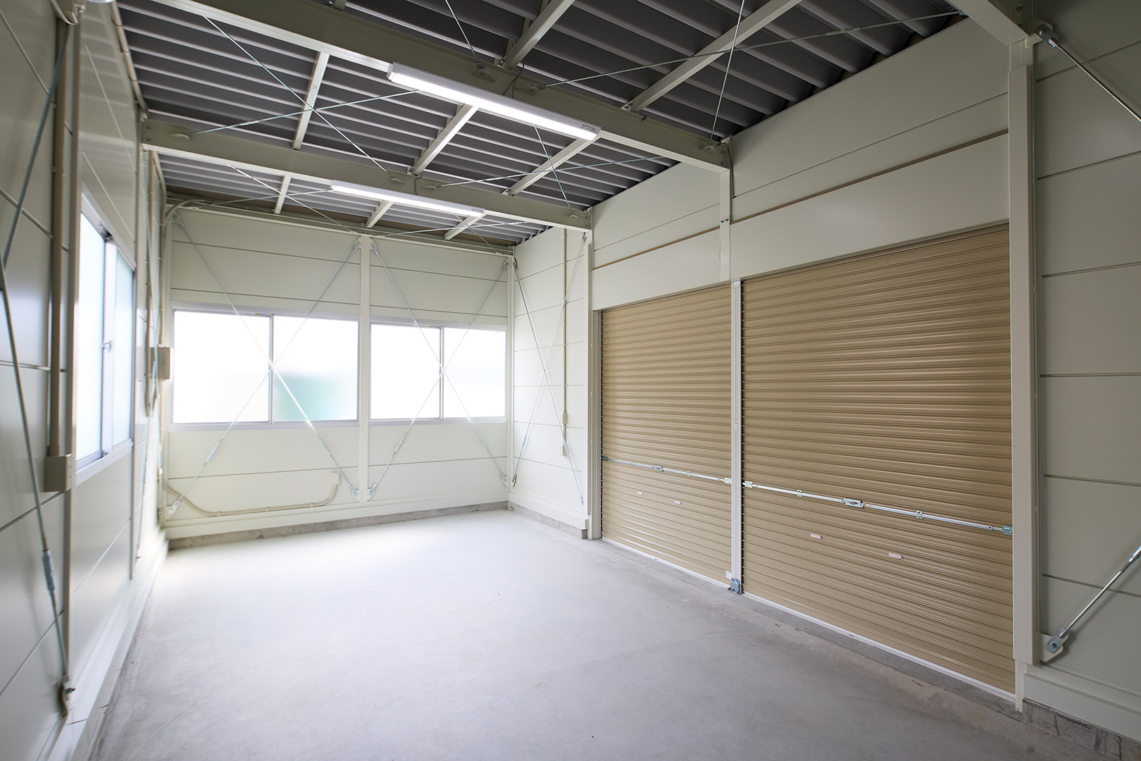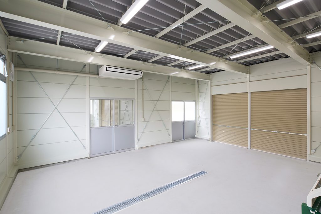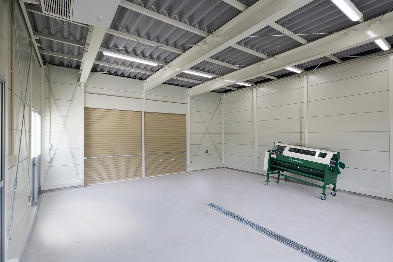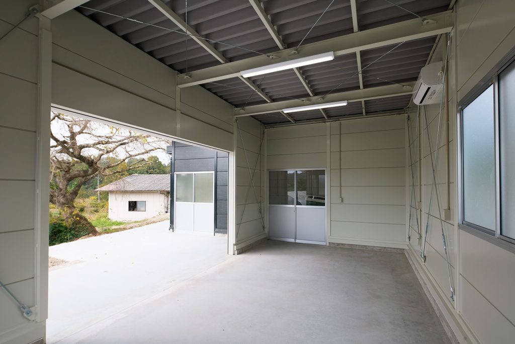 OLライトシリーズ 「OLライトシリーズ」 オリエントハウスプレハブシリーズの短工期&低コストの汎用モデル。外装・内装を兼ねることが出来る高断熱の壁パネルを使用しています。シリーズ詳細はこちら>more にて設計・施工した倉庫兼作業所です。不整形地の土地を最大限に有効活用するため、敷地の形状に合わせて建物の形状や配置を計画しました。建物内には天井高6.4m、面積約64㎡大型の冷蔵室を設置し、冷蔵室ドアの位置を幅3.5m×高さ2.3mの軽量大型シャッターとピッタリ合わせています。冷蔵室の隣は作業場、その隣には倉庫スペースを設け、フォークリフトやトラックで搬出入ができるよう各スペースに軽量シャッターを設けています。作業場・倉庫の天井高( 梁下 「梁下」 梁(はり)の下端から床仕上げ面までの高さを示す寸法。意匠的な天井仕上げの高さ(天井高)とは異なり、構造体としての制限寸法を表す。 梁下:梁の下端まで 天井高:内装仕上げ後の天井面ま...more 高)はコンテナ等が収納可能なように3mを確保しました。お客様は生姜を扱いになられ、広島県にて出荷量第一位とのことです。ご協力させていただき、ありがとうございました。
