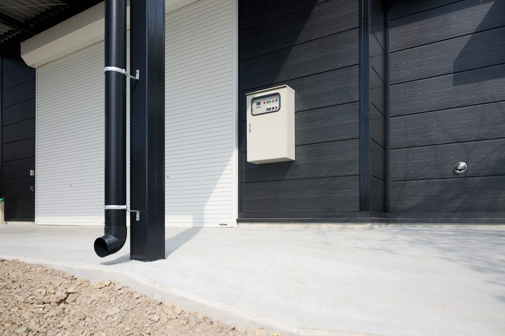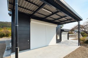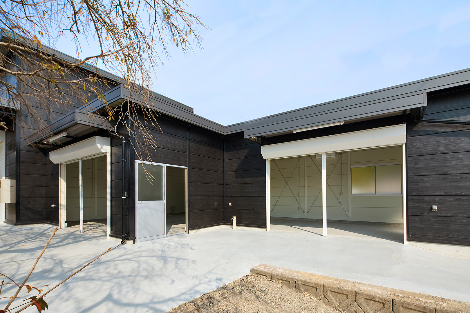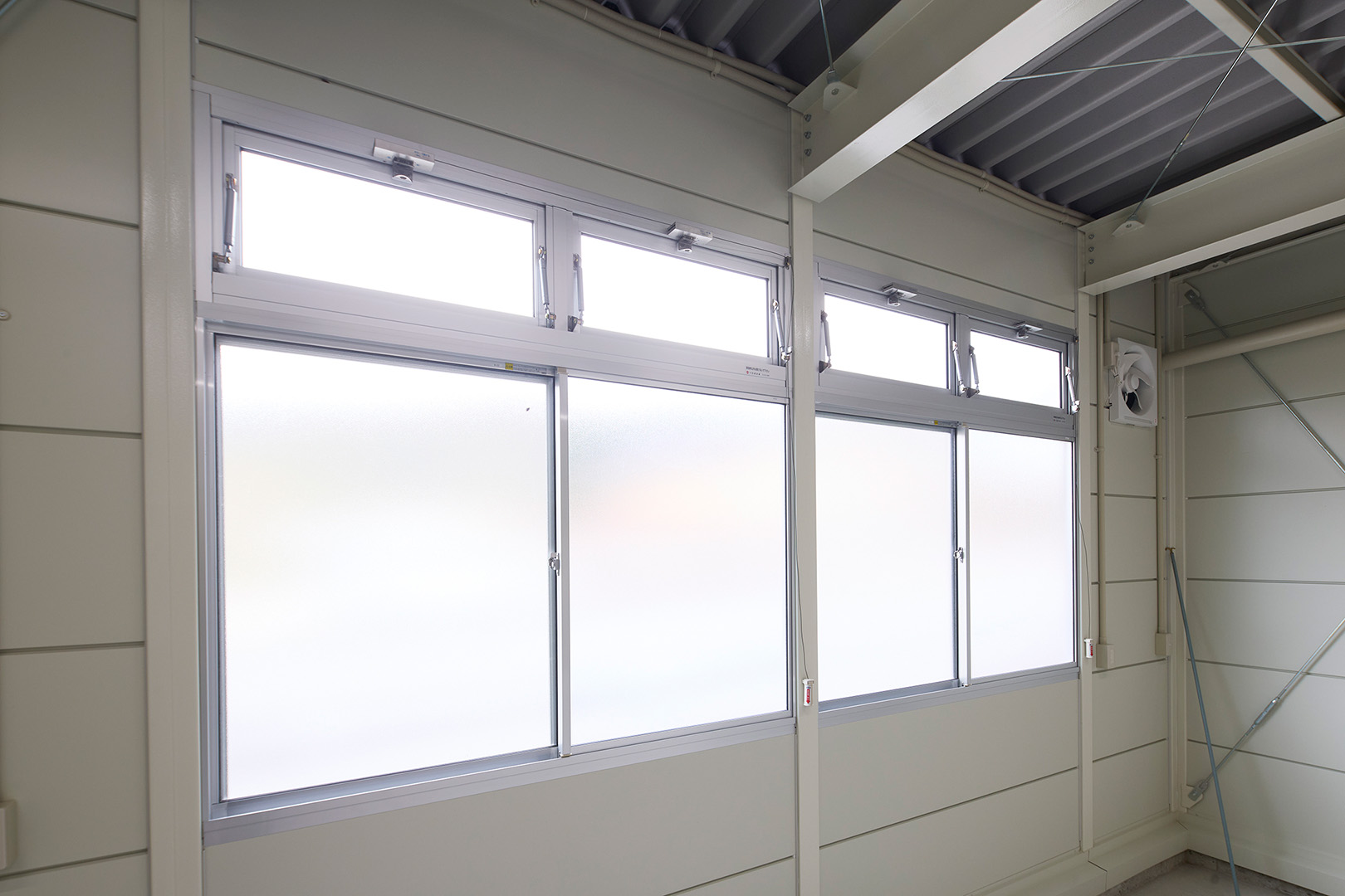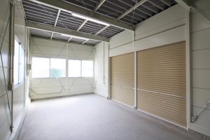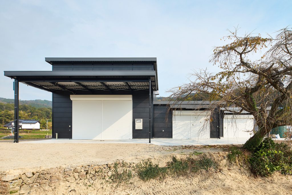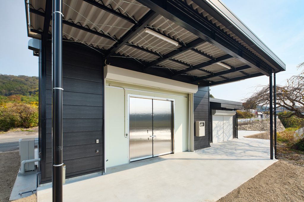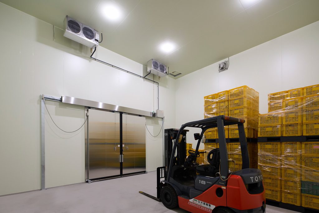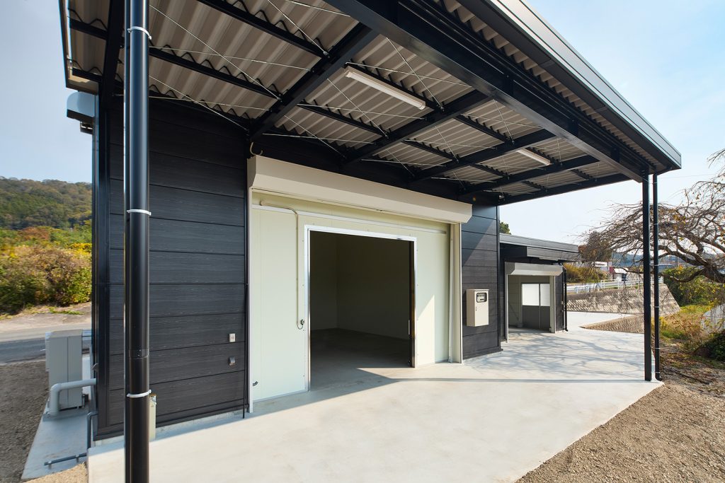 OLライトシリーズ 「OLライトシリーズ」 オリエントハウスプレハブシリーズの短工期&低コストの汎用モデル。外装・内装を兼ねることが出来る高断熱の壁パネルを使用しています。シリーズ詳細はこちら>more にて設計・施工した倉庫兼作業所です。不整形地の土地を最大限に有効活用するため、敷地の形状に合わせて建物の形状や配置を計画しました。建物内には天井高6.4m、面積約64㎡大型の冷蔵室を設置し、冷蔵室ドアの位置を幅3.5m×高さ2.3mの軽量大型シャッターとピッタリ合わせています。冷蔵室の隣は作業場、その隣には倉庫スペースを設け、フォークリフトやトラックで搬出入ができるよう各スペースに軽量シャッターを設けています。作業場・倉庫の天井高( 梁下 「梁下」 梁(はり)の下端から床仕上げ面までの高さを示す寸法。意匠的な天井仕上げの高さ(天井高)とは異なり、構造体としての制限寸法を表す。 梁下:梁の下端まで 天井高:内装仕上げ後の天井面ま...more 高)はコンテナ等が収納可能なように3mを確保しました。お客様は生姜を扱いになられ、広島県にて出荷量第一位とのことです。ご協力させていただき、ありがとうございました。