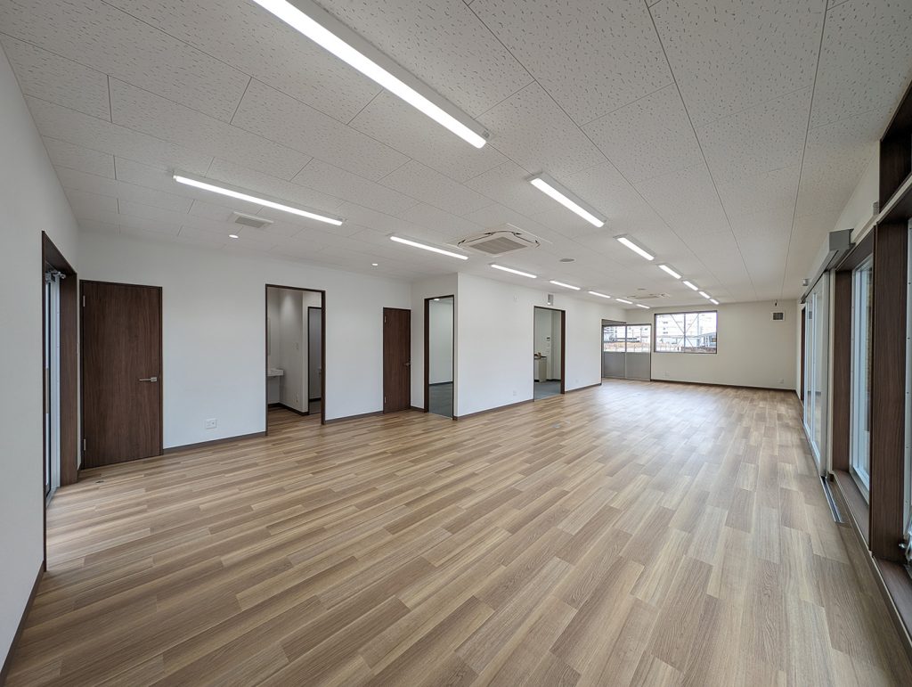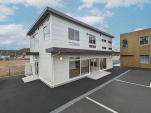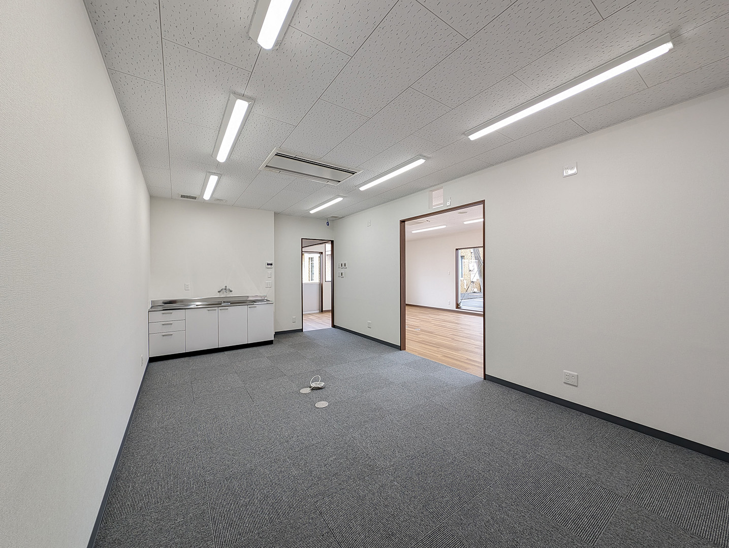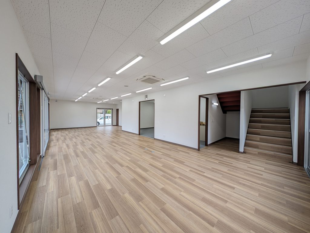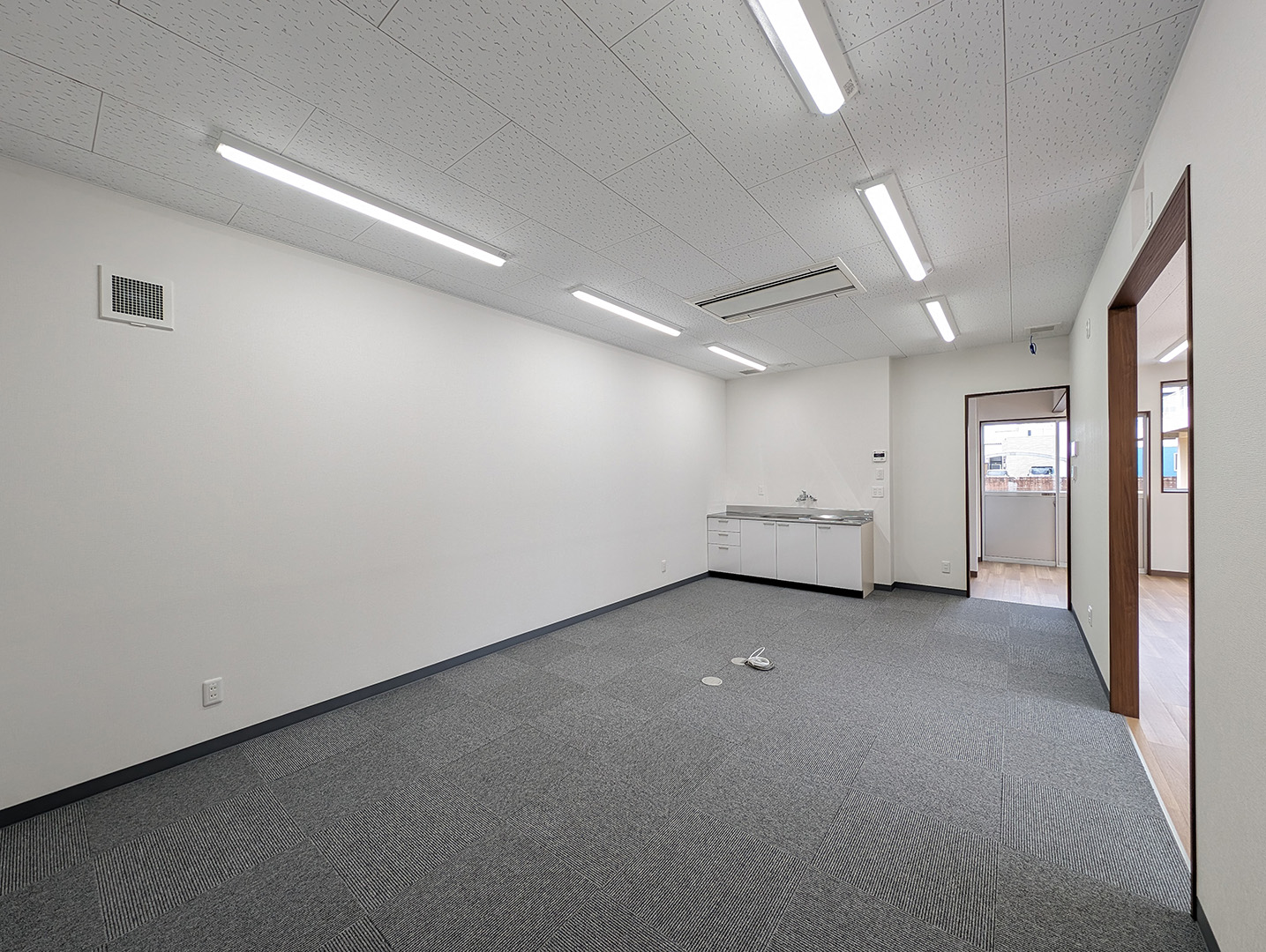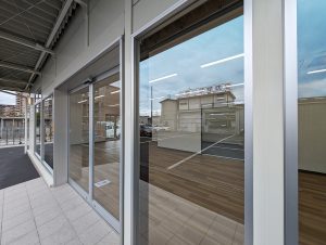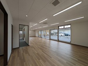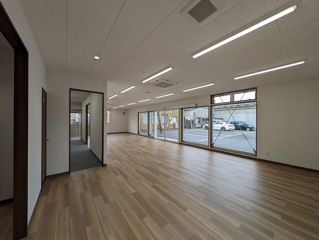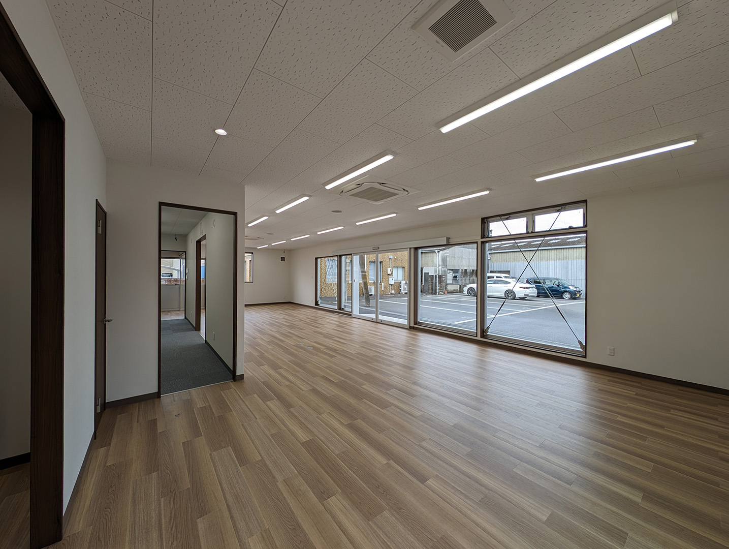1Fにはオートショップのサービスフロントとなる店舗スペースをメインに、2Fには事務所や応接室などが配置された建物になります。建物正面の入口は幅2.6m x 高さ2.1mの透明な自動ドアを設置し、両サイドには幅1.6m x 高さ1.8mの大きなFIX窓を3つ追加しました。さらに、幅0.7m x 高さ1.8mの別サイズのFIX窓も1カ所設置し、明るく開放的な空間をお客様に提供しています。2階の主な用途は事務所となっており、窓を床面に近い場所と天井面に近い場所に配置する事により光の取り入れ方に変化を持たせています。1階・2階ともに、本来隠す構造部材をあえて見せ、開口部を多く設けることで、空間の広がりを最大限引き出しています。内装は、床・内部建具・額縁を木目調で統一し、柔らかい印象の仕上げ。外観については、正面側に庇を設けることで、単調になりがちな外観に変化をもたせました。1階出入口の外側はタイル仕上げとし、スロープ仕様でバリアフリーにも配慮しています。