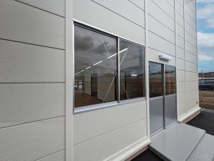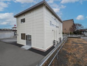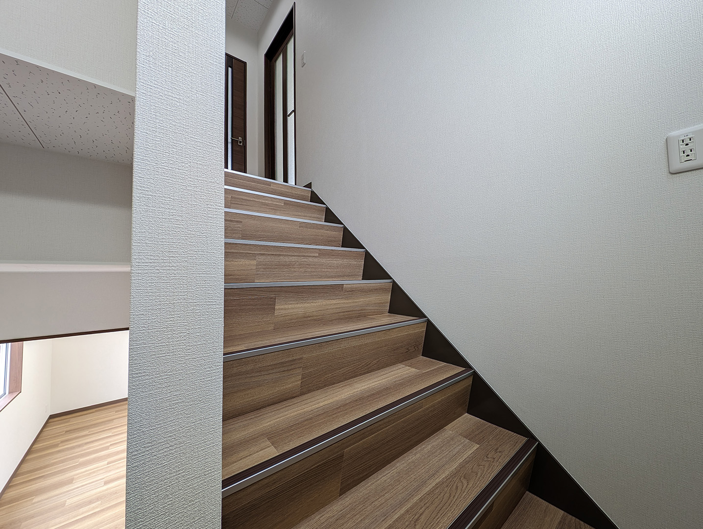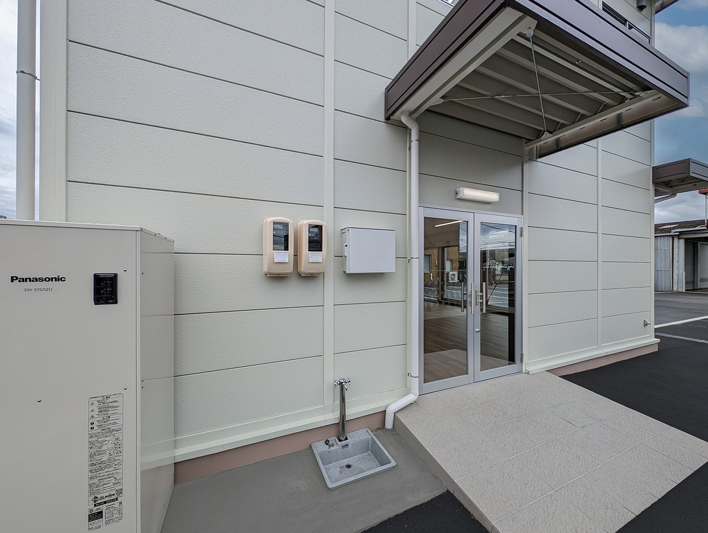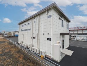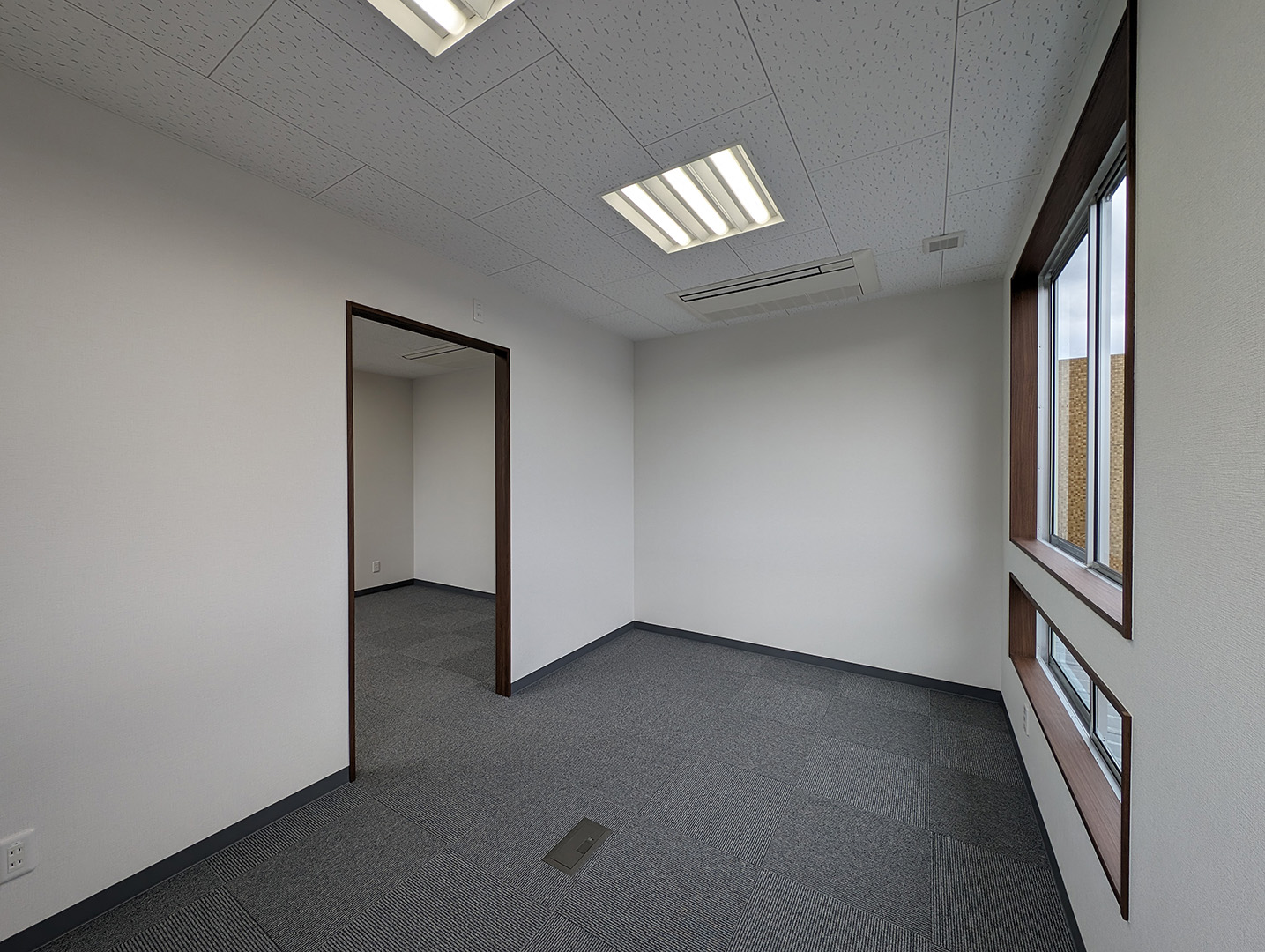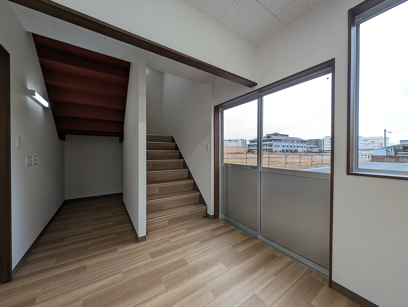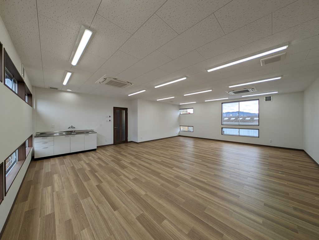 1Fにはオートショップのサービスフロントとなる店舗スペースをメインに、2Fには事務所や応接室などが配置された建物になります。建物正面の入口は幅2.6m x 高さ2.1mの透明な自動ドアを設置し、両サイドには幅1.6m x 高さ1.8mの大きなFIX窓を3つ追加しました。さらに、幅0.7m x 高さ1.8mの別サイズのFIX窓も1カ所設置し、明るく開放的な空間をお客様に提供しています。2階の主な用途は事務所となっており、窓を床面に近い場所と天井面に近い場所に配置する事により光の取り入れ方に変化を持たせています。1階・2階ともに、本来隠す構造部材をあえて見せ、開口部を多く設けることで、空間の広がりを最大限引き出しています。内装は、床・内部建具・額縁を木目調で統一し、柔らかい印象の仕上げ。外観については、正面側に庇を設けることで、単調になりがちな外観に変化をもたせました。1階出入口の外側はタイル仕上げとし、スロープ仕様でバリアフリーにも配慮しています。