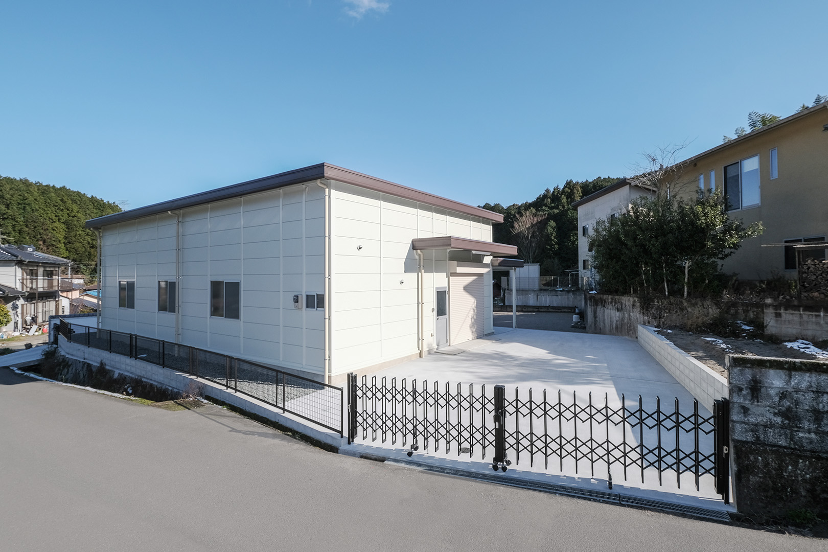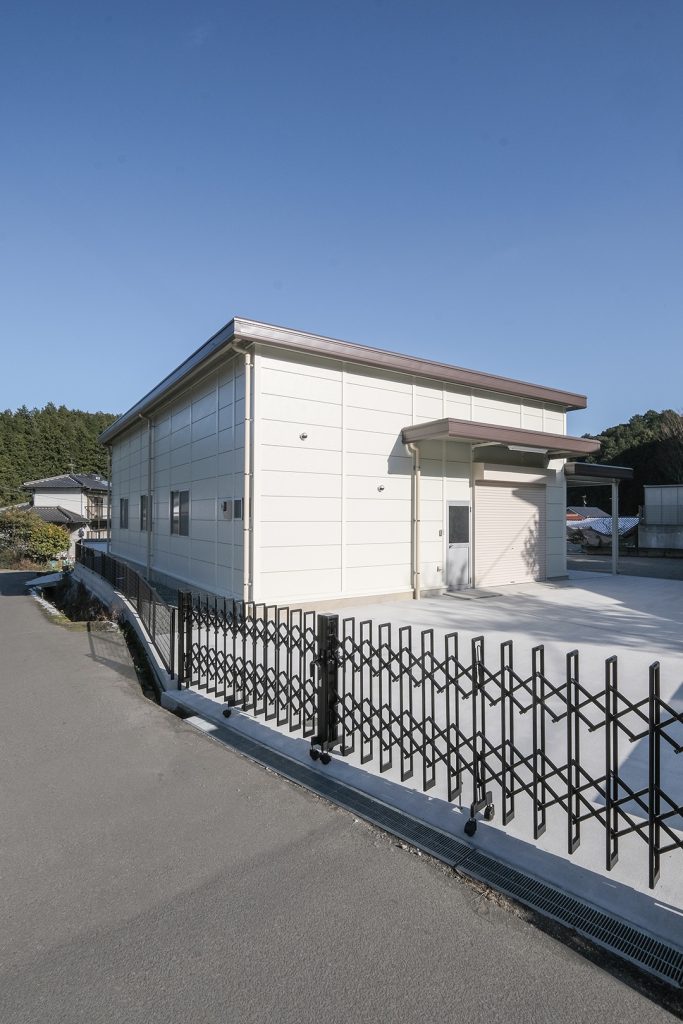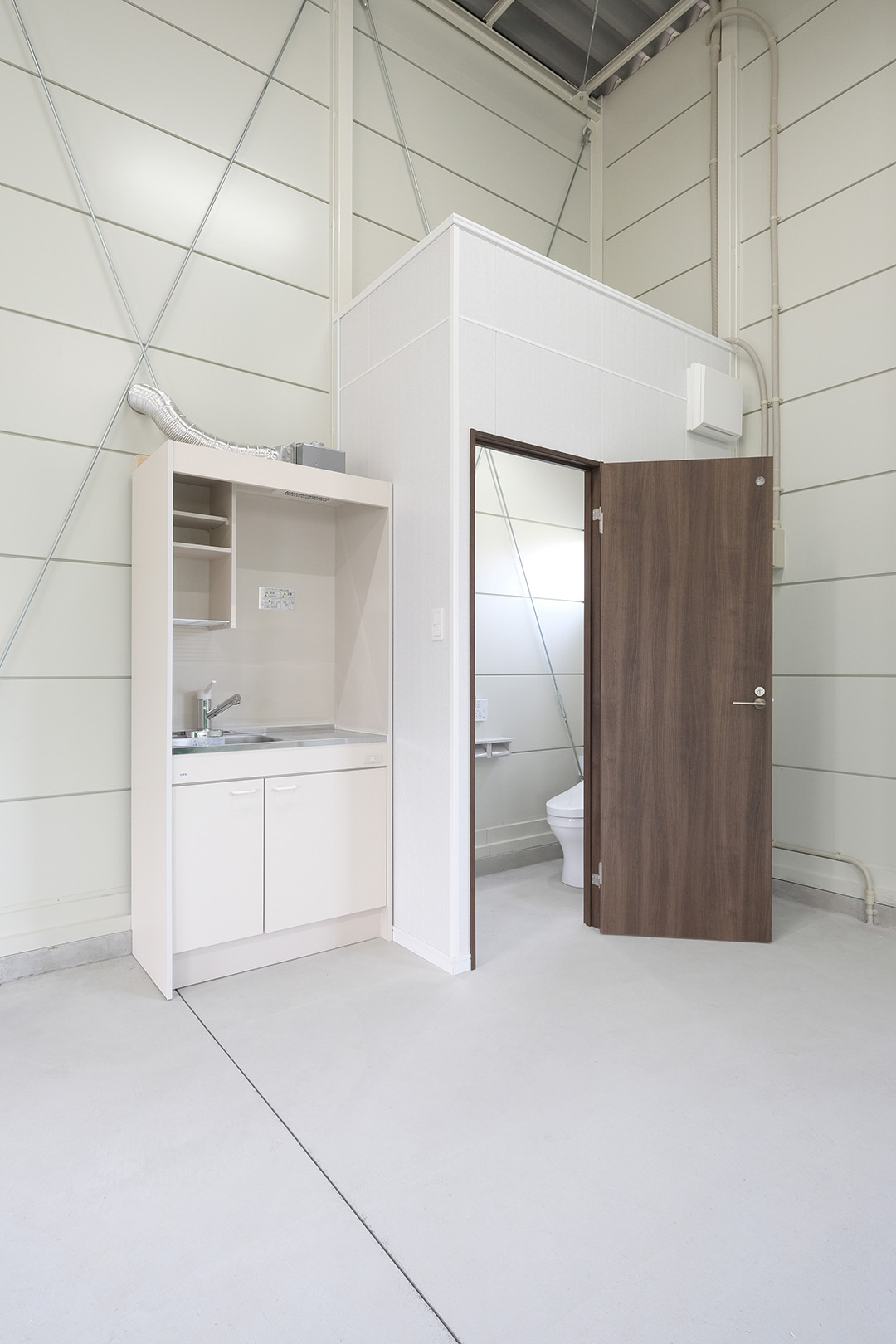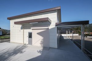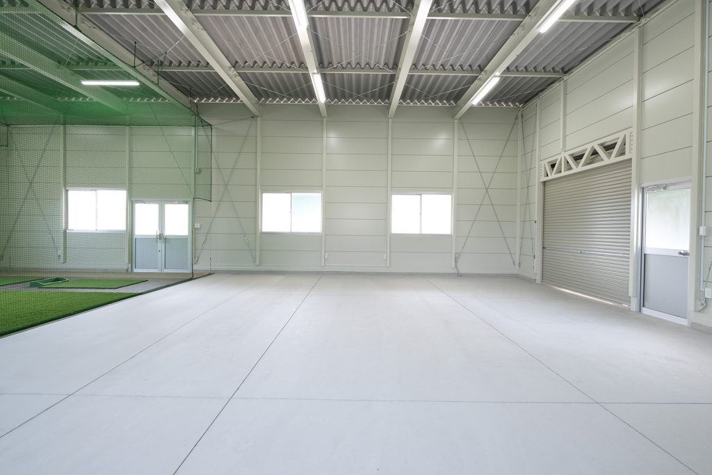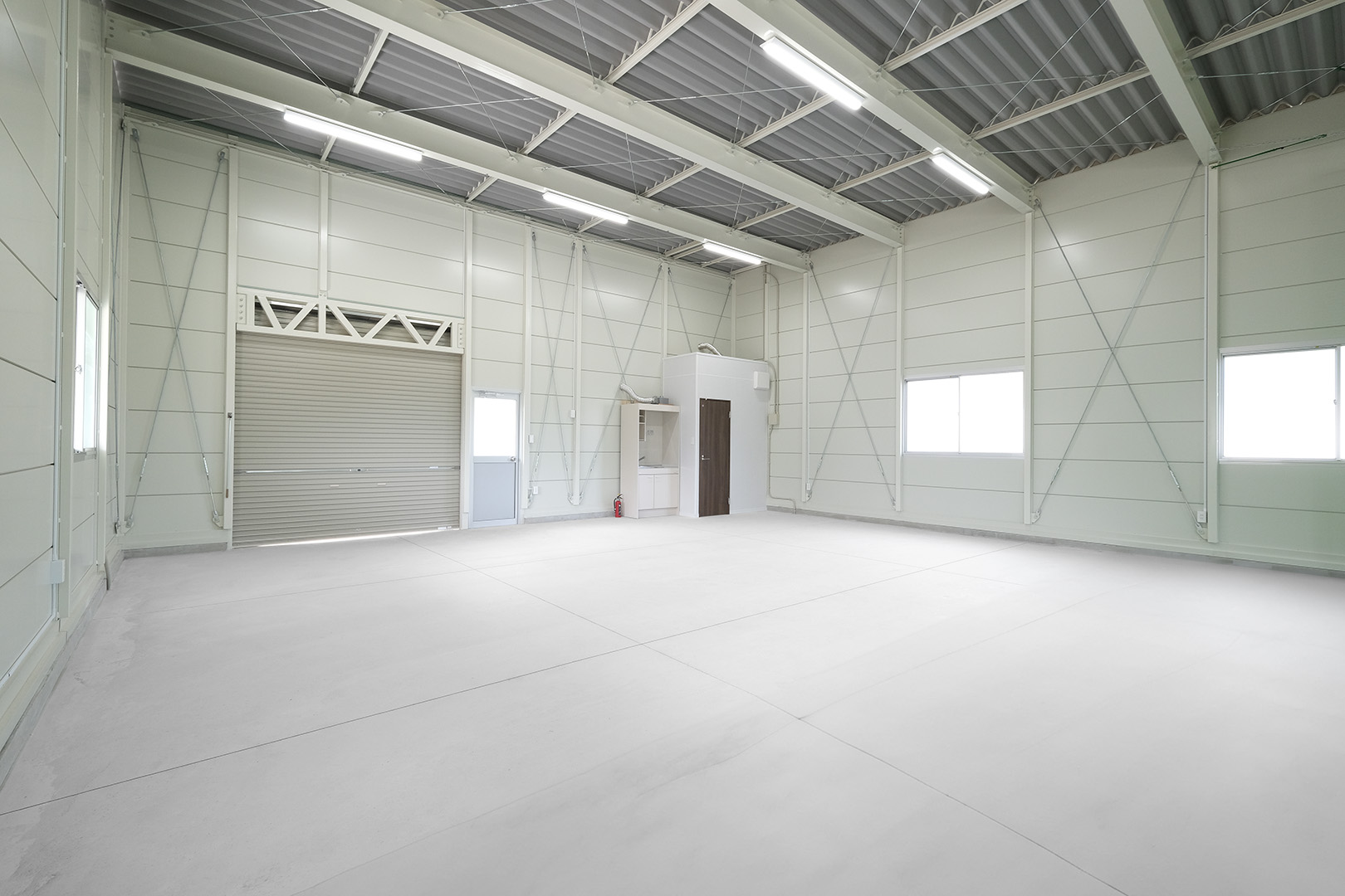 OLライトシリーズにて設計施工した1階建て倉庫です。敷地を最大限利用し、室内は約130㎡と広々とした作りになっています。お客様がしっかりとした収納力とシンプルな造りをご希望だったため、柱に補強を加えることで 梁下 「梁下」 梁(はり)の下端から床仕上げ面までの高さを示す寸法。意匠的な天井仕上げの高さ(天井高)とは異なり、構造体としての制限寸法を表す。 梁下:梁の下端まで 天井高:内装仕上げ後の天井面ま...more 高を約4.2mまで確保。室内は間仕切り壁や天井を無くし、柱やブレースも室内に建てないことで、見通しのよく作業性に優れた空間を実現。また、倉庫でありながらトイレとミニキッチンを備え、利便性にも配慮しました。倉庫の正面には、幅全体に奥行き2.5mの庇を設置。また正面に向かって左側の壁面・シャッター(幅2.5m x 高さ2.5m)にも庇を設置することにより、雨にあたることなく荷物の出し入れや通行が可能になっています。