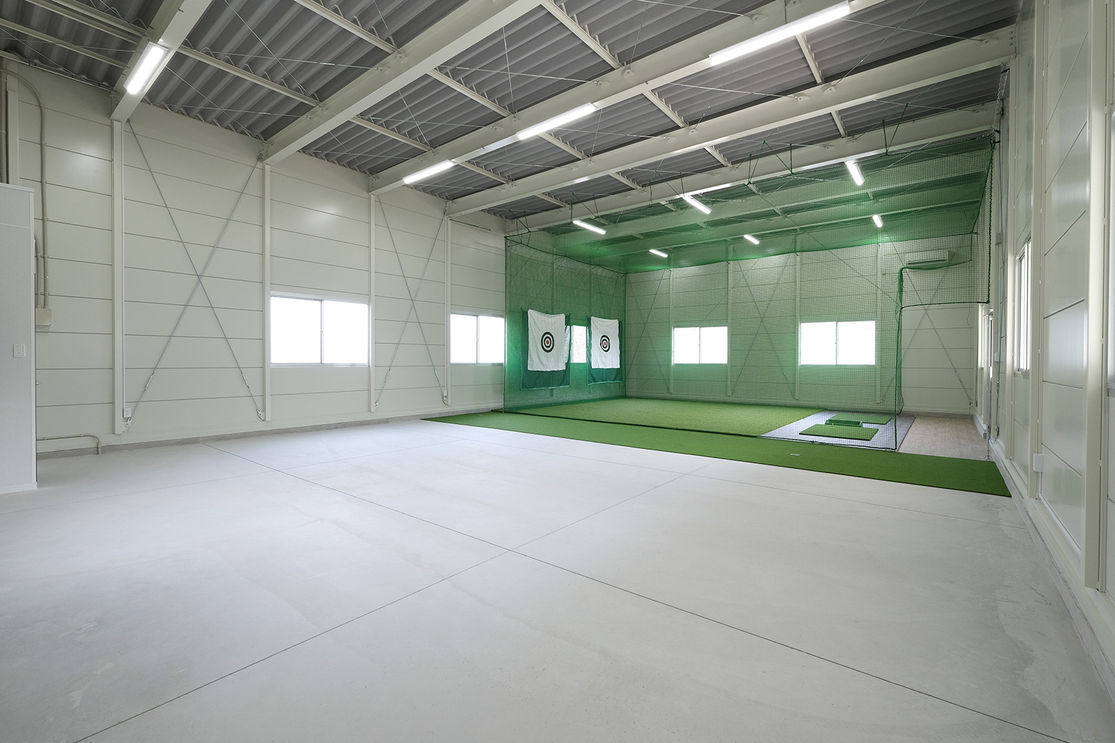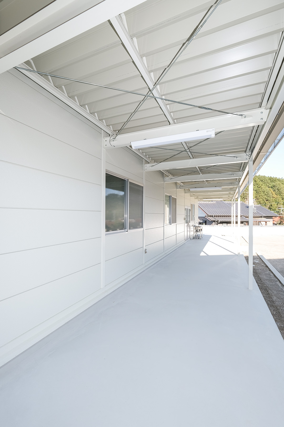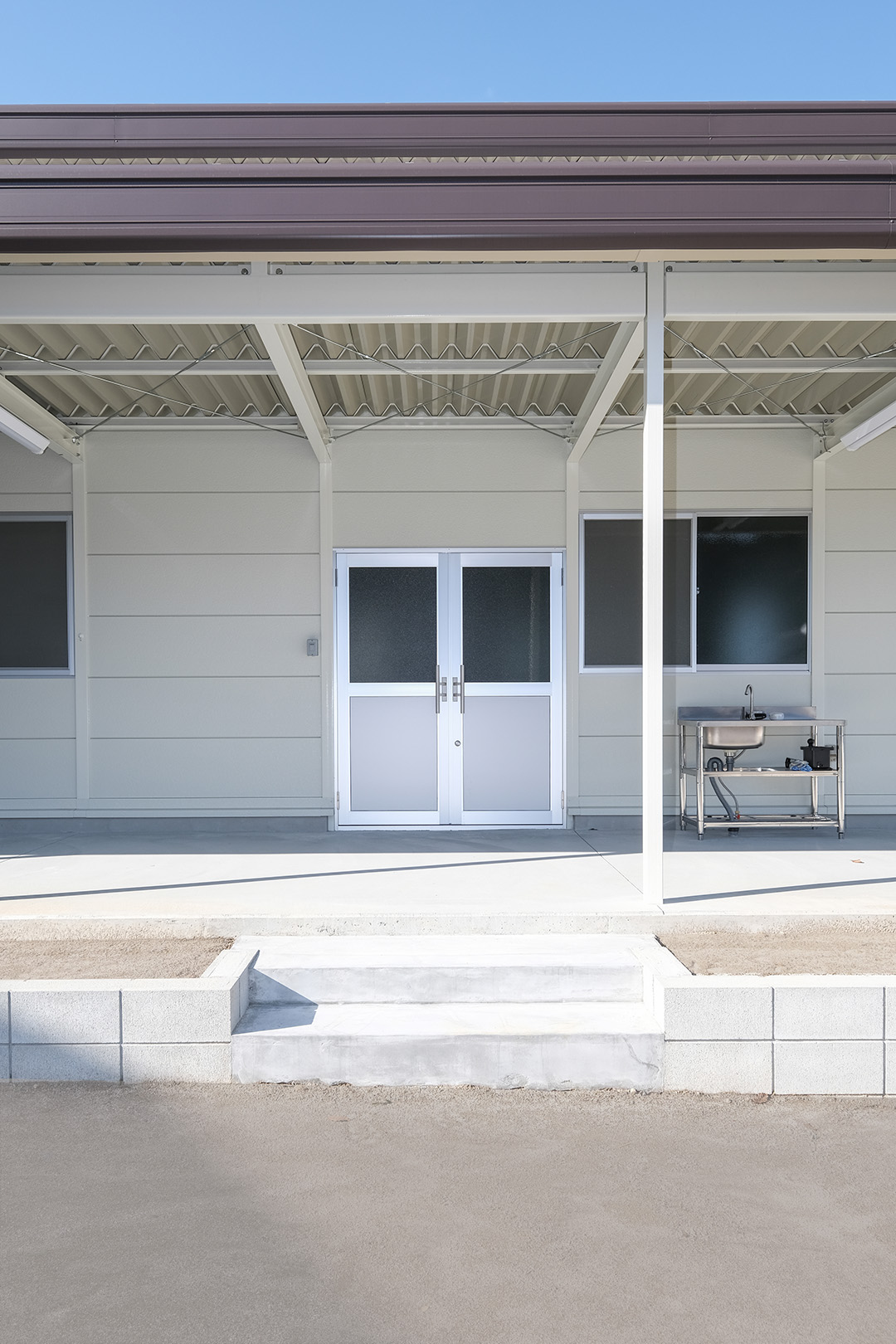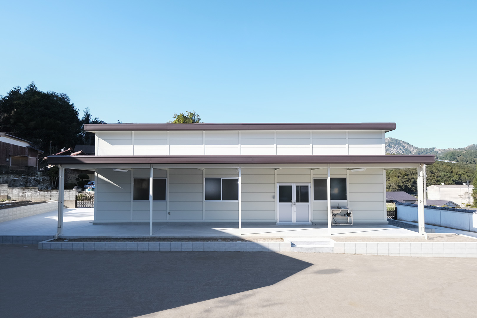 OLライトシリーズにて設計施工した1階建て倉庫です。敷地を最大限利用し、室内は約130㎡と広々とした作りになっています。お客様がしっかりとした収納力とシンプルな造りをご希望だったため、柱に補強を加えることで 梁下 「梁下」 梁(はり)の下端から床仕上げ面までの高さを示す寸法。意匠的な天井仕上げの高さ(天井高)とは異なり、構造体としての制限寸法を表す。 梁下:梁の下端まで 天井高:内装仕上げ後の天井面ま...more 高を約4.2mまで確保。室内は間仕切り壁や天井を無くし、柱やブレースも室内に建てないことで、見通しのよく作業性に優れた空間を実現。また、倉庫でありながらトイレとミニキッチンを備え、利便性にも配慮しました。倉庫の正面には、幅全体に奥行き2.5mの庇を設置。また正面に向かって左側の壁面・シャッター(幅2.5m x 高さ2.5m)にも庇を設置することにより、雨にあたることなく荷物の出し入れや通行が可能になっています。
