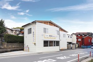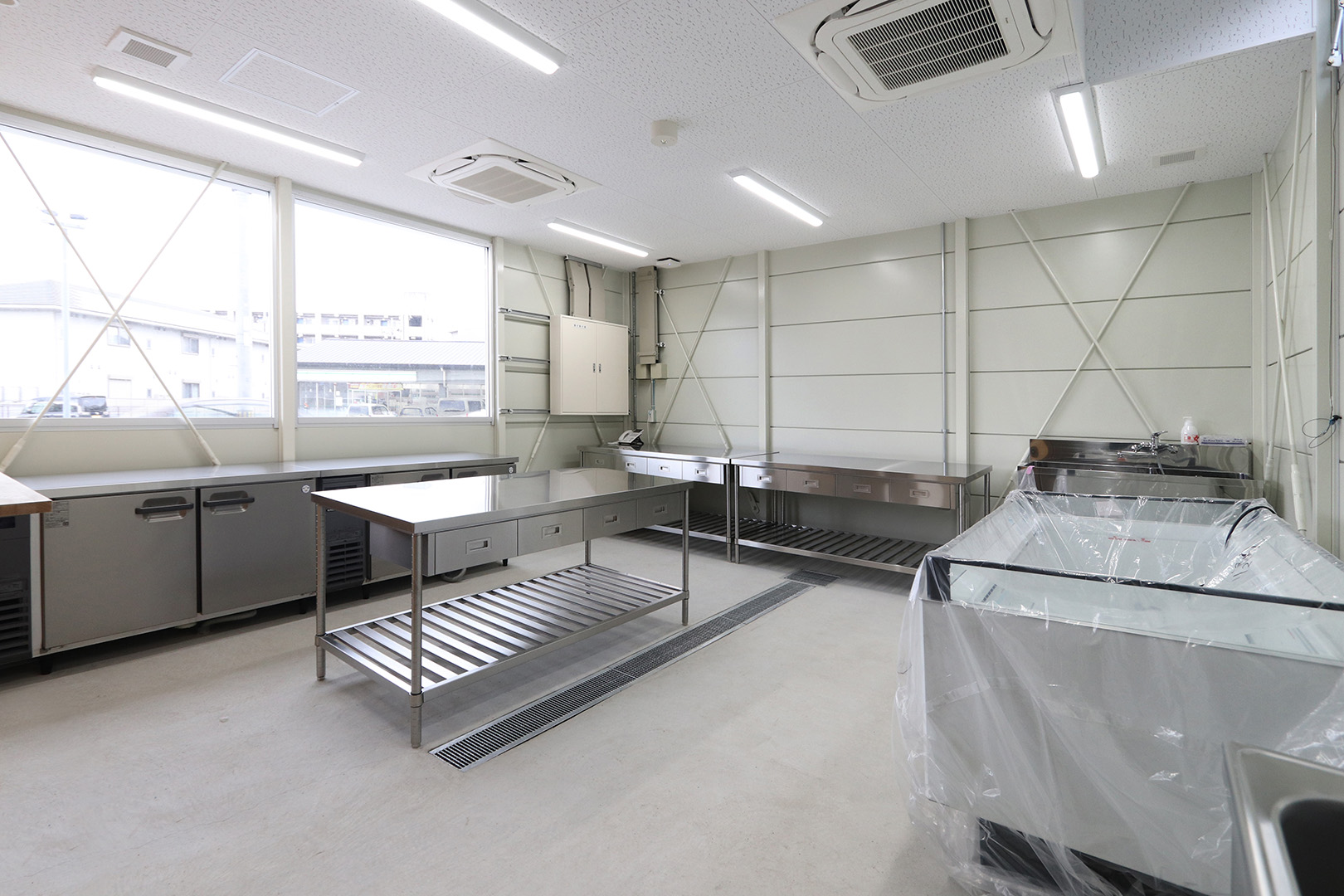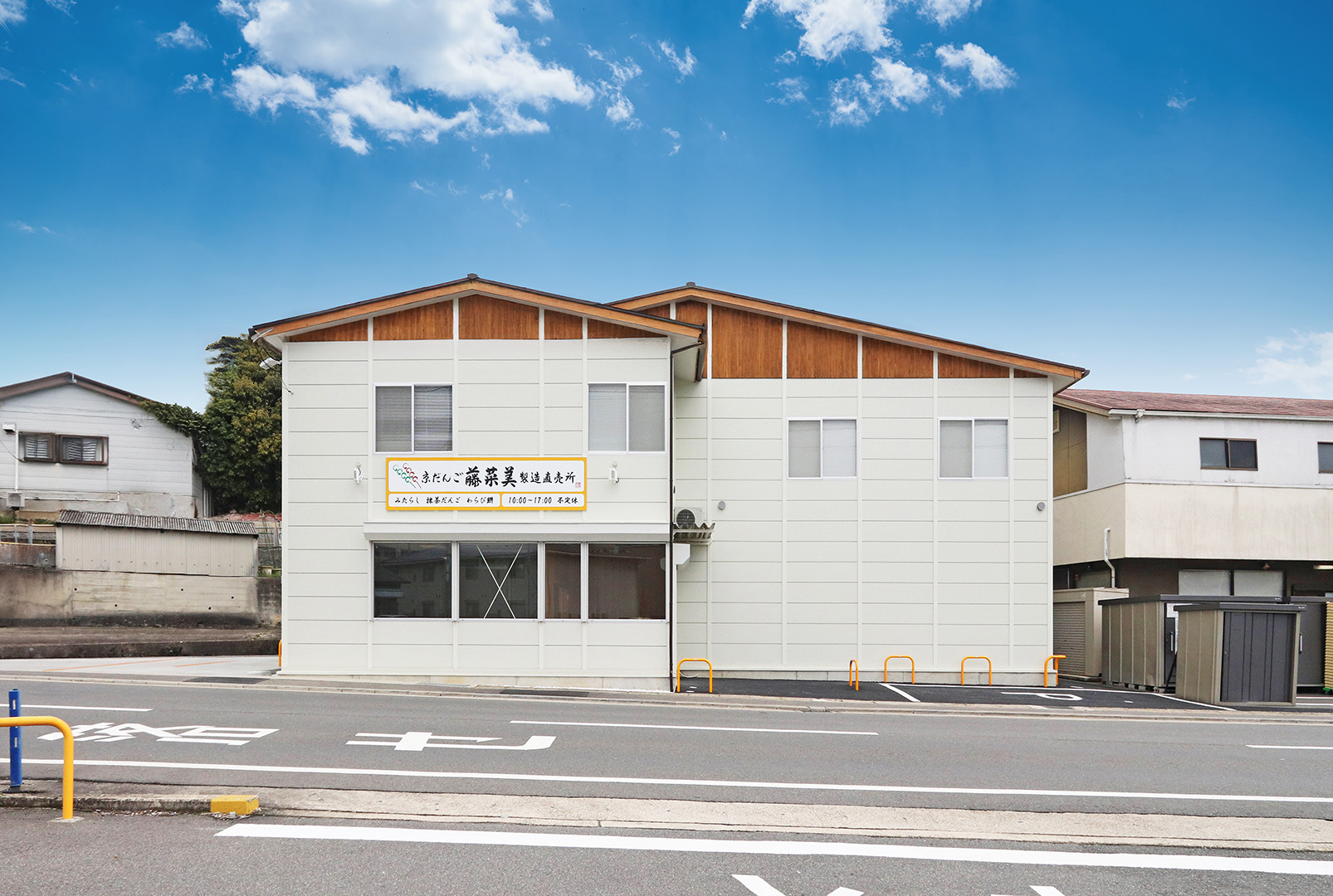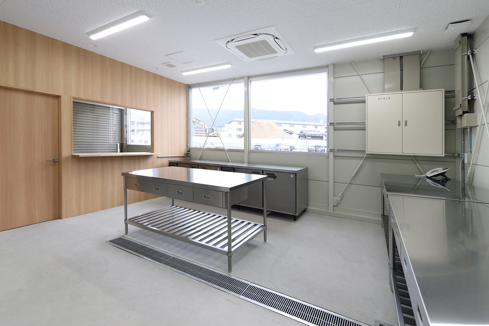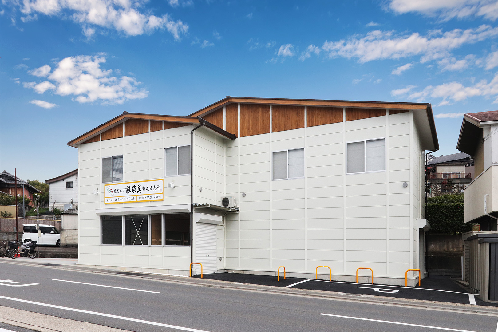 京都のだんご屋さんの、製造工場及び店舗になります。1階にて商品を製造し、各店舗へ発送されてますが、直売所という形でこちらでも販売されています。工場部分の床は毎日の清掃に最適なコンクリート仕上げ、業務用のキッチンテーブルや冷凍冷蔵庫などを設置。直売所部分は、大きめのガラスカウンターを設置し、実際にお客様がだんごを作る過程が見れるようになっています。また、店の前を通行される人にも、過程が見えるようにしたいとの要望があり、道路面には大型の FIX窓 「FIX窓」 開閉しない固定窓です。採光や眺望の確保に適しています。more を配置。2階には事務室や会議室があり、スタッフのための休憩室や更衣室も設けております。外観は地域の景観条例を考慮し、 切妻 「切妻」 切妻屋根とは、屋根の形状の一つで、棟を中心に左右二方向へ傾斜した、最も一般的な屋根形式。正面から見ると三角形の妻面が現れます。more 屋根となっています。昔ながらの和風建築のように、棟もいくつか設けて、デザインに配慮。
