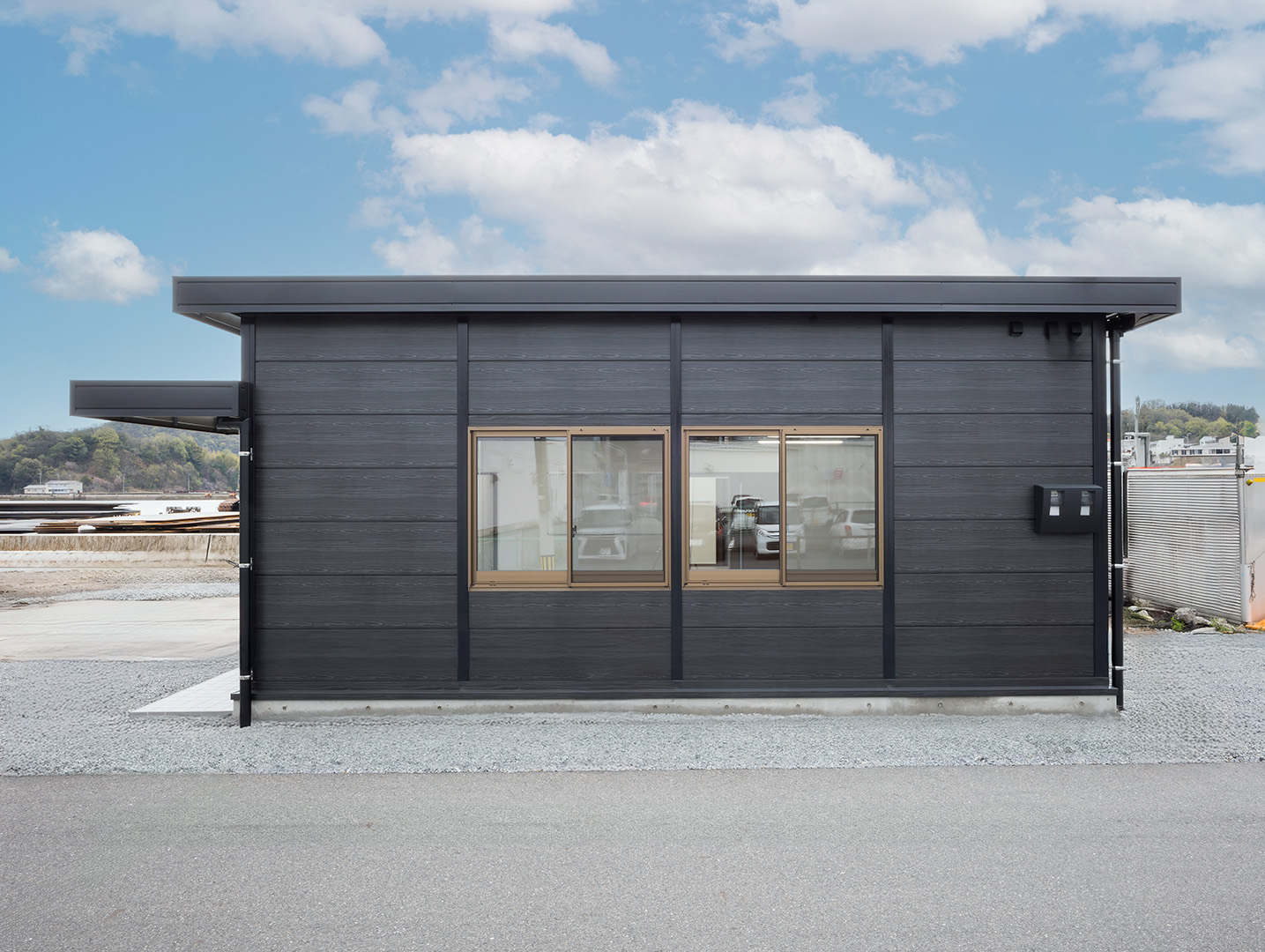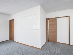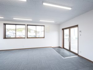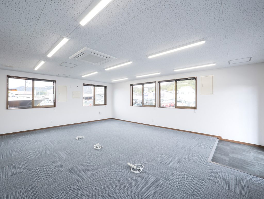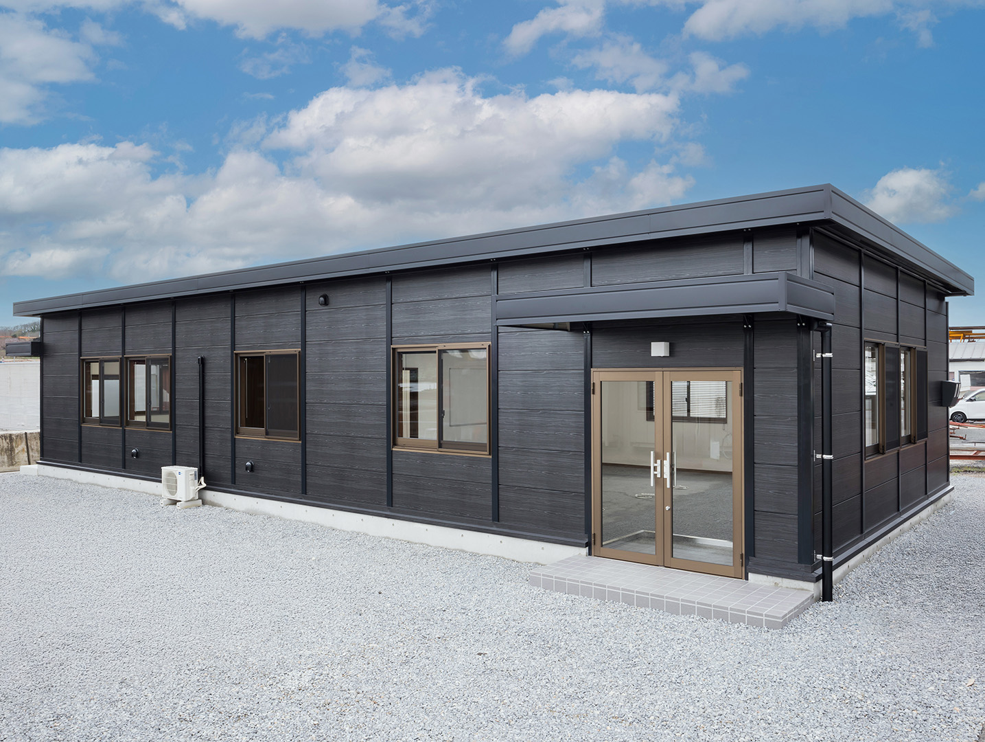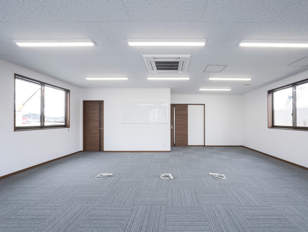 既存施設の老朽化を受け、事務所および社員休憩所として計画されました。施主様は、コストを抑えつつ限られた建築面積を活かして必要な諸室を配置し、断熱性や居住性を確保したいとのご希望でしたので、当社の「OLライトシリーズ」を採用しつつも、開口部にはビル用サッシと複層ガラスを用いて空調負荷を低減させる工夫を施しています。また、事務所スペースの床には OAフロア 「OAフロア」 事務所向けの二重床です。床下にLANや電源を収め、レイアウト変更にも柔軟に対応可能です。フリーアクセスフロアとも呼ばれます。more を採用し、煩雑な配線類を床下に収納することで、配置替えやメンテナンスの容易さを実現しつつ、整理されスッキリしたイメージに仕上がっています。さらに、社長室には高級感のある壁紙を使用し、品位のある空間を演出しました。これらの工夫により、限られたスペースでありながら快適で機能的なオフィス環境が実現されています。